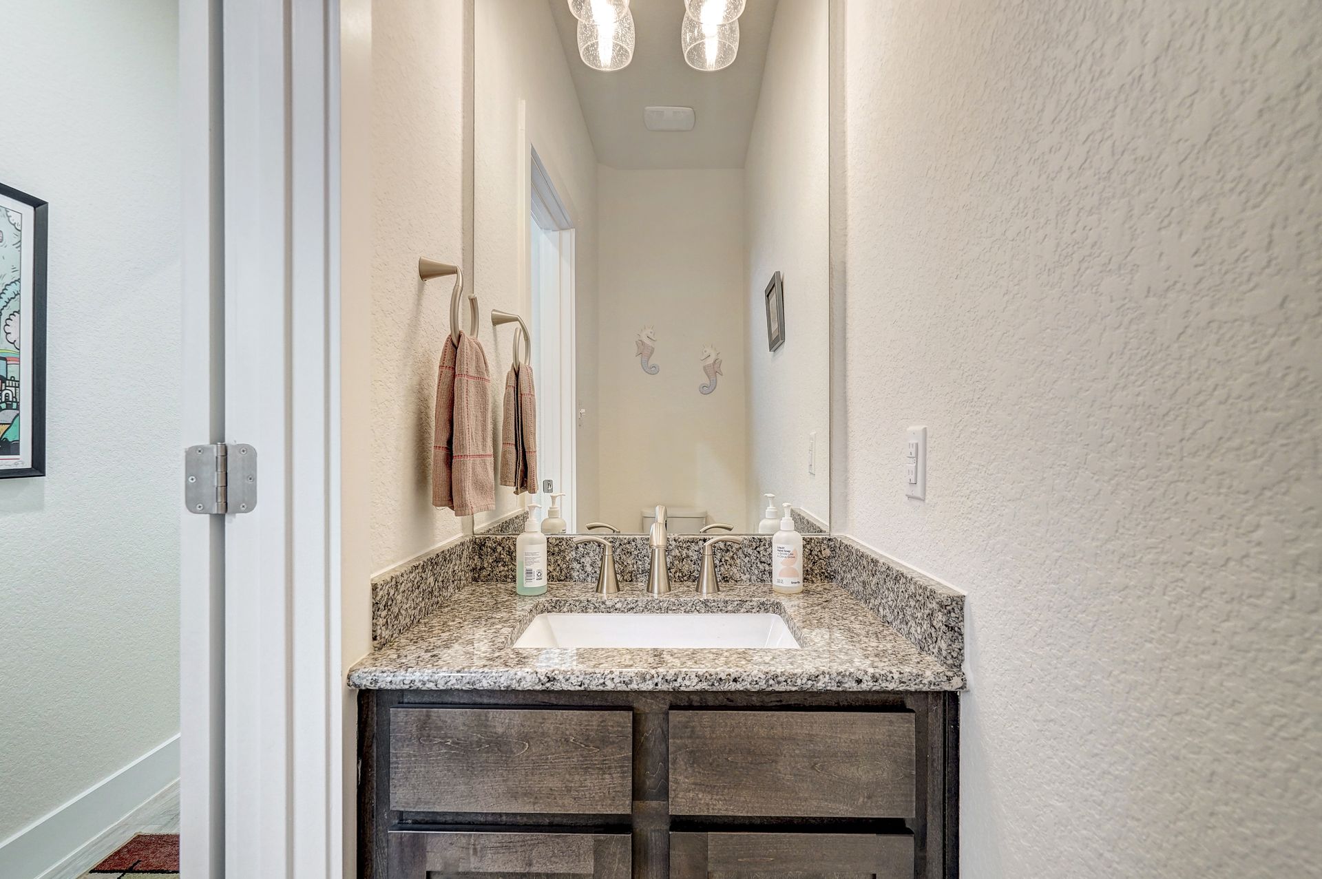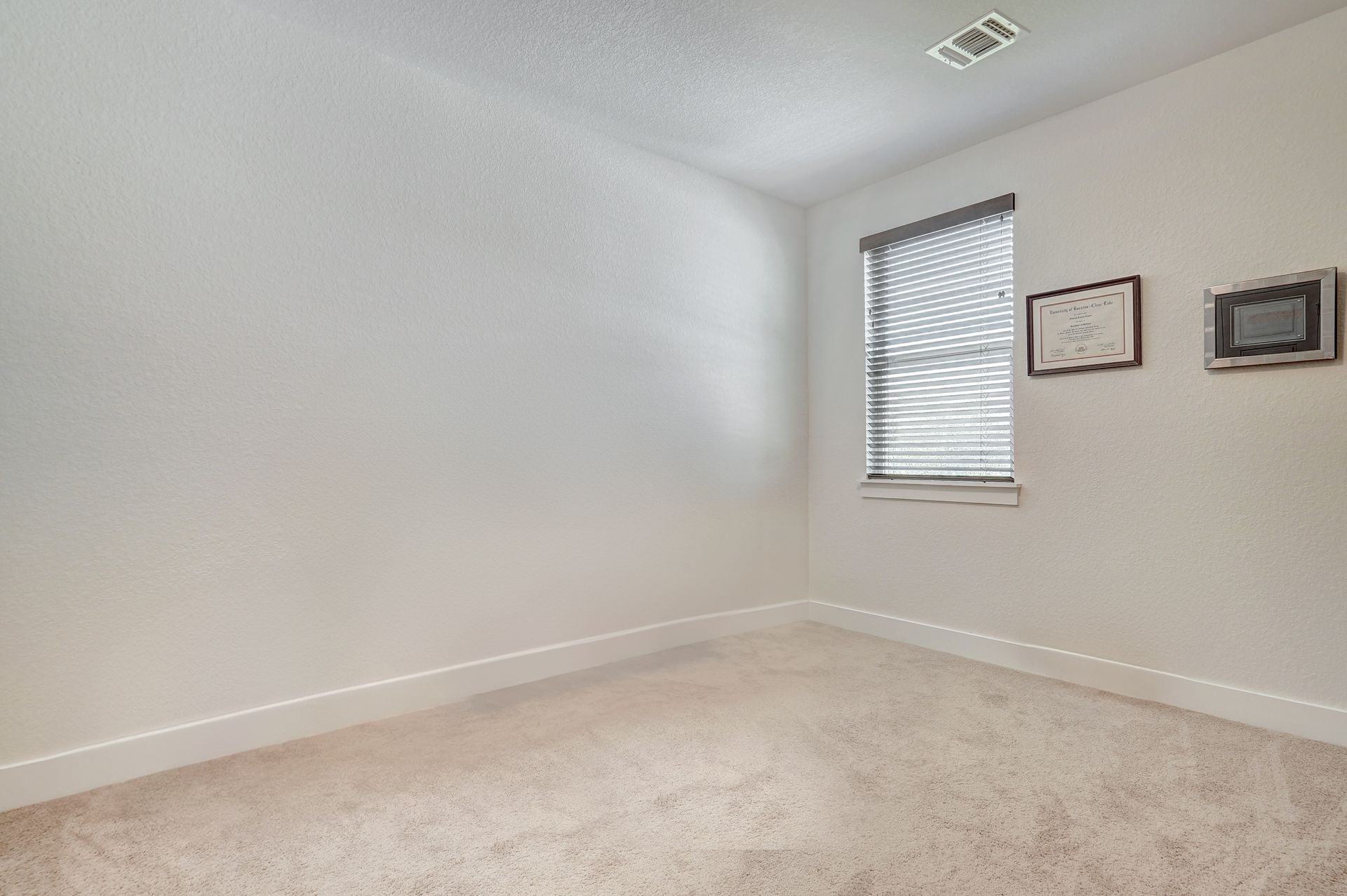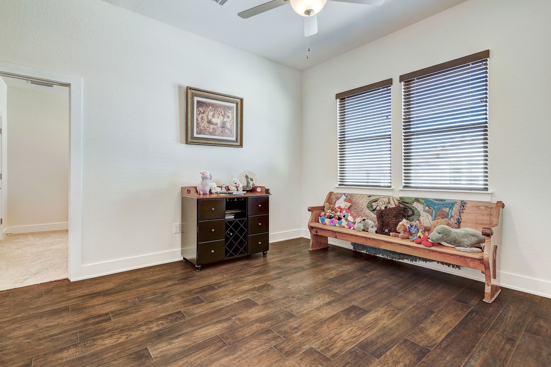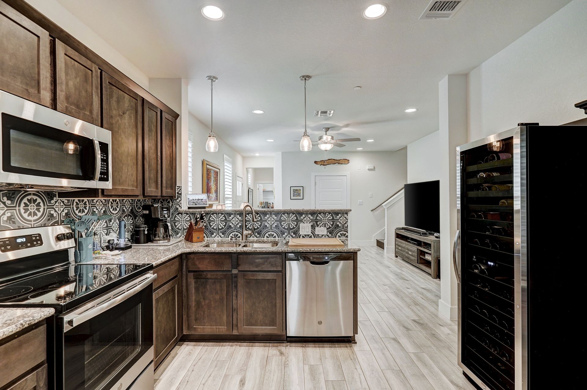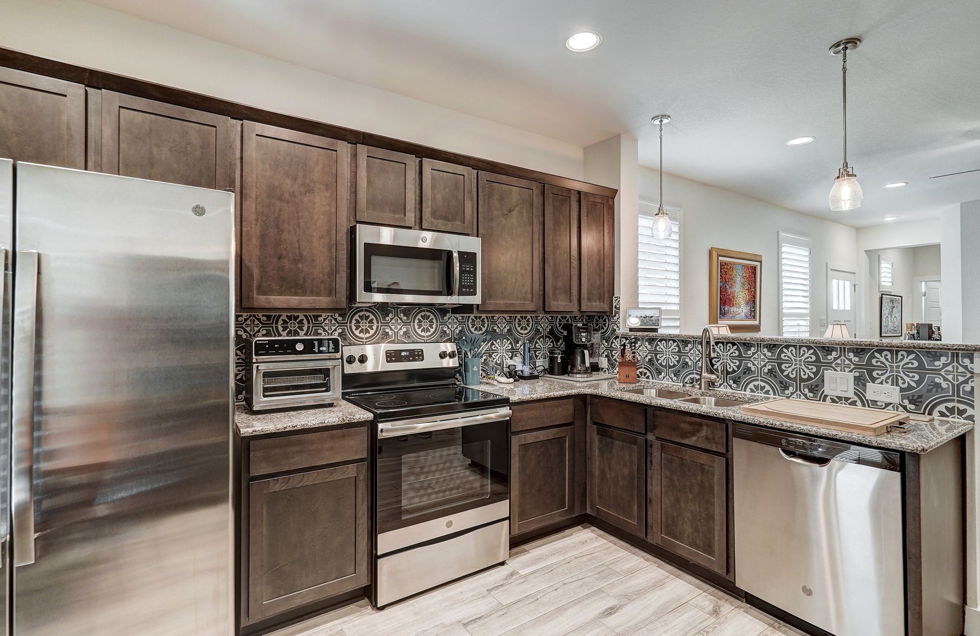 The gourmet kitchen is appointed with granite countertops, a ceramic tile backsplash, and stainless-steel appliances while plush carpeting in the secondary bedrooms and sleek hardwood flooring throughout add comfort and style. Additional highlights include a convenient powder room, a spacious utility room, and generous storage options throughout the home.