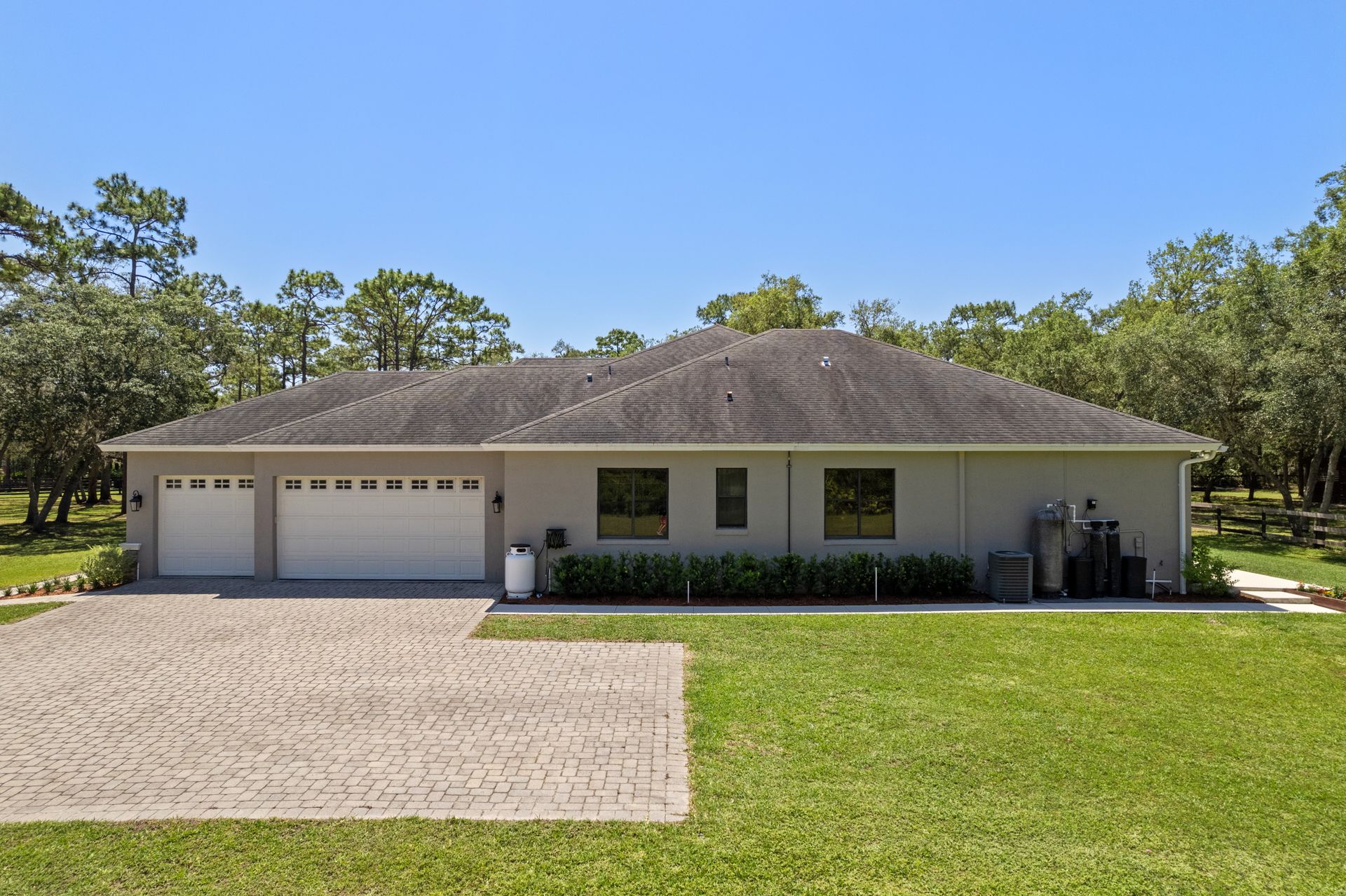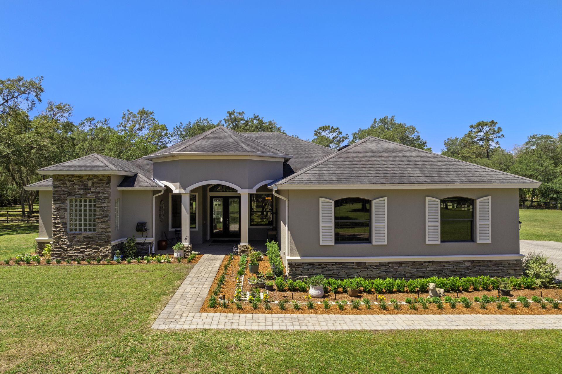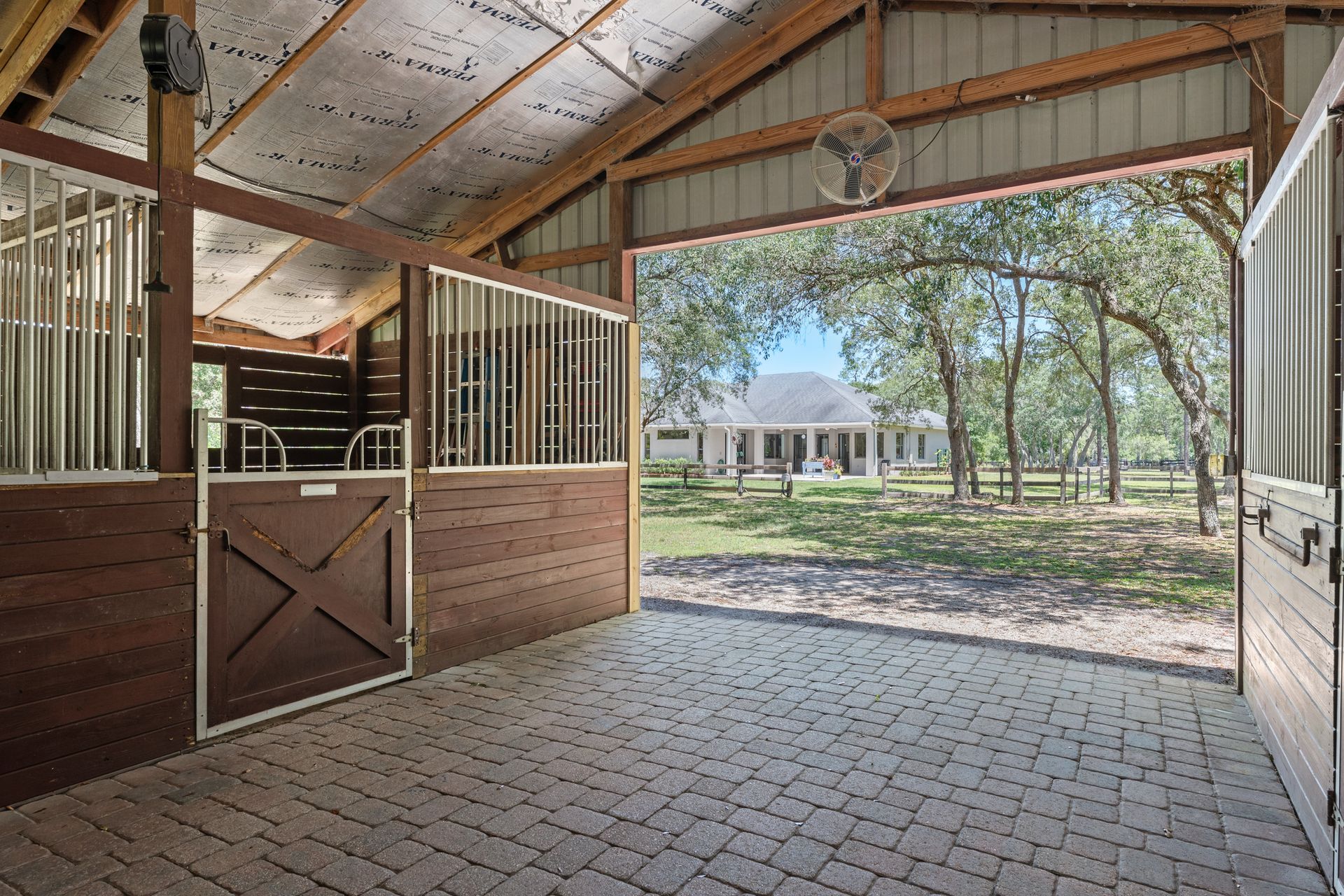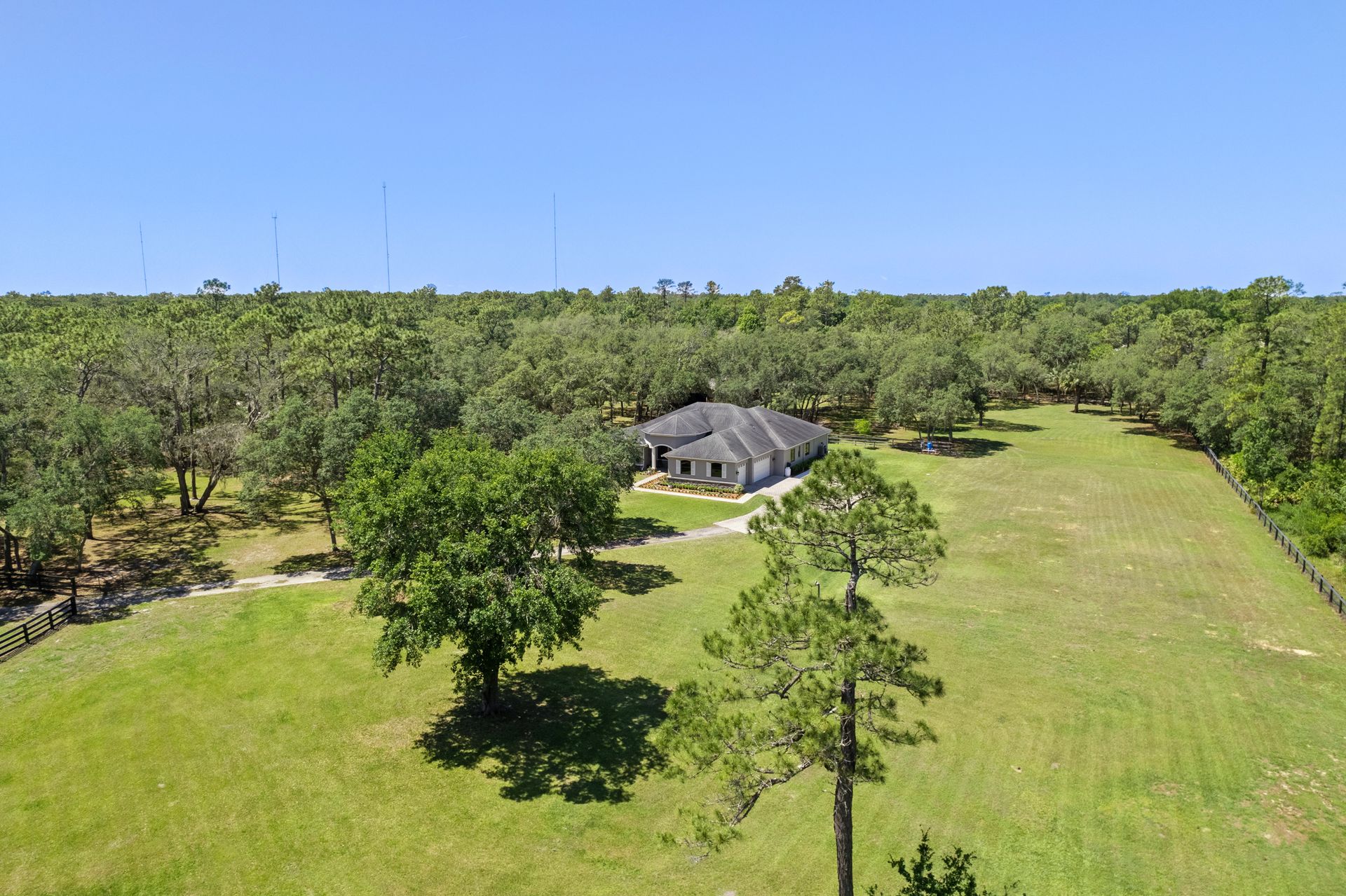 This gorgeous 5.25-acre estate is located at the end of a cul-de-sac and features an 8-stall barn that is well-maintained and ready for your horses. The barn features a tack room with A/C, feed room with refrigerator, two inside wash racks, insulated roof system along with extra wide 14-foot brick paver isle way for traction and easy drainage. The feed room is plumbed to add a water heater. Barn is also equipped with a compressor for car enthusiasts. The property offers a separate entrance to the barn on the backside of the property for tenants or horse trailers, farrier and vet. There is plenty of land to add more pasture areas at the front of property. The barn and the property are a horse-lovers dream, but the interior of the four bedroom, three bath home is a showstopper! Most rooms have been freshly painted and the dark hardwood floors are complemented by the soaring ceilings. A gourmet kitchen offers granite counters, center island, breakfast bar, stainless steel appliances and a wine fridge. The eat-in nook offers a fabulous view of the covered patio and barn through the massive seamless glass window. The primary suite with dual closets has private access to a covered lanai overlooking the peaceful and private back of the property. The patio is pre-plumbed for a future outdoor gas grill/kitchen area. The en-suite bath is a spa-like retreat with centerpiece jetted garden tub, separate oversized, glass-enclosed shower stall and individual vanities with granite counters. The exterior of the home was painted in 2019. Constructed with Icynene foam insulation and double-lined walls means low electric bills. The three-car garage features overhead storage racks and closet organization system. Must-have features in any rural estate home include a 3HP deep water well, concrete gravity septic and water softener system. This peaceful, private and quiet setting and is only minutes to 419 for easy access to major highways for a quick commute and area schools. Welcome Home!
