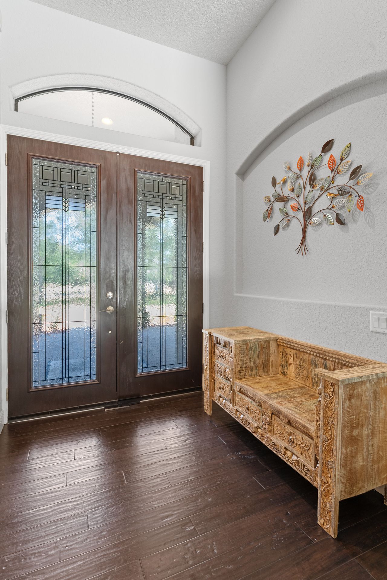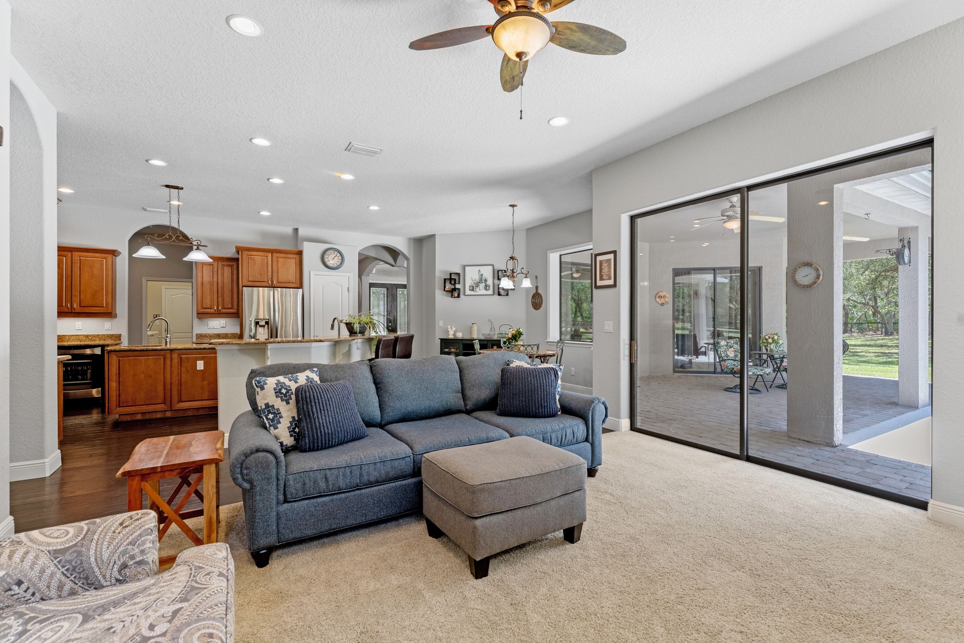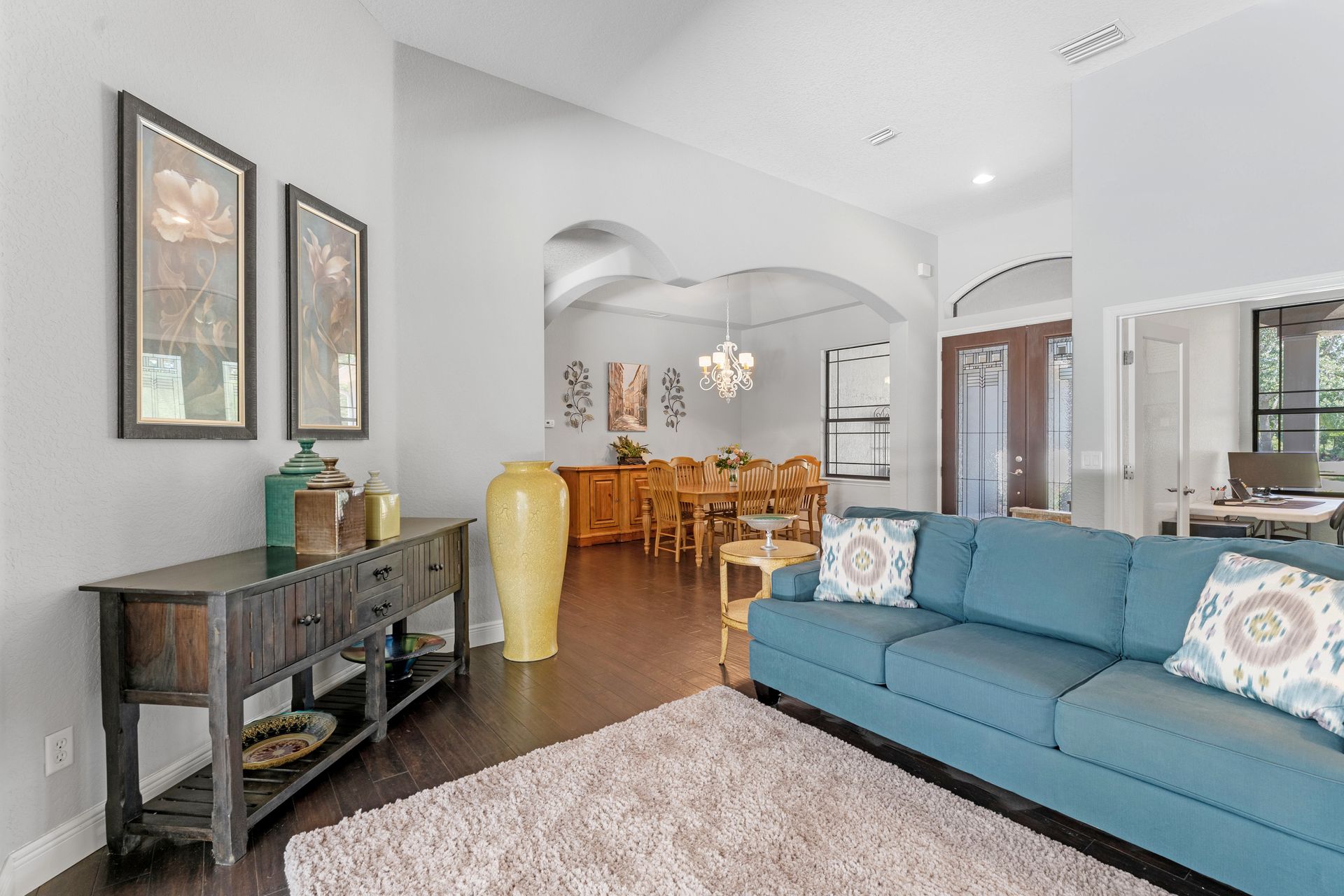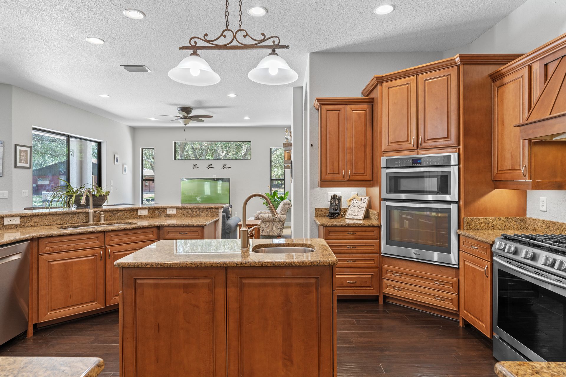 This gorgeous 5.25-acre estate is located at the end of a cul-de-sac and features an 8-stall barn that is well-maintained and ready for your horses. The barn features a tack room with A/C, feed room with refrigerator, two inside wash racks, insulated roof system along with extra wide 14-foot brick paver isle way for traction and easy drainage. The feed room is plumbed to add a water heater. Barn is also equipped with a compressor for car enthusiasts. The property offers a separate entrance to the barn on the backside of the property for tenants or horse trailers, farrier and vet. There is plenty of land to add more pasture areas at the front of property. The barn and the property are a horse-lovers dream, but the interior of the four bedroom, three bath home is a showstopper! Most rooms have been freshly painted and the dark hardwood floors are complemented by the soaring ceilings. A gourmet kitchen offers granite counters, center island, breakfast bar, stainless steel appliances and a wine fridge. The eat-in nook offers a fabulous view of the covered patio and barn through the massive seamless glass window. The primary suite with dual closets has private access to a covered lanai overlooking the peaceful and private back of the property. The patio is pre-plumbed for a future outdoor gas grill/kitchen area. The en-suite bath is a spa-like retreat with centerpiece jetted garden tub, separate oversized, glass-enclosed shower stall and individual vanities with granite counters. The exterior of the home was painted in 2019. Constructed with Icynene foam insulation and double-lined walls means low electric bills. The three-car garage features overhead storage racks and closet organization system. Must-have features in any rural estate home include a 3HP deep water well, concrete gravity septic and water softener system. This peaceful, private and quiet setting and is only minutes to 419 for easy access to major highways for a quick commute and area schools. Welcome Home!