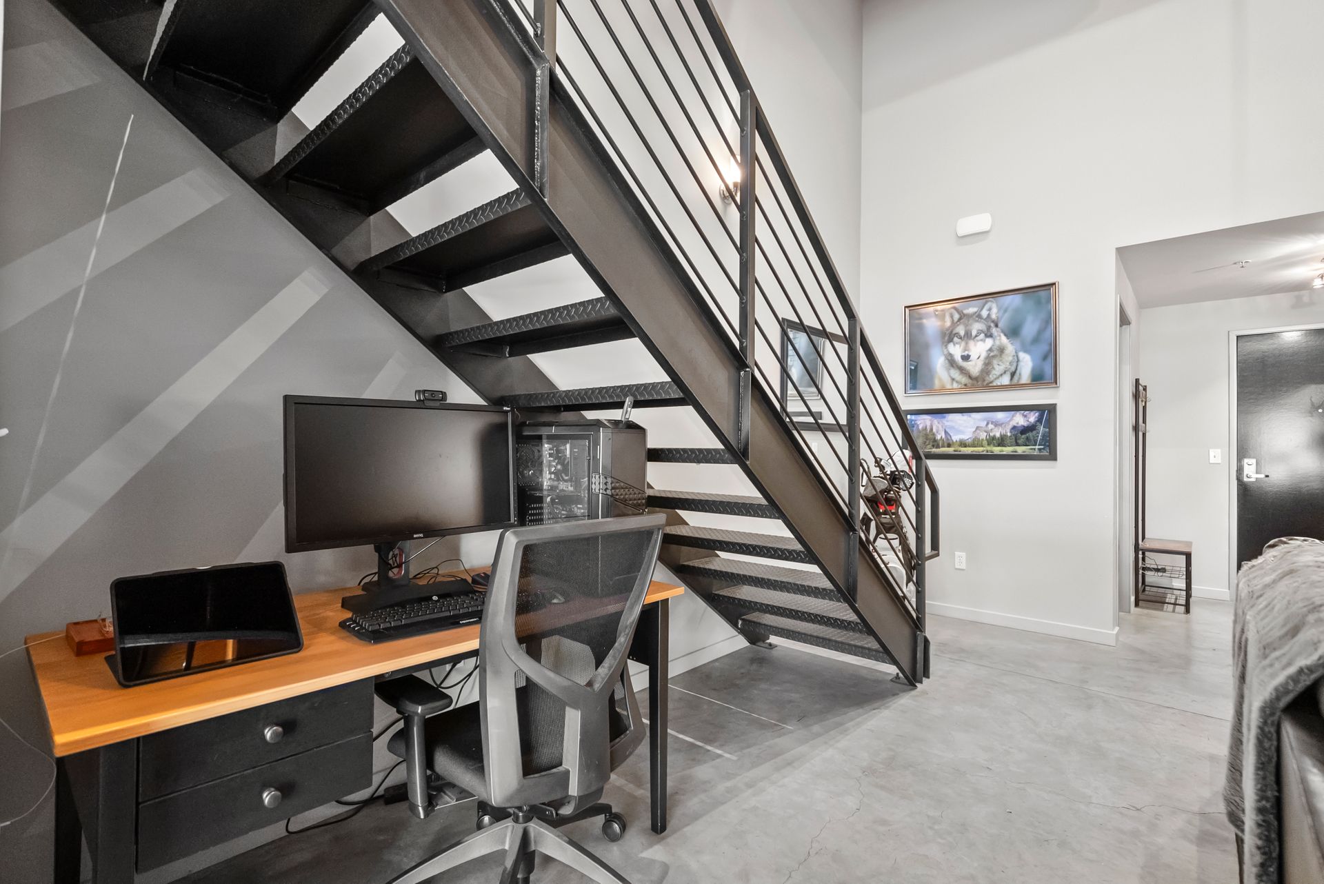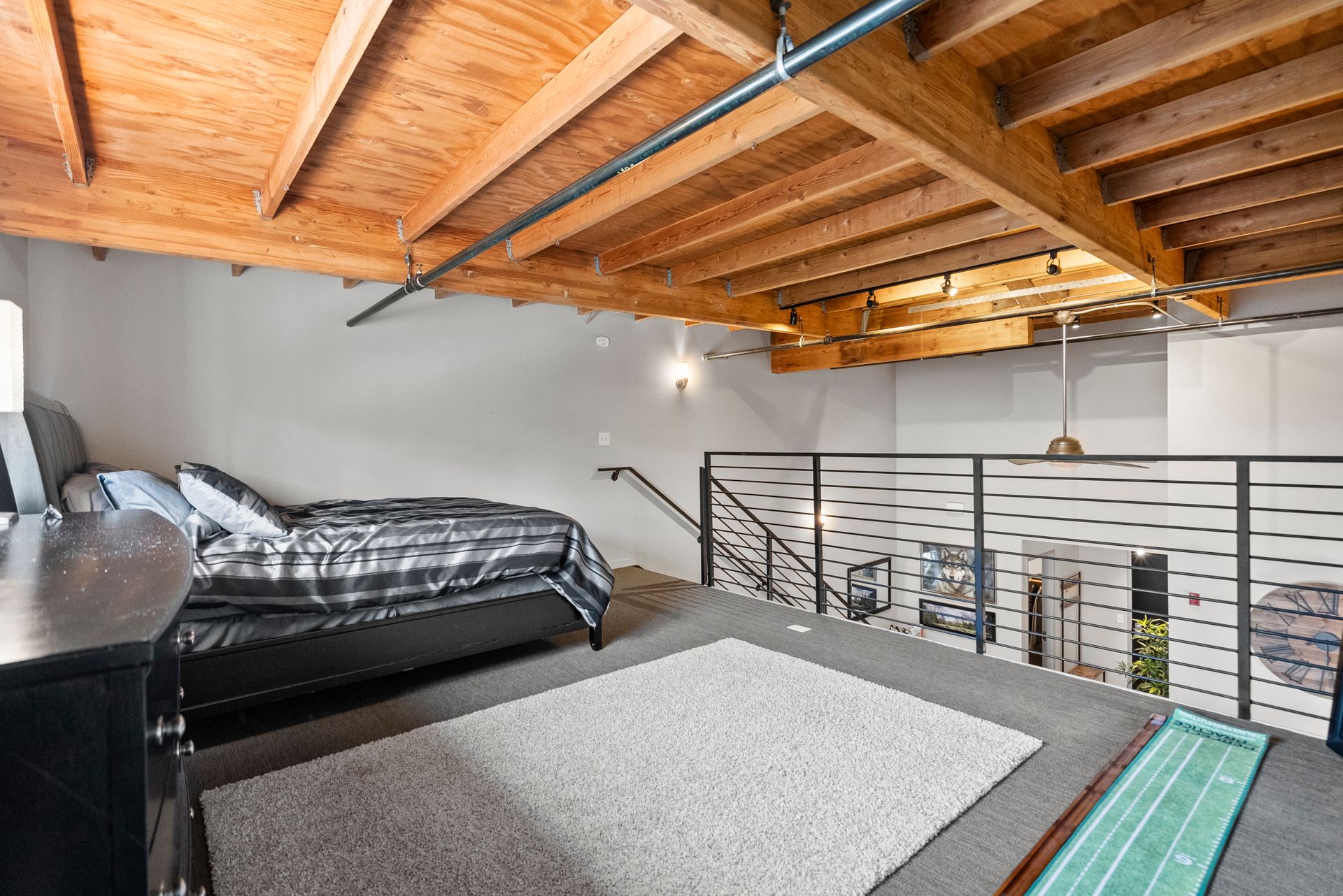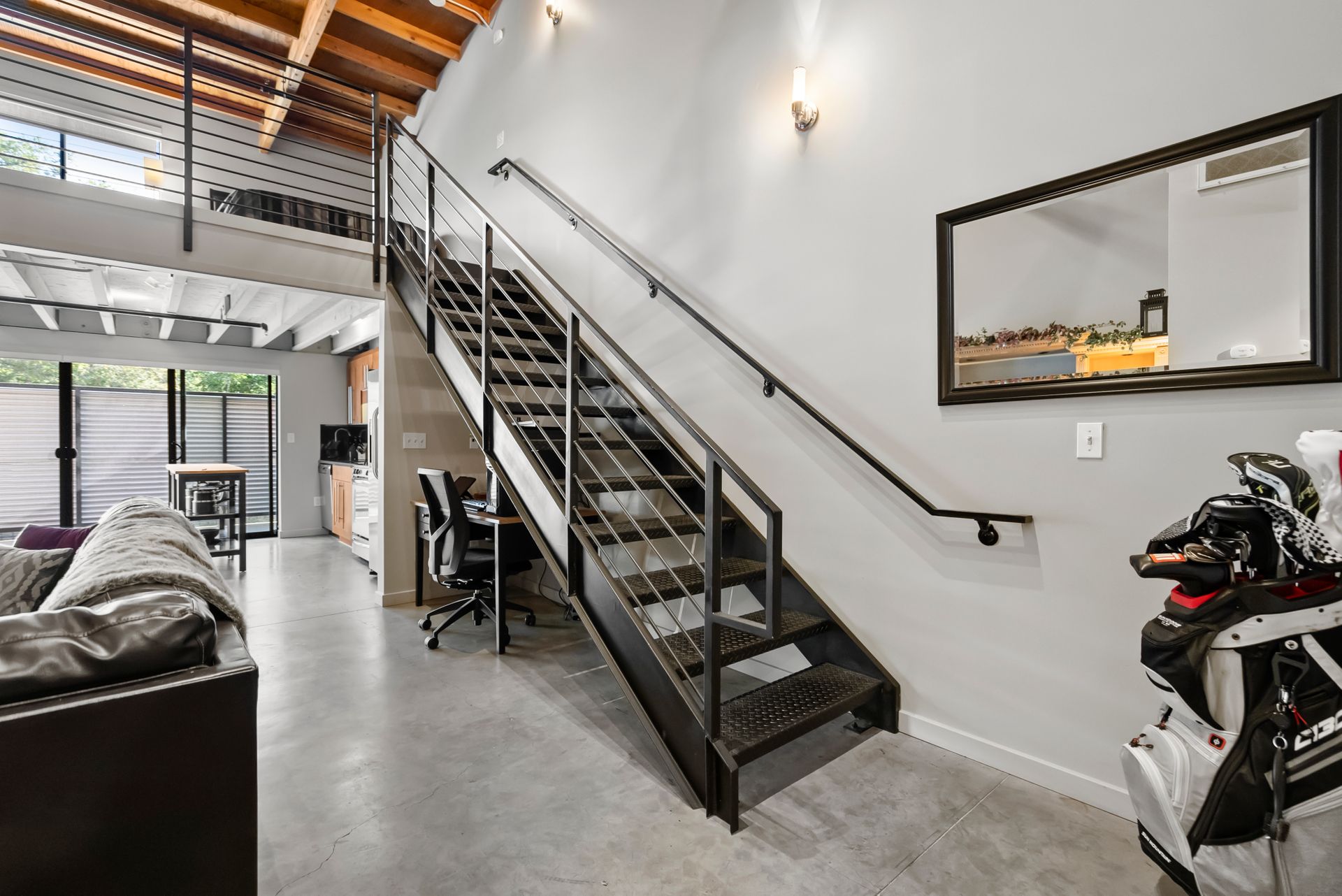 Welcome to Whiskey Hill Lofts, a premier condominium community in Midtown. This spacious one bedroom, one bath loft boasts approximately 974 square feet of livable space flooded with natural light, complemented by extra ceiling lights installed in 2021, creating a warm and inviting ambiance. Enjoy high ceilings with exposed beams and ductwork, stainless steel appliances and granite countertops in the open kitchen. The spacious bedroom on the mezzanine level is a tranquil retreat. The unit features a slider opening to a private patio, ideal for enjoying peaceful mornings or relaxing evenings outdoors. This unit stands out with a rare in-unit water heater and a detached single car garage with a newer opener in 2024. Security is ensured with a code-protected front door. HOA covers sewer, water, trash, the utility bill, landscaping, the roof and exterior maintenance.