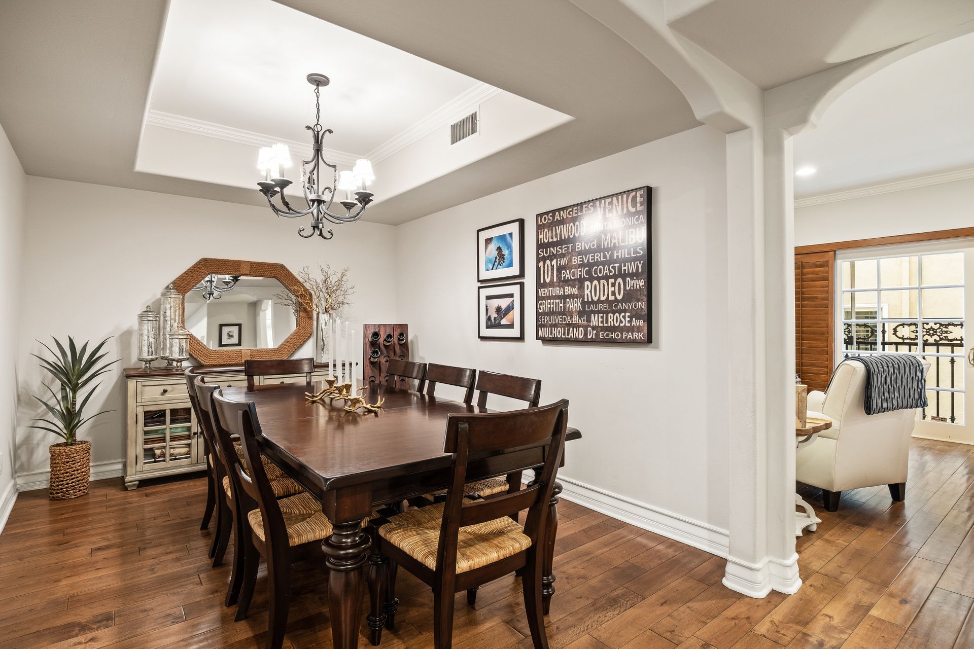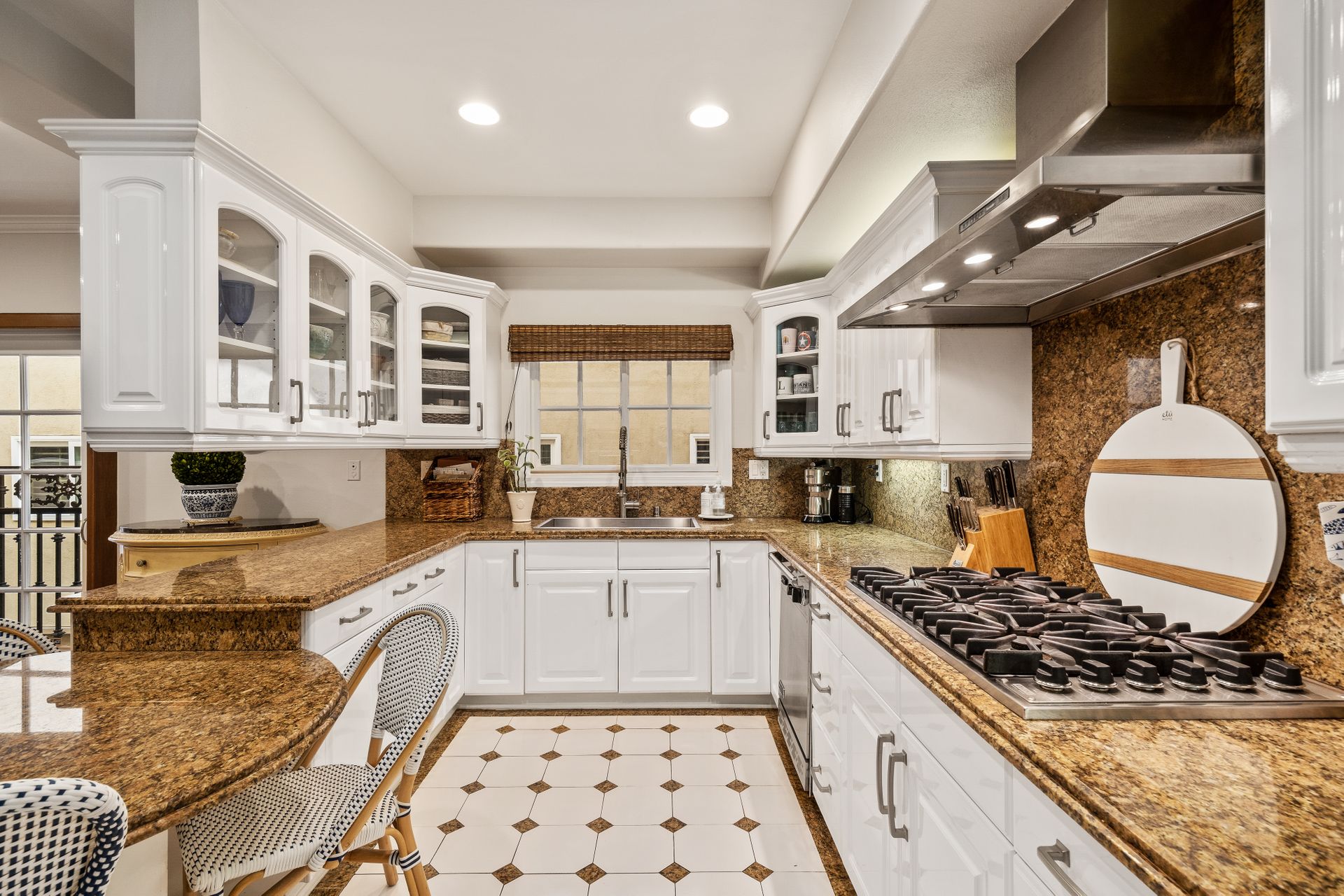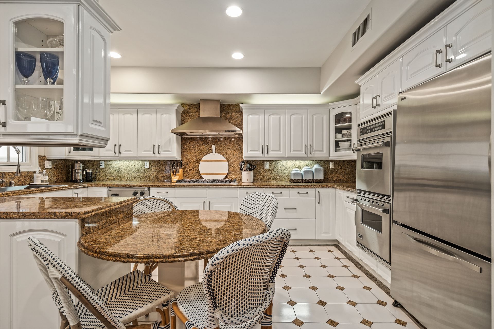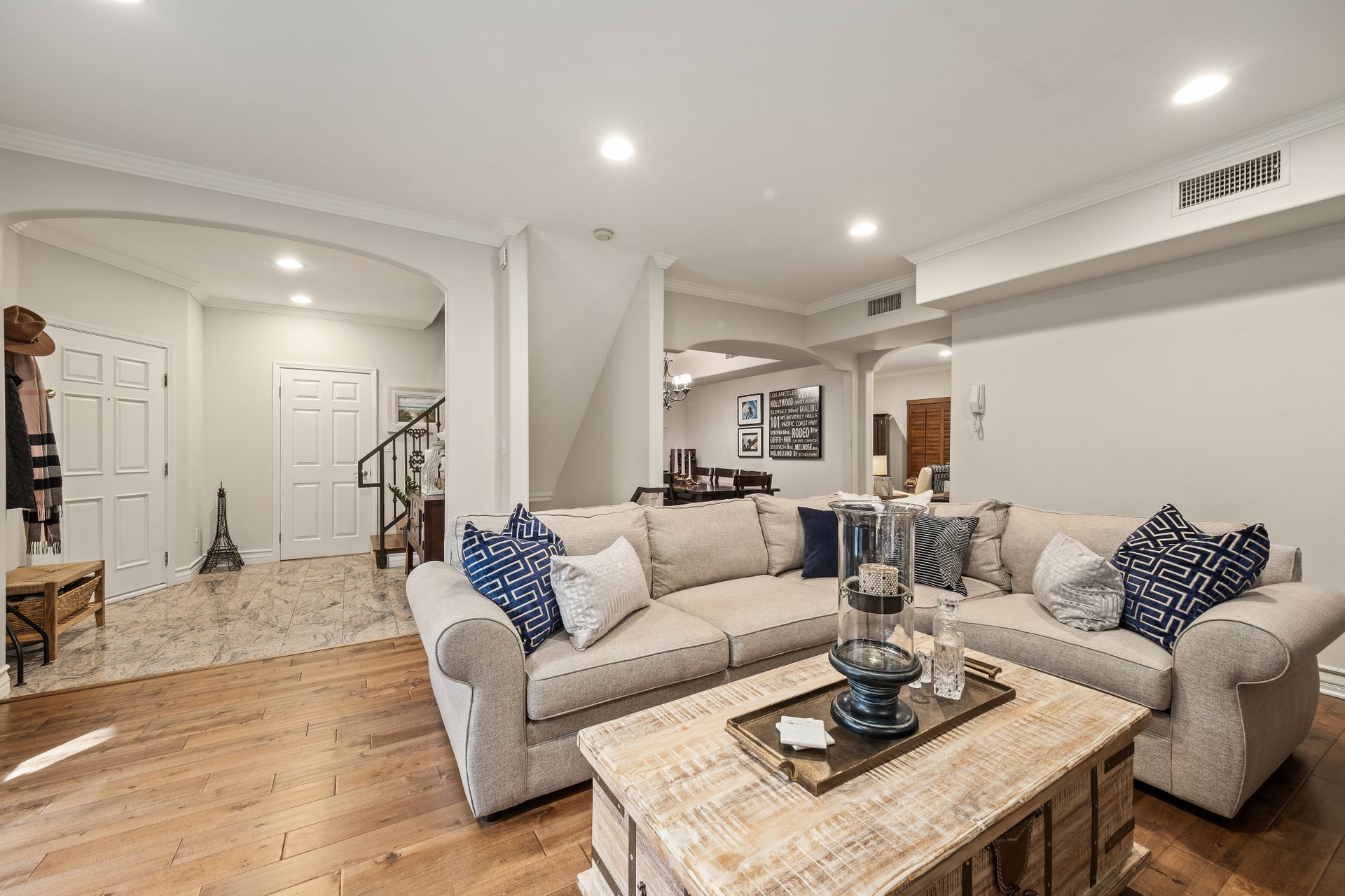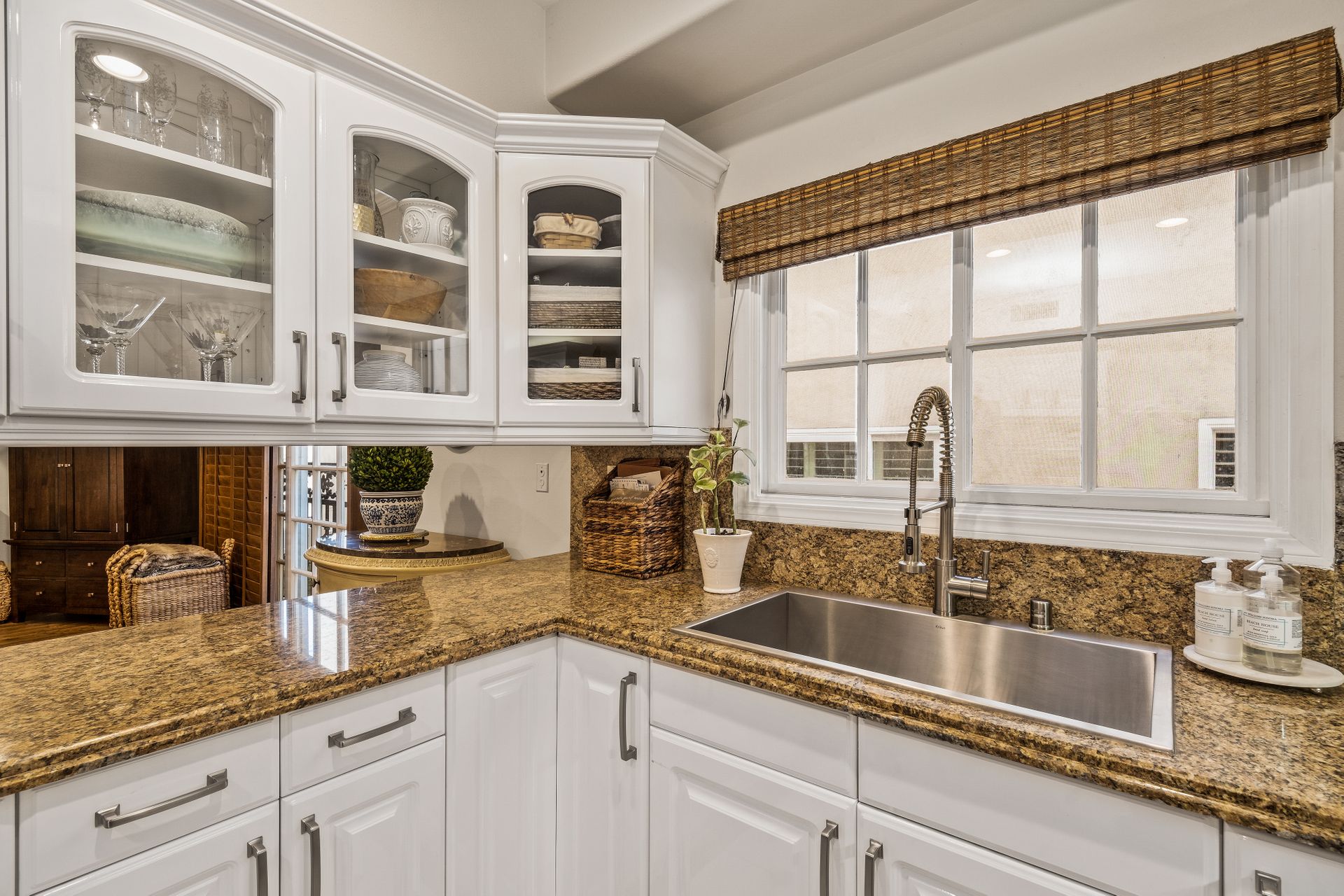 A polished-tile foyer on the main level leads to well-defined living spaces which include a large living room, formal dining room with coffered ceiling, and a spacious family room all with arched entryways, recessed lighting, and crown molding. Glistening wide-plank walnut floors, matching plantation shutters, a totally chic fireplace/mantel, and French doors provide a luxurious accent. The updated gourmet kitchen with breakfast table has all stainless Viking appliances, under cabinet lighting, and an updated stainless single-basin sink.