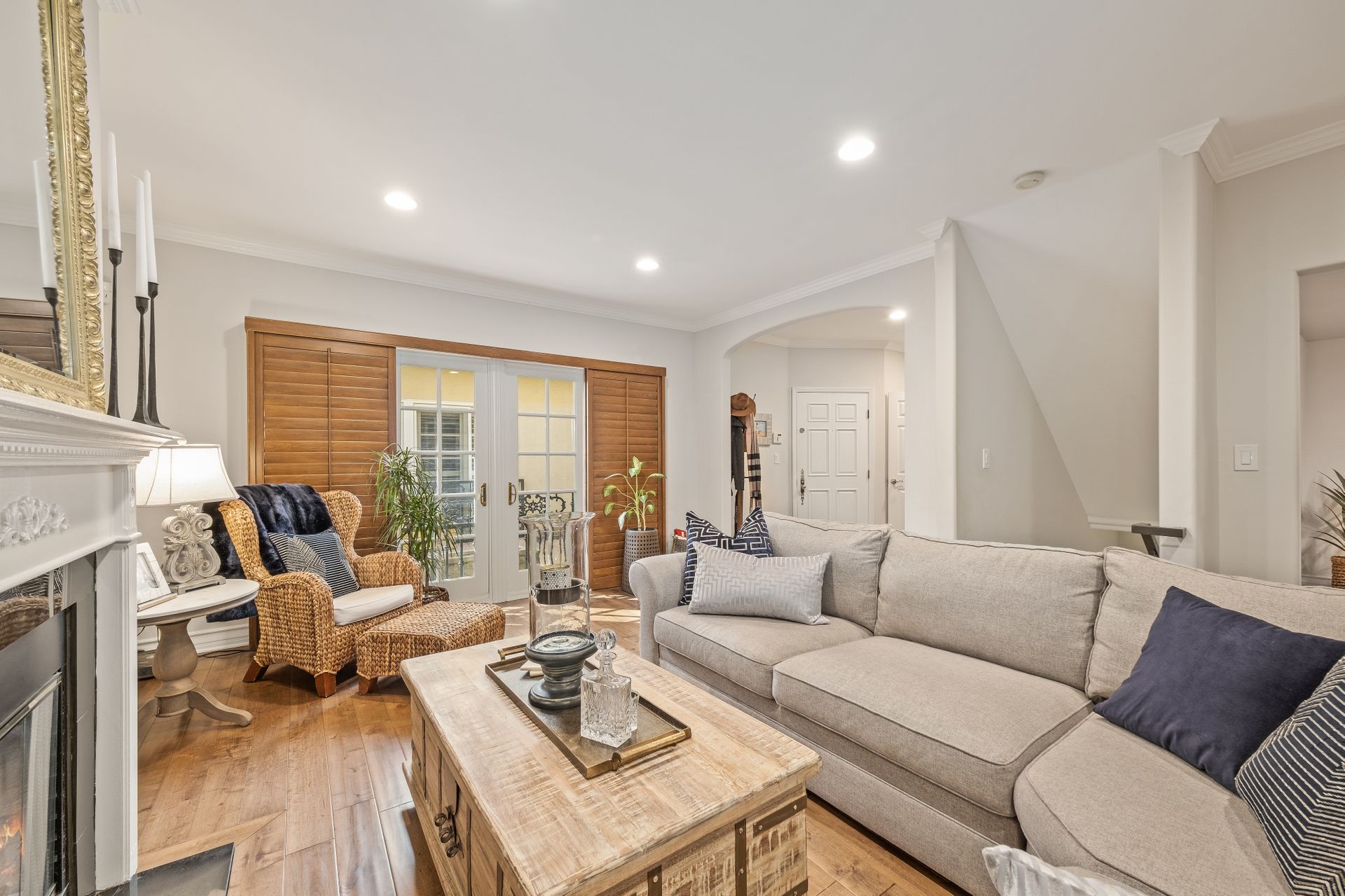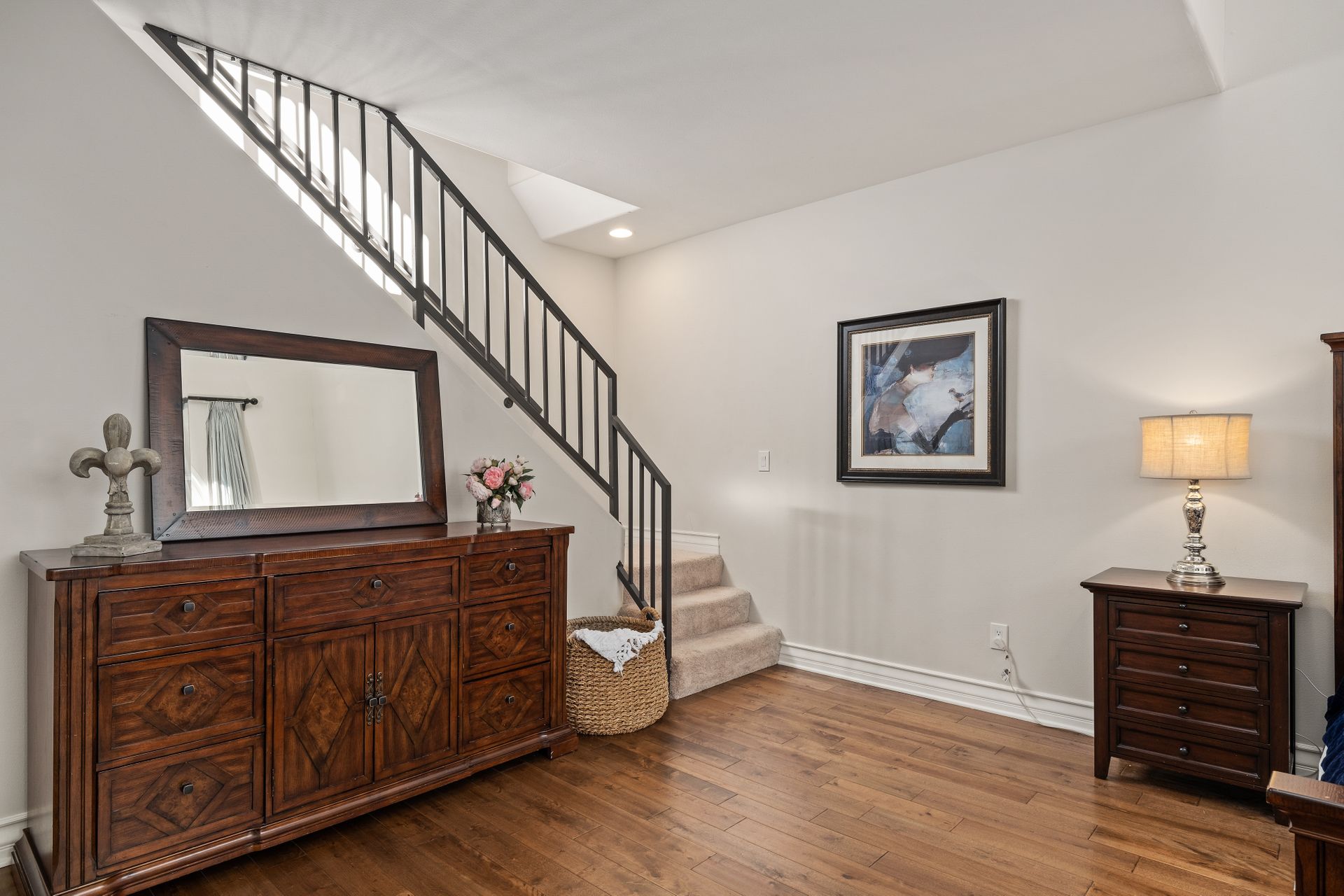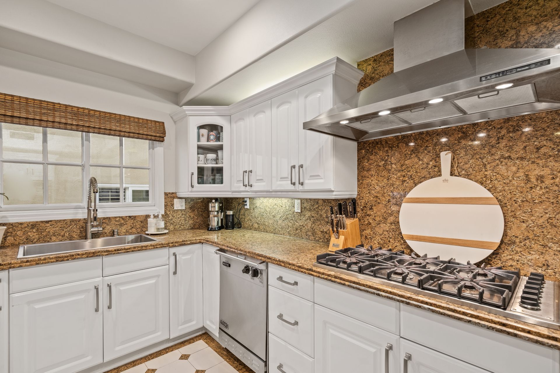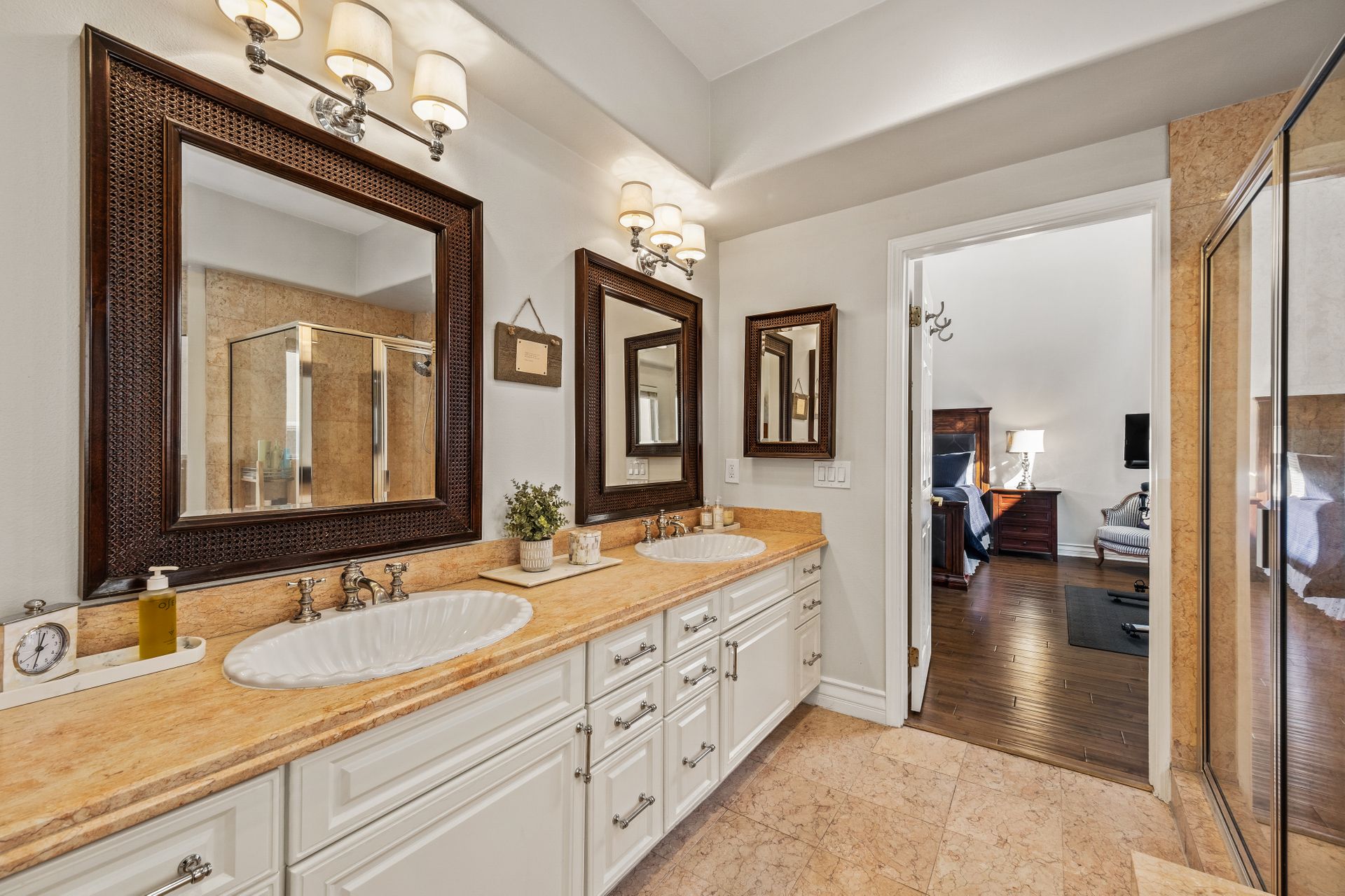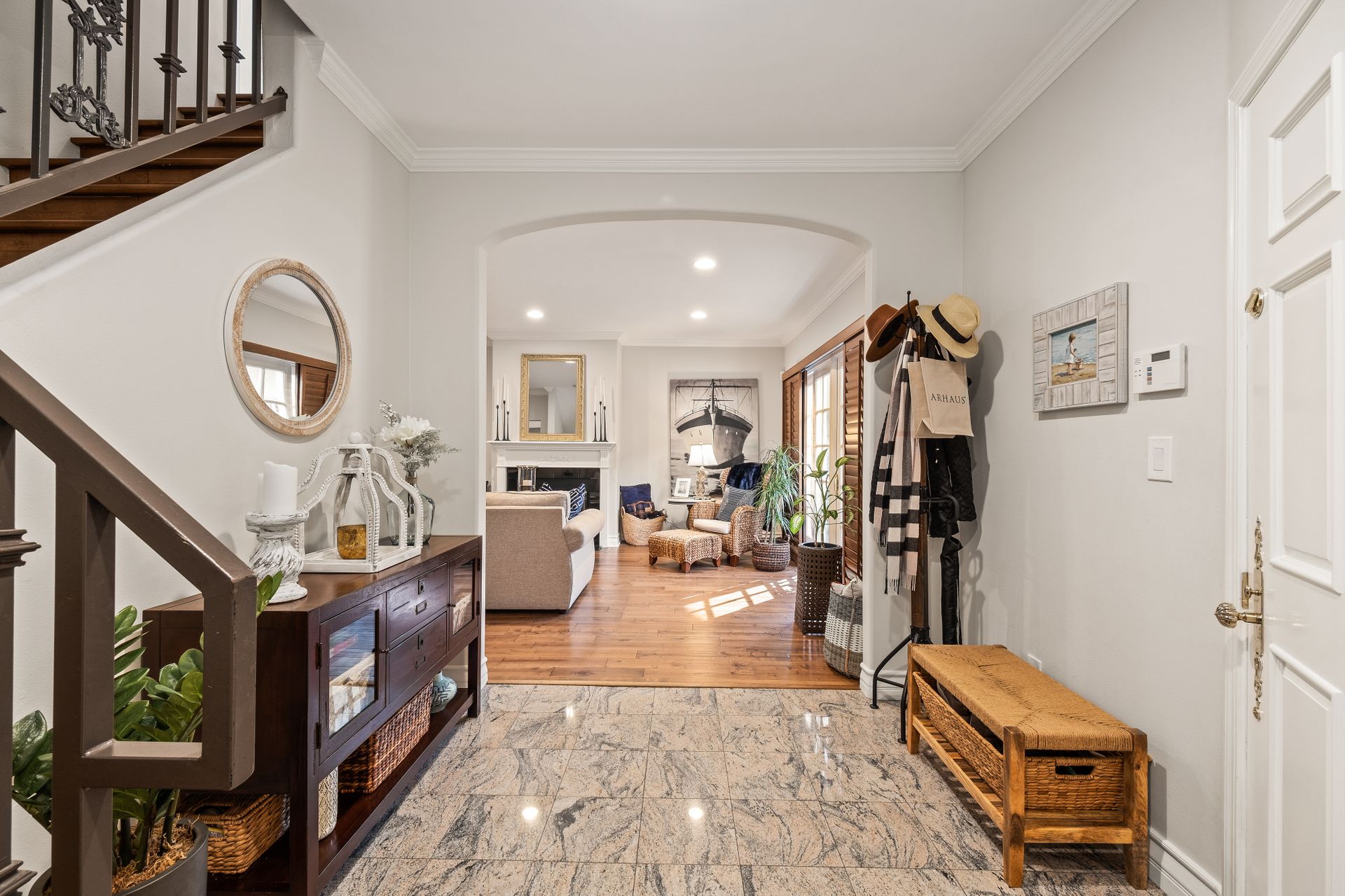 A polished-tile foyer on the main level leads to well-defined living spaces which include a large living room, formal dining room with coffered ceiling, and a spacious family room all with arched entryways, recessed lighting, and crown molding. Glistening wide-plank walnut floors, matching plantation shutters, a totally chic fireplace/mantel, and French doors provide a luxurious accent. The updated gourmet kitchen with breakfast table has all stainless Viking appliances, under cabinet lighting, and an updated stainless single-basin sink.