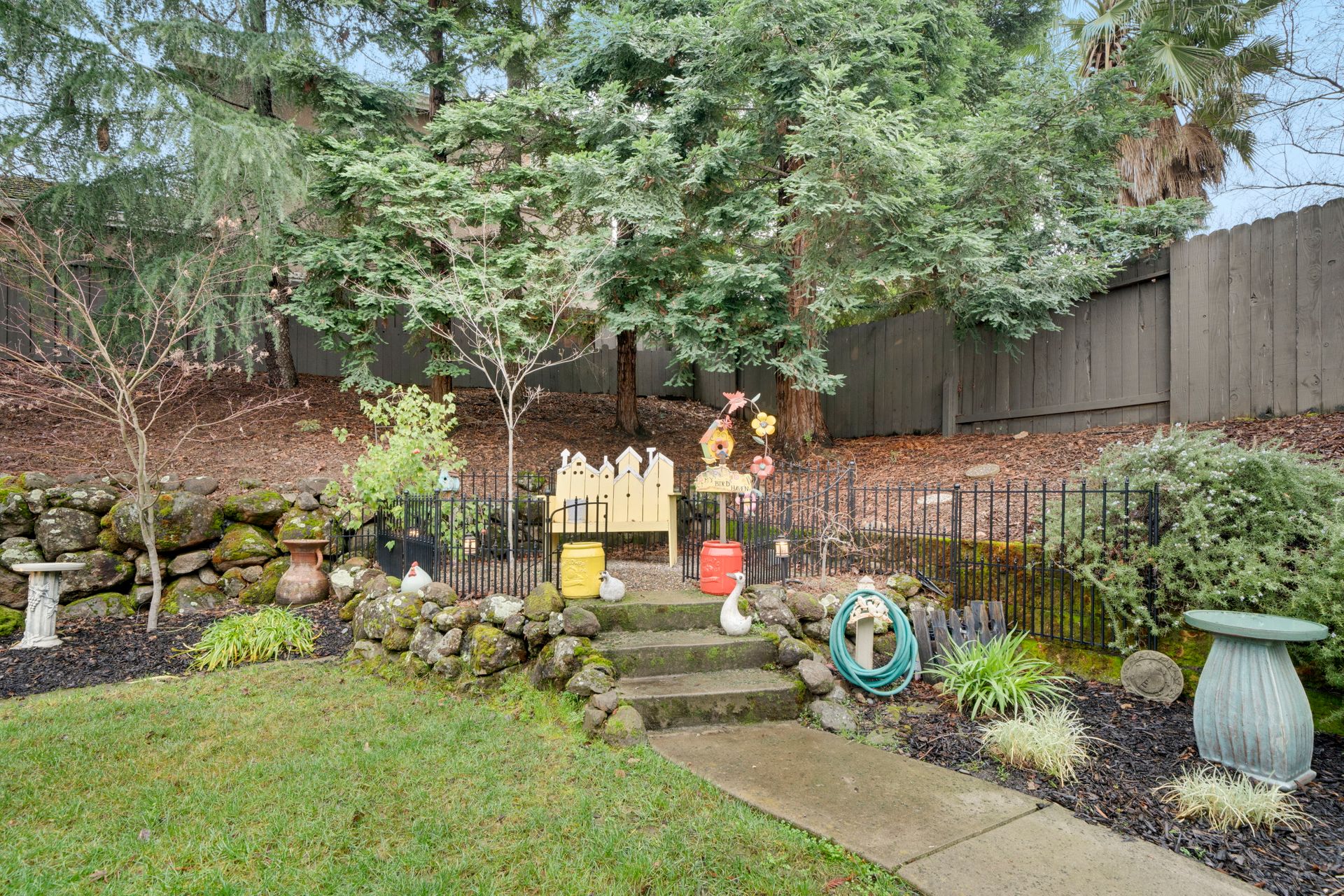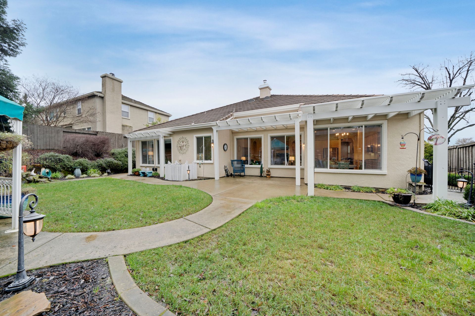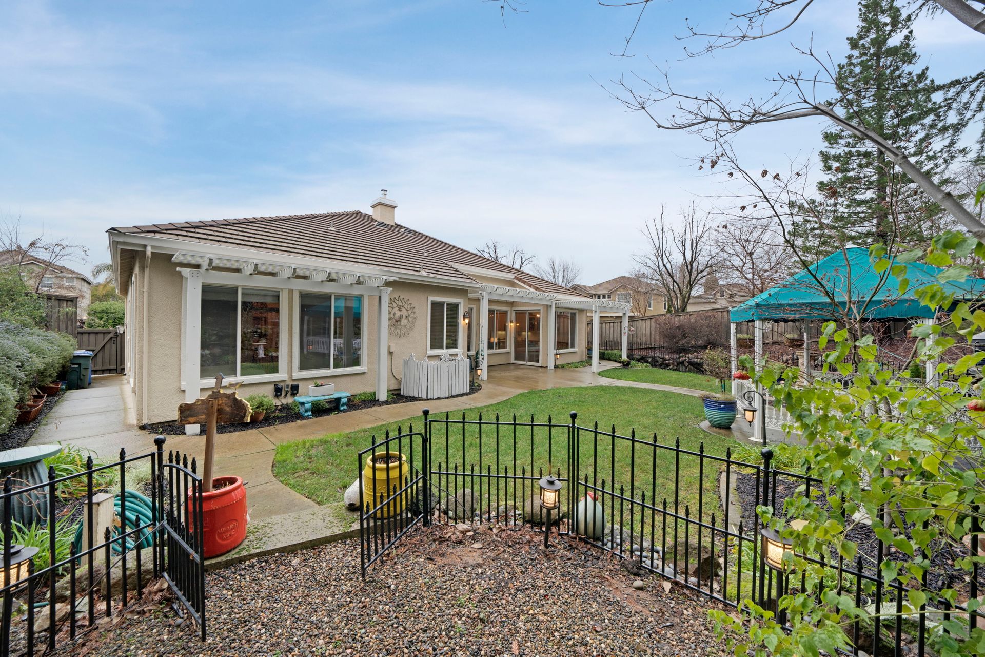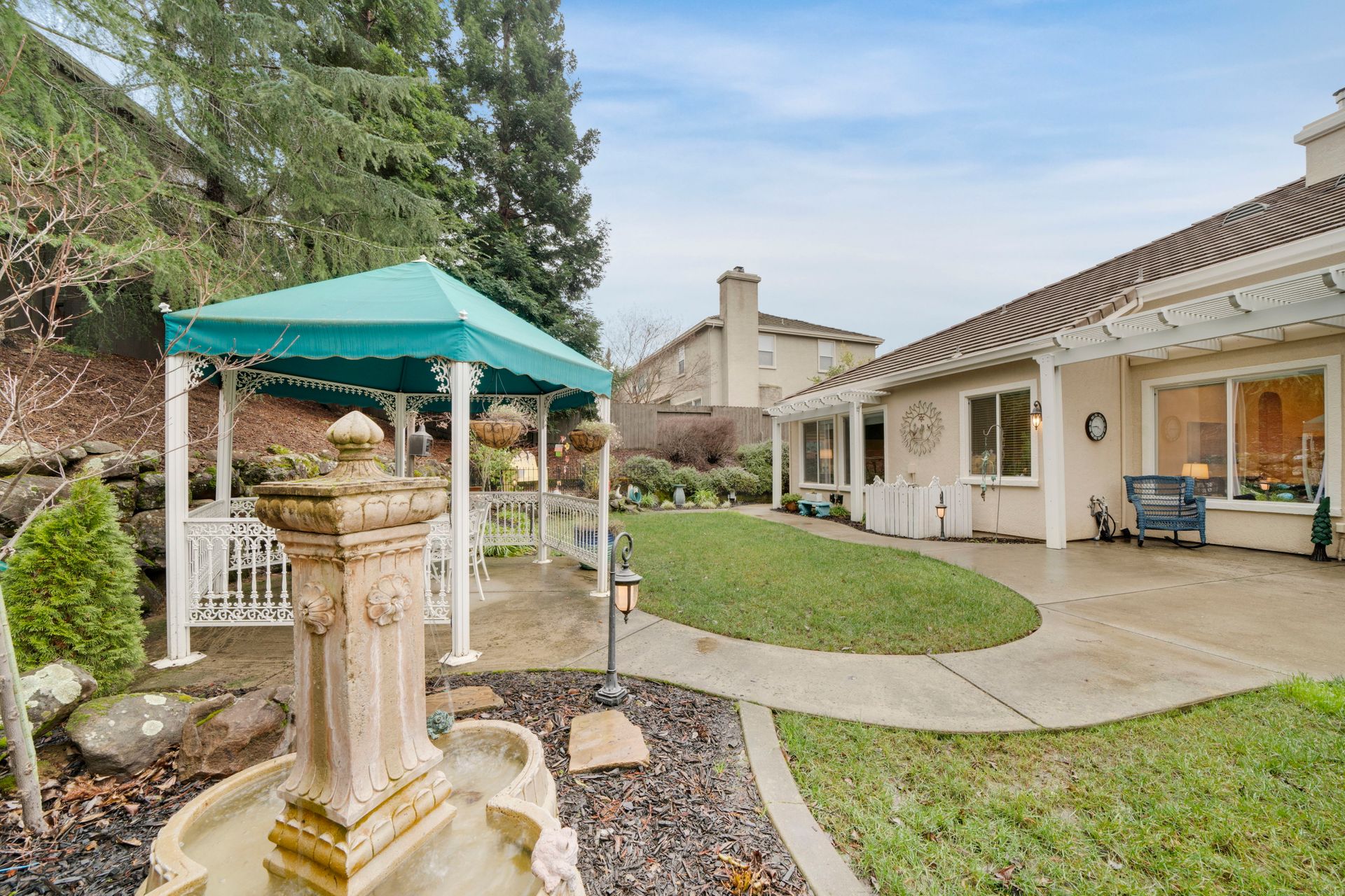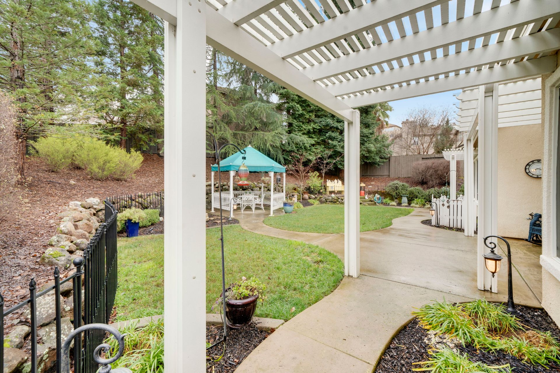 Situated on close to a quarter acre, a coveted corner lot at the end of a double cul-de-sac, this Empire Ranch home blends modern design with timeless comfort. Natural light floods the open floor plan, highlighting the stylish earth-tone flooring and thoughtful details throughout. The kitchen is a showstopper, featuring quartzite counters, stainless steel appliances, a gas range, and a spacious island ideal for meal prep or casual gatherings. The adjoining nook and family room offer a seamless flow, with large windows overlooking the backyard and a cozy fireplace to elevate your downtime. The primary suite is a serene retreat with recessed ceilings, backyard views, a frameless glass shower, and a custom closet organizer. Practicality meets style with a dedicated laundry room, a garage with epoxy floors, built-in cabinets, and abundant storage. Venture outside to a private backyard sanctuary with a pergola, gazebo, lush trees, and plenty of space to unwind or entertain. This home offers the ideal balance of relaxation and sophistication in a Folsom prime location. Low HOA, no Mello Roos and near top performing schools. Enjoy being secluded but near parks, shopping, entertainment and restaurants. Come see!
