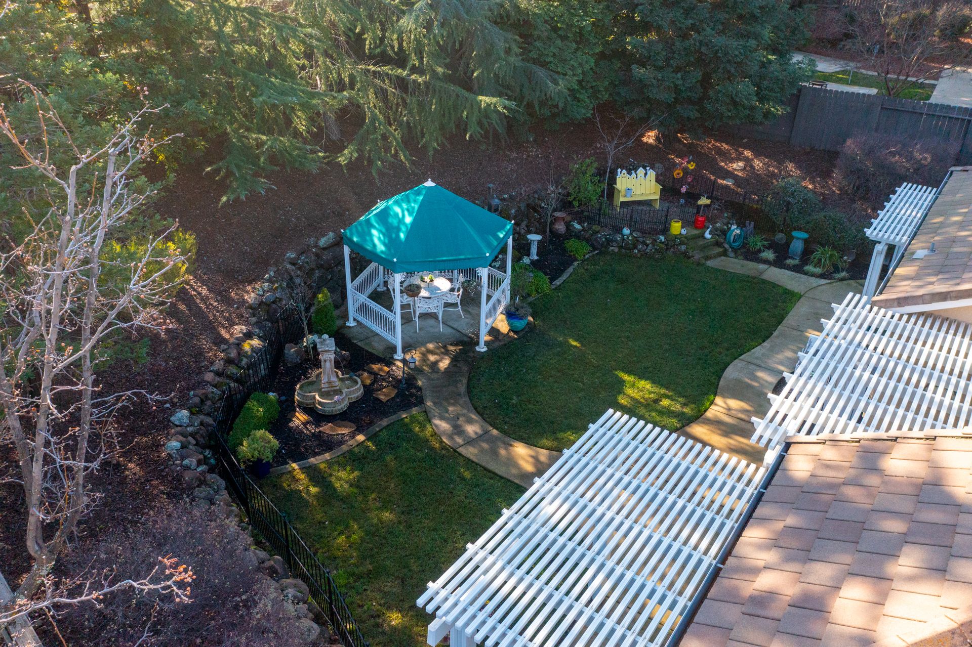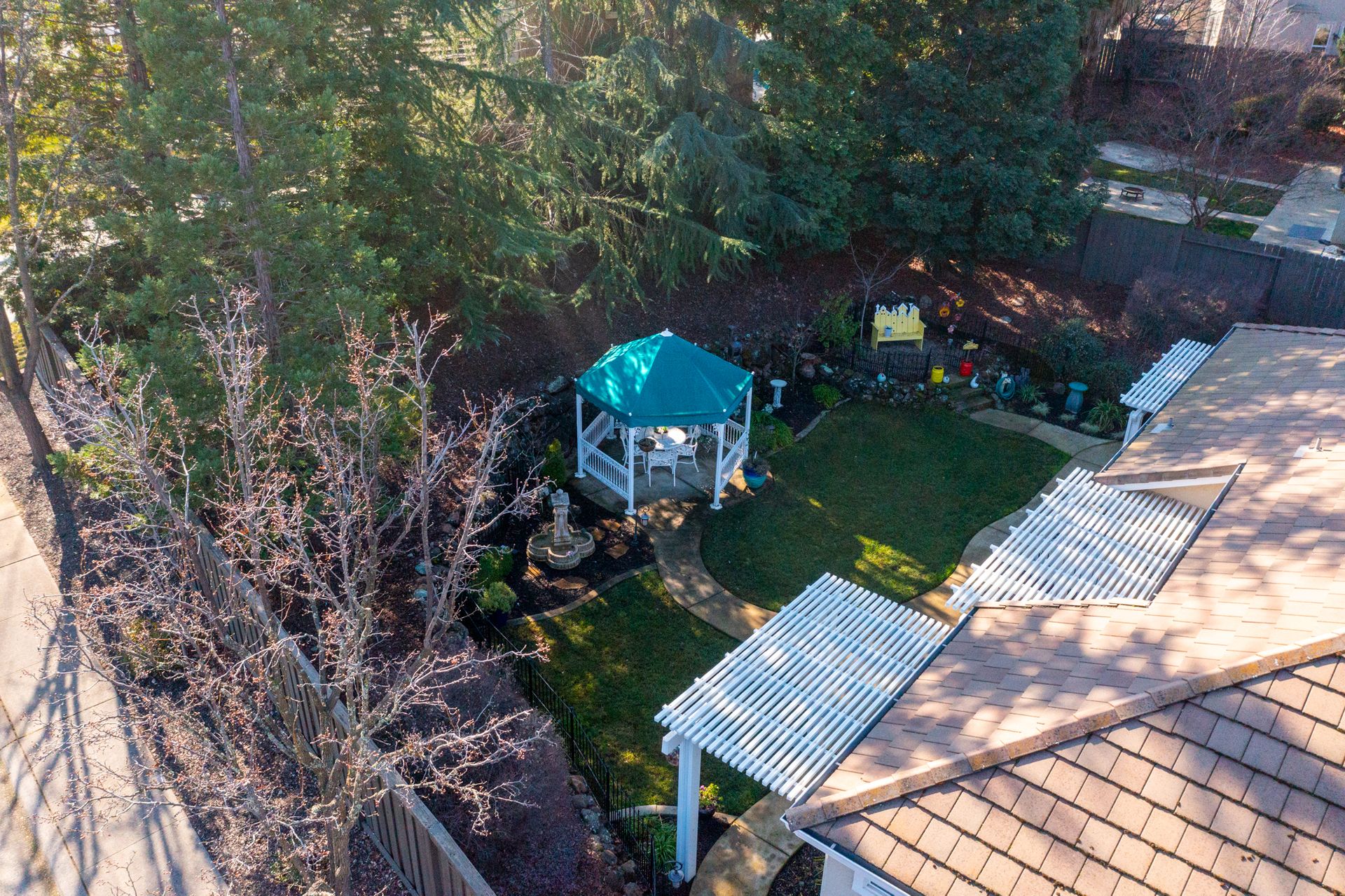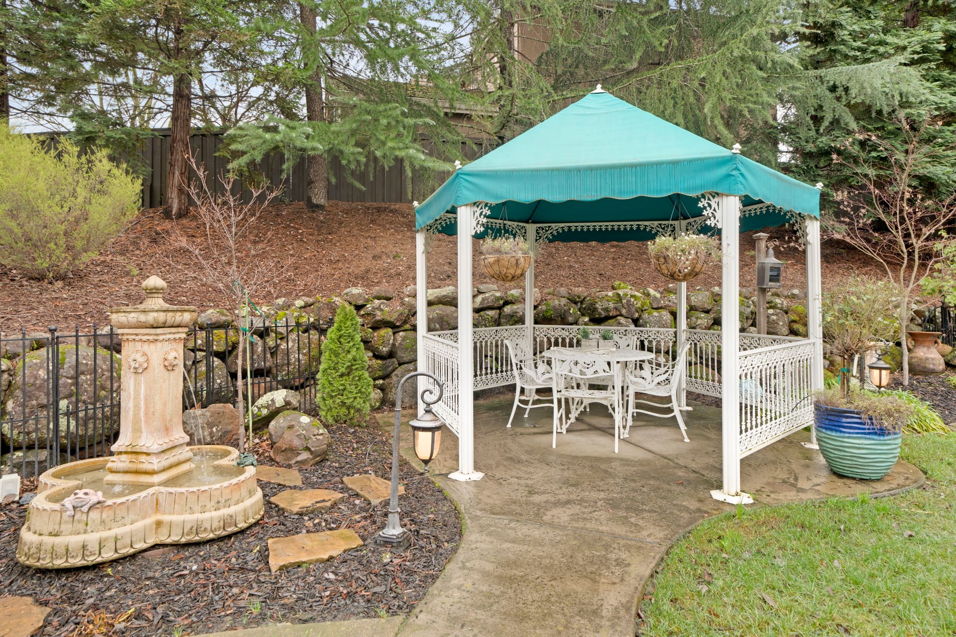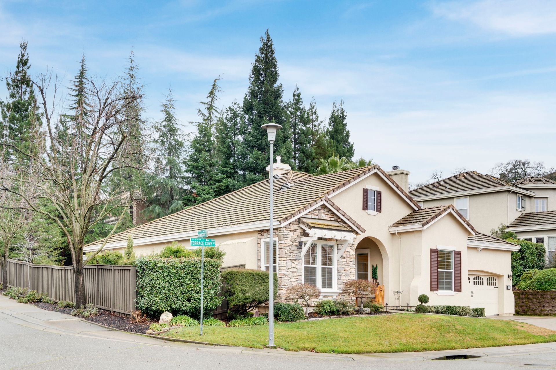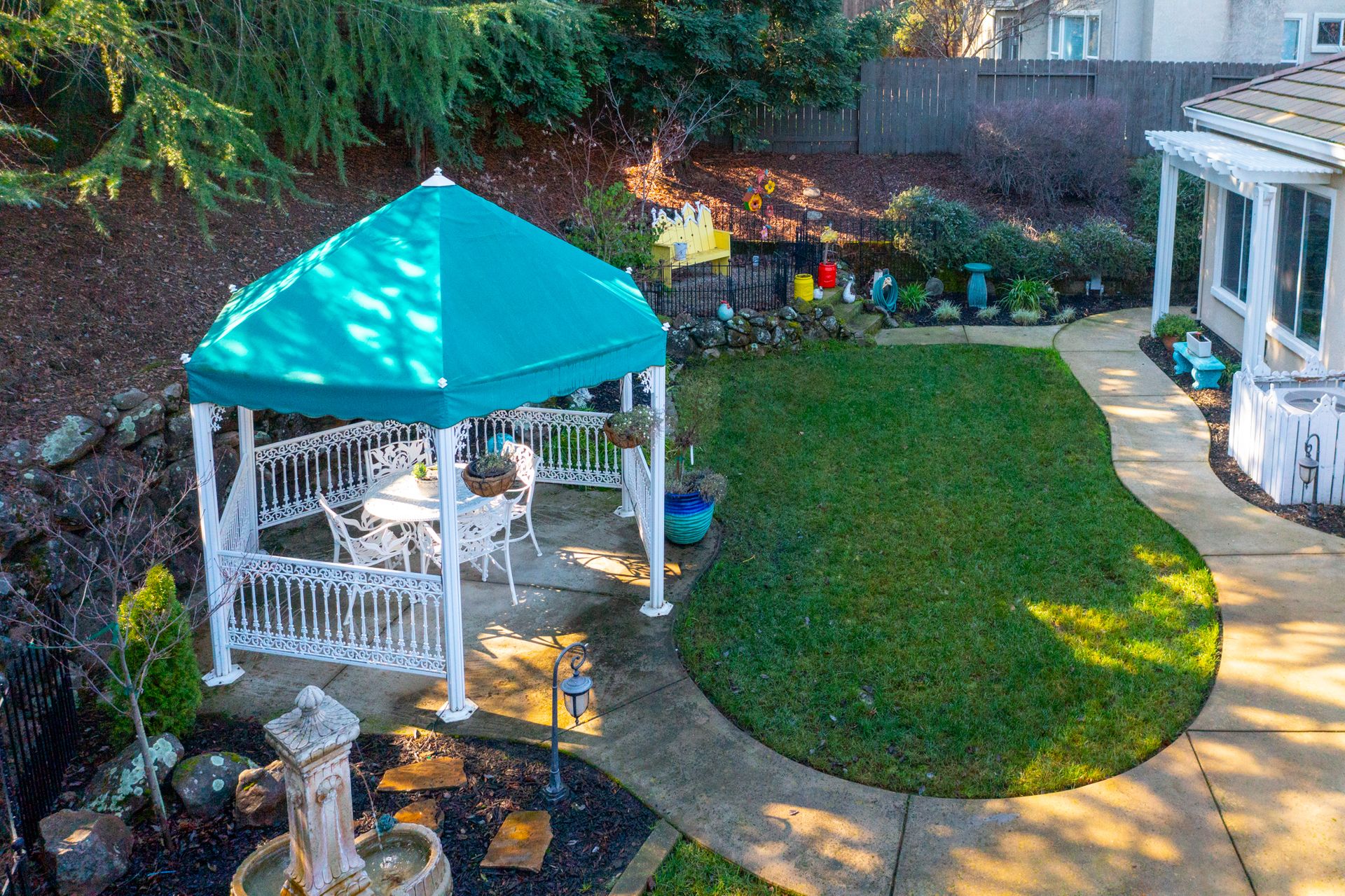 Situated on close to a quarter acre, a coveted corner lot at the end of a double cul-de-sac, this Empire Ranch home blends modern design with timeless comfort. Natural light floods the open floor plan, highlighting the stylish earth-tone flooring and thoughtful details throughout. The kitchen is a showstopper, featuring quartzite counters, stainless steel appliances, a gas range, and a spacious island ideal for meal prep or casual gatherings. The adjoining nook and family room offer a seamless flow, with large windows overlooking the backyard and a cozy fireplace to elevate your downtime. The primary suite is a serene retreat with recessed ceilings, backyard views, a frameless glass shower, and a custom closet organizer. Practicality meets style with a dedicated laundry room, a garage with epoxy floors, built-in cabinets, and abundant storage. Venture outside to a private backyard sanctuary with a pergola, gazebo, lush trees, and plenty of space to unwind or entertain. This home offers the ideal balance of relaxation and sophistication in a Folsom prime location. Low HOA, no Mello Roos and near top performing schools. Enjoy being secluded but near parks, shopping, entertainment and restaurants. Come see!