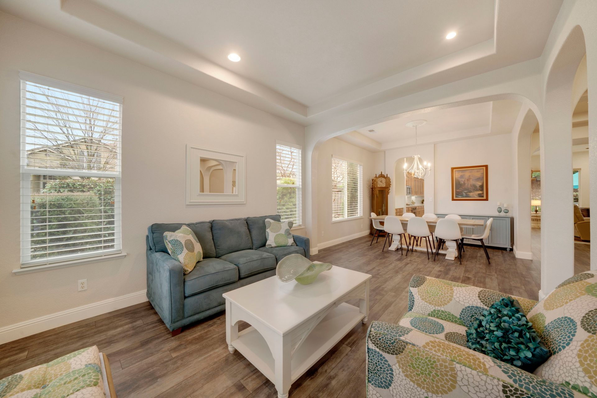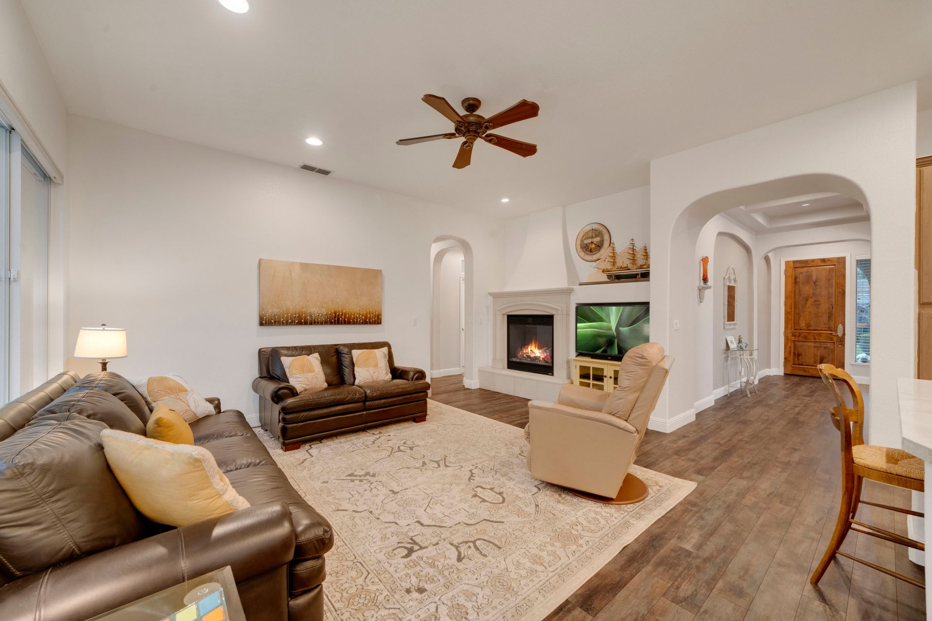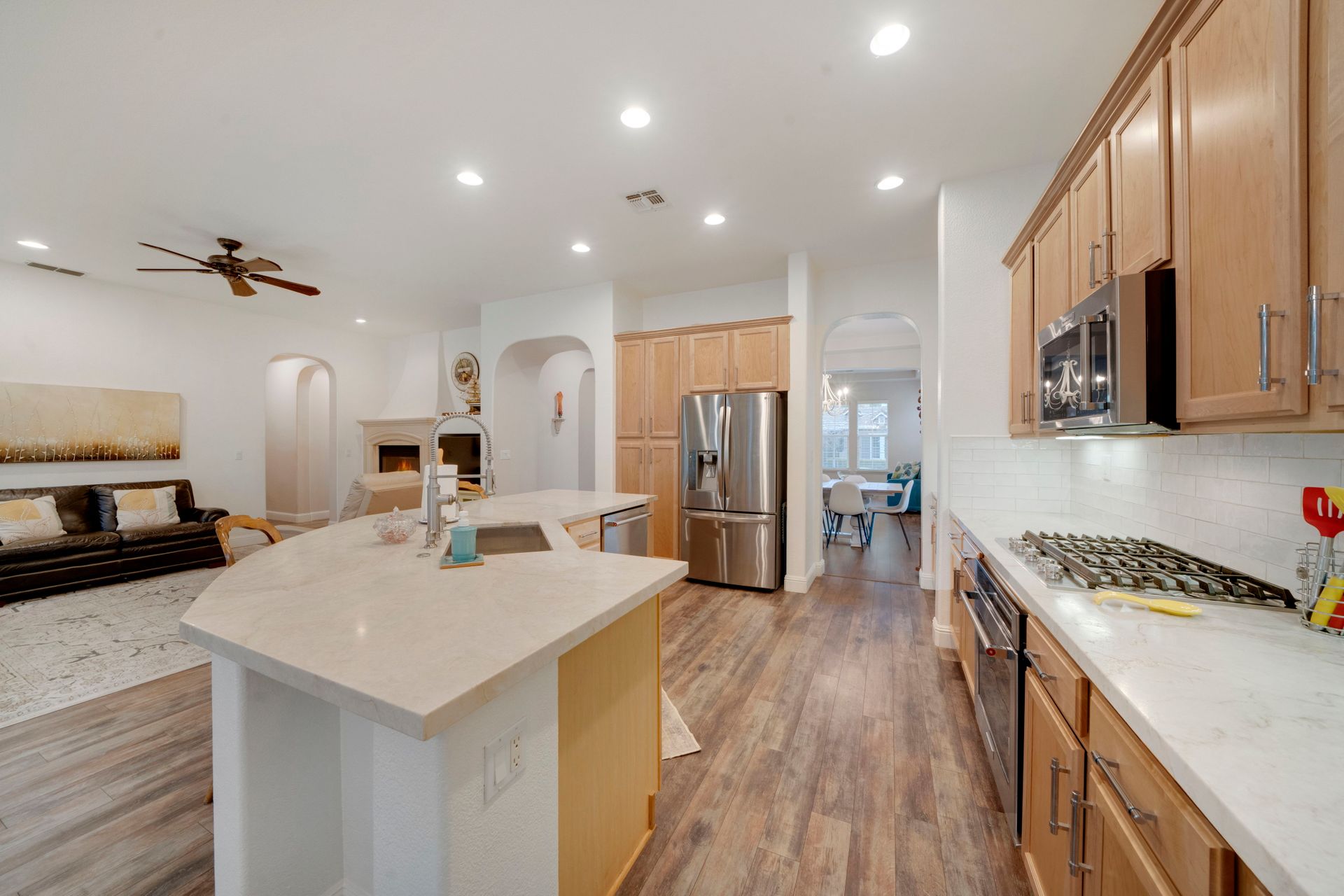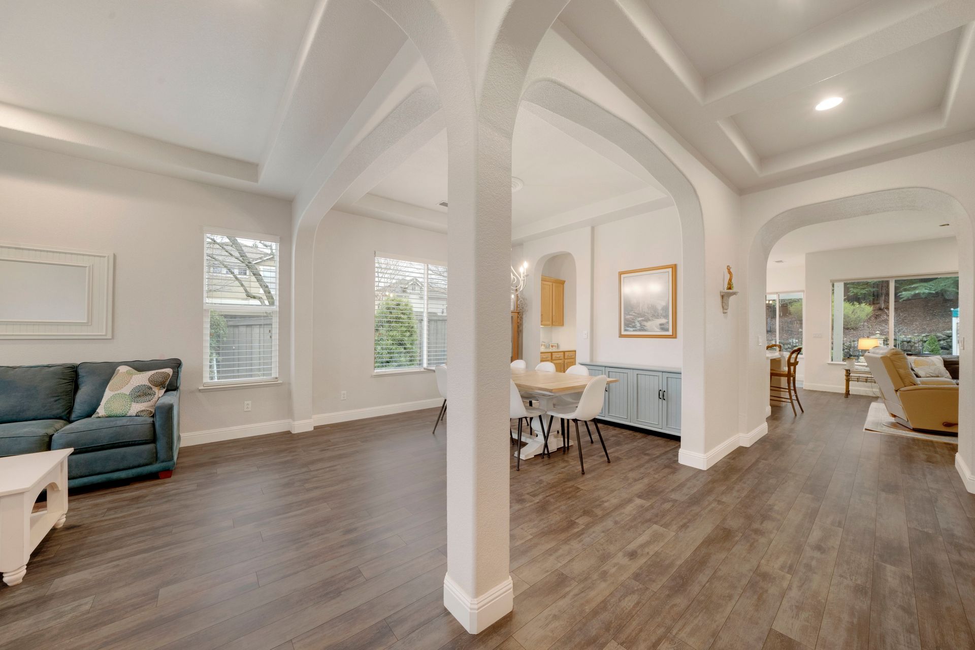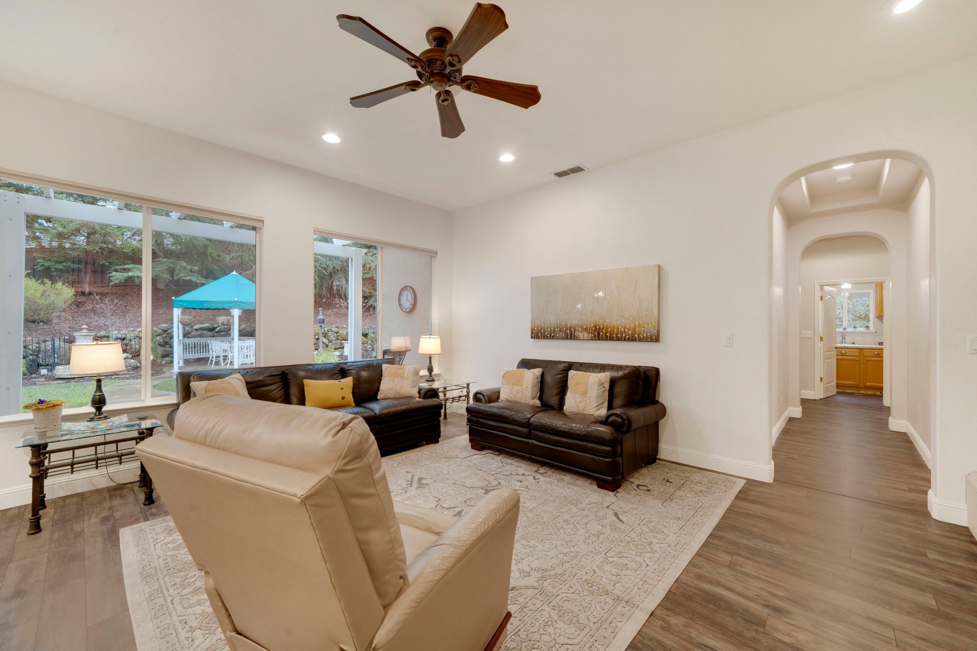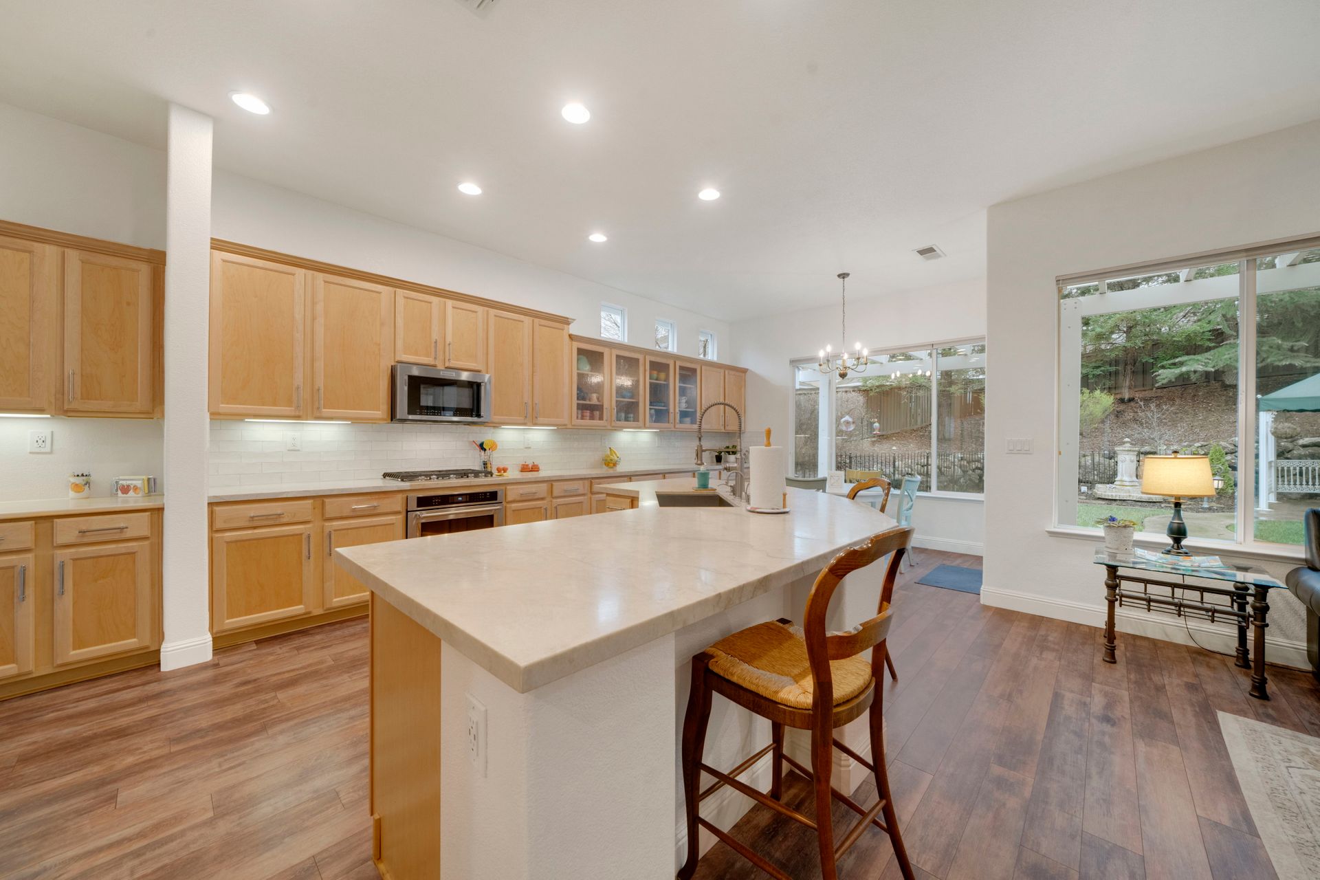Situated on close to a quarter acre, a coveted corner lot at the end of a double cul-de-sac, this Empire Ranch home blends modern design with timeless comfort. Natural light floods the open floor plan, highlighting the stylish earth-tone flooring and thoughtful details throughout. The kitchen is a showstopper, featuring quartzite counters, stainless steel appliances, a gas range, and a spacious island ideal for meal prep or casual gatherings. The adjoining nook and family room offer a seamless flow, with large windows overlooking the backyard and a cozy fireplace to elevate your downtime. The primary suite is a serene retreat with recessed ceilings, backyard views, a frameless glass shower, and a custom closet organizer. Practicality meets style with a dedicated laundry room, a garage with epoxy floors, built-in cabinets, and abundant storage. Venture outside to a private backyard sanctuary with a pergola, gazebo, lush trees, and plenty of space to unwind or entertain. This home offers the ideal balance of relaxation and sophistication in a Folsom prime location. Low HOA, no Mello Roos and near top performing schools. Enjoy being secluded but near parks, shopping, entertainment and restaurants. Come see!