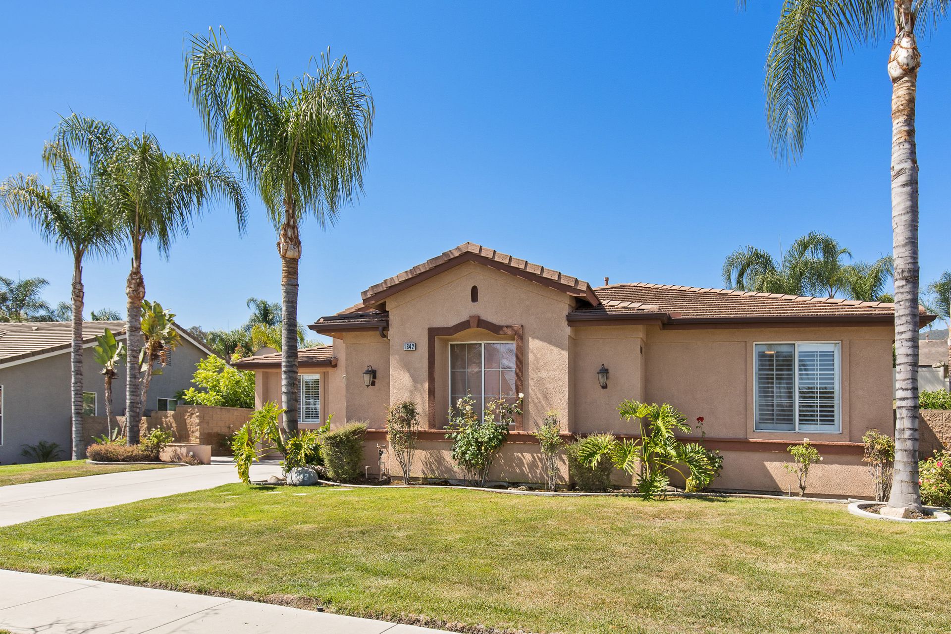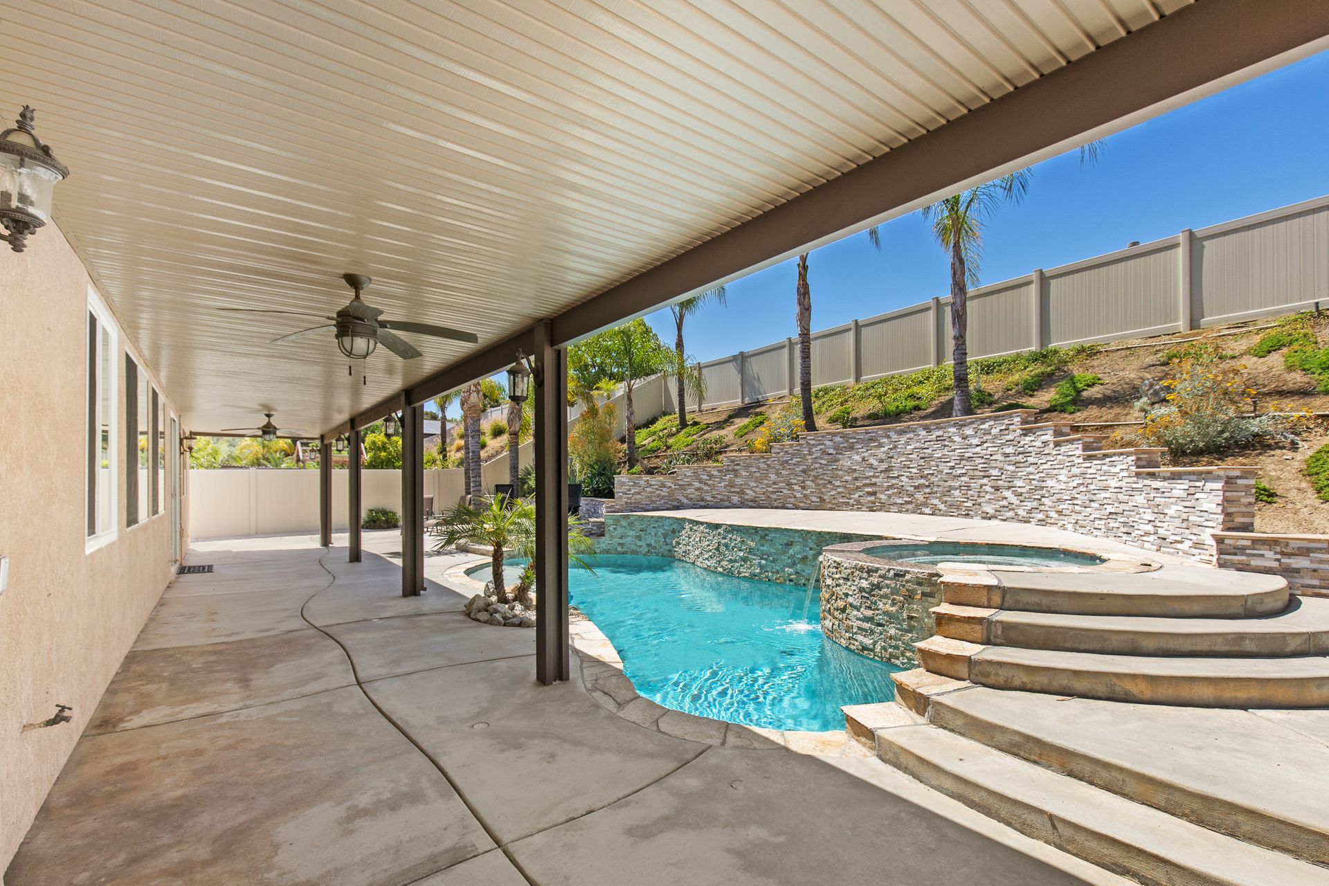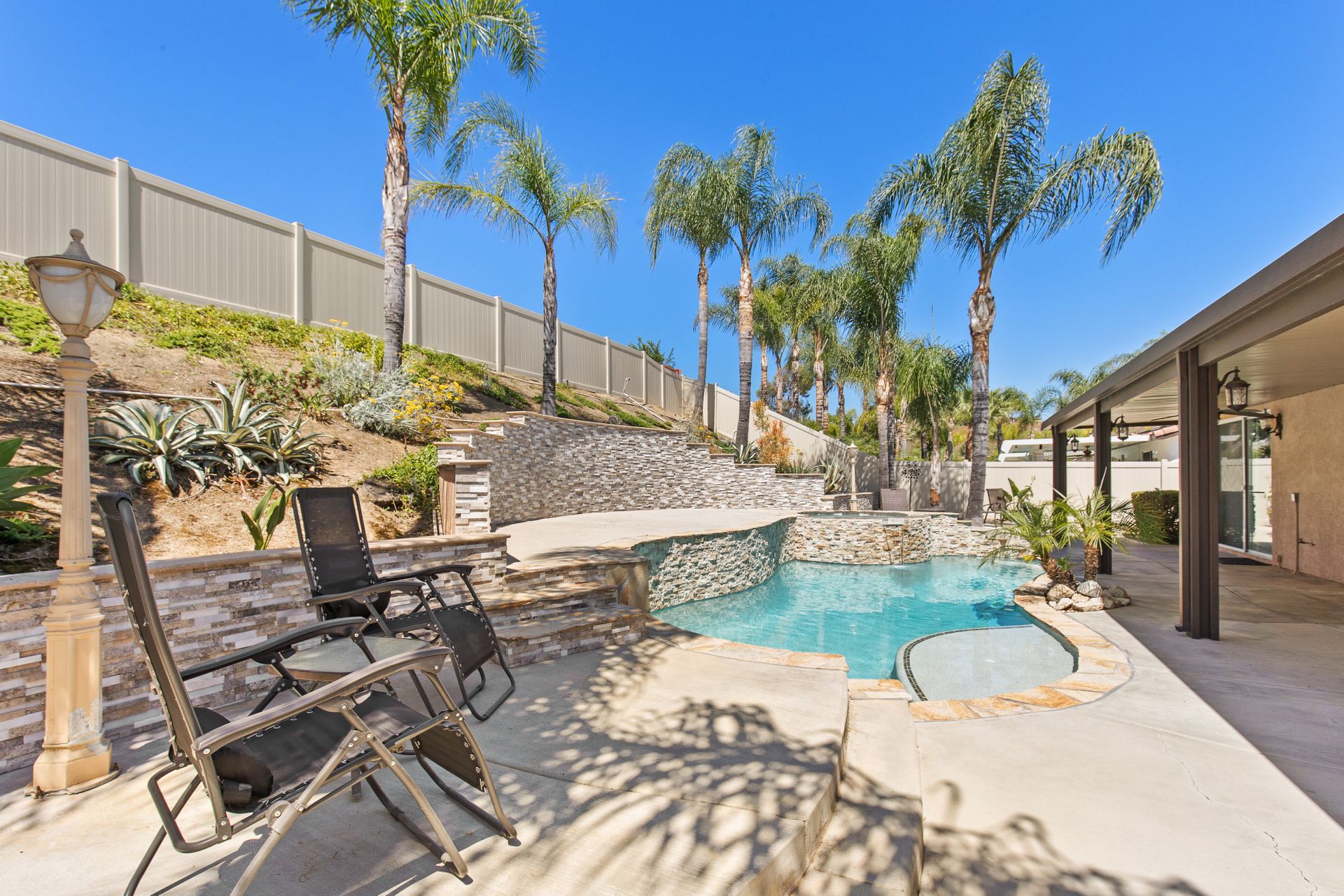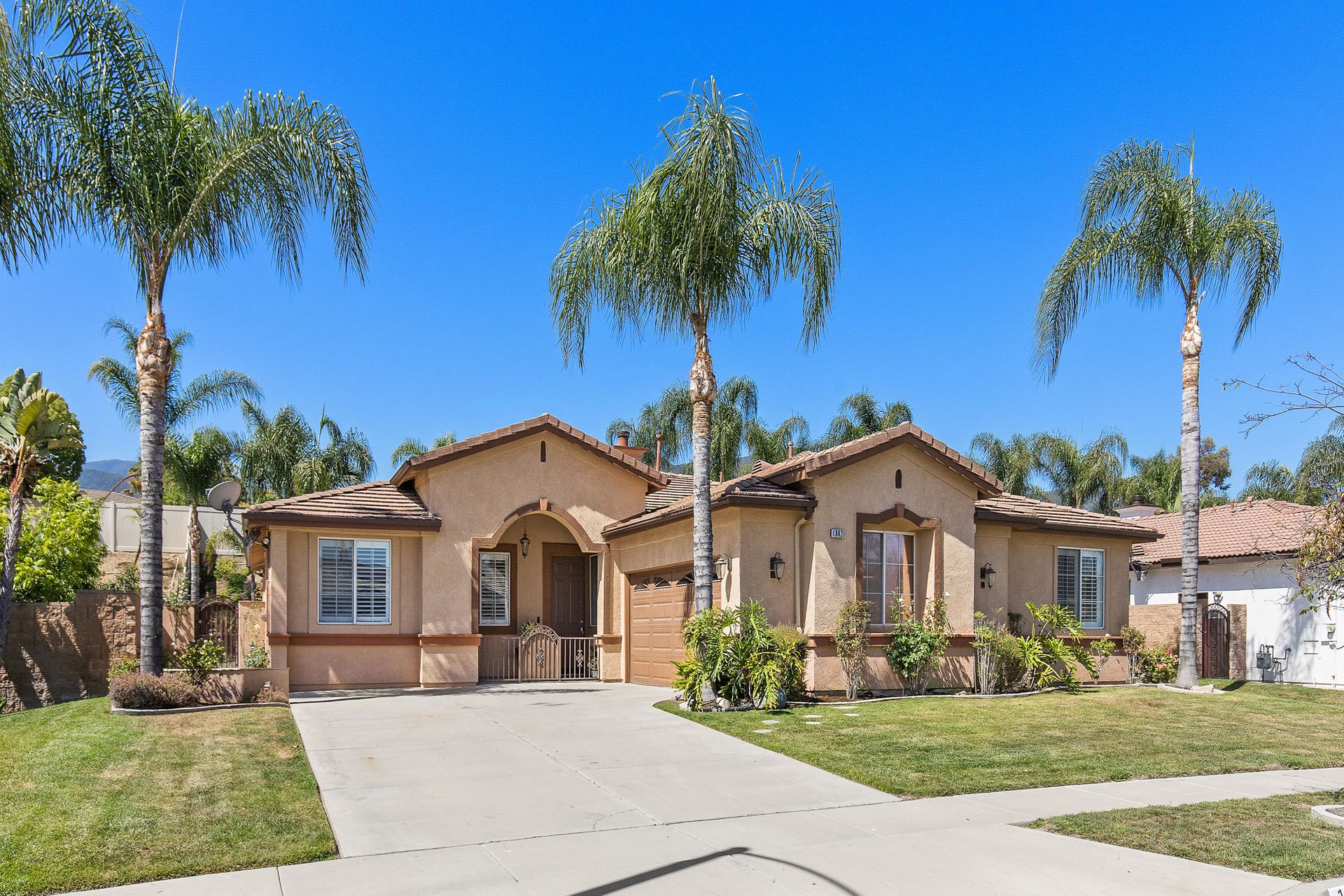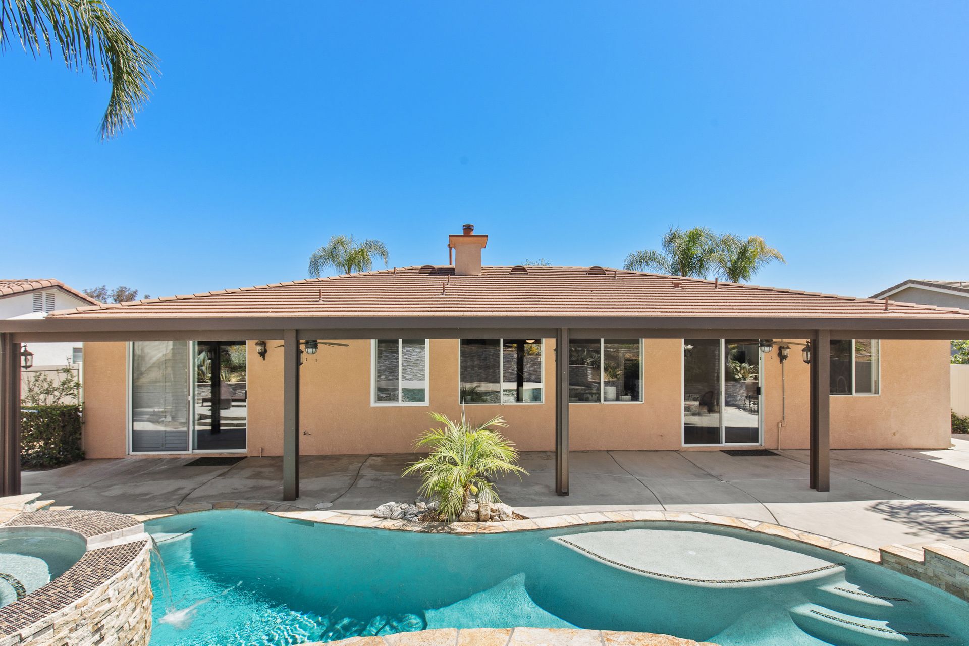 Welcome to this stunning single-story, five-bedroom residence nestled in the prestigious Eagle Glen community. As you enter inside, natural light floods through the windows, illuminating the elegant formal living room adorned with tasteful architectural wall decor. The open floorplan effortlessly connects the formal living and dining areas to the family room, boasting wide doorways for seamless transitions. Currently utilized as an office, the dining room offers versatility and is located alongside the adjacent bedroom and three-quarters bath in the front wing of the home. The family room features a cozy fireplace and expansive picture windows, flowing into the well-appointed kitchen which boasts an island, ample countertop space and abundant cabinetry. A conveniently located laundry room adds to the home's practical layout. Enter through the sliding glass door to discover the backyard oasis with a spacious covered patio featuring ceiling fans, great for alfresco dining. The sparkling pool and spa beckon for gatherings and relaxation, creating an ideal setting for entertaining guests. Off a central hallway, four additional bedrooms await, including the luxurious primary suite. This oversized retreat showcases custom wall decor and offers direct access to the pool and spa through another sliding glass door. The recently remodeled ensuite bathroom is a sanctuary with a walk-in shower featuring dual shower heads and bench seating. Rounding out the layout, three guest bedrooms share a stylishly appointed guest bathroom with a charming barn door for added character and functionality. Make an appointment to view this impressive home today!