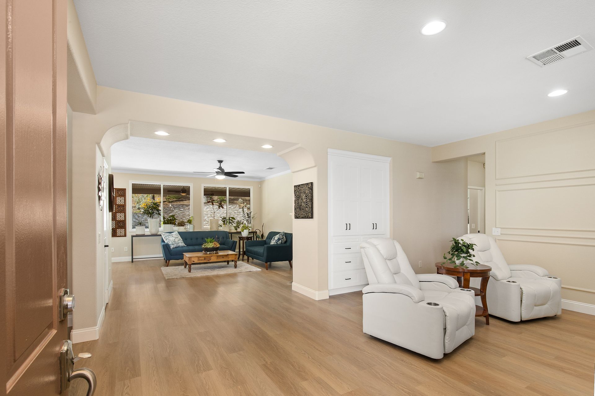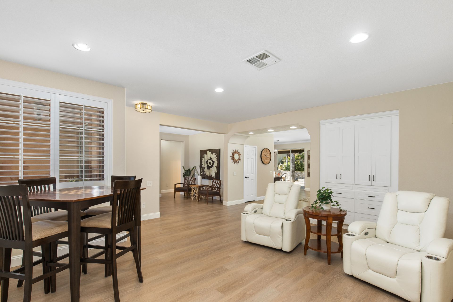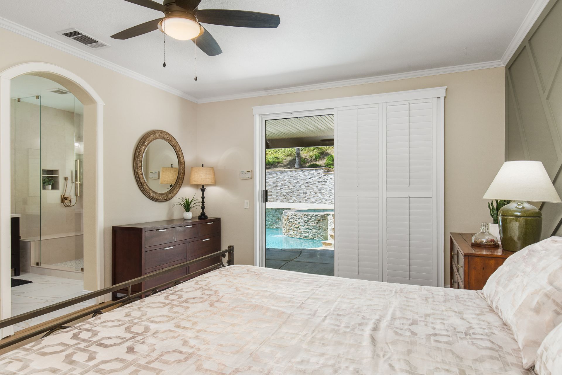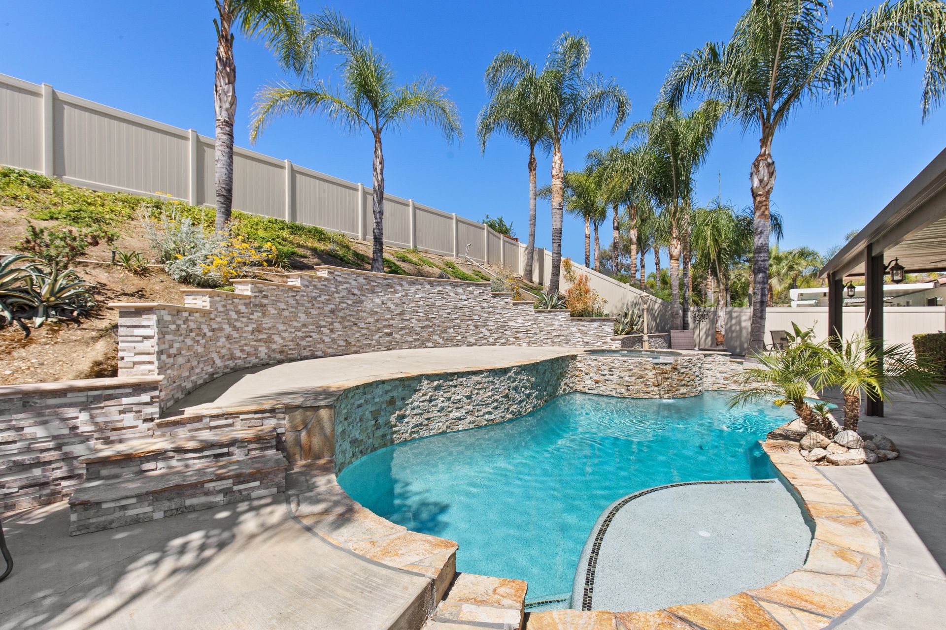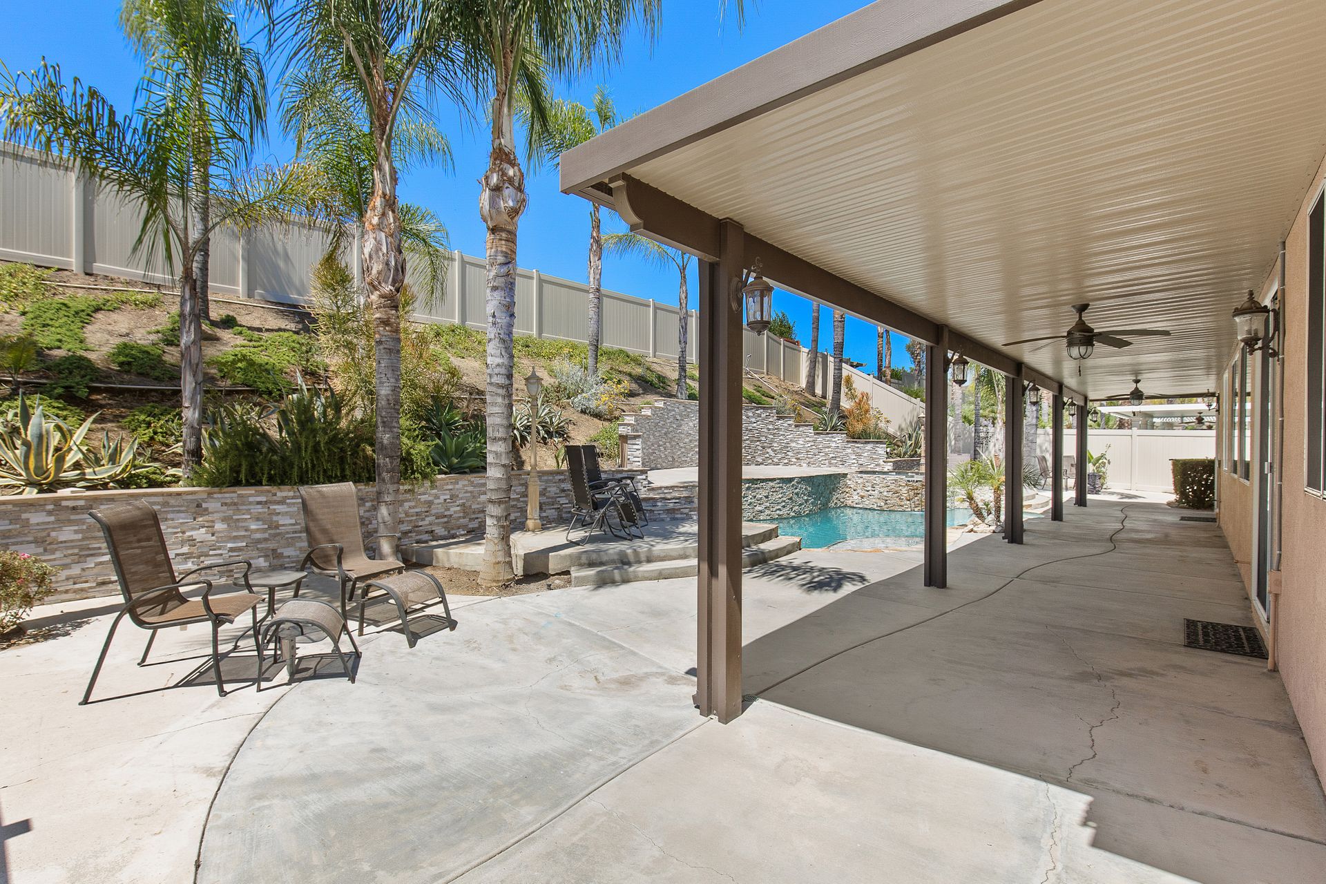 Welcome to this stunning single-story, five-bedroom residence nestled in the prestigious Eagle Glen community. As you enter inside, natural light floods through the windows, illuminating the elegant formal living room adorned with tasteful architectural wall decor. The open floorplan effortlessly connects the formal living and dining areas to the family room, boasting wide doorways for seamless transitions. Currently utilized as an office, the dining room offers versatility and is located alongside the adjacent bedroom and three-quarters bath in the front wing of the home. The family room features a cozy fireplace and expansive picture windows, flowing into the well-appointed kitchen which boasts an island, ample countertop space and abundant cabinetry. A conveniently located laundry room adds to the home's practical layout. Enter through the sliding glass door to discover the backyard oasis with a spacious covered patio featuring ceiling fans, great for alfresco dining. The sparkling pool and spa beckon for gatherings and relaxation, creating an ideal setting for entertaining guests. Off a central hallway, four additional bedrooms await, including the luxurious primary suite. This oversized retreat showcases custom wall decor and offers direct access to the pool and spa through another sliding glass door. The recently remodeled ensuite bathroom is a sanctuary with a walk-in shower featuring dual shower heads and bench seating. Rounding out the layout, three guest bedrooms share a stylishly appointed guest bathroom with a charming barn door for added character and functionality. Make an appointment to view this impressive home today!