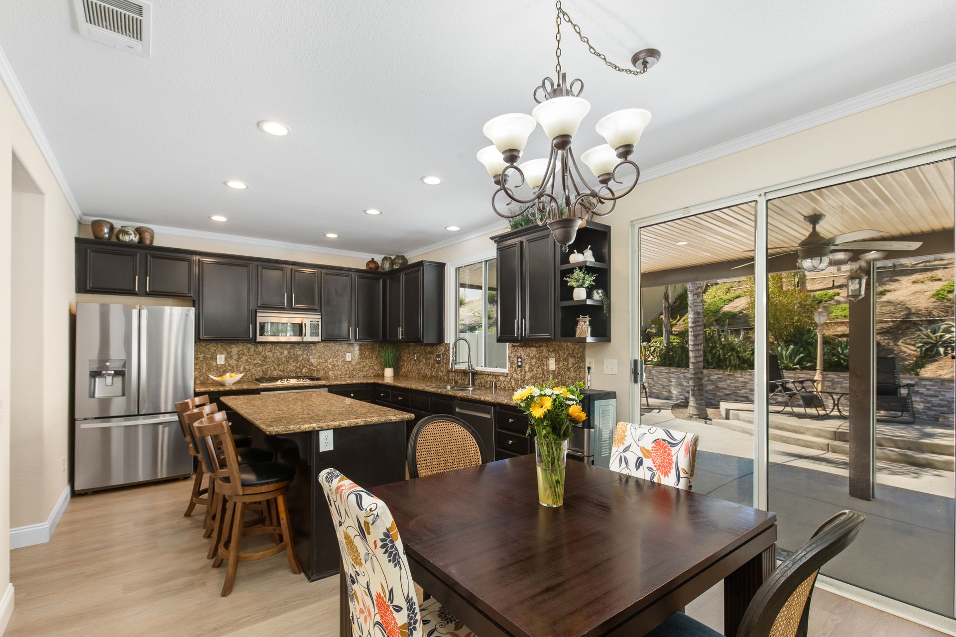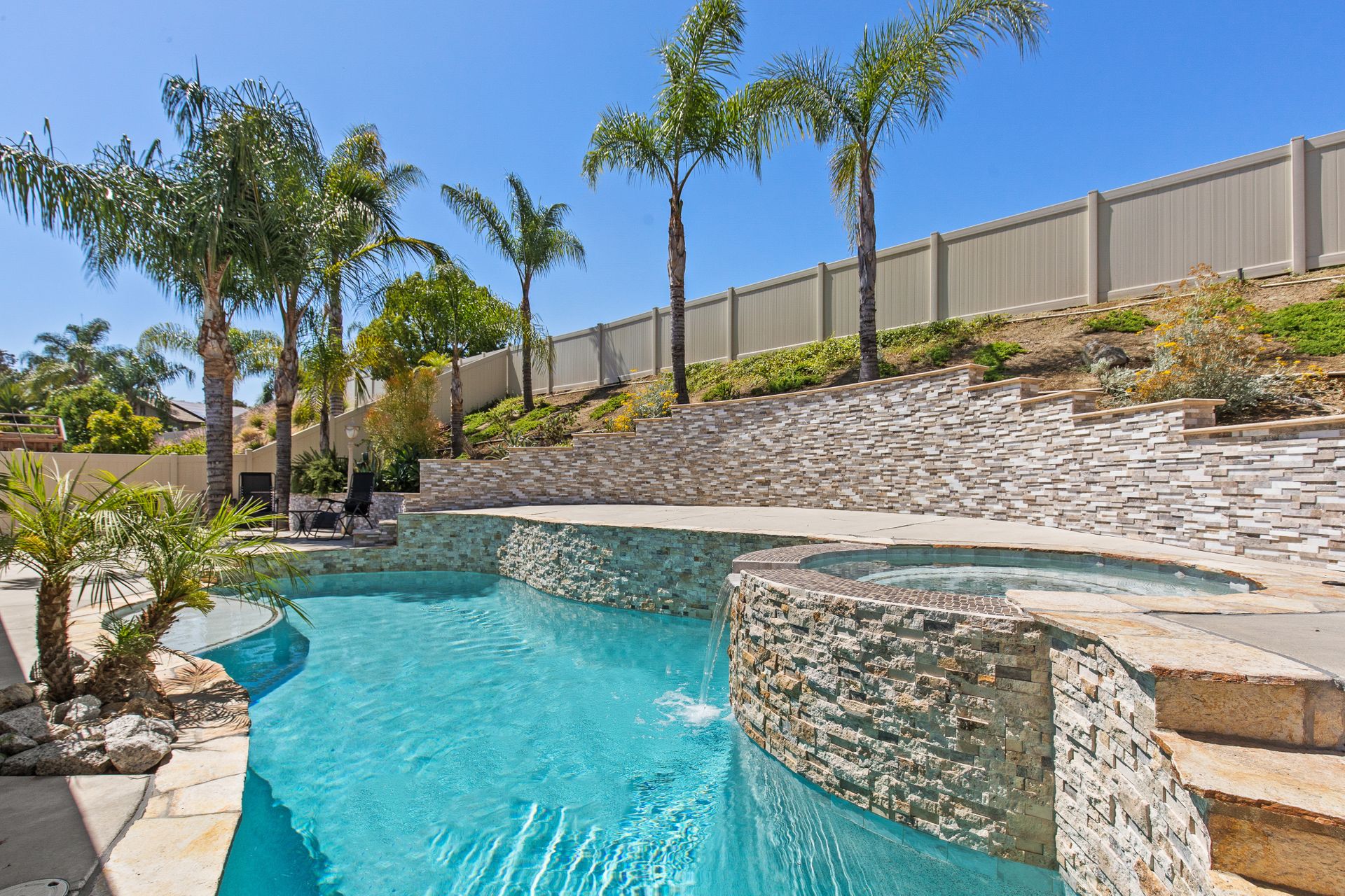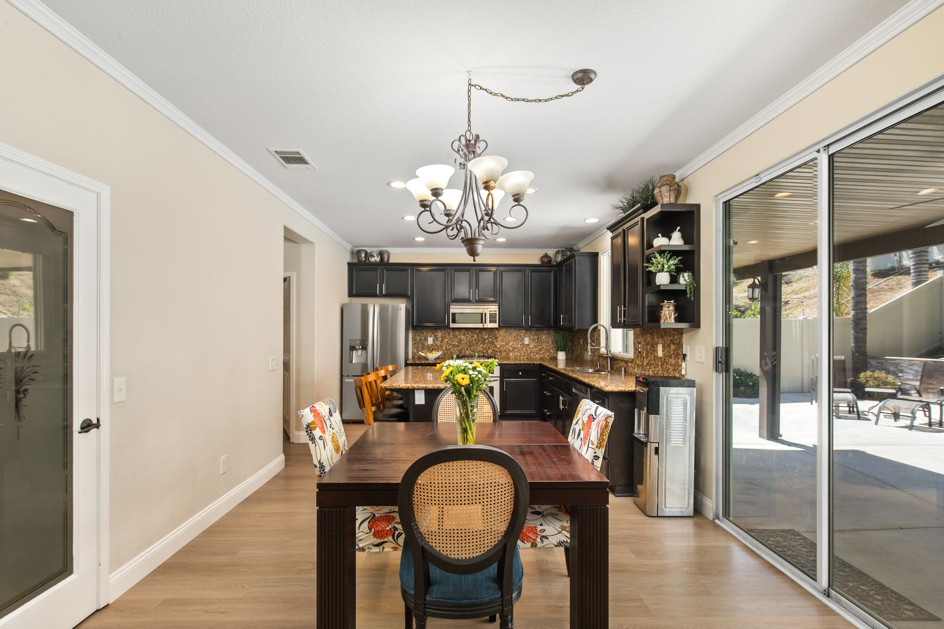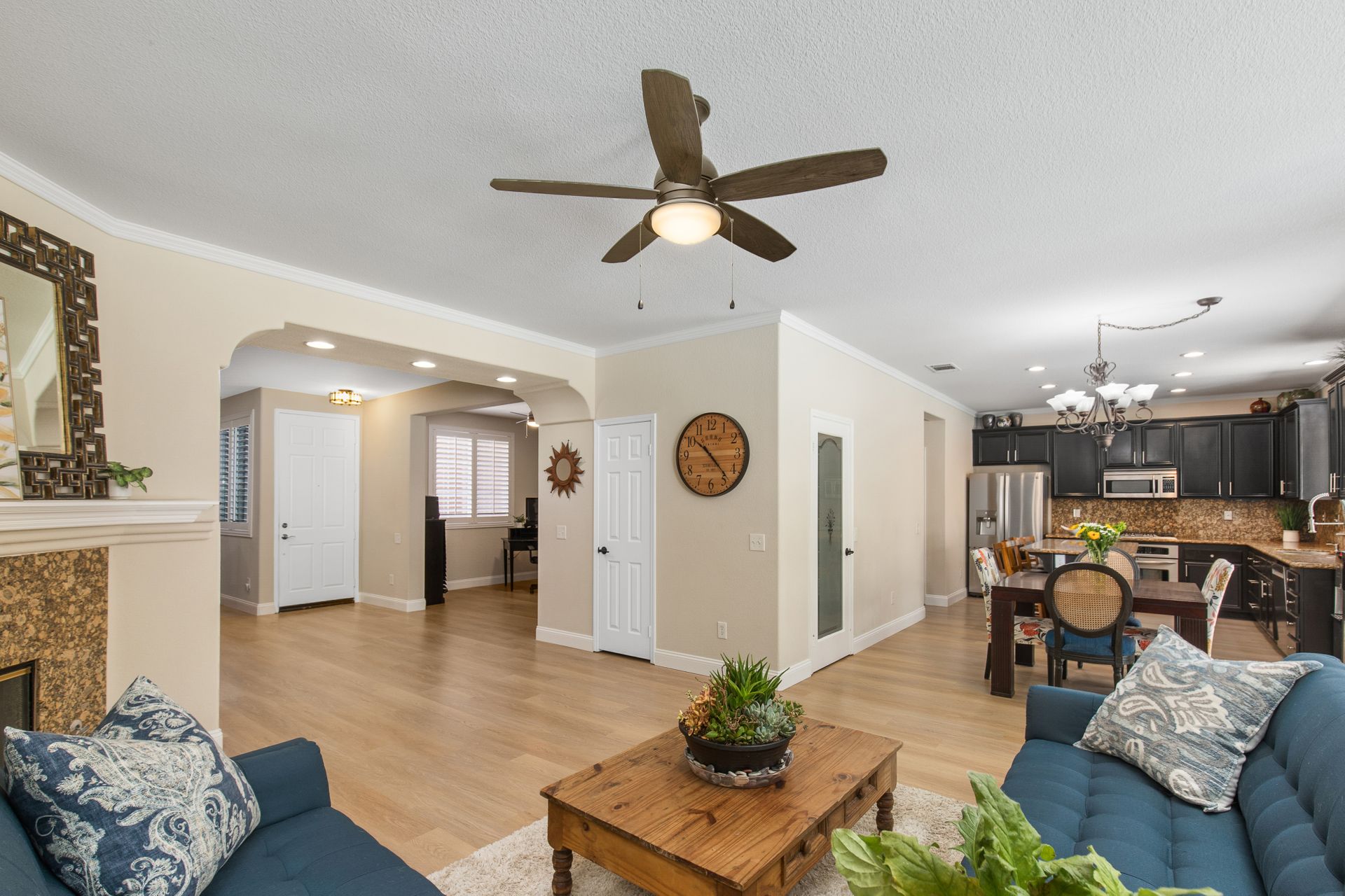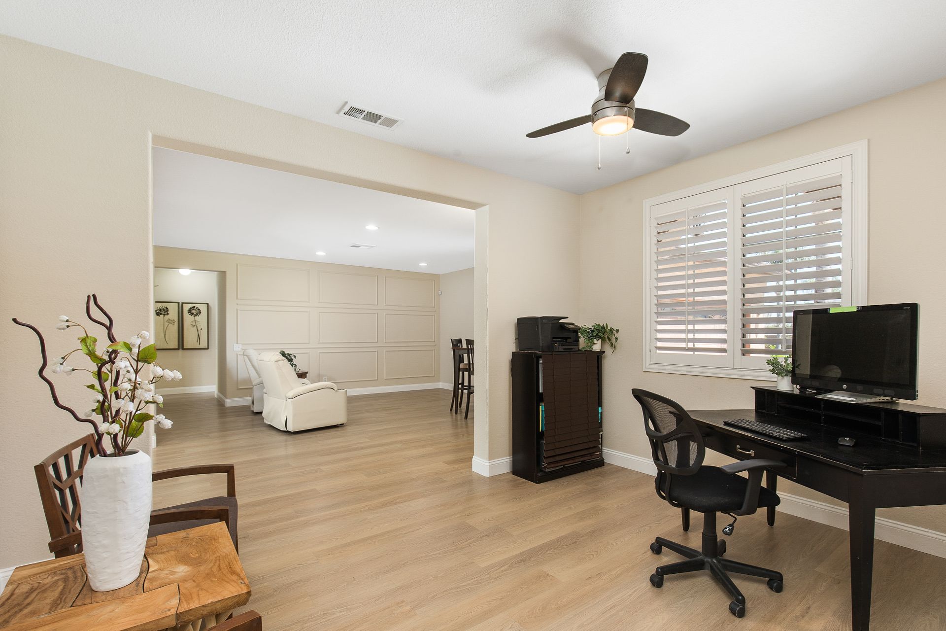 Welcome to this stunning single-story, five-bedroom residence nestled in the prestigious Eagle Glen community. As you enter inside, natural light floods through the windows, illuminating the elegant formal living room adorned with tasteful architectural wall decor. The open floorplan effortlessly connects the formal living and dining areas to the family room, boasting wide doorways for seamless transitions. Currently utilized as an office, the dining room offers versatility and is located alongside the adjacent bedroom and three-quarters bath in the front wing of the home. The family room features a cozy fireplace and expansive picture windows, flowing into the well-appointed kitchen which boasts an island, ample countertop space and abundant cabinetry. A conveniently located laundry room adds to the home's practical layout. Enter through the sliding glass door to discover the backyard oasis with a spacious covered patio featuring ceiling fans, great for alfresco dining. The sparkling pool and spa beckon for gatherings and relaxation, creating an ideal setting for entertaining guests. Off a central hallway, four additional bedrooms await, including the luxurious primary suite. This oversized retreat showcases custom wall decor and offers direct access to the pool and spa through another sliding glass door. The recently remodeled ensuite bathroom is a sanctuary with a walk-in shower featuring dual shower heads and bench seating. Rounding out the layout, three guest bedrooms share a stylishly appointed guest bathroom with a charming barn door for added character and functionality. Make an appointment to view this impressive home today!