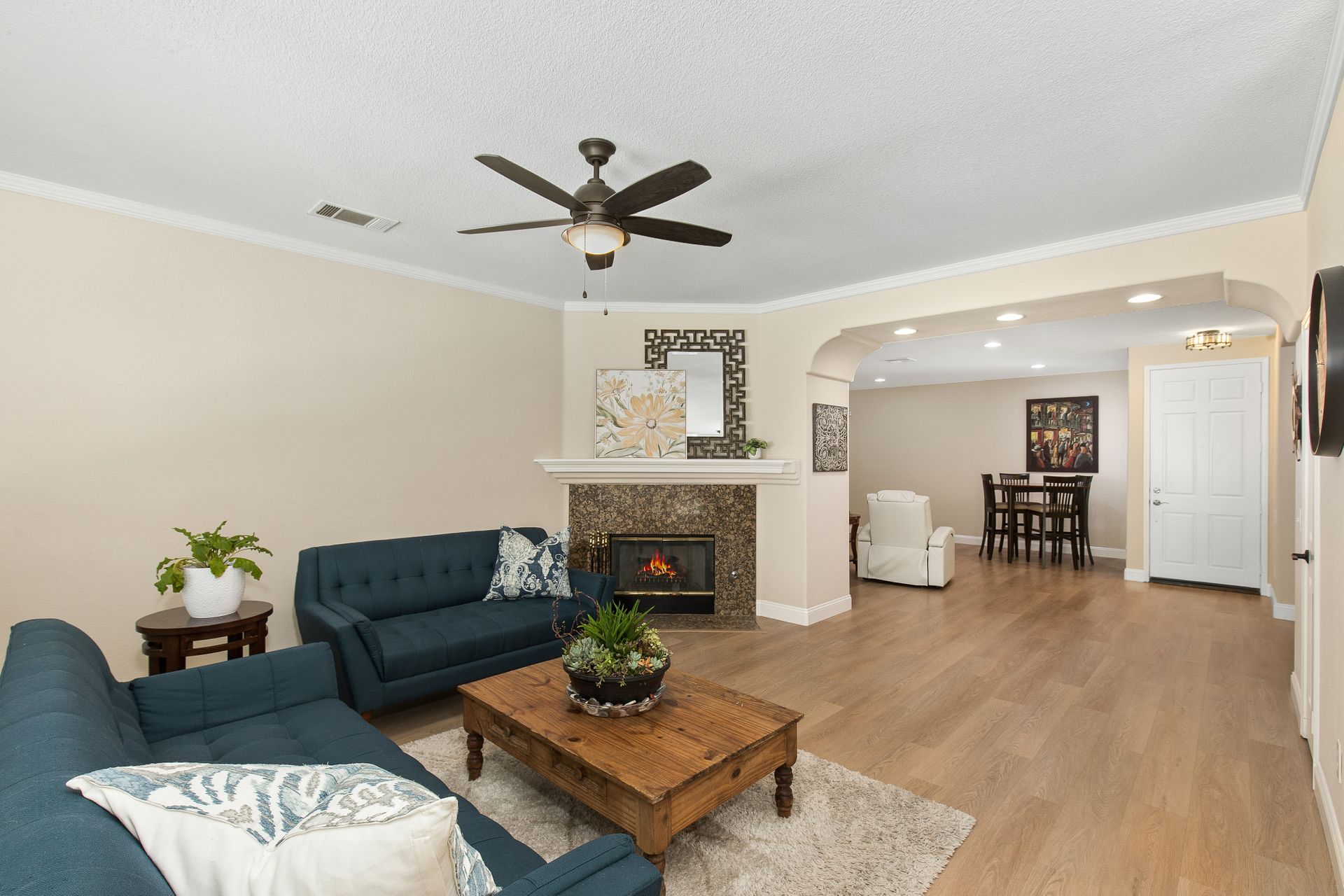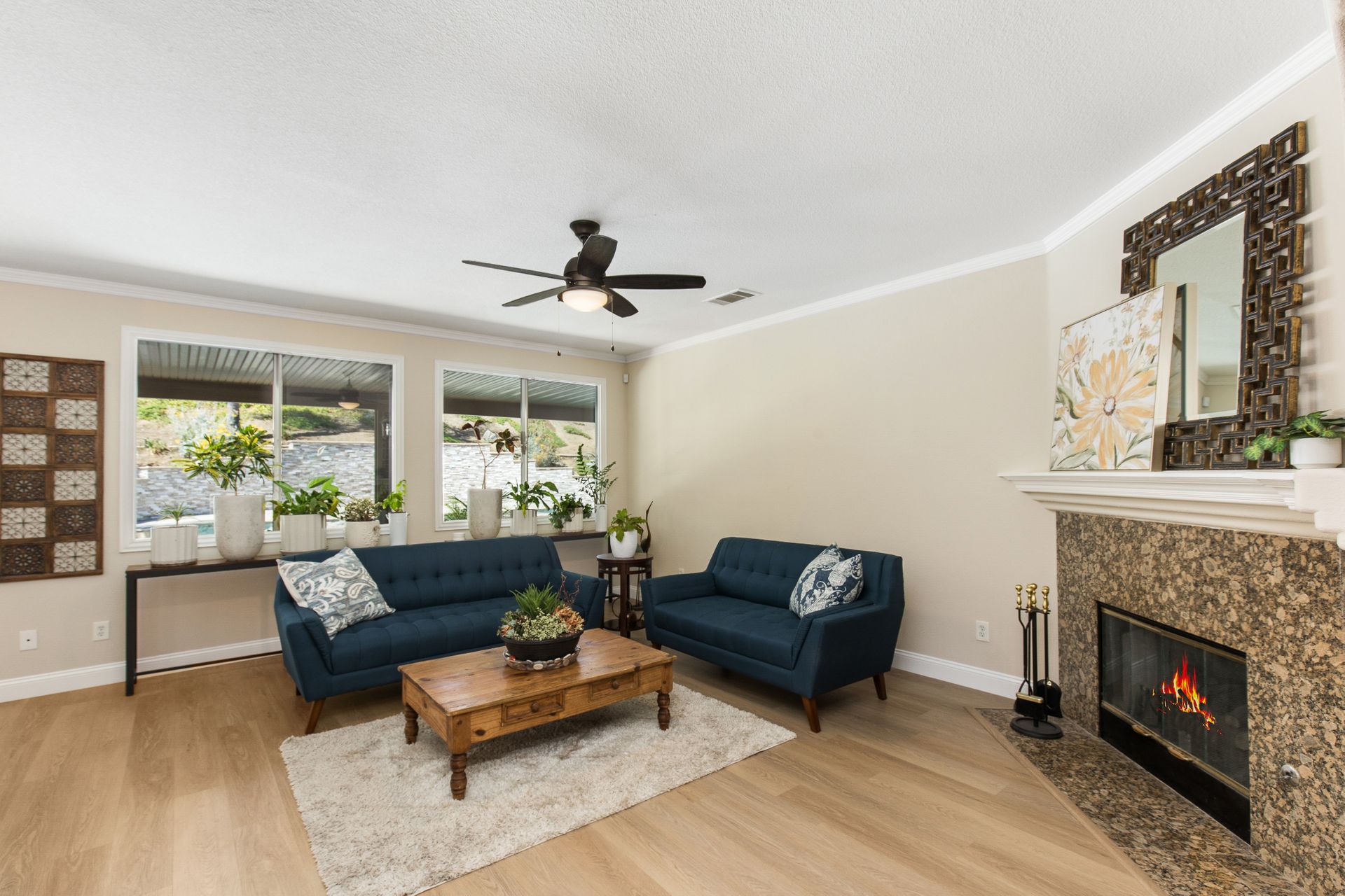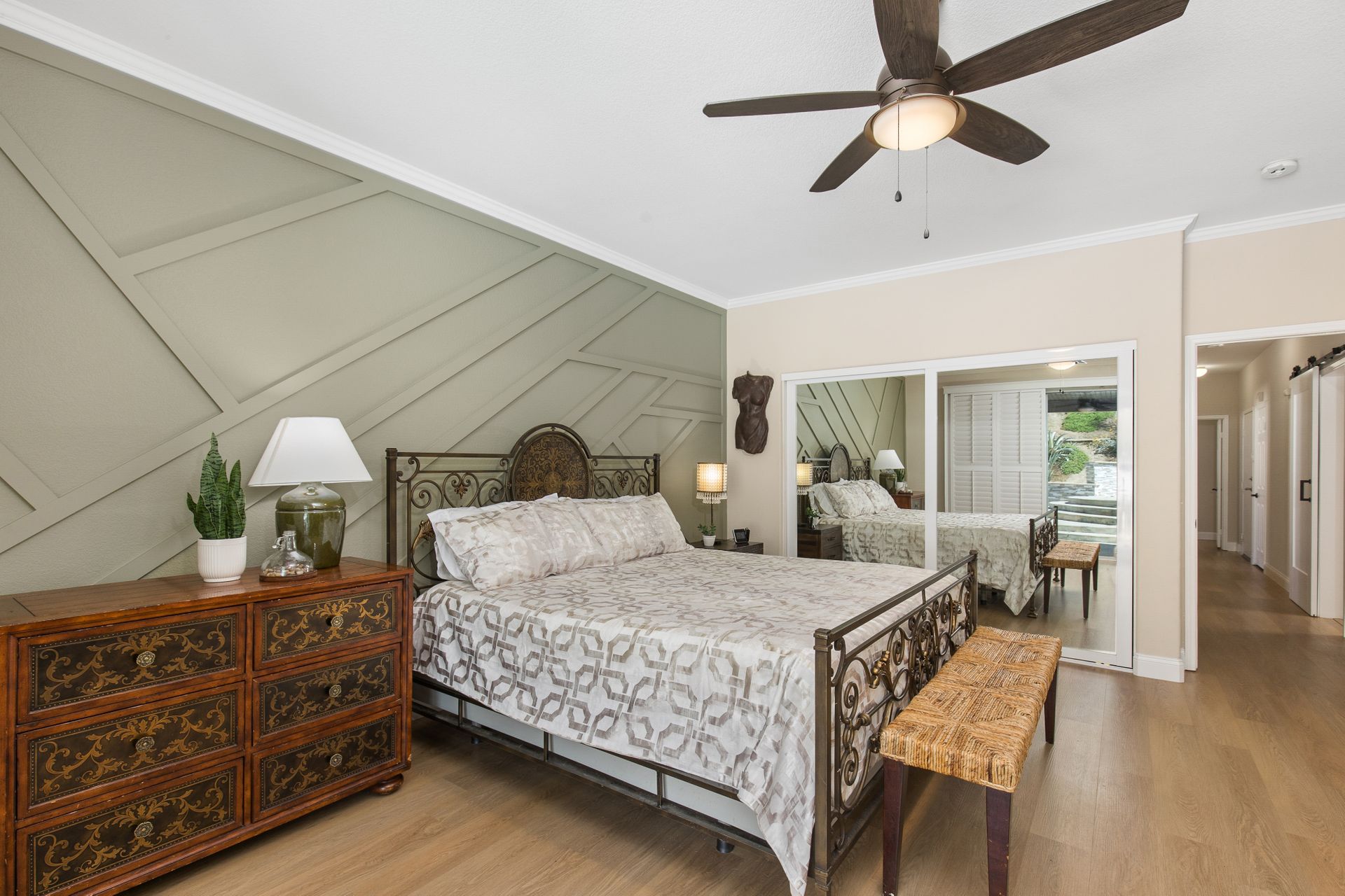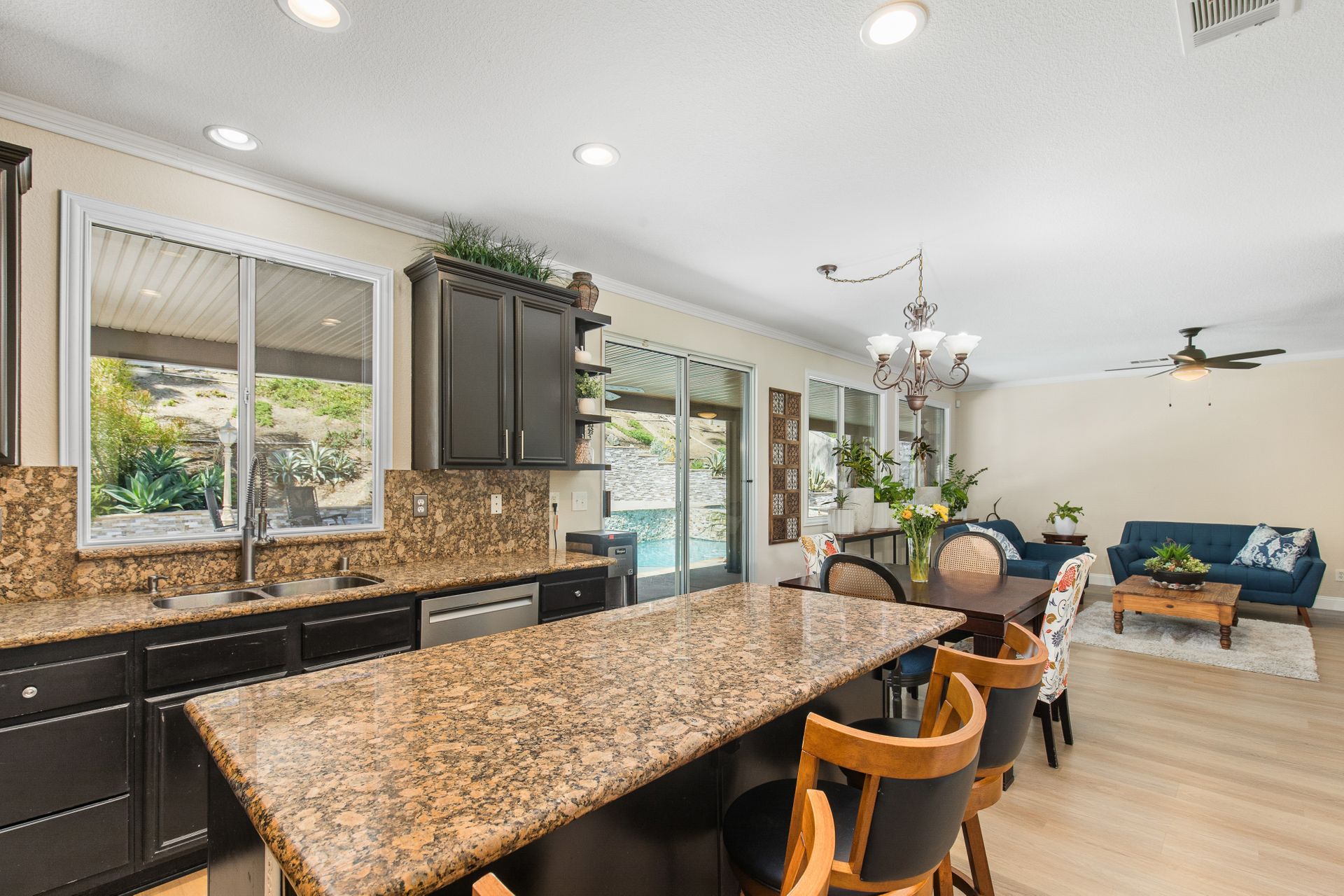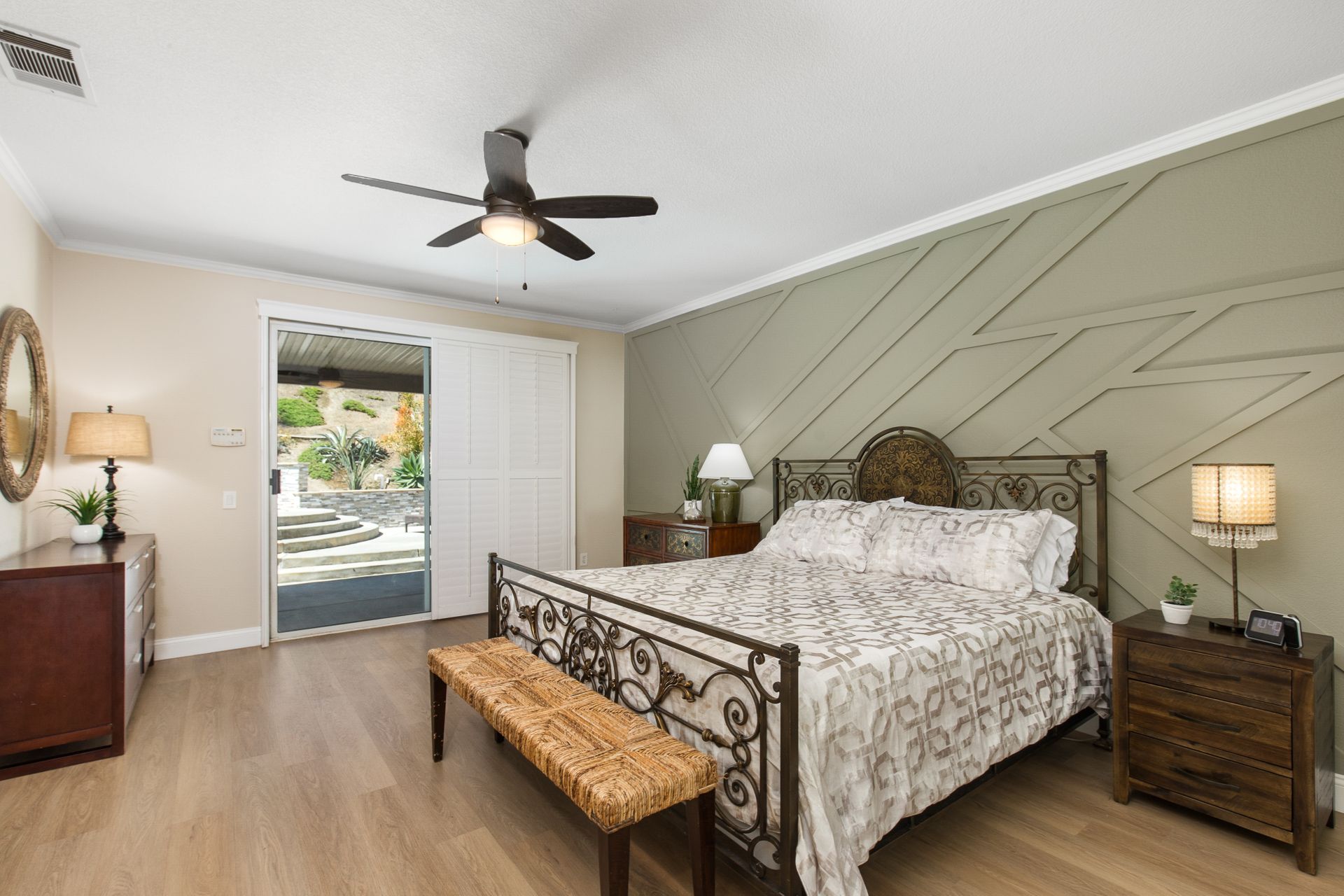 Welcome to this stunning single-story, five-bedroom residence nestled in the prestigious Eagle Glen community. As you enter inside, natural light floods through the windows, illuminating the elegant formal living room adorned with tasteful architectural wall decor. The open floorplan effortlessly connects the formal living and dining areas to the family room, boasting wide doorways for seamless transitions. Currently utilized as an office, the dining room offers versatility and is located alongside the adjacent bedroom and three-quarters bath in the front wing of the home. The family room features a cozy fireplace and expansive picture windows, flowing into the well-appointed kitchen which boasts an island, ample countertop space and abundant cabinetry. A conveniently located laundry room adds to the home's practical layout. Enter through the sliding glass door to discover the backyard oasis with a spacious covered patio featuring ceiling fans, great for alfresco dining. The sparkling pool and spa beckon for gatherings and relaxation, creating an ideal setting for entertaining guests. Off a central hallway, four additional bedrooms await, including the luxurious primary suite. This oversized retreat showcases custom wall decor and offers direct access to the pool and spa through another sliding glass door. The recently remodeled ensuite bathroom is a sanctuary with a walk-in shower featuring dual shower heads and bench seating. Rounding out the layout, three guest bedrooms share a stylishly appointed guest bathroom with a charming barn door for added character and functionality. Make an appointment to view this impressive home today!