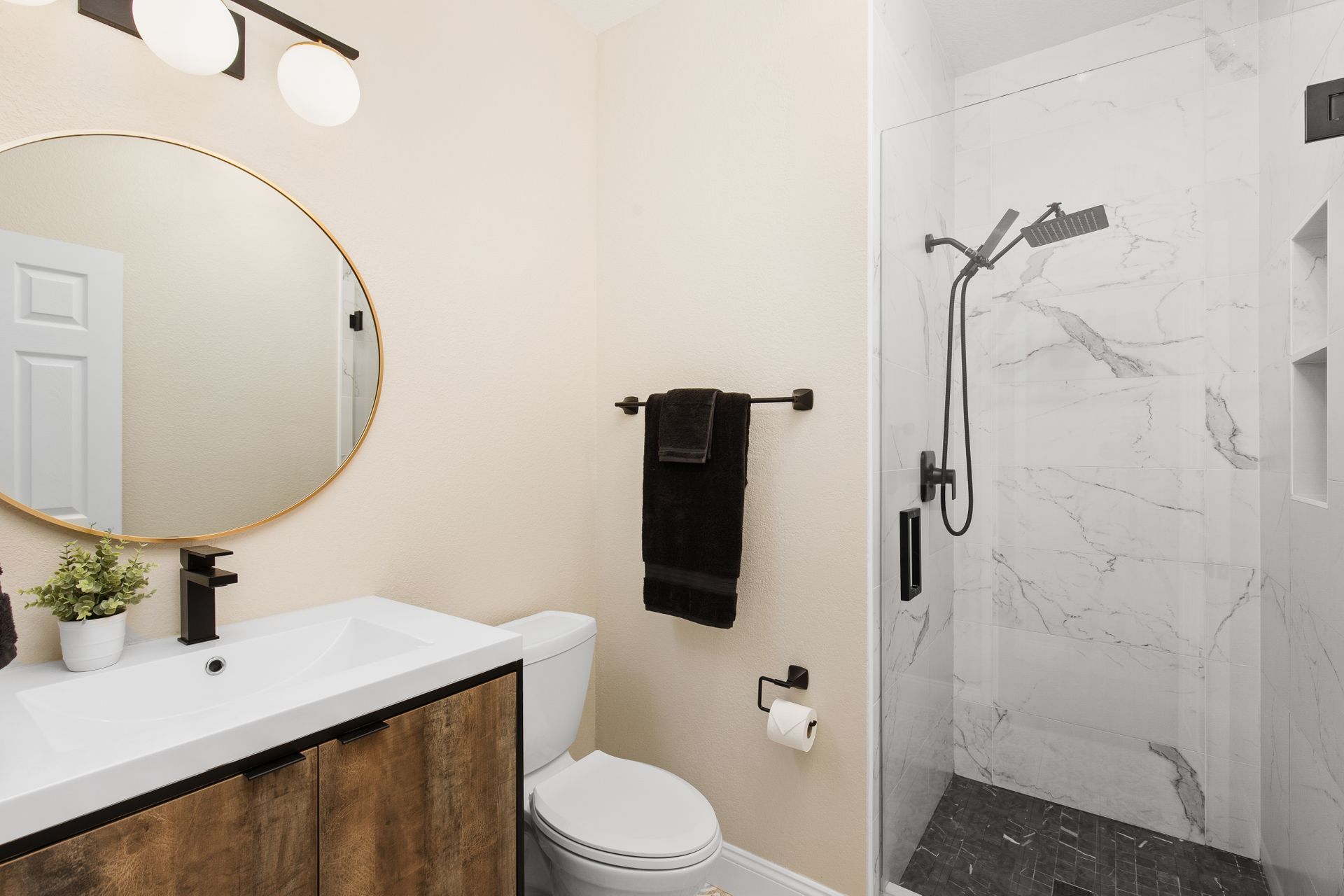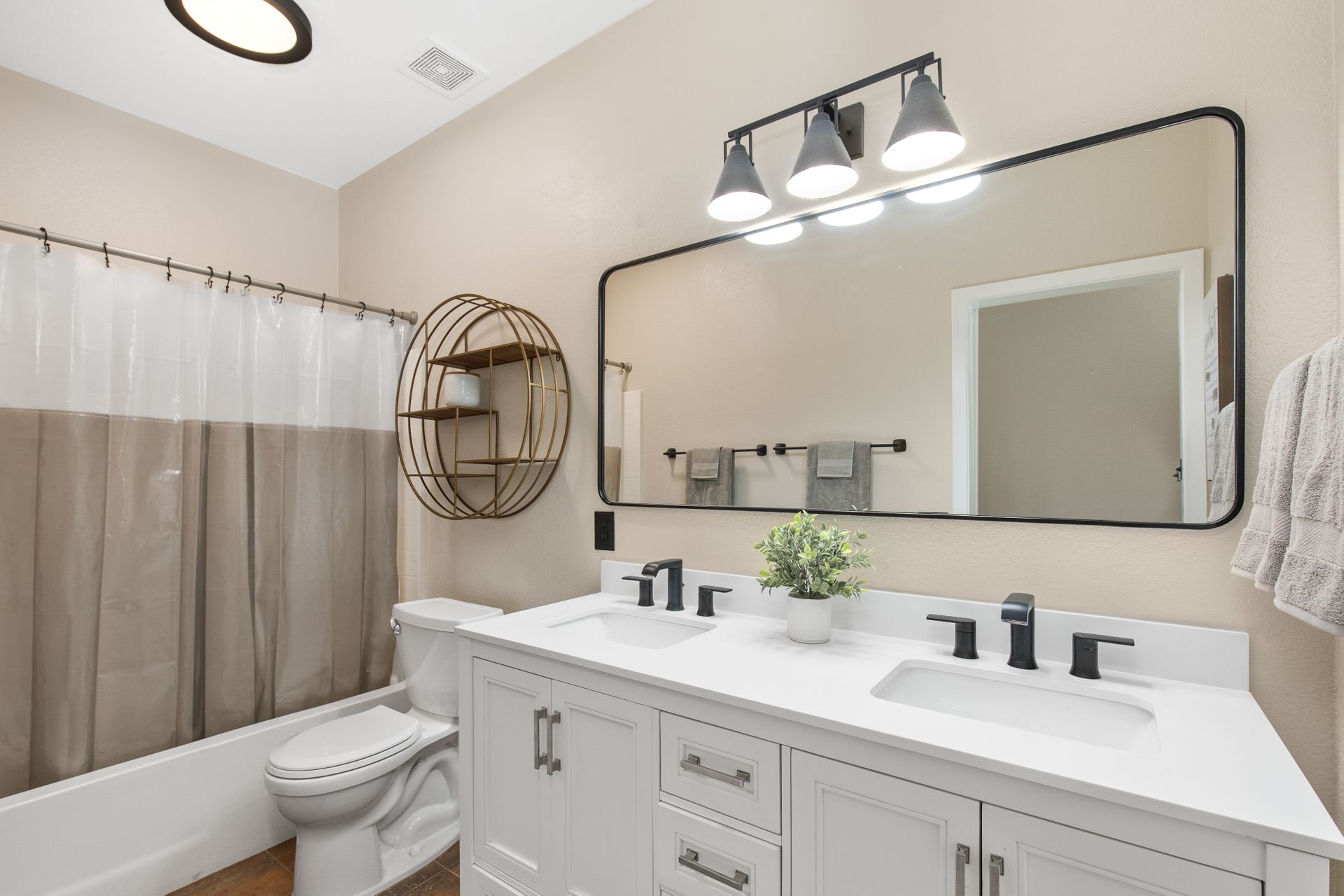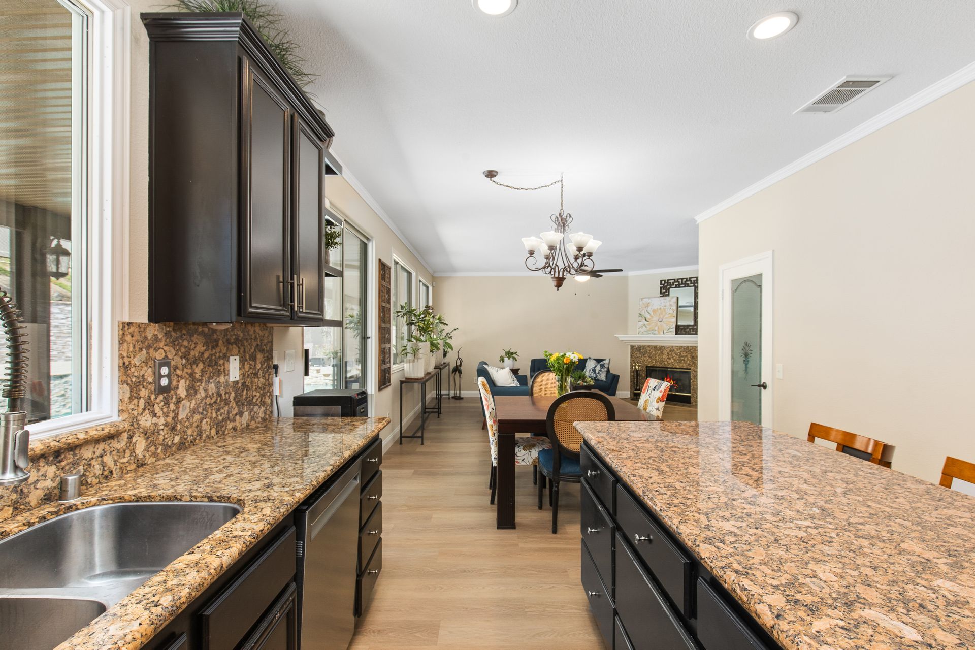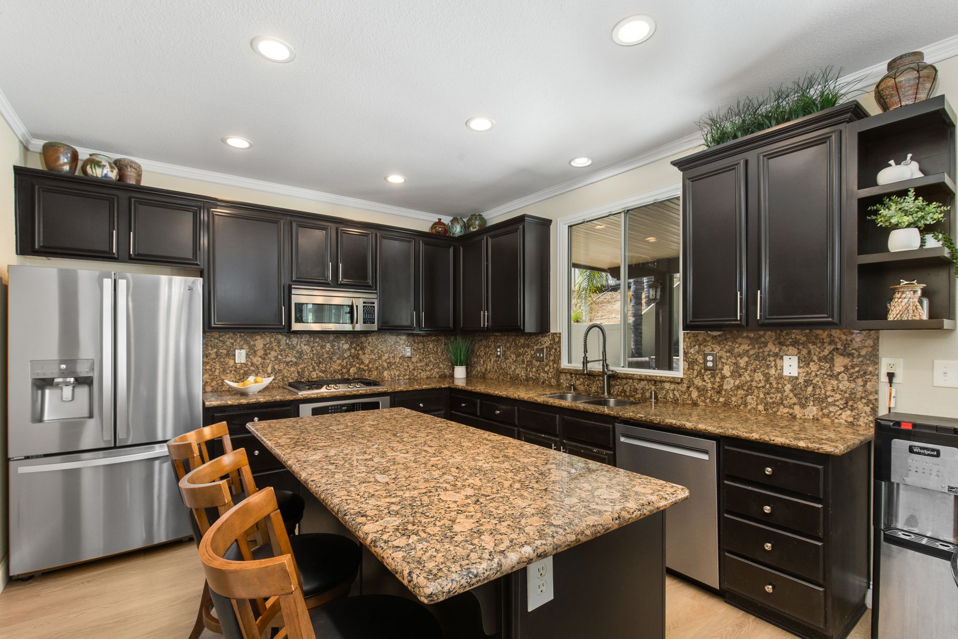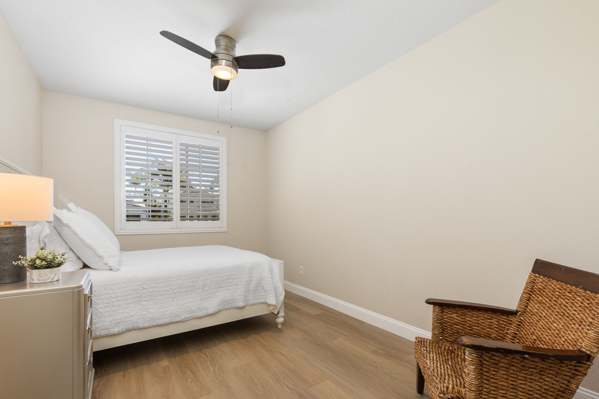 Welcome to this stunning single-story, five-bedroom residence nestled in the prestigious Eagle Glen community. As you enter inside, natural light floods through the windows, illuminating the elegant formal living room adorned with tasteful architectural wall decor. The open floorplan effortlessly connects the formal living and dining areas to the family room, boasting wide doorways for seamless transitions. Currently utilized as an office, the dining room offers versatility and is located alongside the adjacent bedroom and three-quarters bath in the front wing of the home. The family room features a cozy fireplace and expansive picture windows, flowing into the well-appointed kitchen which boasts an island, ample countertop space and abundant cabinetry. A conveniently located laundry room adds to the home's practical layout. Enter through the sliding glass door to discover the backyard oasis with a spacious covered patio featuring ceiling fans, great for alfresco dining. The sparkling pool and spa beckon for gatherings and relaxation, creating an ideal setting for entertaining guests. Off a central hallway, four additional bedrooms await, including the luxurious primary suite. This oversized retreat showcases custom wall decor and offers direct access to the pool and spa through another sliding glass door. The recently remodeled ensuite bathroom is a sanctuary with a walk-in shower featuring dual shower heads and bench seating. Rounding out the layout, three guest bedrooms share a stylishly appointed guest bathroom with a charming barn door for added character and functionality. Make an appointment to view this impressive home today!