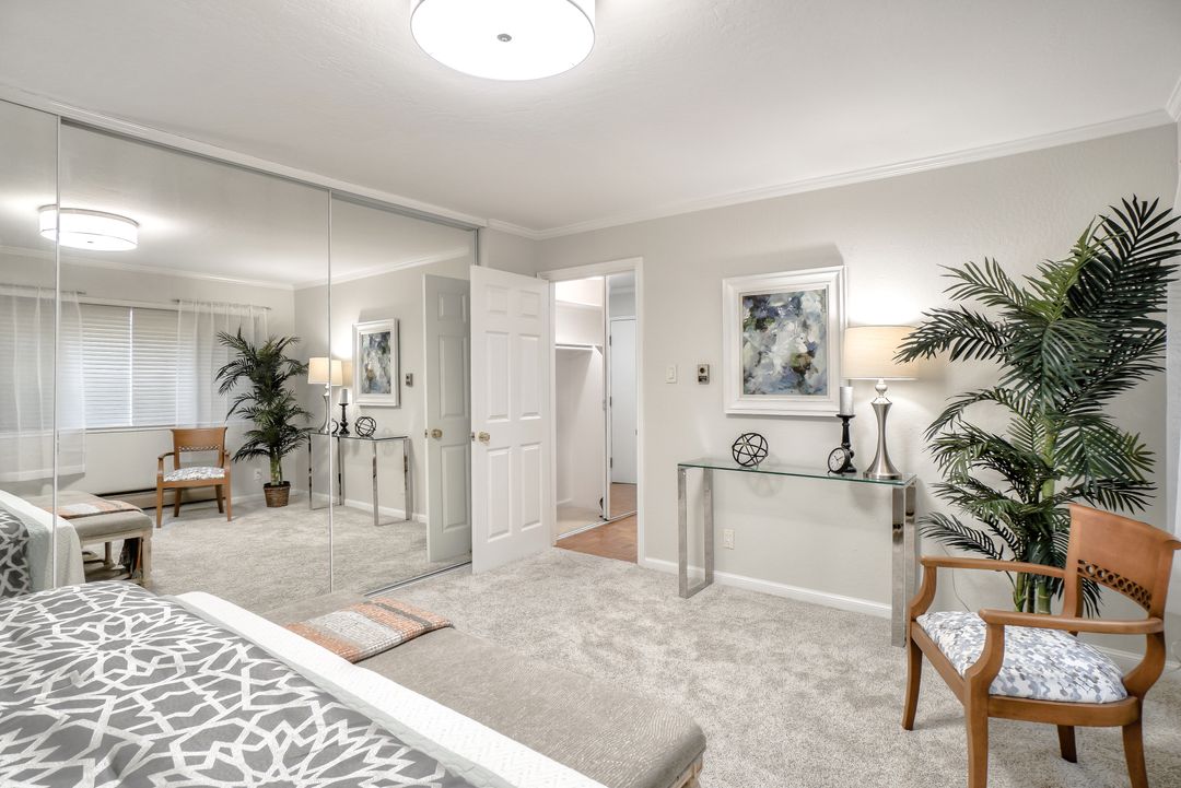 -The carpeted bedroom enjoys ample storage space with a full wall of closets with mirrored doors.