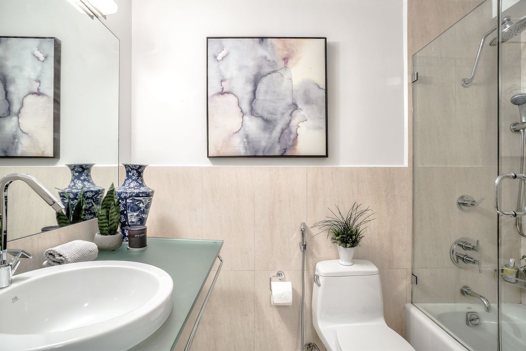 -Off the hallway, the full bathroom includes a modern sink vanity along with a shower over the tub.