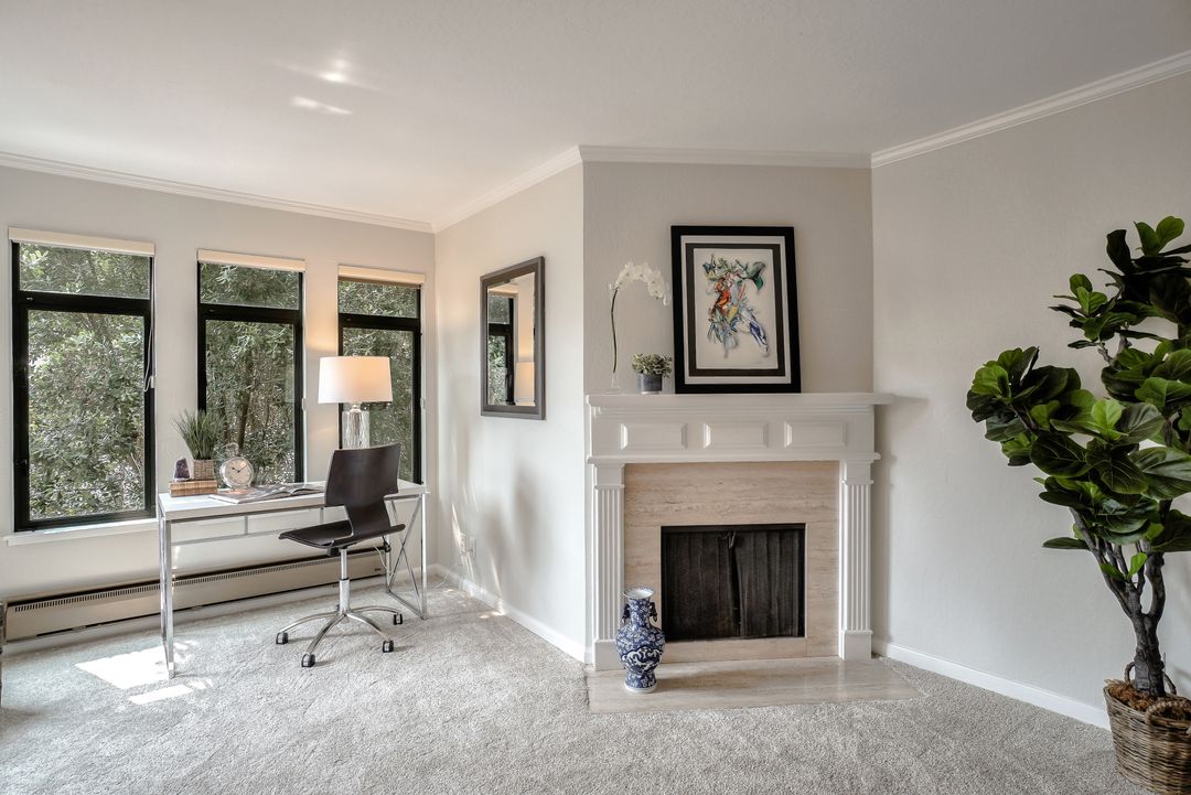 -Large, bright living room with its wood burning fireplace and bay windows, is ideal for both entertaining and relaxing. It also creates a nice niche for a home office if needed, and is equipped with an Internet/cable TV connection.