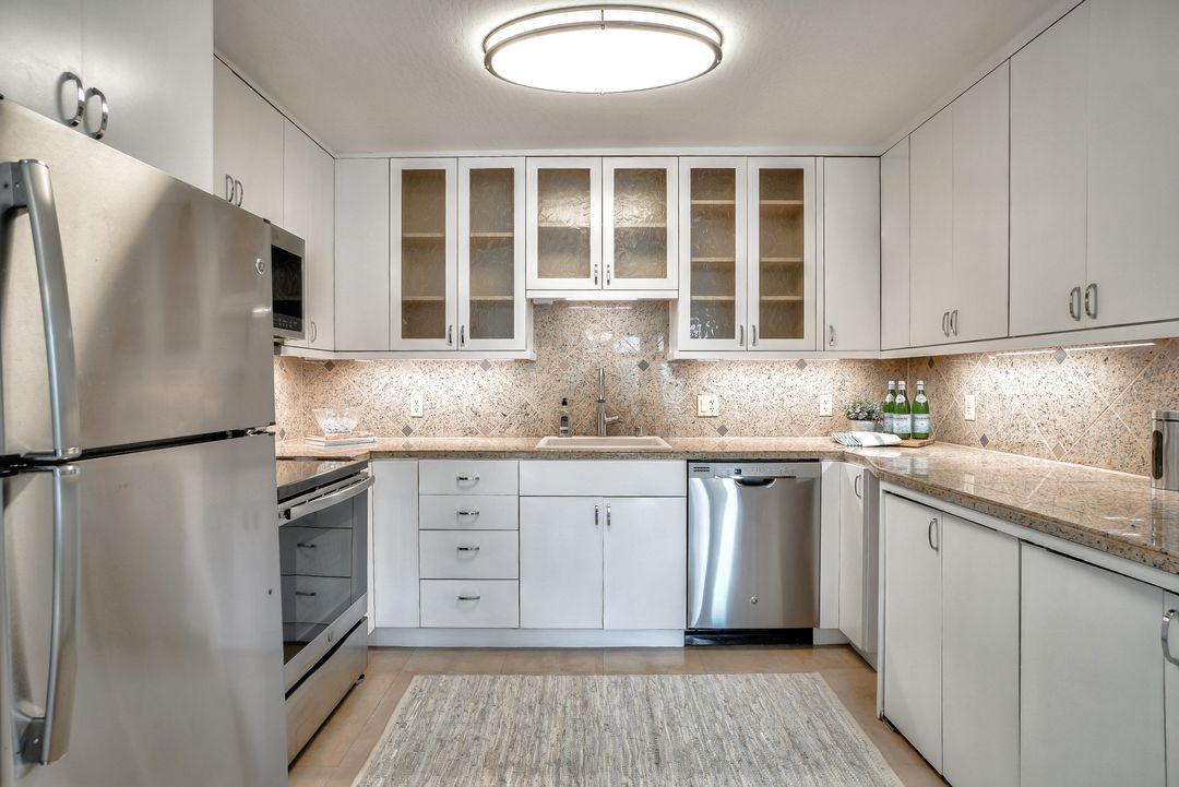 -Gourmet kitchen for meal preparation with its stainless-steel appliances. Washer/dryer is conveniently located under the counter.