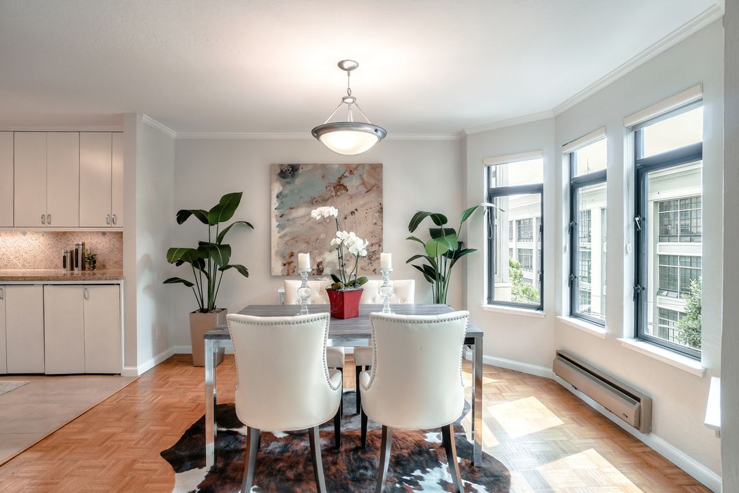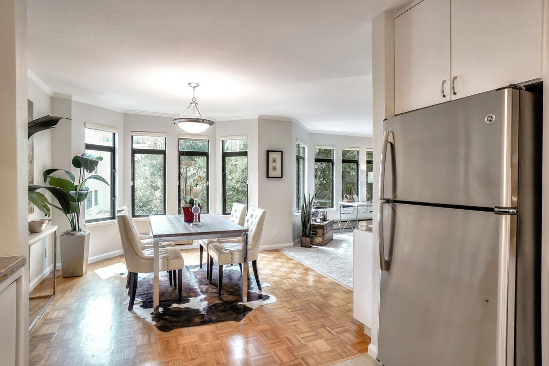 -Comfortable dining area adjacent to the kitchen features hardwood floors and a convenient corner storage cabinet. Bathed in natural light, this sunny spot is the perfect place to enjoy all meals.