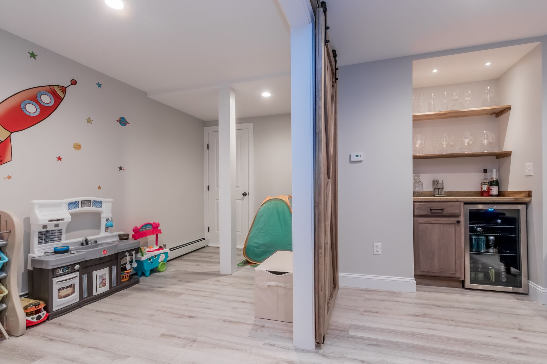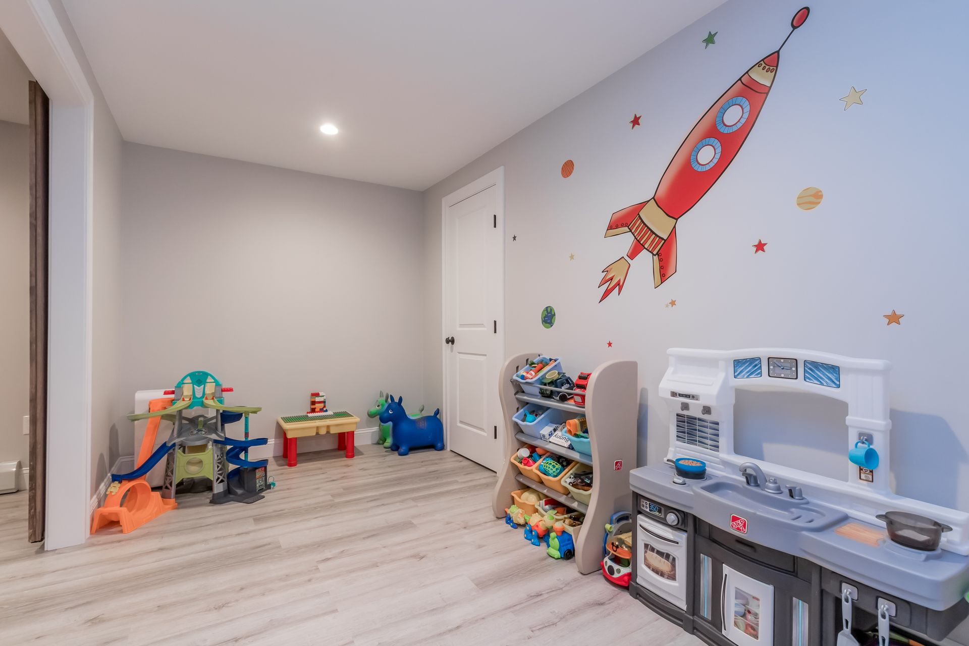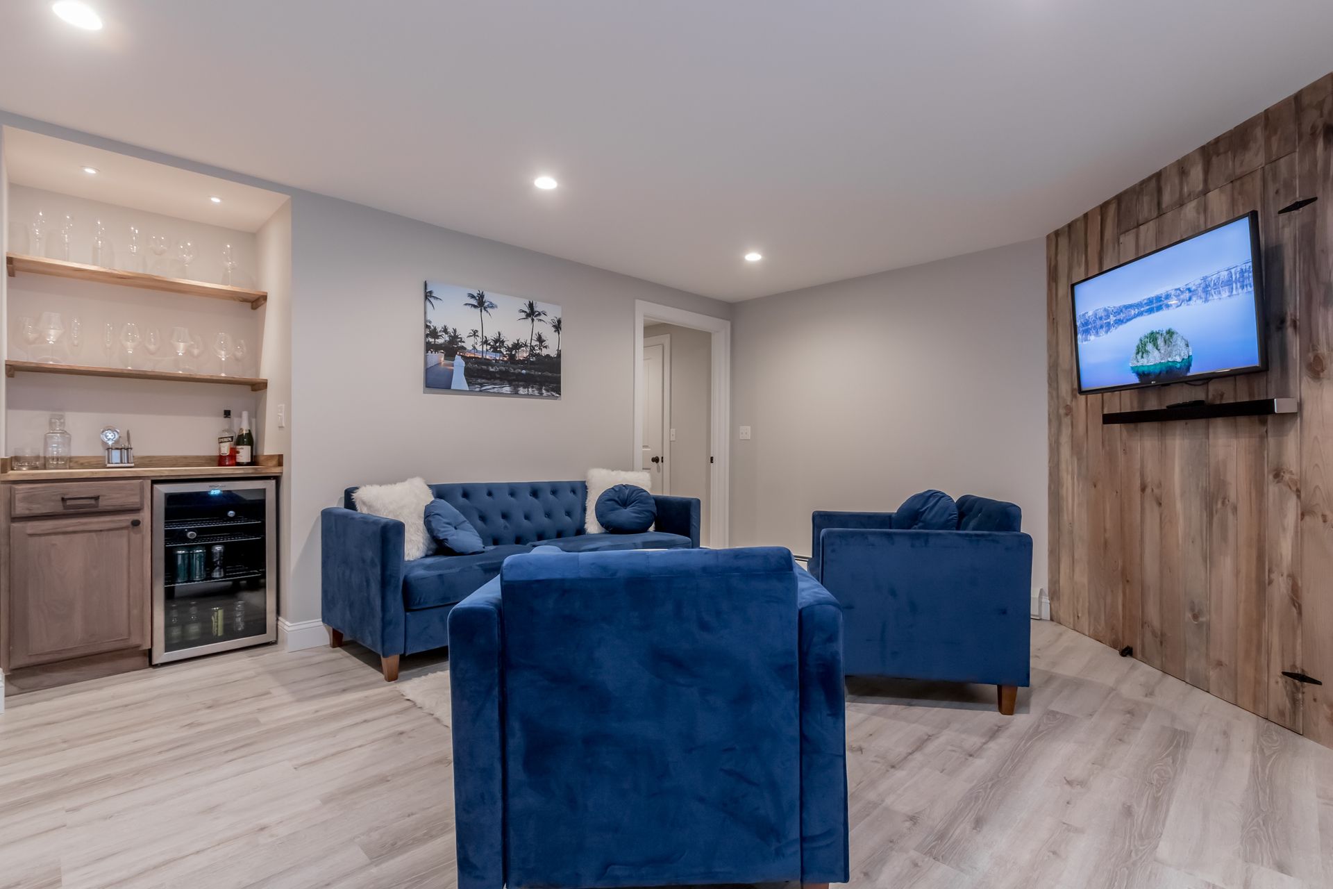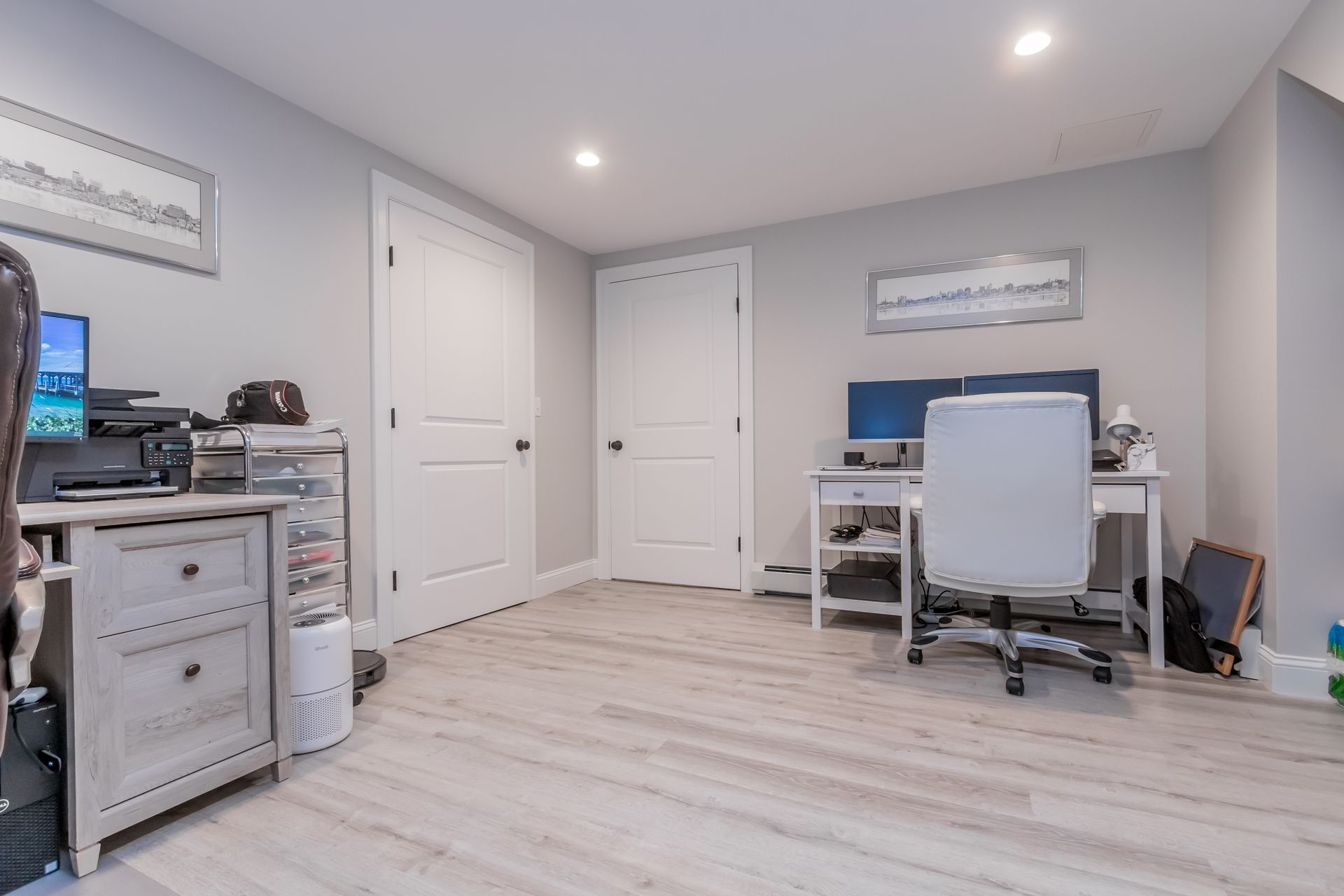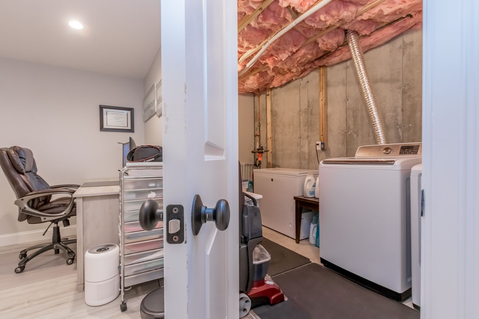 A primary bedroom with ensuite and the 3rd bedroom are privately located upstairs. There is also a finished basement providing separate office space, family/media room with beverage center, play/exercise room, half bath, workshop, laundry room, and plenty of storage space.