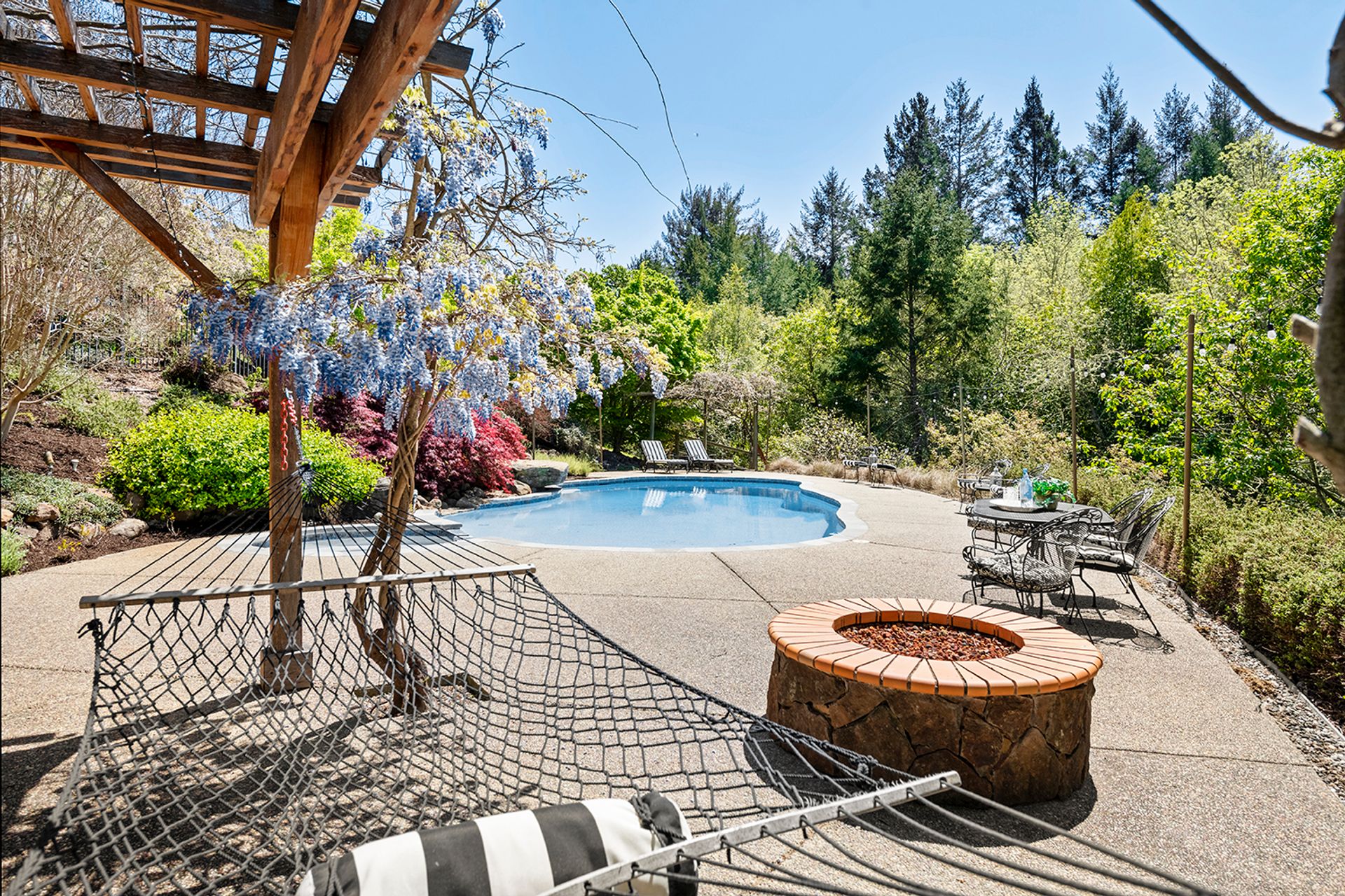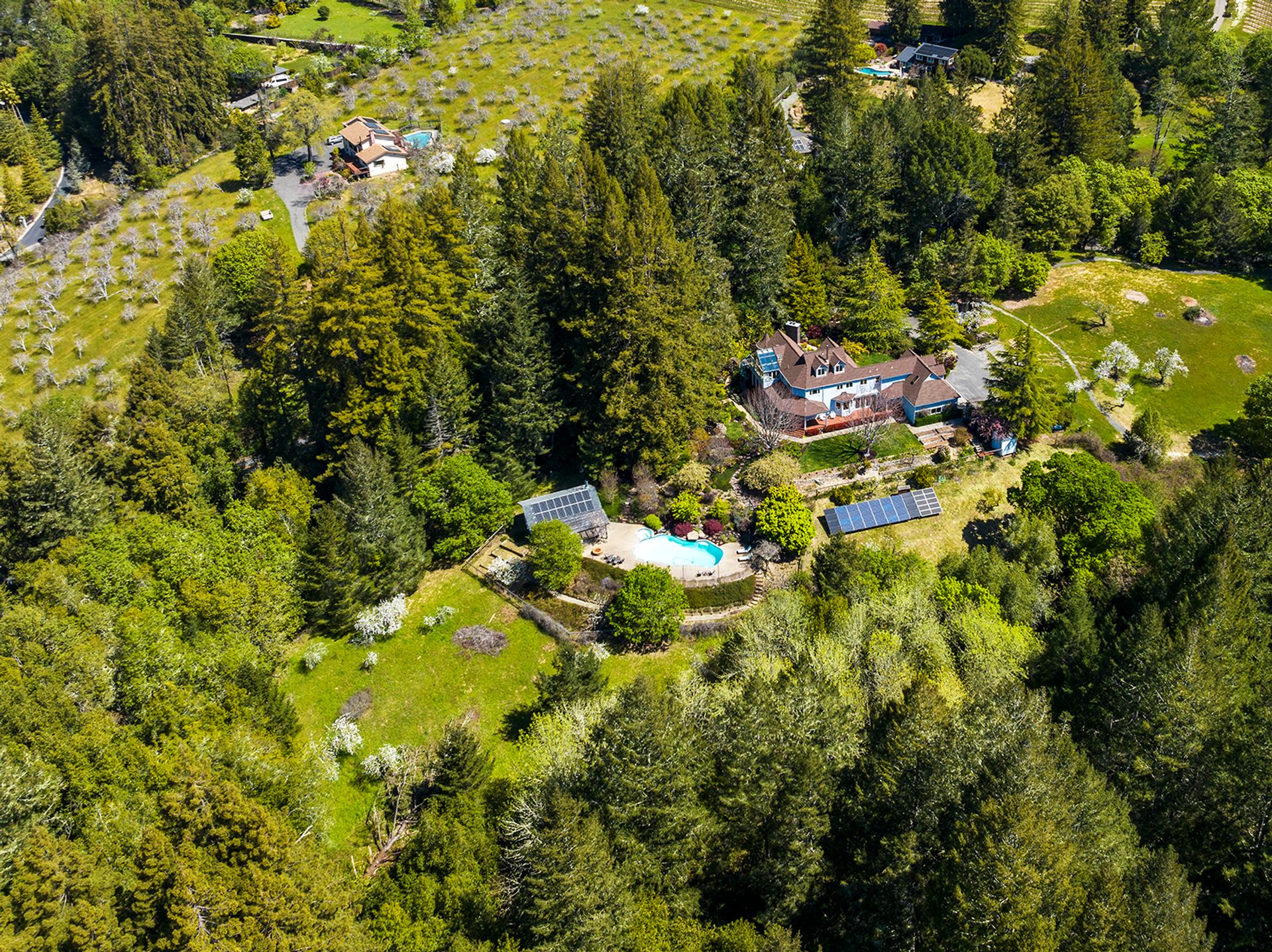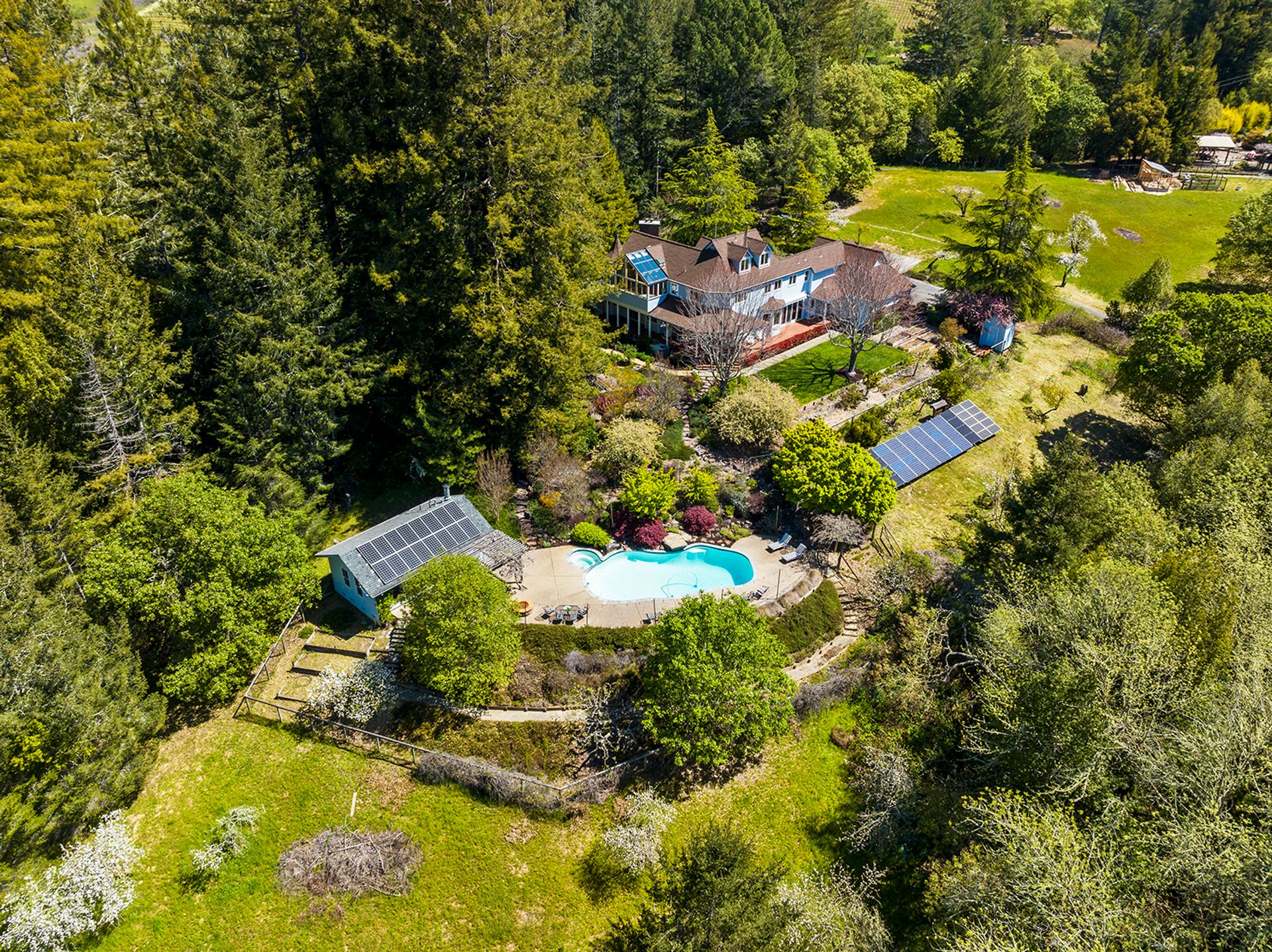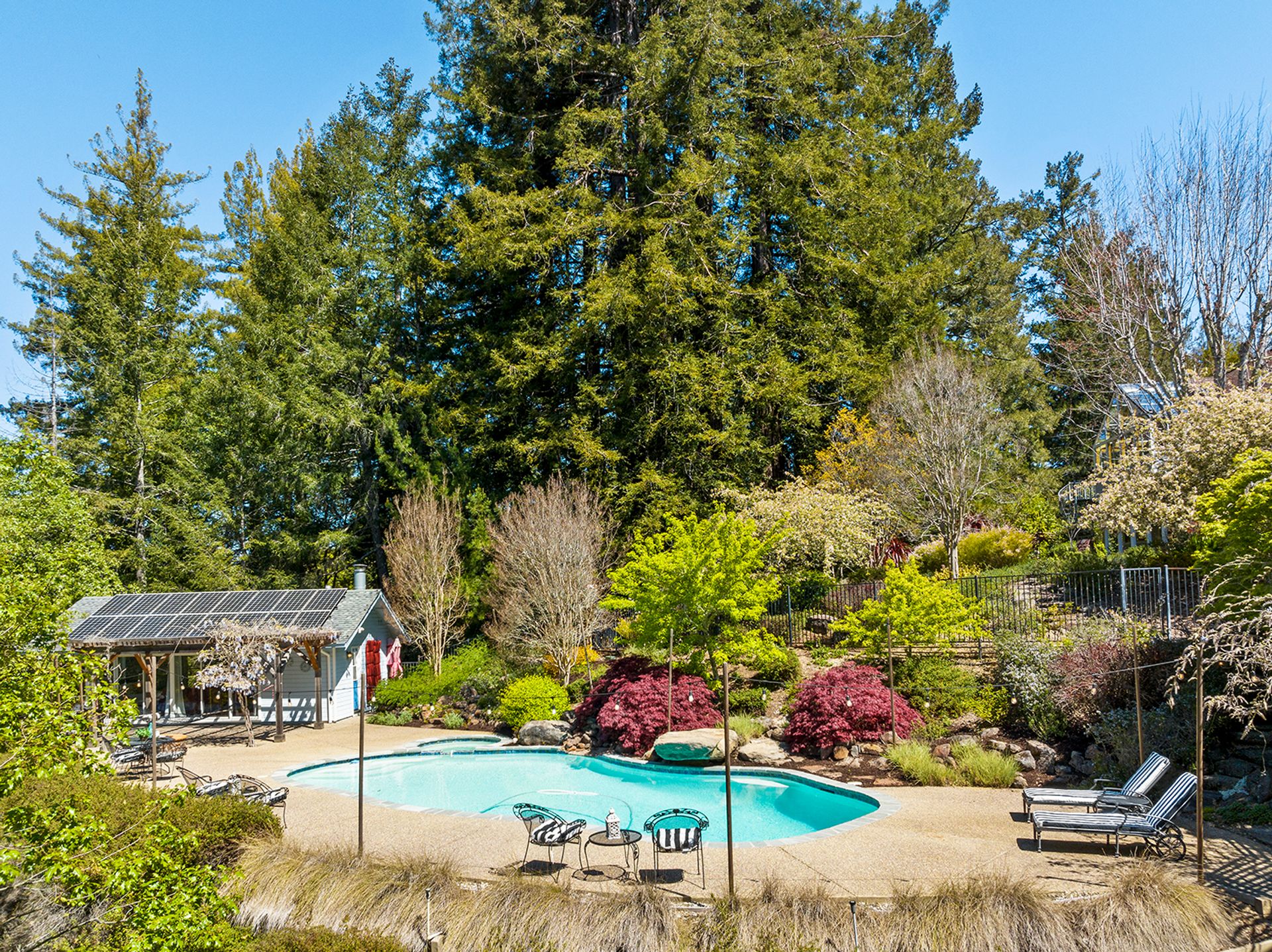Here is that amazing opportunity to live in your own 6+/- acre piece of paradise in the rolling green hills of West Sebastopol. Meander up the paved driveway through majestic age-old redwoods to a sunlit hilltop that showcases this stunning pride of ownership farmhouse-style home set amidst lush & magical cottage-style gardens. Walls of glass, French doors, oversized picture windows, and multiple skylights allow beautiful natural light throughout. An abundance of rich hardwood flooring, four warm and cozy fireplaces, high ceilings, lots of beautiful tile and natural stone, and a large wrap-around deck are perfect for warm summer nights and will delight the soul. Addl rooms include an amply sized home office, an enclosed balcony with a spa off of the primary suite, a game room, and a 3rd story finished room ideal as a second office, kids play area, or exercise room. Set private and away from the house is a spacious pool house/studio, overlooking a sparkling inground pool with a waterfall & a spa where the owners have had a successful permitted vacation rental. Don't miss the 30+/- panels of solar which keep energy bills low Numerous producing fruit trees and raised vegetable beds complete this offering. Live off the land just minutes from colorful downtown Sebastopol.