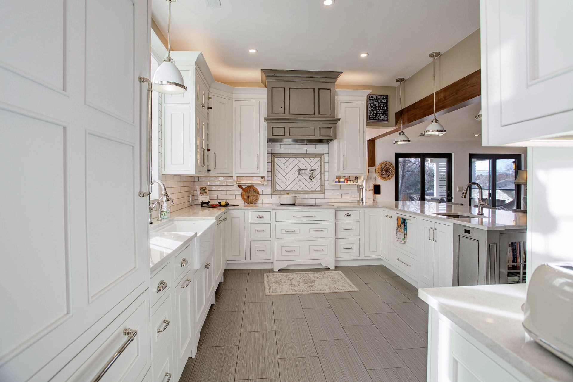A 36" wide Blanco Fireclay apron-front sink with InstaHot and soap dispensers, plus a Silgranit veggie sink in the island with insinkerator disposal.