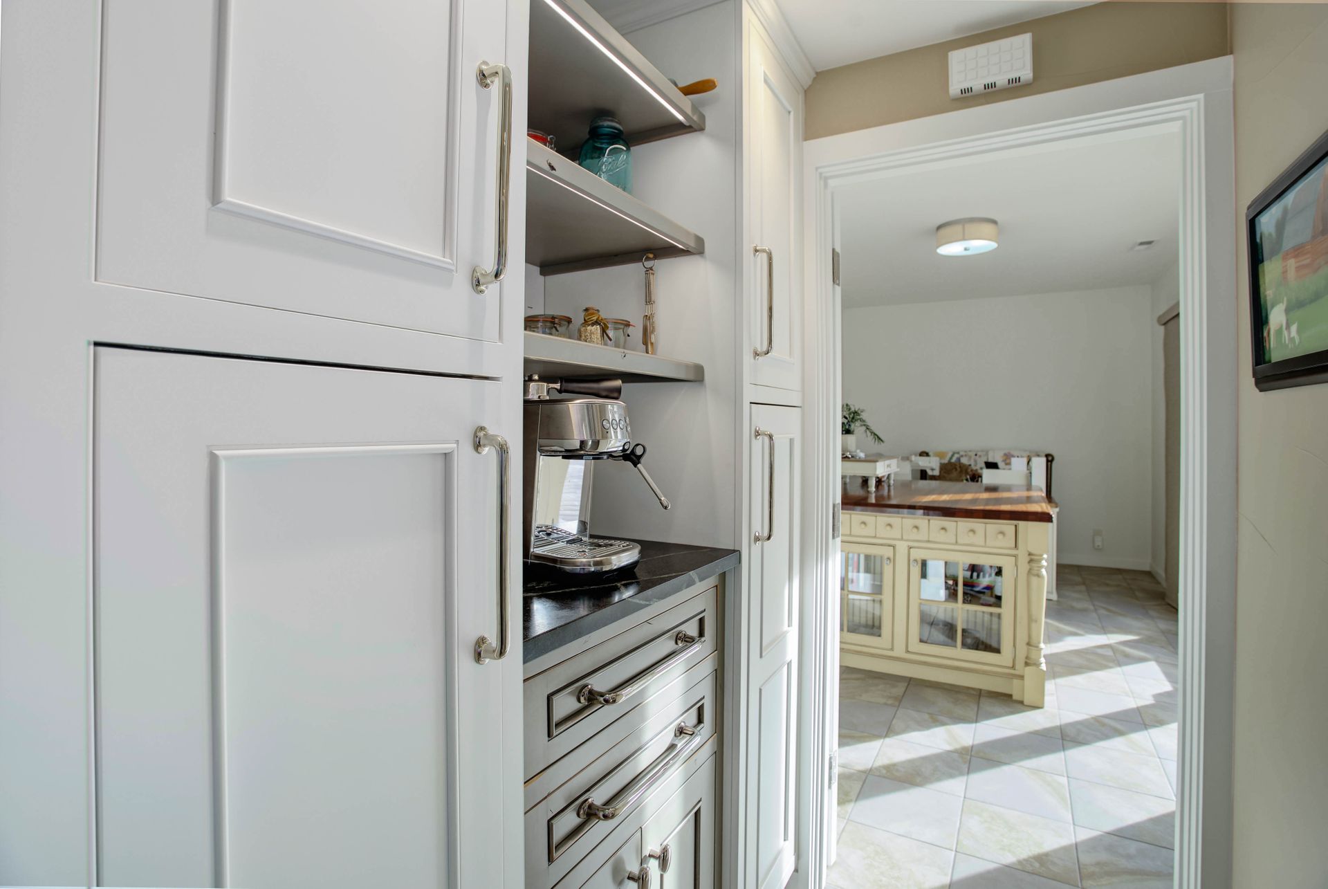 A butler’s pantry with a beverage station, key and charging storage.