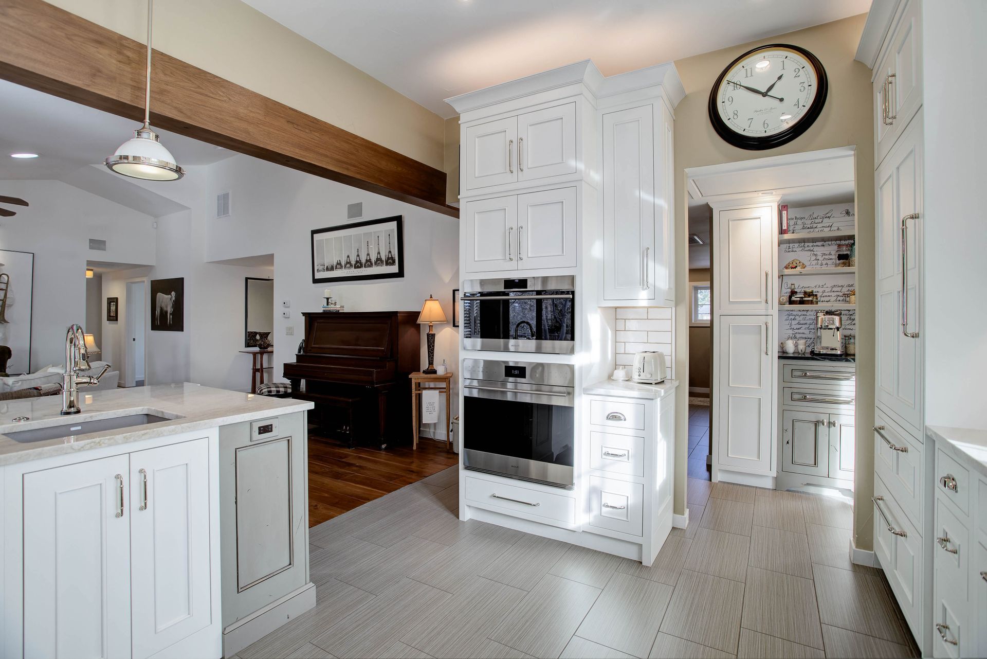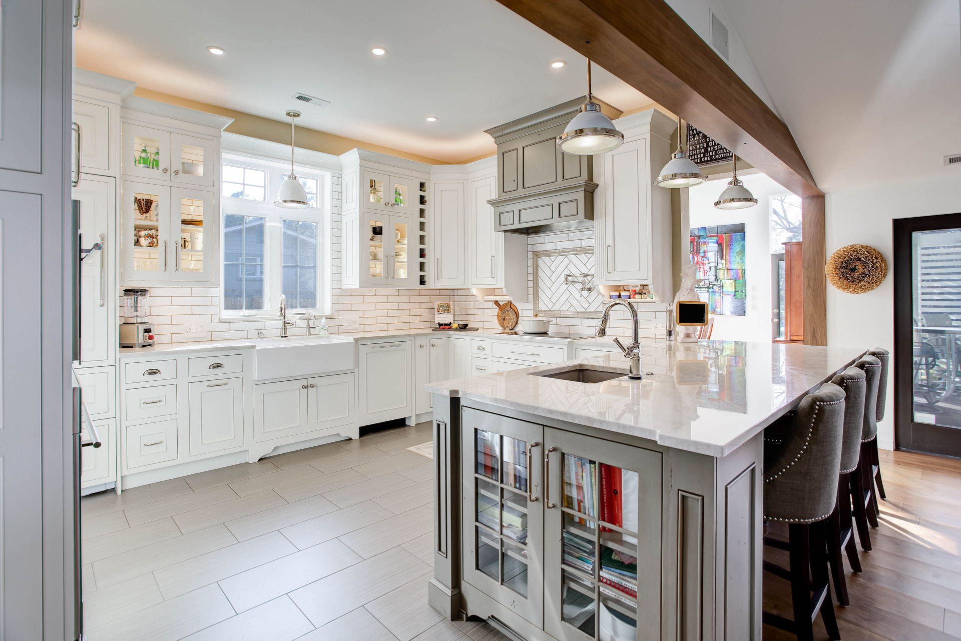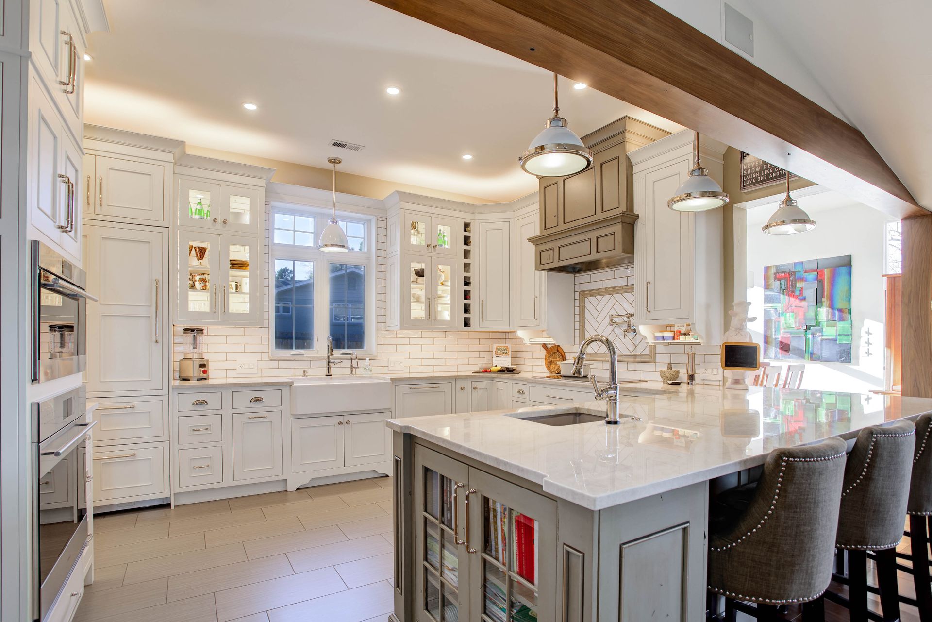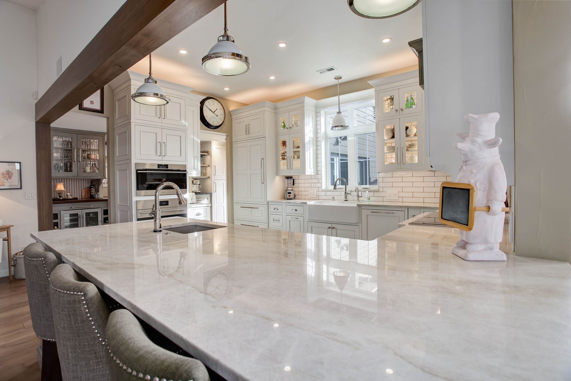 The gourmet chef's kitchen is a showstopper, complete with Schroll cabinetry, Taj Mahal quartzite and soapstone countertops, and every convenience imaginable: