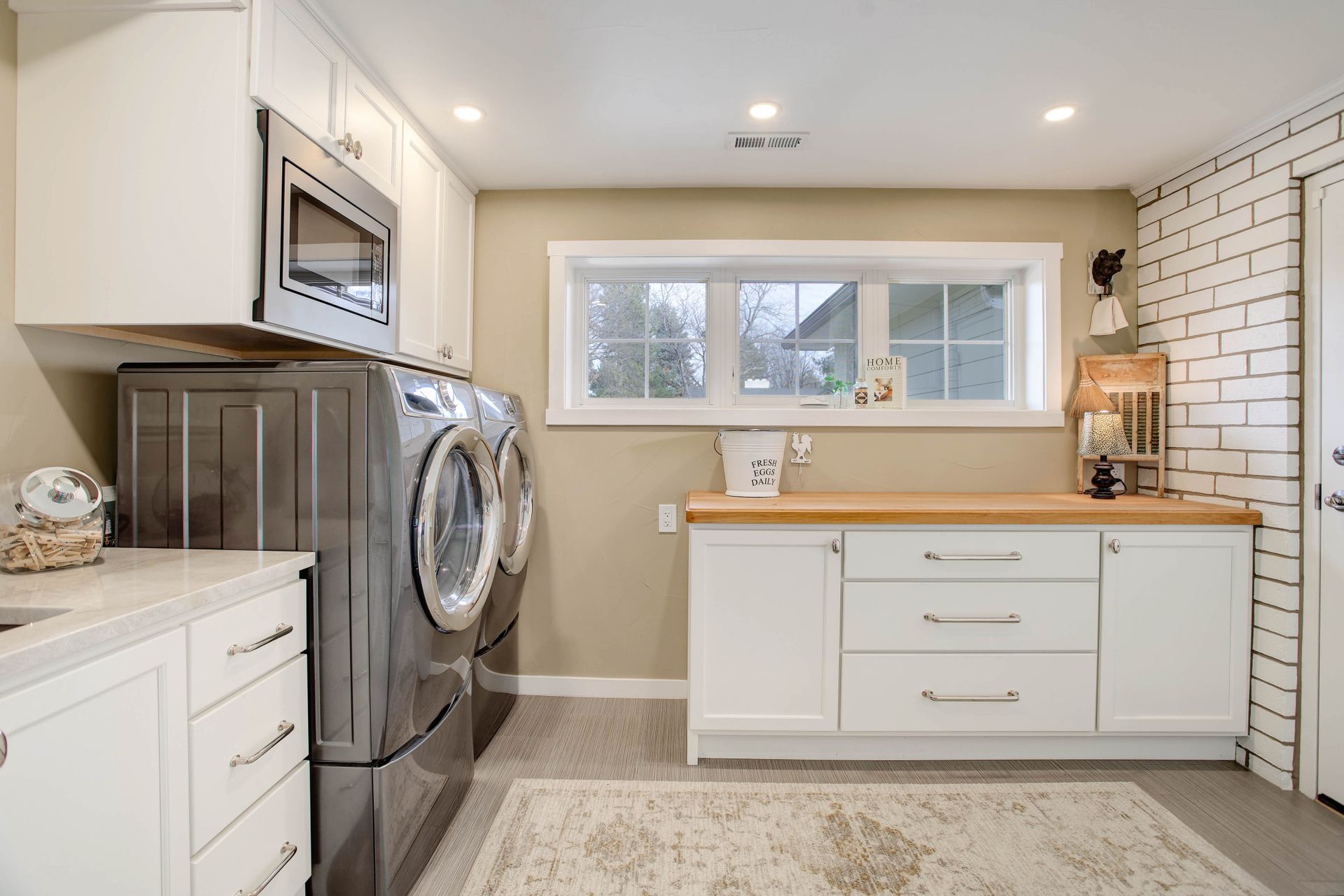 The laundry room offers practicality and style with a 36" pantry cabinet, Silgranit Blanco utility sink, hanging rod and a boot bench with ample storage.