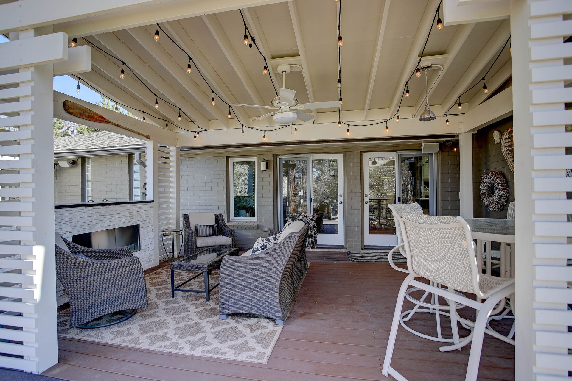 A covered family room area with a gas fireplace.