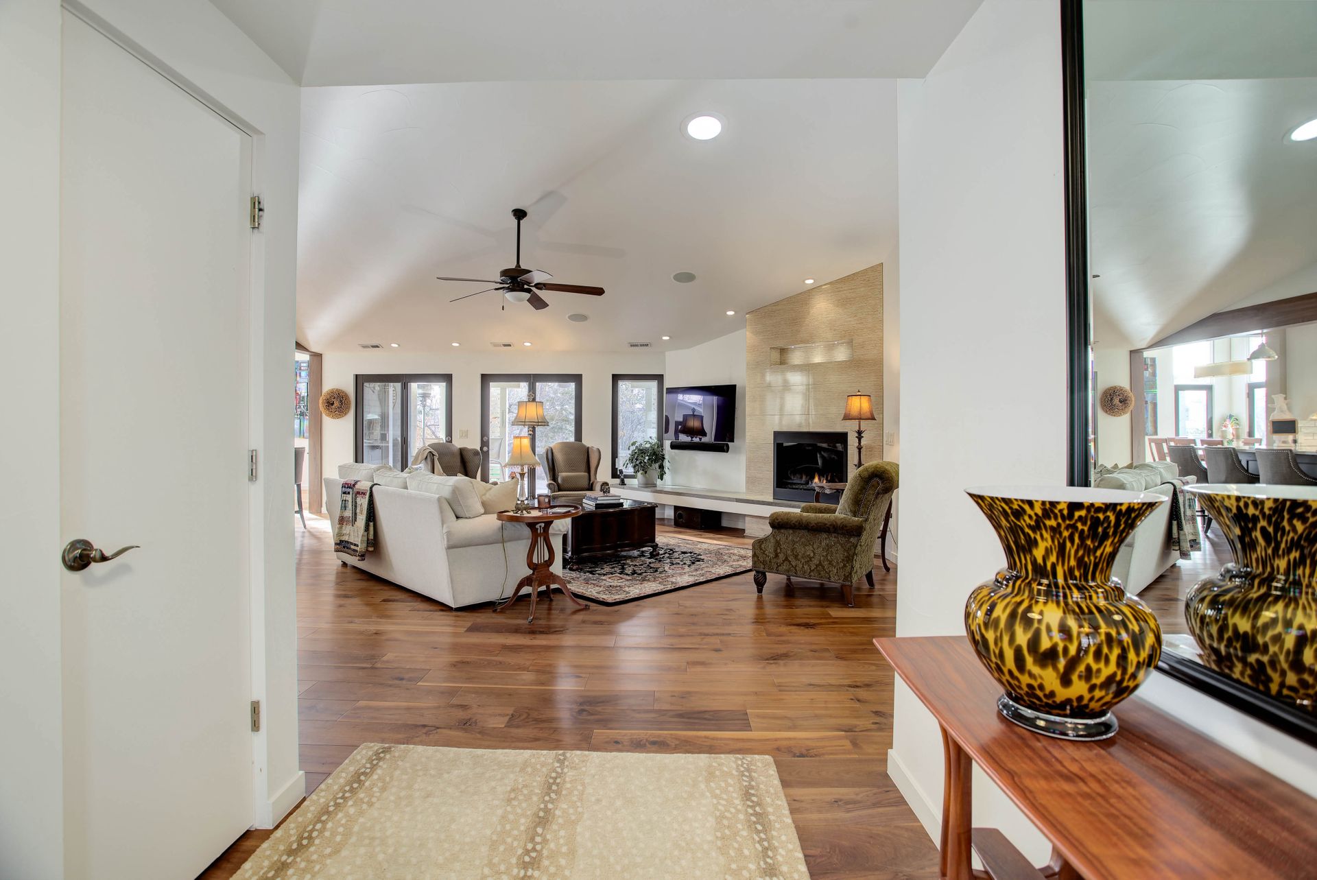 Venture inside to find radiant flooring throughout, complemented by gorgeous hardwood and tile finishes. The inviting family room features a custom fireplace, while the elegant dining room offers multiple access points to the expansive outdoor living spaces.
