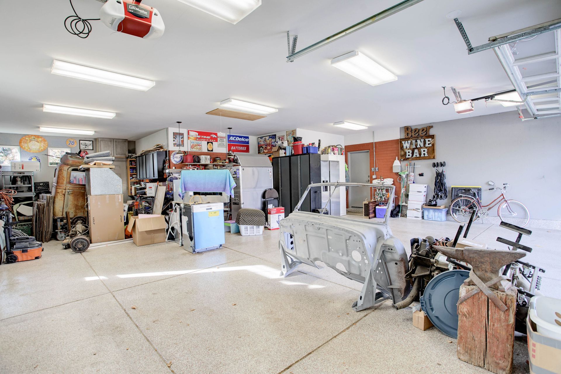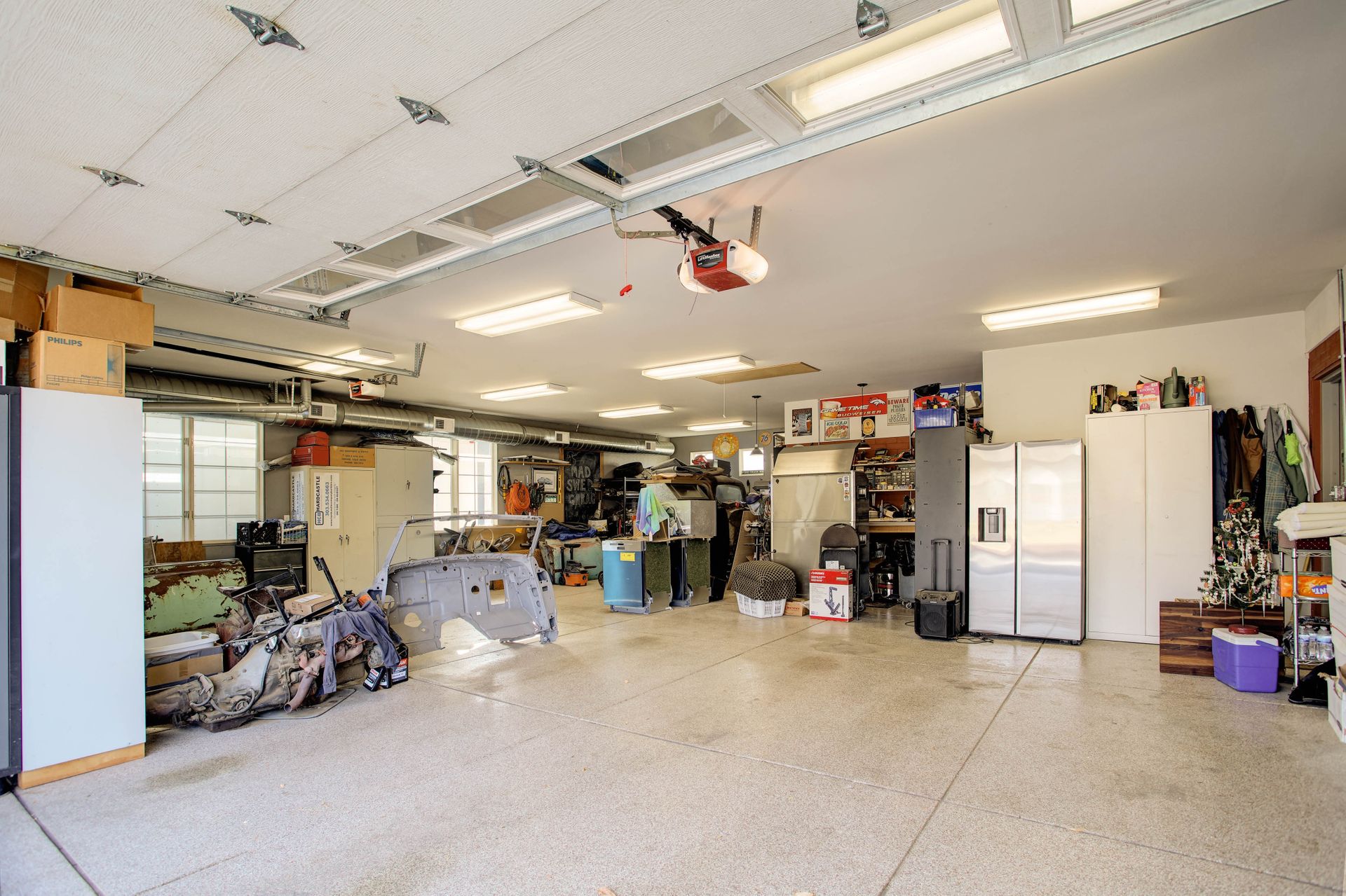 An oversized, heated 4-car attached garage with coated flooring.