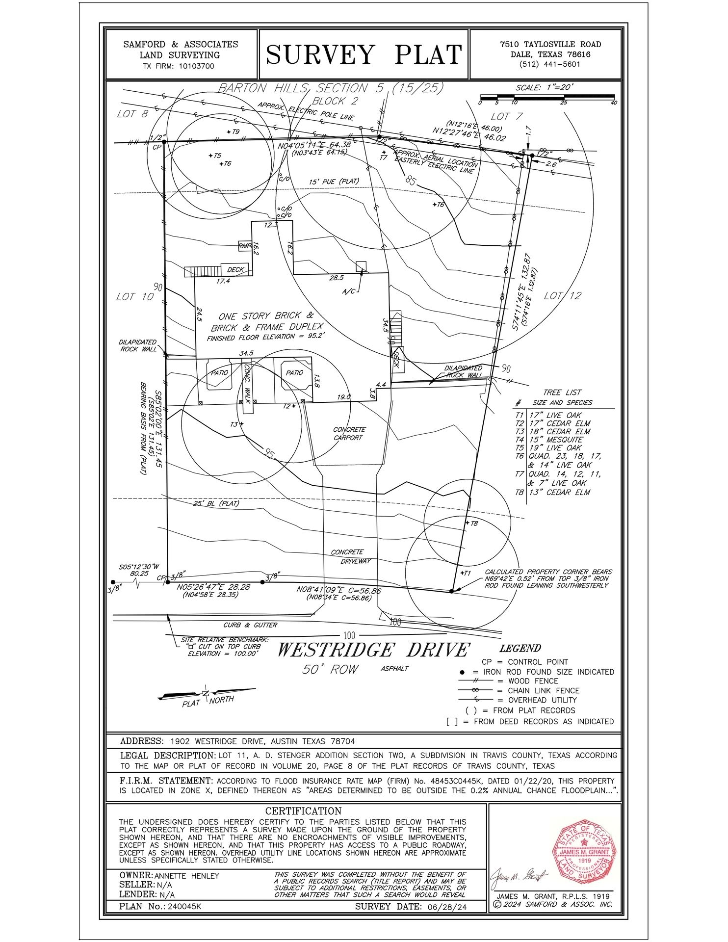 Priced below Travis County Tax Appraisal District (TCAD) assessed land value (2023)!!!... Value is in the land. Ideal to demolish duplex and build two contemporary homes…Lot size is 0.294 acres. Lot square footage is 12,802 square feet (TCAD)…Current survey dated 06/28/2024 includes boundary, improvements and topography suitable for City of Austin’s McMansion Ordinance development (see attached)…Approximate dimensions are as follows: 85’ frontage….131’ deep….109’ back property line…Live Oak (19”) located back left near property line.
