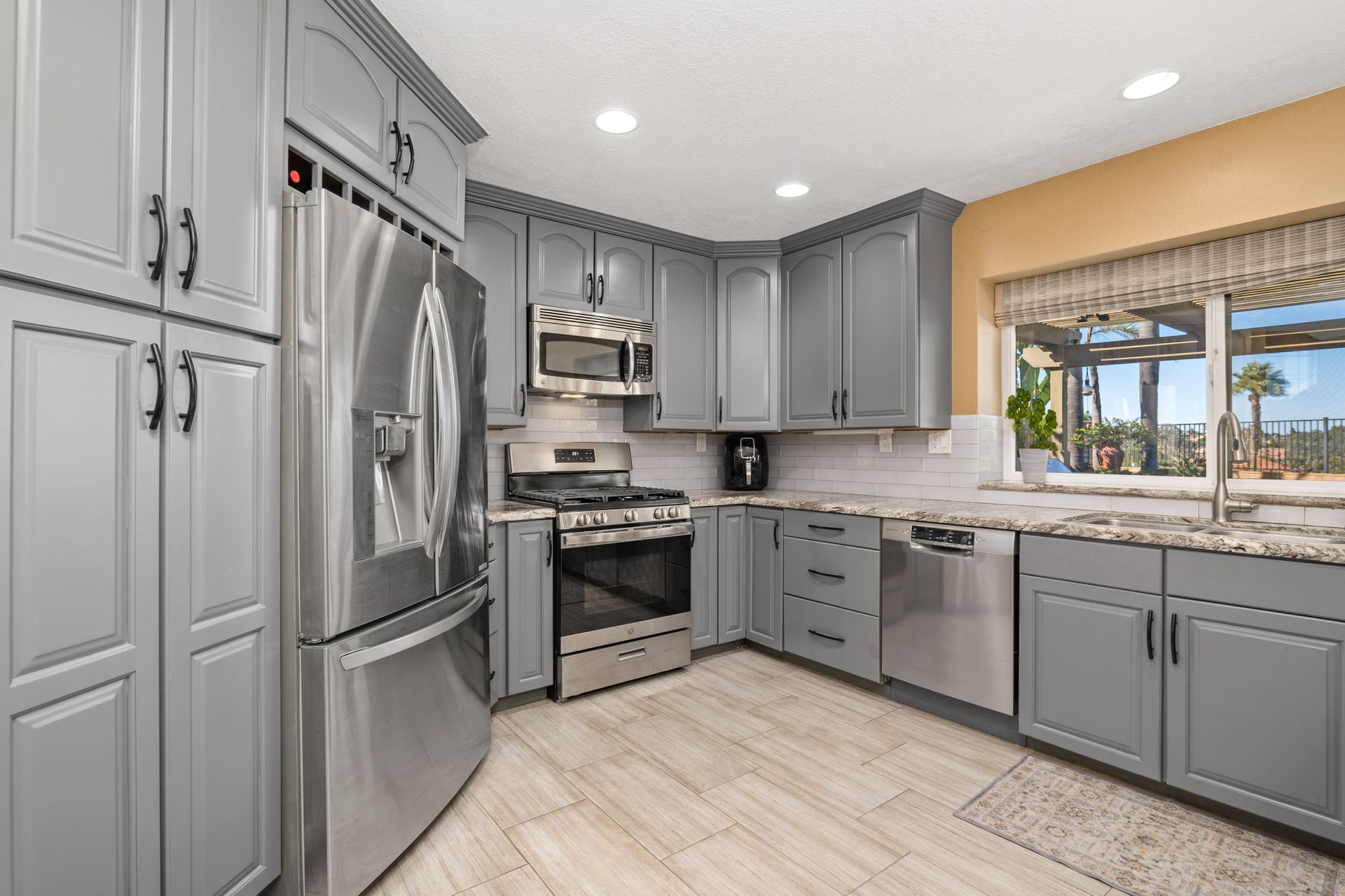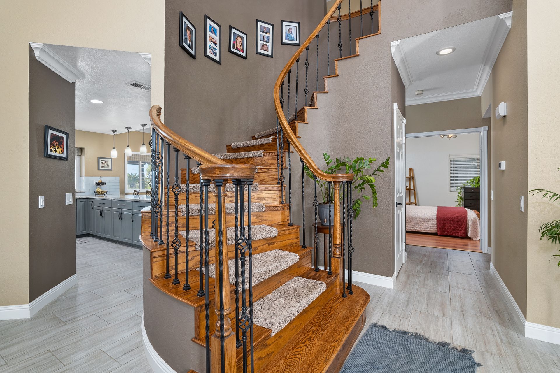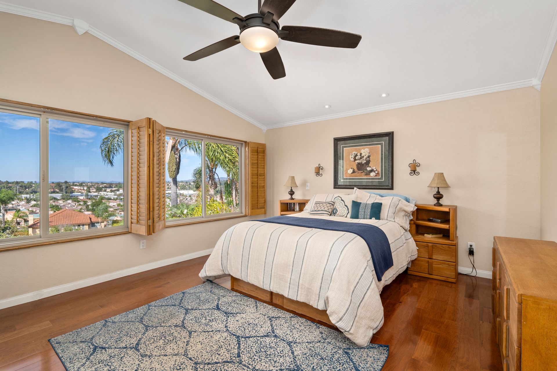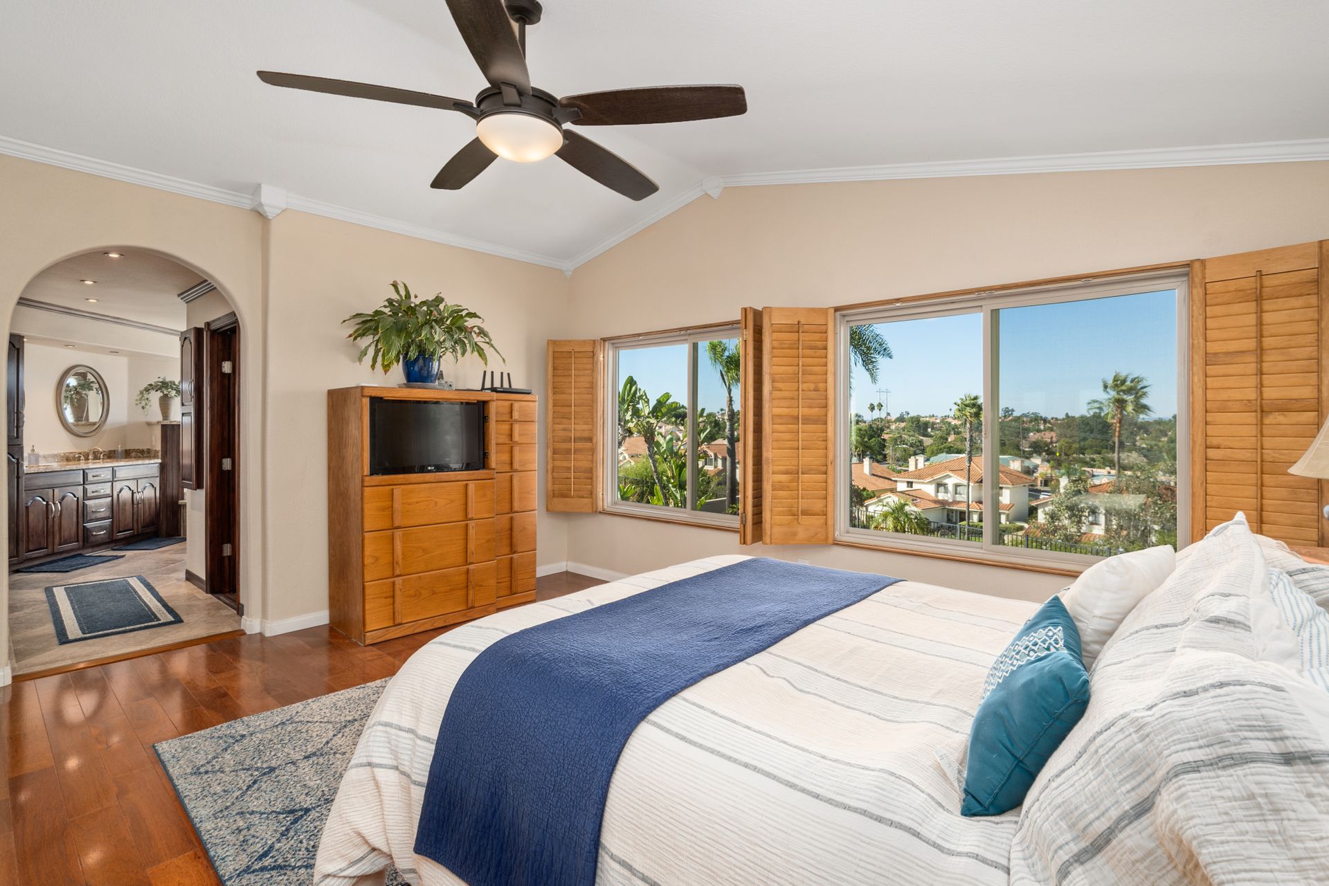 Enjoy expansive views from this cul-de-sac home featuring an inviting outdoor entertaining area with a pool! Enter this spacious home through a private gated courtyard. The impressive foyer opens to the formal living and dining rooms and a spiral staircase! The remodeled kitchen is stylish with painted cabinets, stainless steel appliances, a generous breakfast bar with pendant lights and it overlooks the generous family room! Kitchen counters are a stunning slab granite with a backsplash of glass tile. The focal point of the family room is the mosaic glass tile fireplace and tile mantle. One bedroom and full bath is located downstairs! Upstairs the primary suite enjoys the expansive views of the Shadowridge area and the foothills and mountains beyond! The spa-like bath area of the primary suite has been remodeled with upgraded cabinetry, dual vanities, a linen closet, large tub and a separate shower! The expanded walk-in closet and secondary closet provide lots of space for clothes storage! The secondary bedrooms upstairs share another remodeled bath! The home is thoughtfully appointed and upgraded with vinyl windows and tile floors downstairs and in the baths. There are hardwood floors on the stairs and in the bedrooms! Window coverings include plantation shutters and woven blinds. Fans and upgraded lighting can be found throughout! An entertainers dream back yard features a built-in ledger stone BBQ station and a buffet with a sink. The covered patio overlooks the large pool and the views beyond...there is no-one currently behind you except open space maintained by the HOA. Nearby is the Buena Vista Park with a pond, picnic areas and hiking trails, several restaurants, shopping and schools. The Shadowridge Golf course is also very convenient!