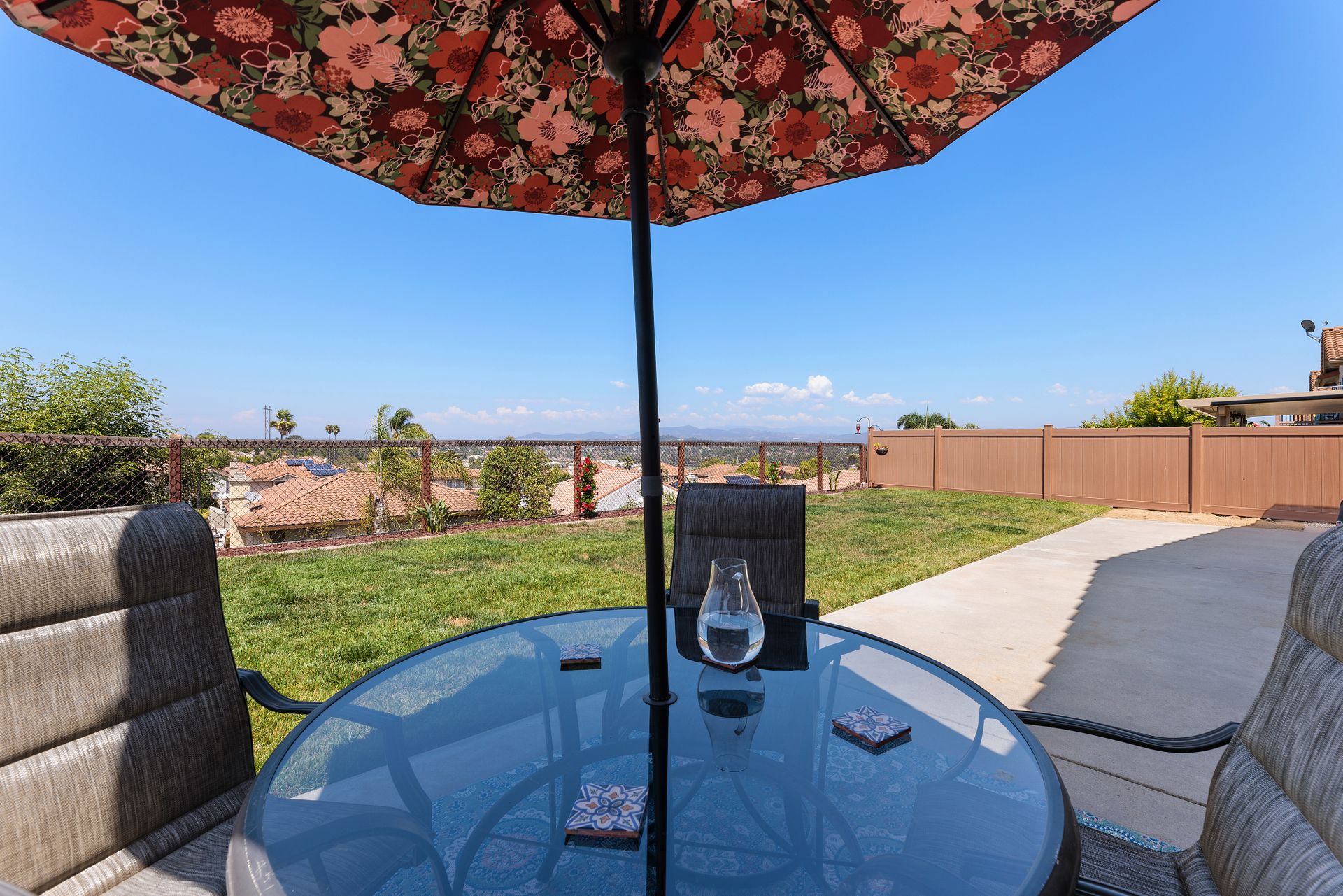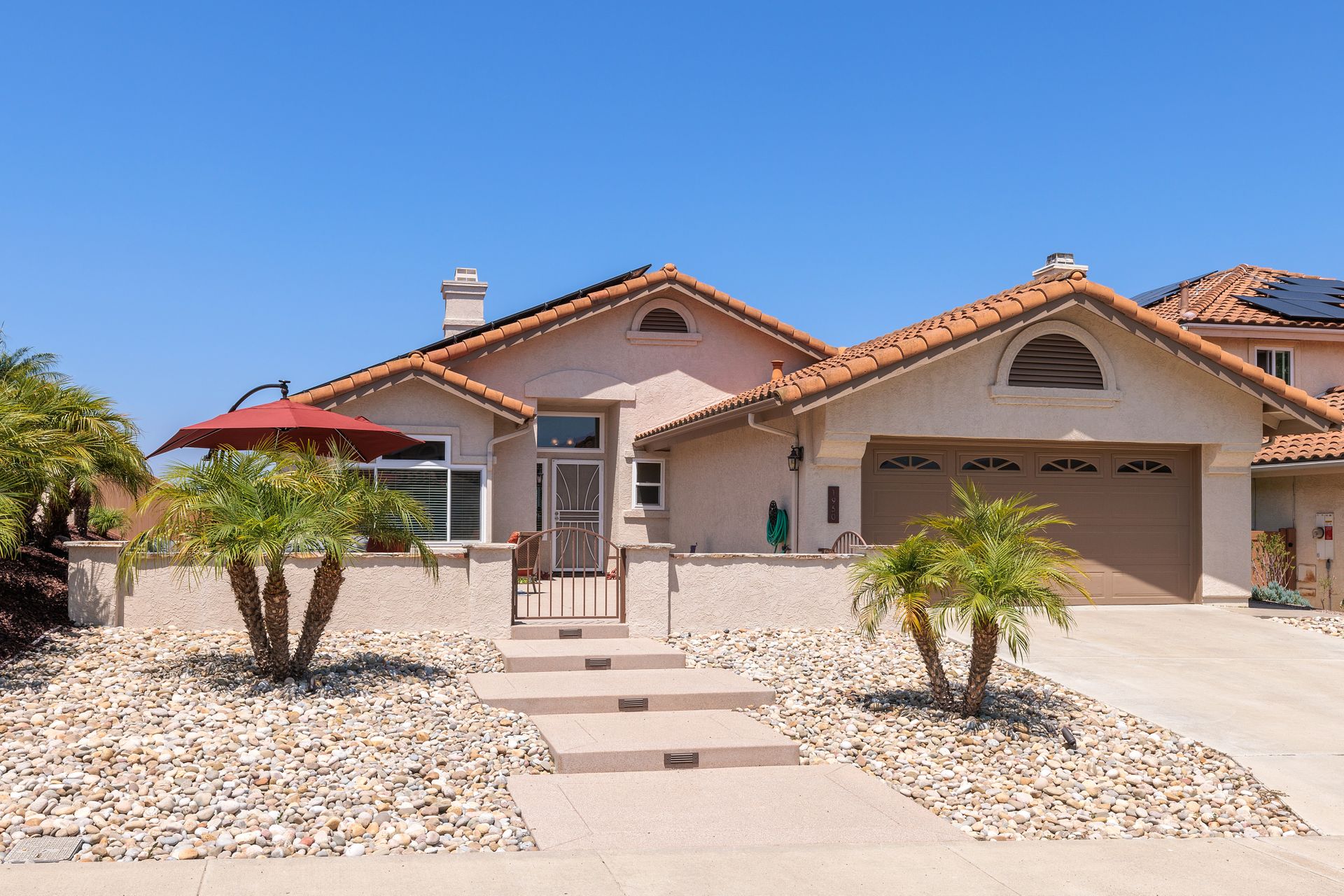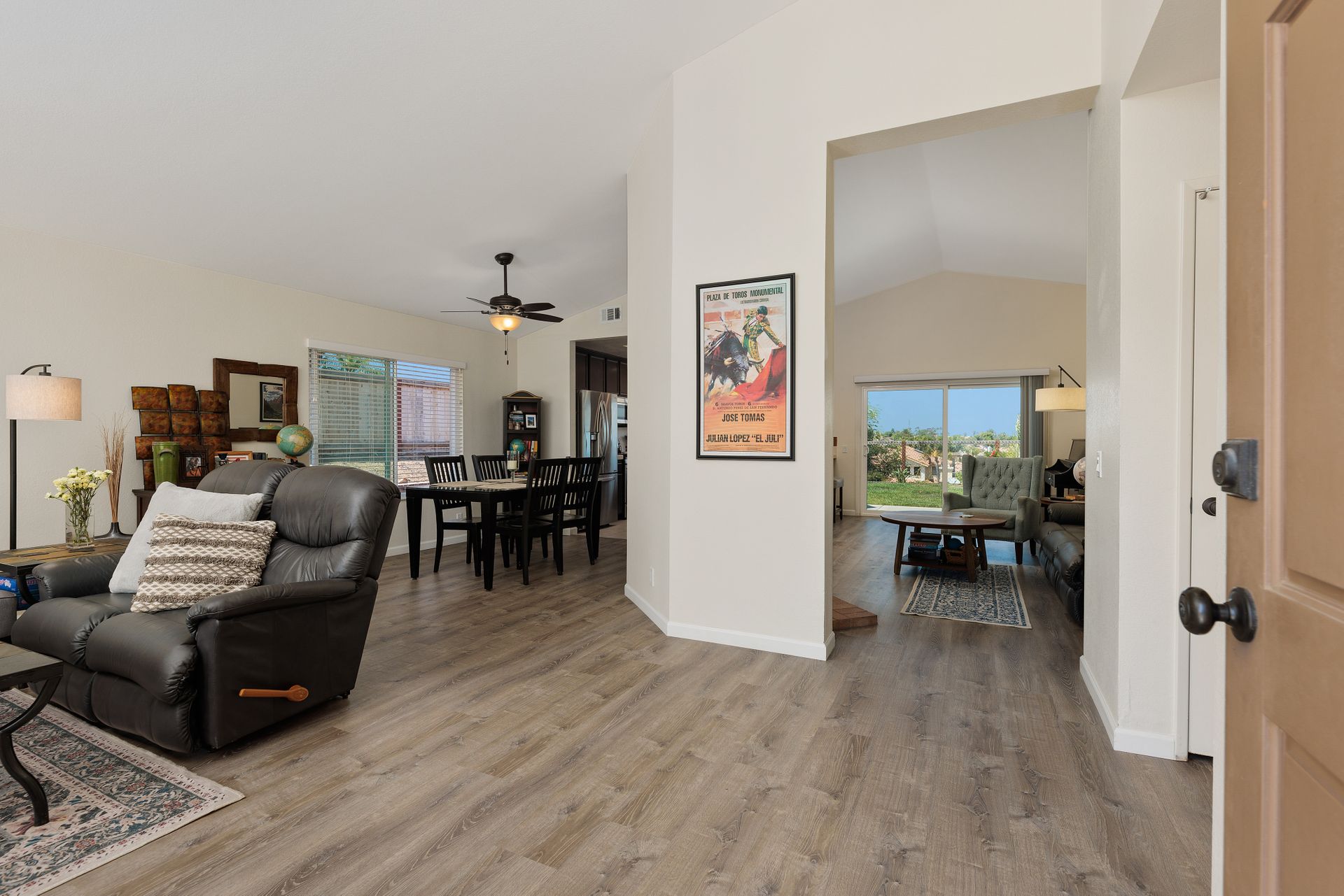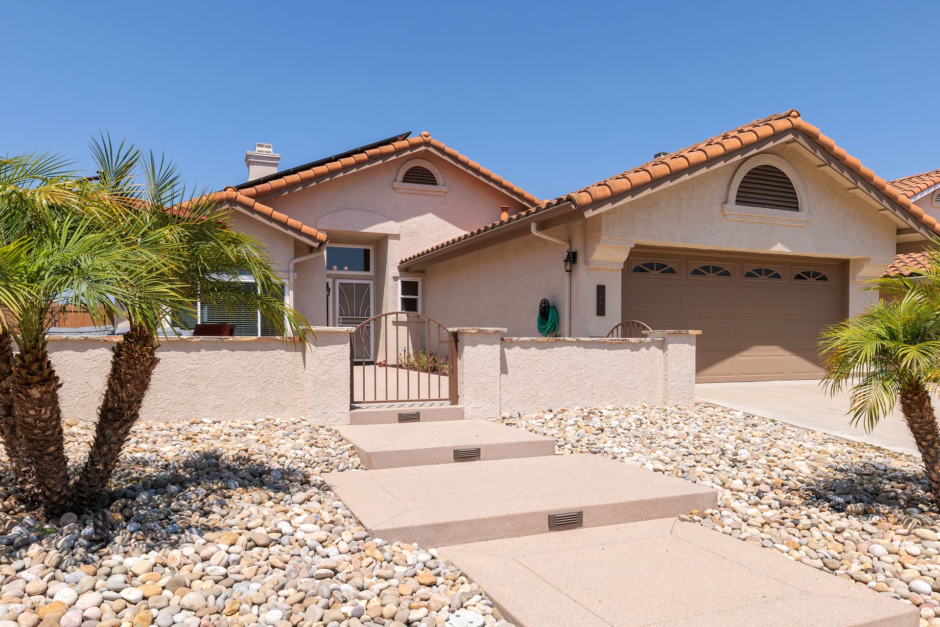 Welcome to this charming single-level three bedroom VIEW home that epitomizes low-maintenance living and modern comfort with a freshly painted interior and exterior. Enjoy the thoughtfully designed front yard with drought-resistant landscaping and an inviting courtyard patio that warmly welcomes you into the residence. As you head inside, you'll immediately notice the exquisite newer luxury vinyl plank flooring that flows seamlessly throughout, complemented by vaulted ceilings, baseboards and energy efficient windows, and newer blinds creating a light and spacious atmosphere. The living space features formal living and dining areas, providing the ideal backdrop for gatherings and special occasions. The heart of the home is the bright kitchen, complete with stainless steel appliances, which effortlessly connects through the breakfast bar to the family room. From here, you can go outside to the grassy backyard with a patio area where you can unwind and soak in the captivating city and mountain views. The primary bedroom is a serene retreat, capturing the enchanting vistas! The attached two-car garage provides ample storage. Equipped with owned solar panels and air conditioning, this home embraces sustainable living without compromising on comfort. Situated in a desirable location, this home offers easy access to the Shadowridge Golf Club, shopping centers, restaurants and schools, making it a great blend of convenience and tranquility. With low HOA fees, this property presents an incredible opportunity to embrace a comfortable and vibrant lifestyle. Don't miss the chance to make this home your own and enjoy the seamless blend of modern living and captivating outdoor views.