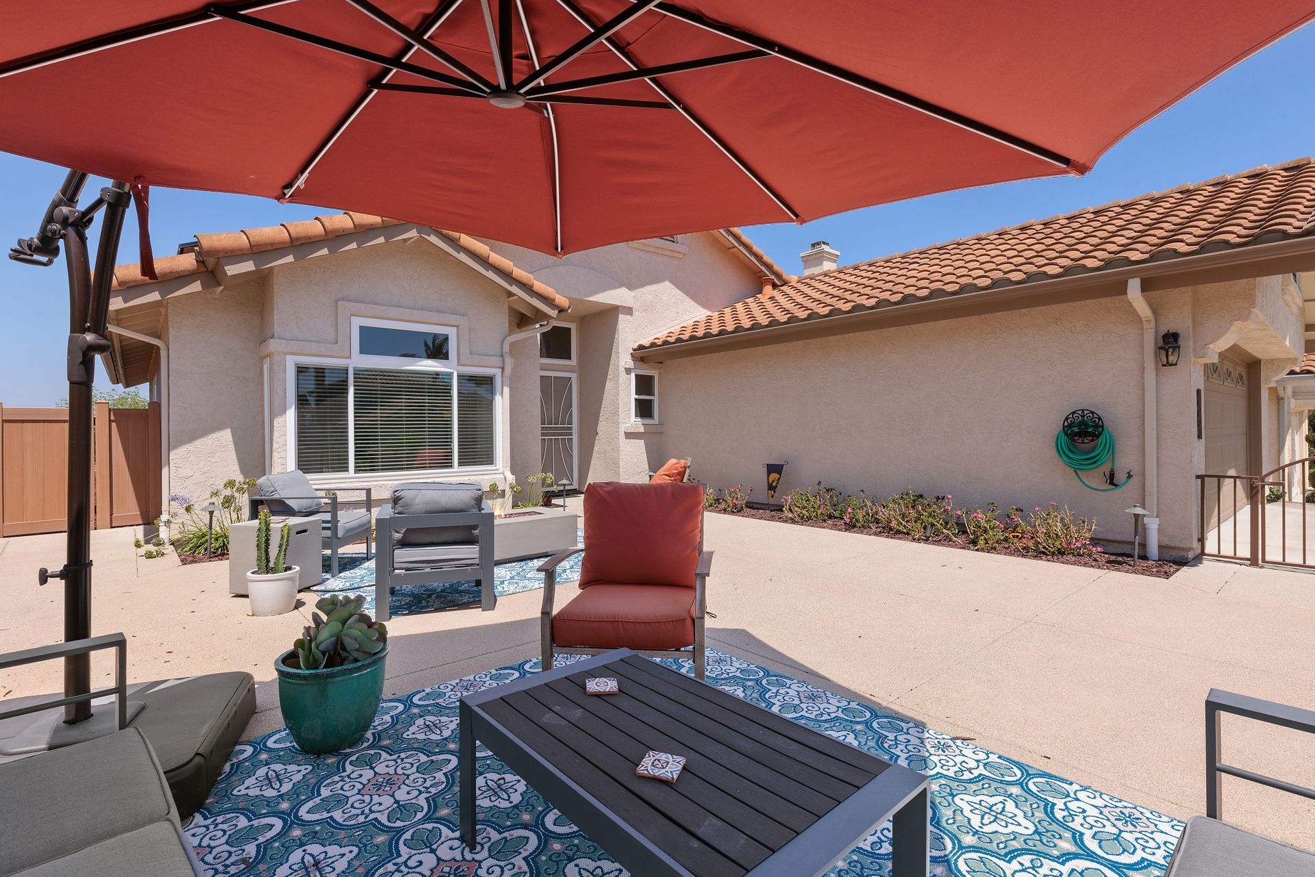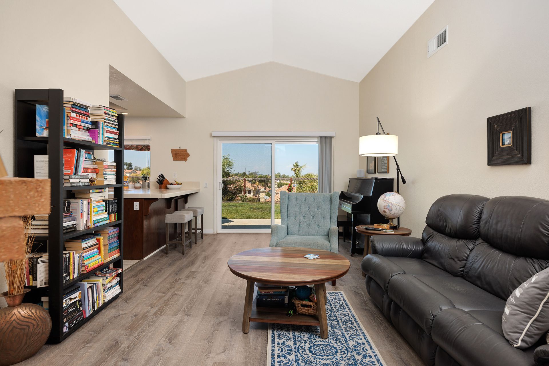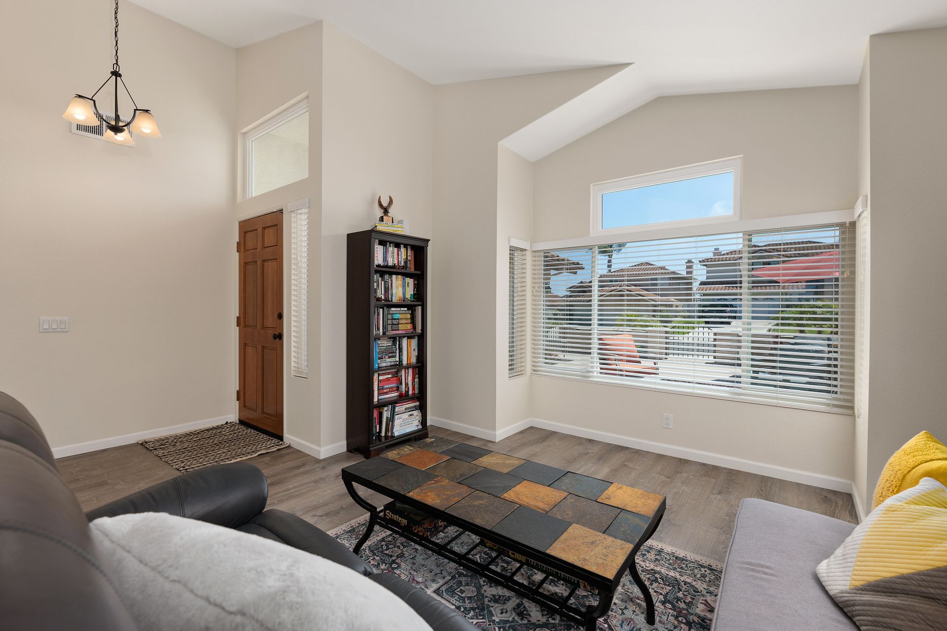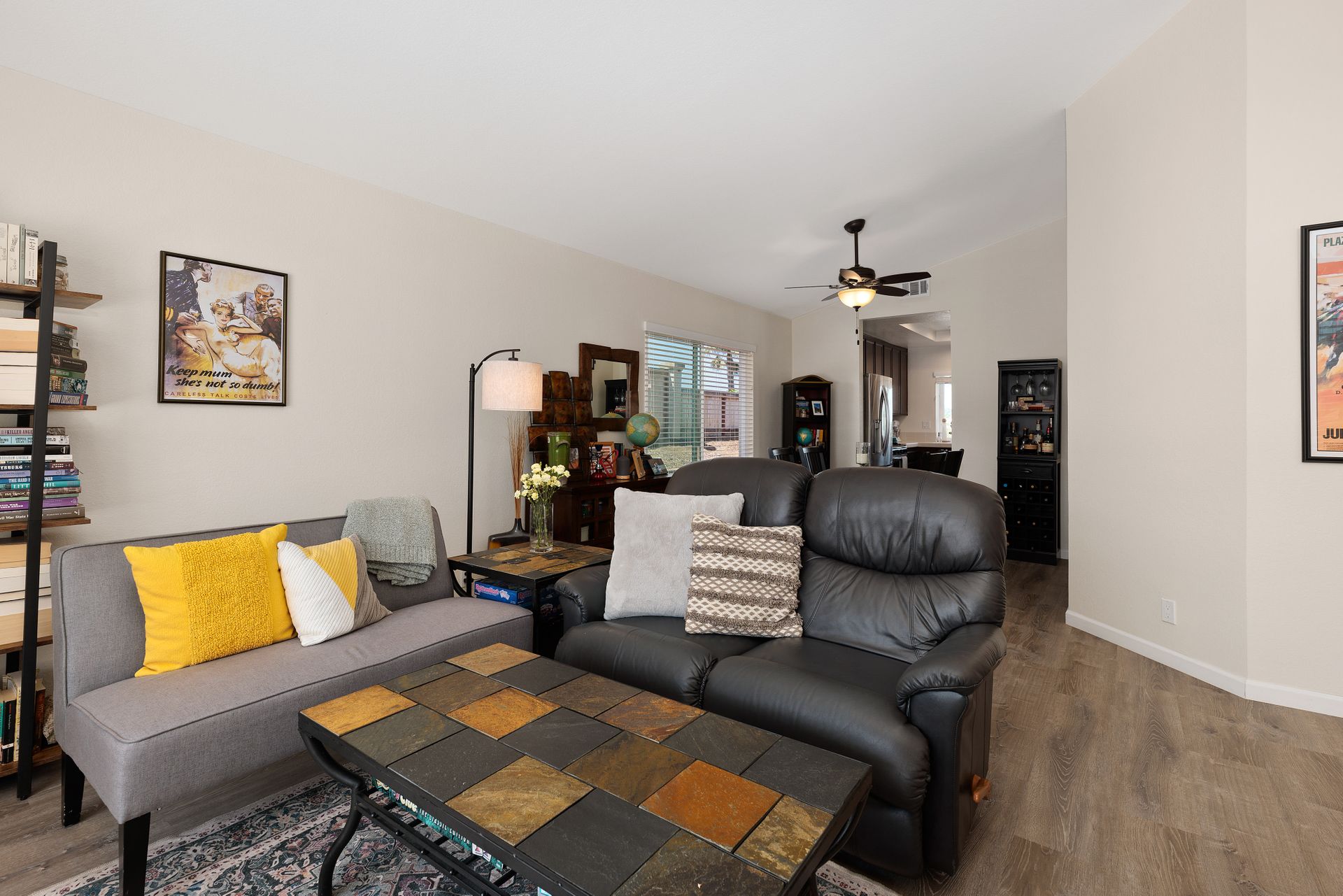 Welcome to this charming single-level three bedroom VIEW home that epitomizes low-maintenance living and modern comfort with a freshly painted interior and exterior. Enjoy the thoughtfully designed front yard with drought-resistant landscaping and an inviting courtyard patio that warmly welcomes you into the residence. As you head inside, you'll immediately notice the exquisite newer luxury vinyl plank flooring that flows seamlessly throughout, complemented by vaulted ceilings, baseboards and energy efficient windows, and newer blinds creating a light and spacious atmosphere. The living space features formal living and dining areas, providing the ideal backdrop for gatherings and special occasions. The heart of the home is the bright kitchen, complete with stainless steel appliances, which effortlessly connects through the breakfast bar to the family room. From here, you can go outside to the grassy backyard with a patio area where you can unwind and soak in the captivating city and mountain views. The primary bedroom is a serene retreat, capturing the enchanting vistas! The attached two-car garage provides ample storage. Equipped with owned solar panels and air conditioning, this home embraces sustainable living without compromising on comfort. Situated in a desirable location, this home offers easy access to the Shadowridge Golf Club, shopping centers, restaurants and schools, making it a great blend of convenience and tranquility. With low HOA fees, this property presents an incredible opportunity to embrace a comfortable and vibrant lifestyle. Don't miss the chance to make this home your own and enjoy the seamless blend of modern living and captivating outdoor views.
