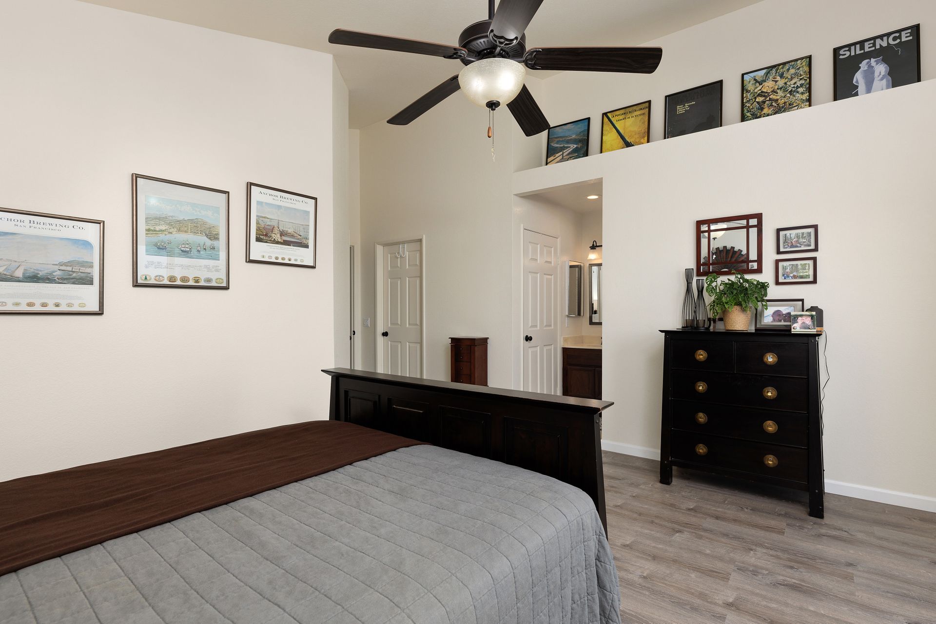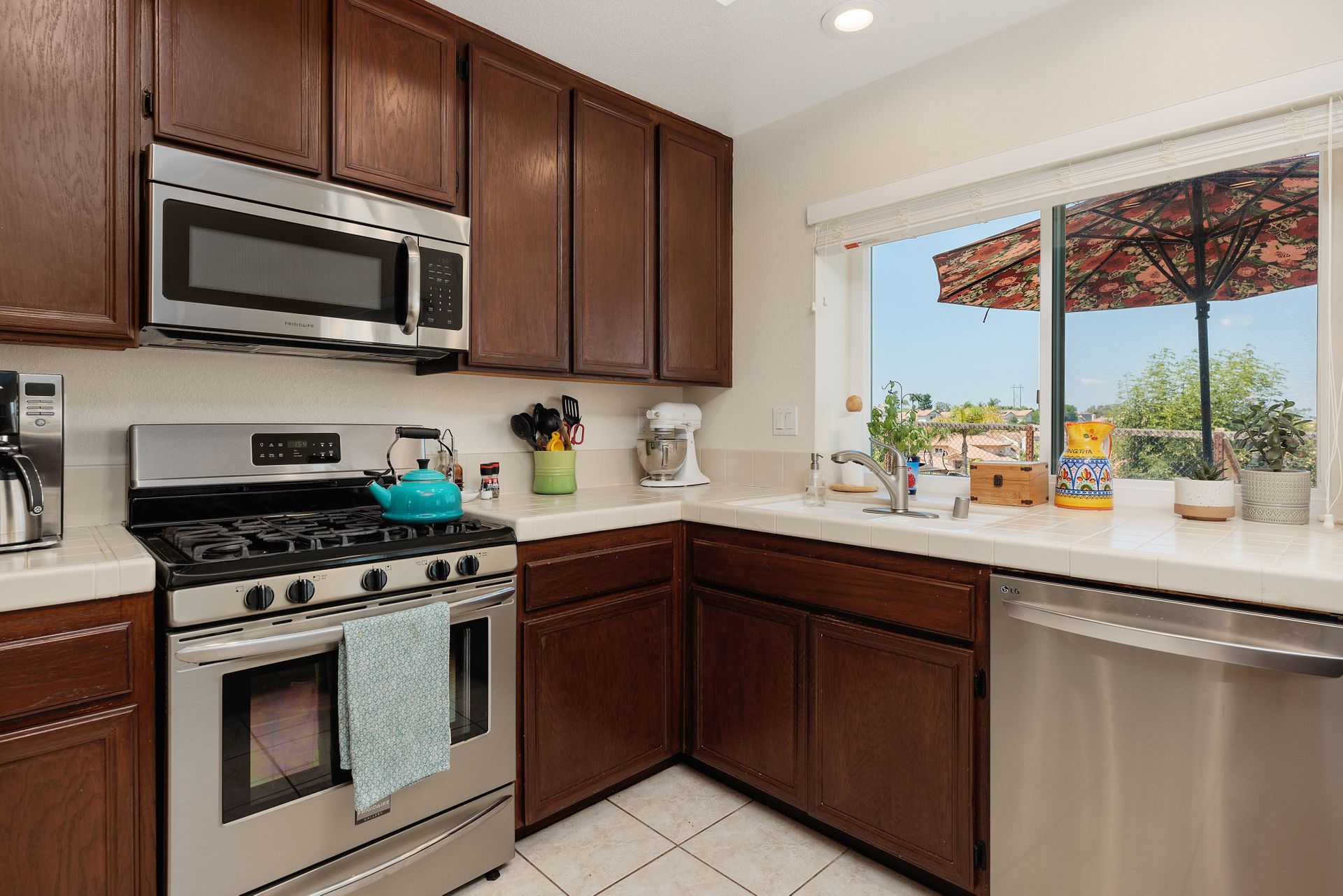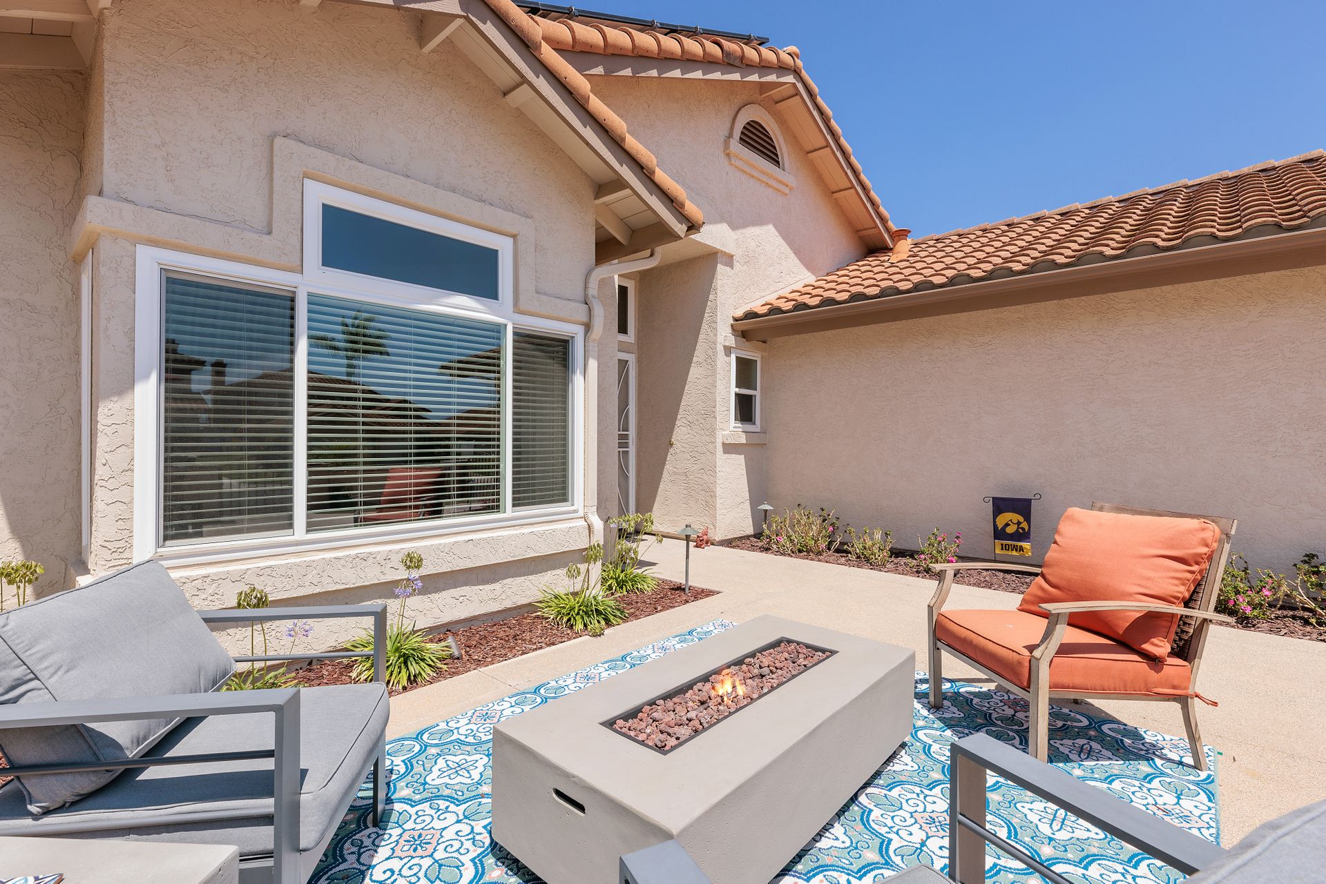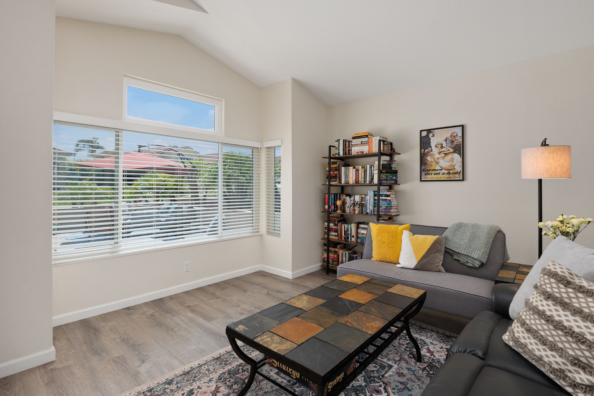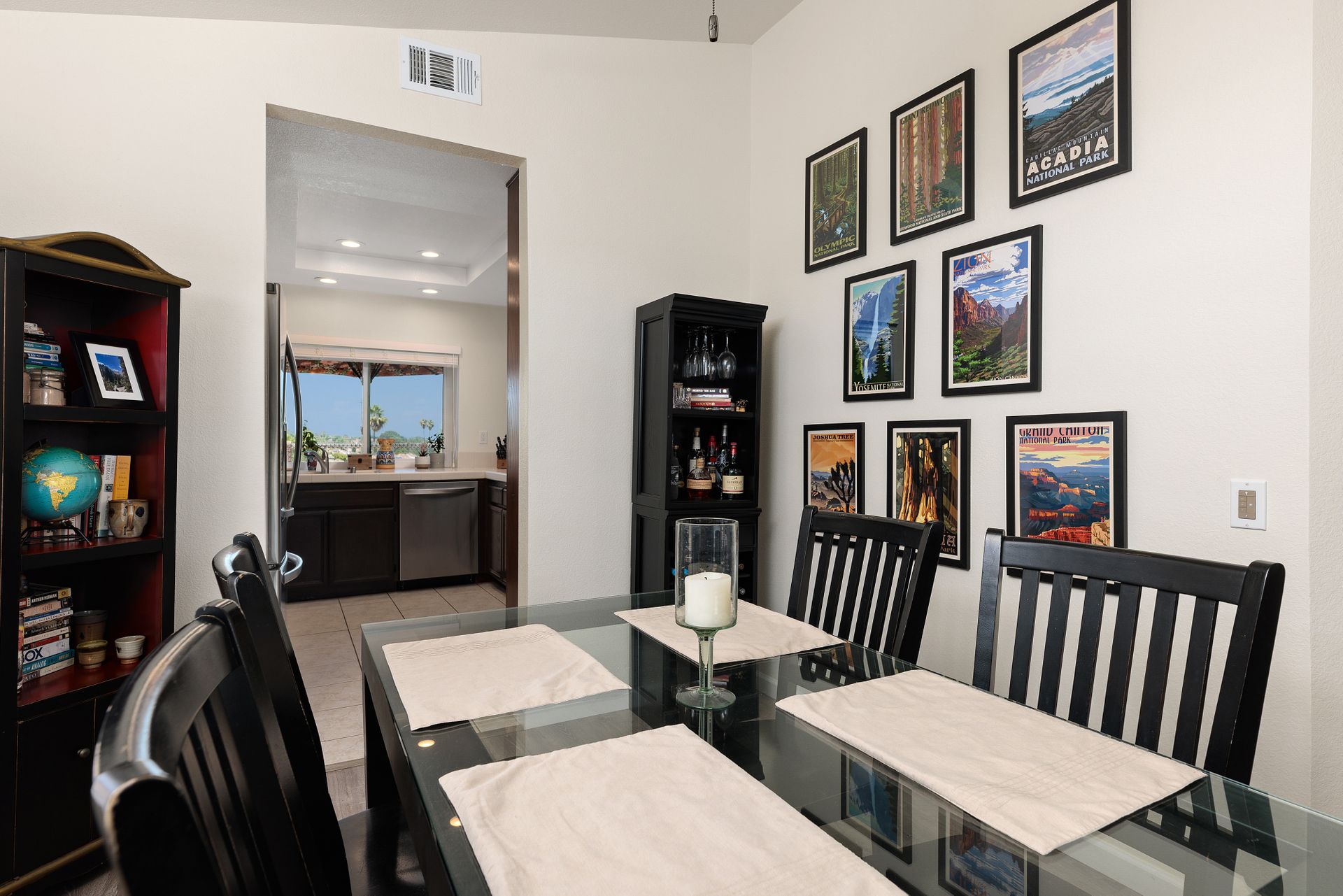 Welcome to this charming single-level three bedroom VIEW home that epitomizes low-maintenance living and modern comfort with a freshly painted interior and exterior. Enjoy the thoughtfully designed front yard with drought-resistant landscaping and an inviting courtyard patio that warmly welcomes you into the residence. As you head inside, you'll immediately notice the exquisite newer luxury vinyl plank flooring that flows seamlessly throughout, complemented by vaulted ceilings, baseboards and energy efficient windows, and newer blinds creating a light and spacious atmosphere. The living space features formal living and dining areas, providing the ideal backdrop for gatherings and special occasions. The heart of the home is the bright kitchen, complete with stainless steel appliances, which effortlessly connects through the breakfast bar to the family room. From here, you can go outside to the grassy backyard with a patio area where you can unwind and soak in the captivating city and mountain views. The primary bedroom is a serene retreat, capturing the enchanting vistas! The attached two-car garage provides ample storage. Equipped with owned solar panels and air conditioning, this home embraces sustainable living without compromising on comfort. Situated in a desirable location, this home offers easy access to the Shadowridge Golf Club, shopping centers, restaurants and schools, making it a great blend of convenience and tranquility. With low HOA fees, this property presents an incredible opportunity to embrace a comfortable and vibrant lifestyle. Don't miss the chance to make this home your own and enjoy the seamless blend of modern living and captivating outdoor views.