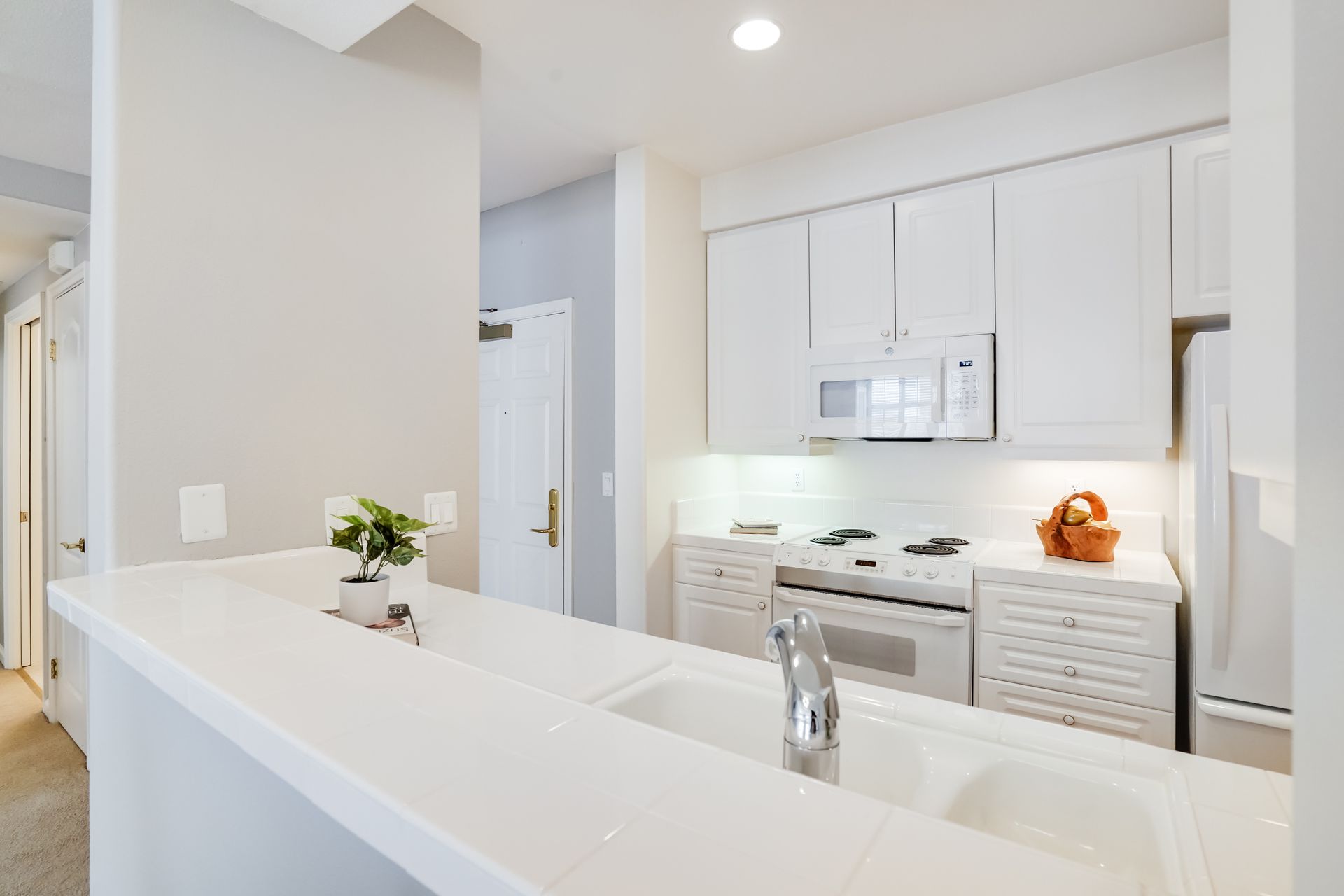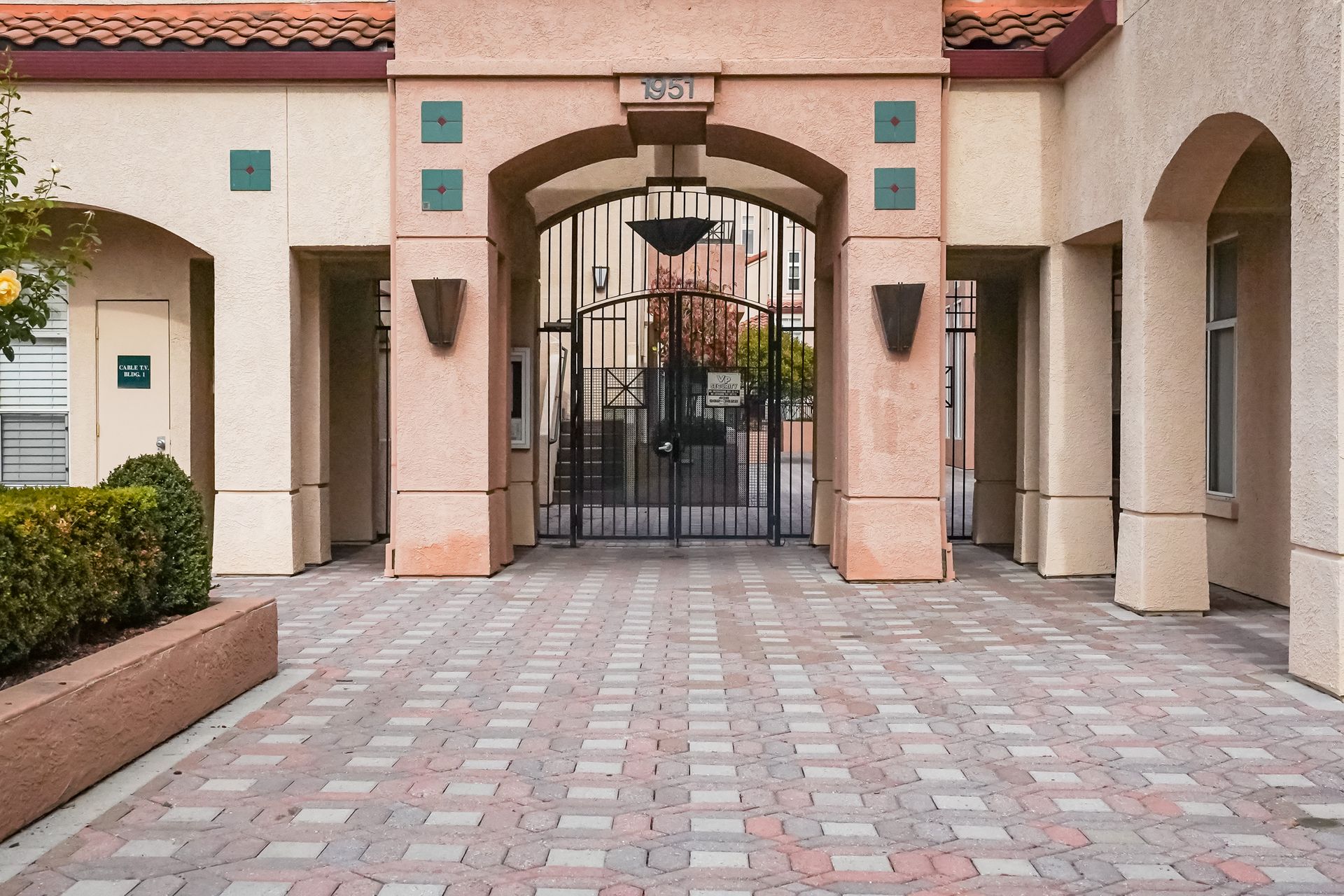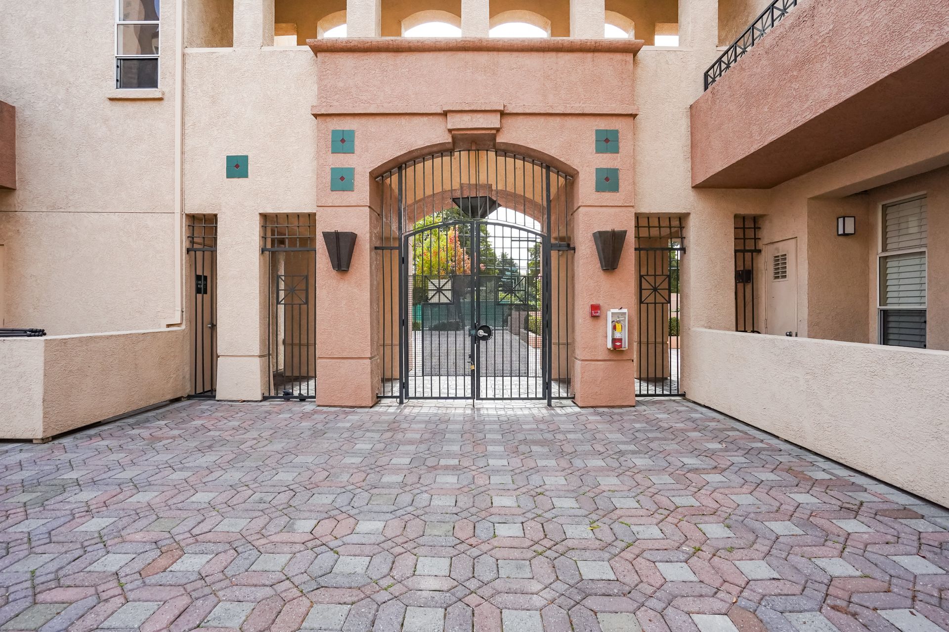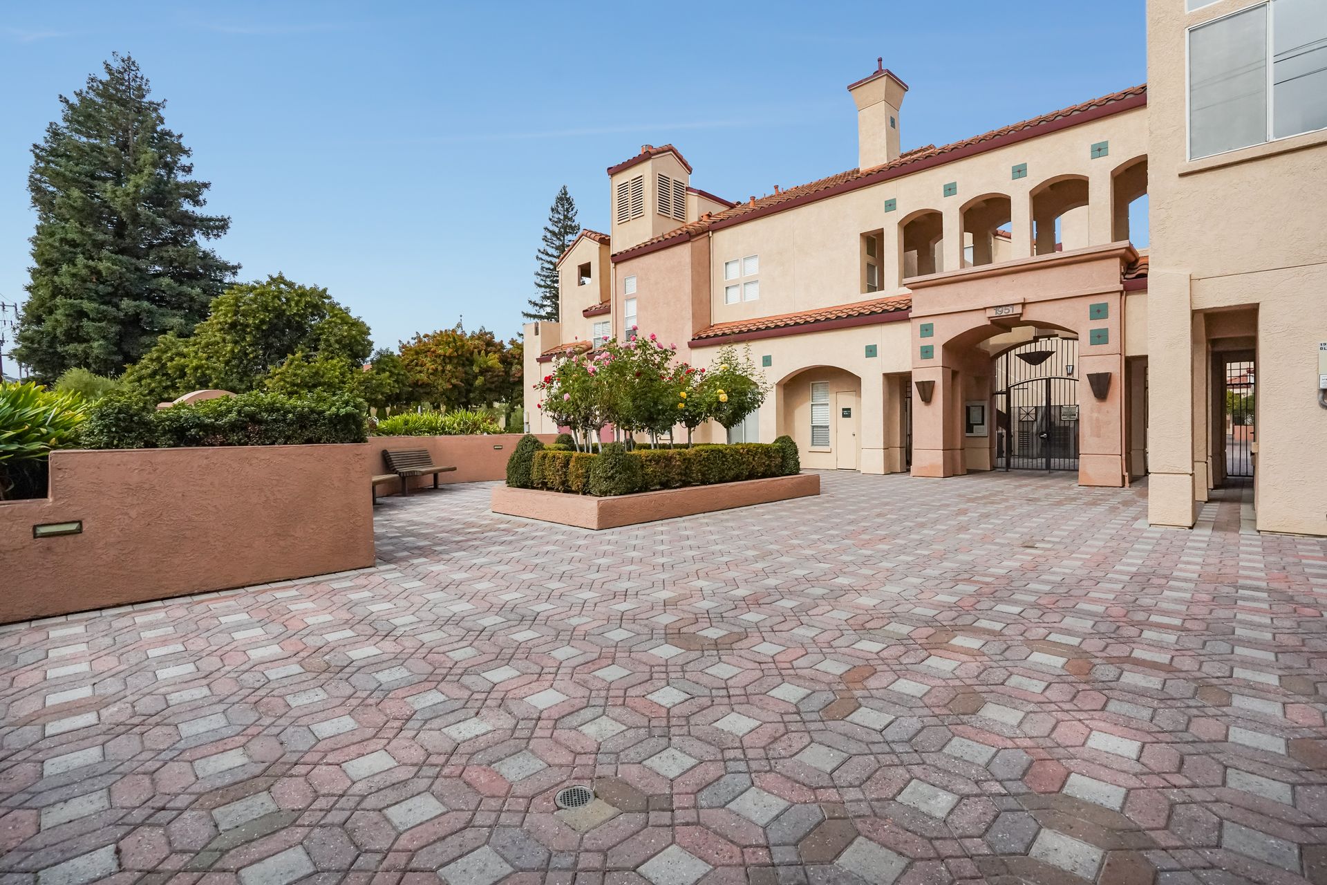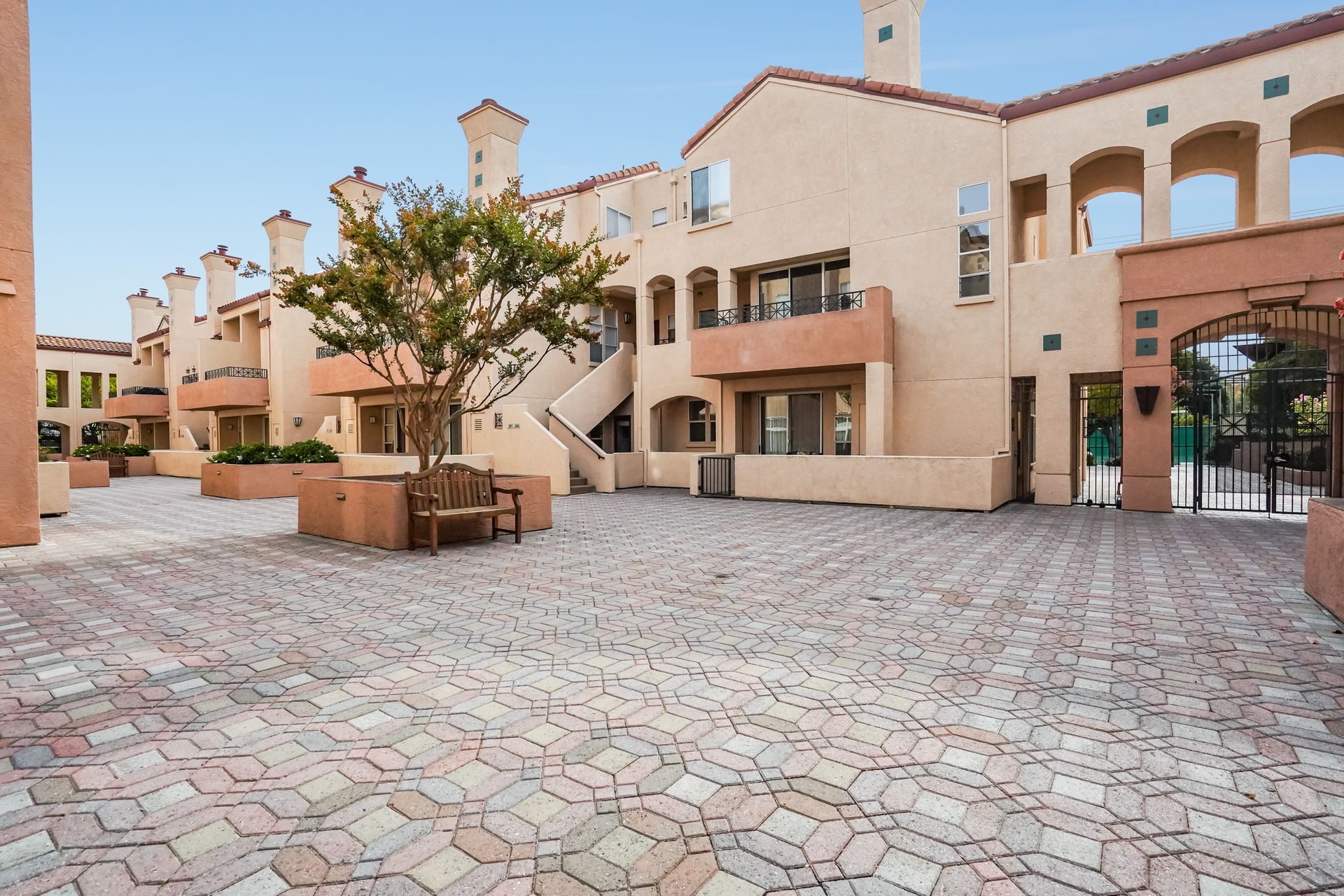 This quintessential sophisticated showstopper is a chic decorator showcase located in the Corte Bella Spanish Mediterranean secured complex. It is complimented by dove gray interior paint, gorgeous plantation shutters and Navajo white carpeting. The state-of-the-art gleaming white galley kitchen will delight any chef. Past the wood-burning fireplace with a stunning mantle is access to a patio, ideal for that morning cup of coffee. Relax in your primary suite with a large walk-in closet and luxury bath, highlighting this highly desirable unit. The second bedroom can dual as an office, the hallway is lined by a laundry closet with a full size washer and dryer and there is a second spacious full bath. Don’t miss the two deeded parking spaces in the common garage.