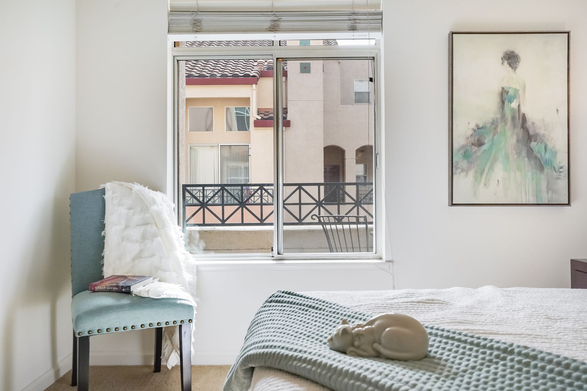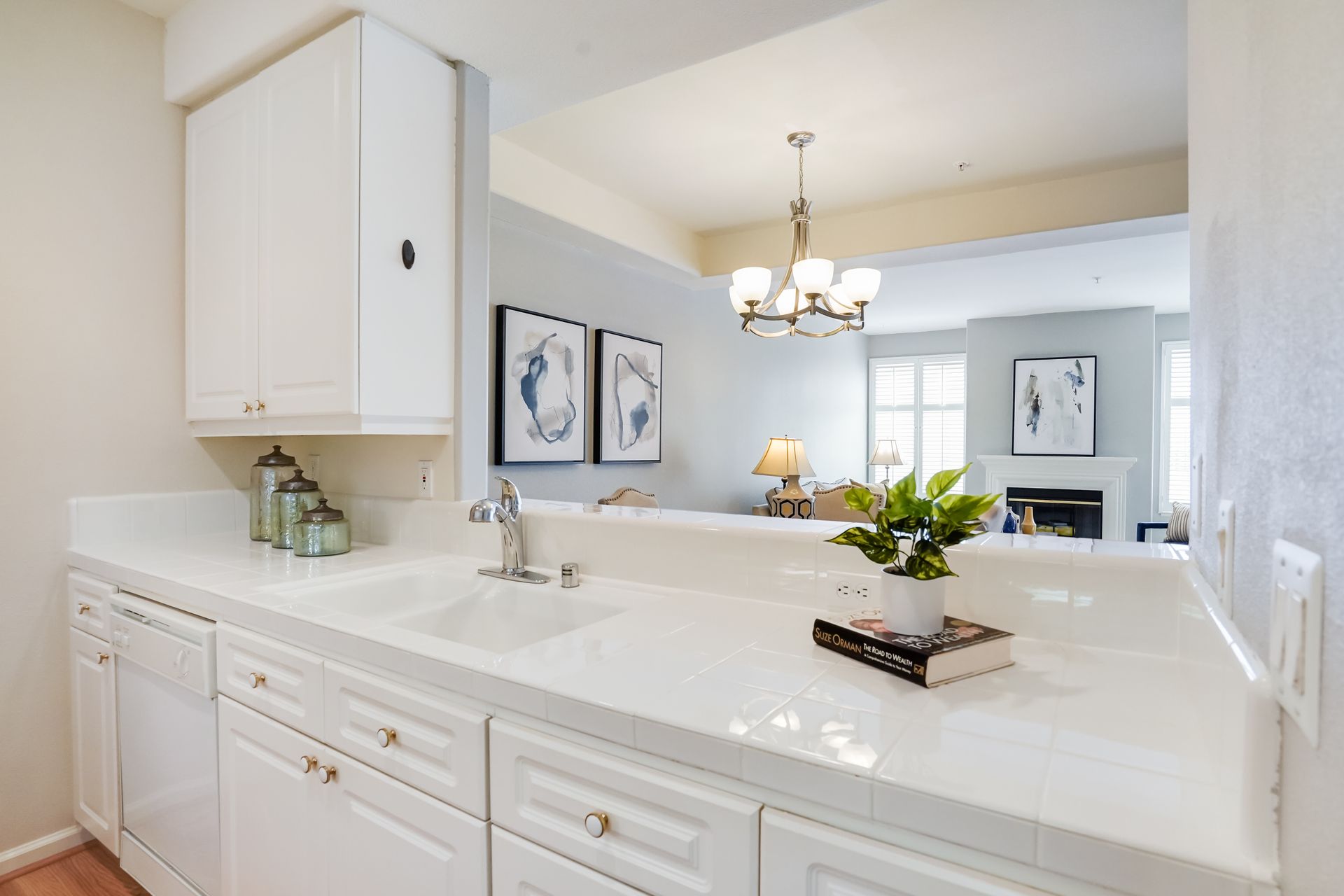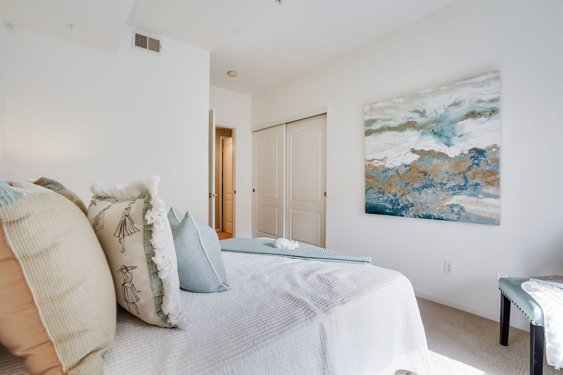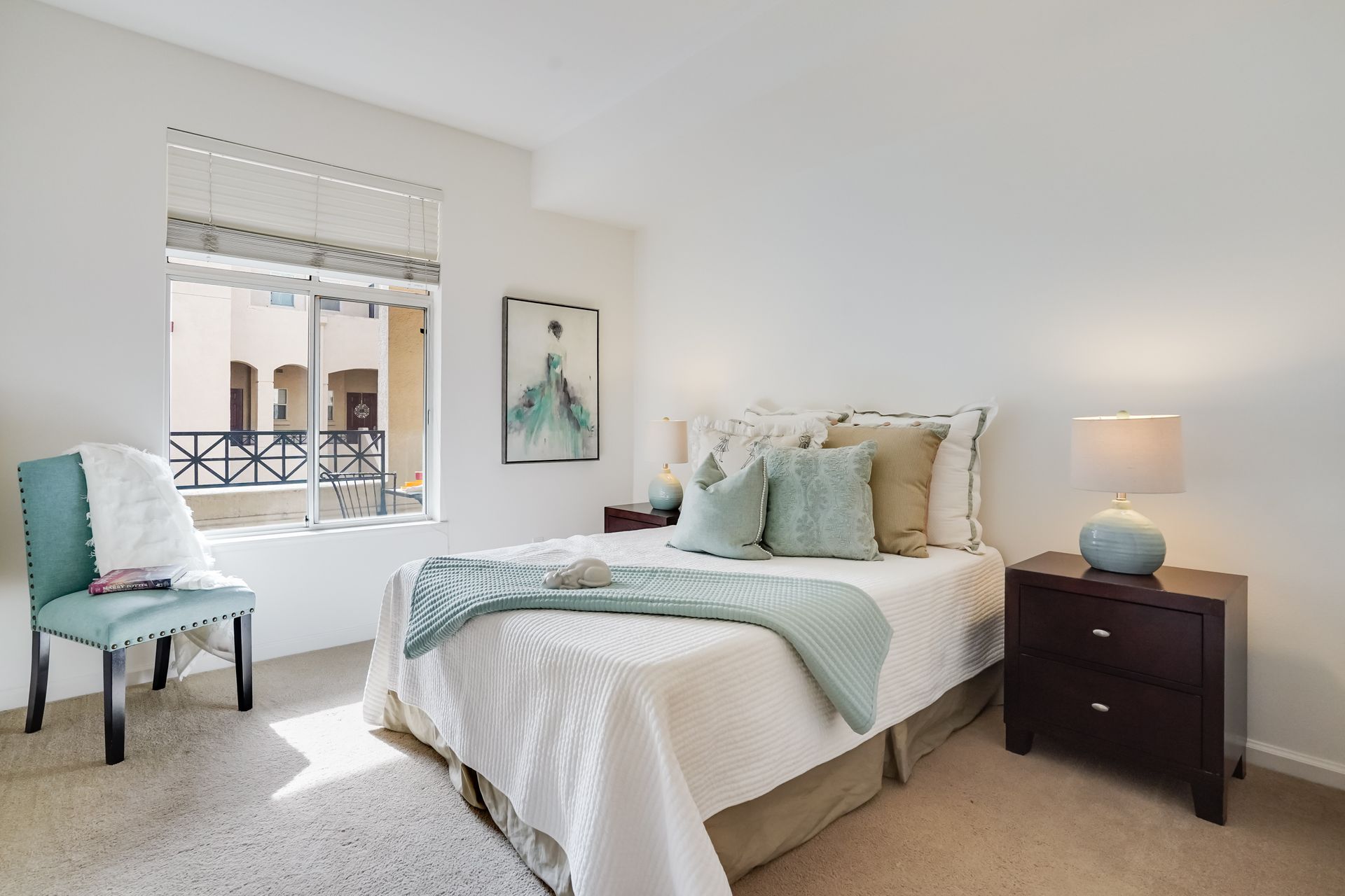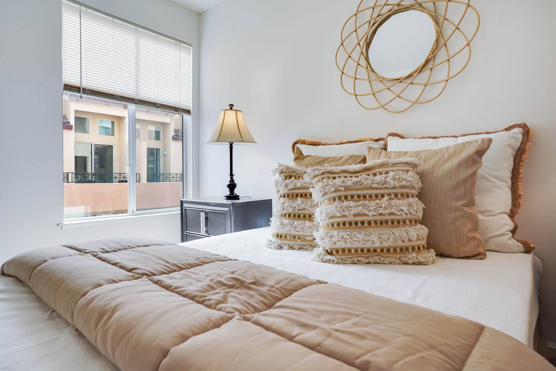 This quintessential sophisticated showstopper is a chic decorator showcase located in the Corte Bella Spanish Mediterranean secured complex. It is complimented by dove gray interior paint, gorgeous plantation shutters and Navajo white carpeting. The state-of-the-art gleaming white galley kitchen will delight any chef. Past the wood-burning fireplace with a stunning mantle is access to a patio, ideal for that morning cup of coffee. Relax in your primary suite with a large walk-in closet and luxury bath, highlighting this highly desirable unit. The second bedroom can dual as an office, the hallway is lined by a laundry closet with a full size washer and dryer and there is a second spacious full bath. Don’t miss the two deeded parking spaces in the common garage.