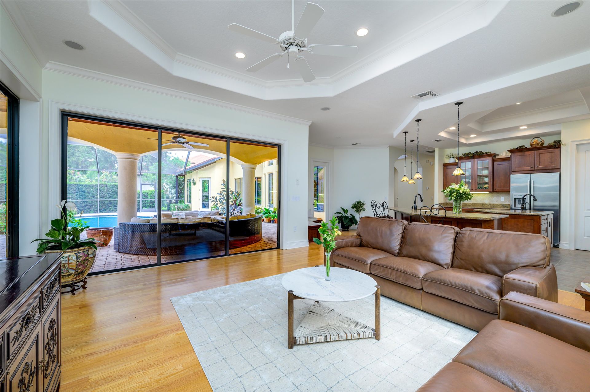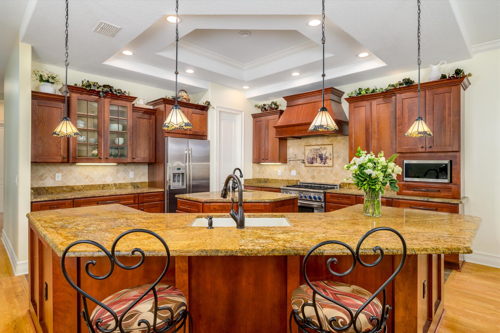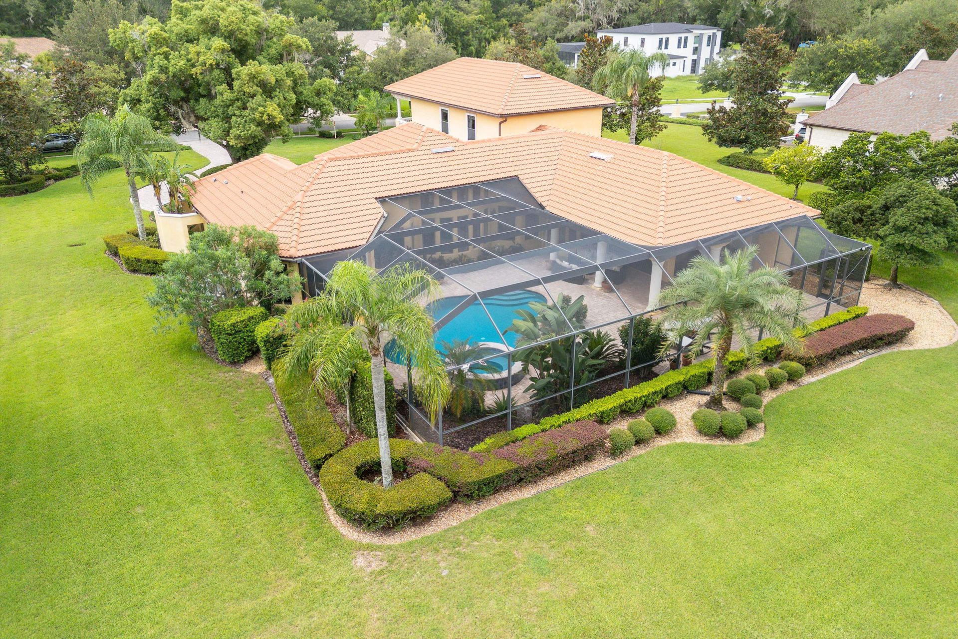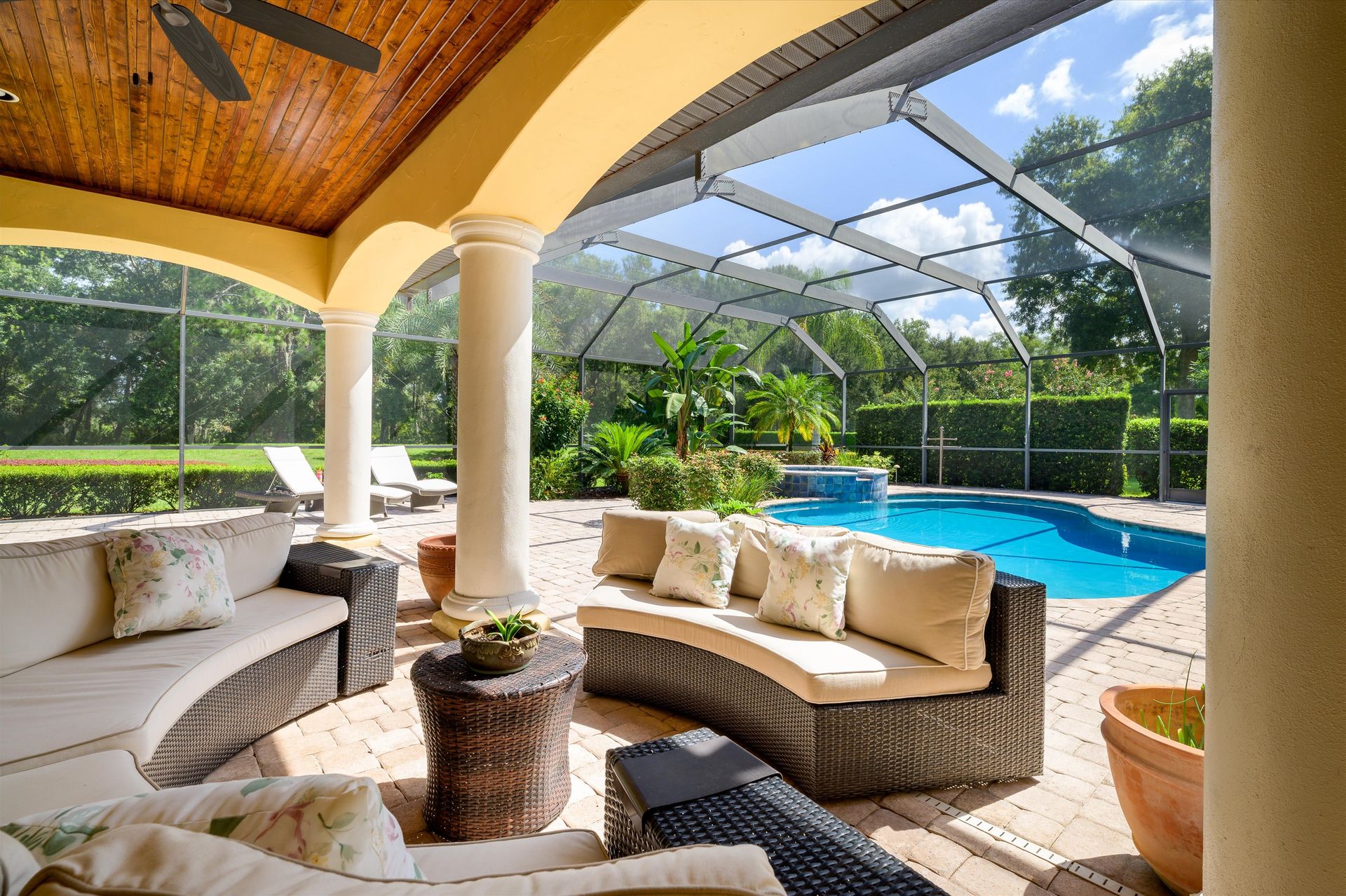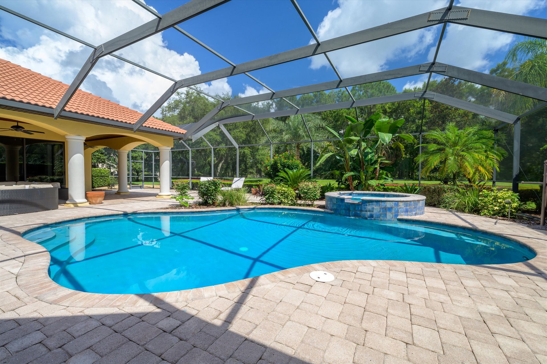 The home's standout feature is the palatial lanai, which includes a sparkling pool and invigorating hot tub, providing the perfect backdrop for outdoor relaxation and entertainment. The primary bedroom is located on the main floor and offers an abundance of space, allowing for a comfortable and private retreat.