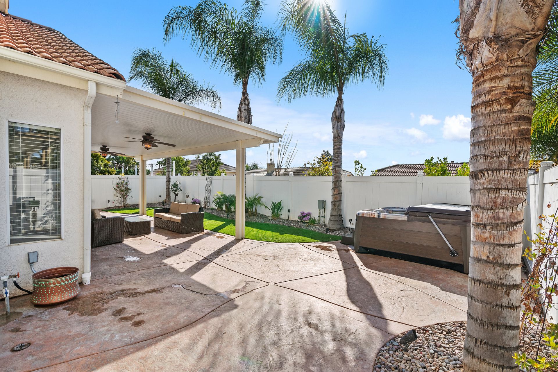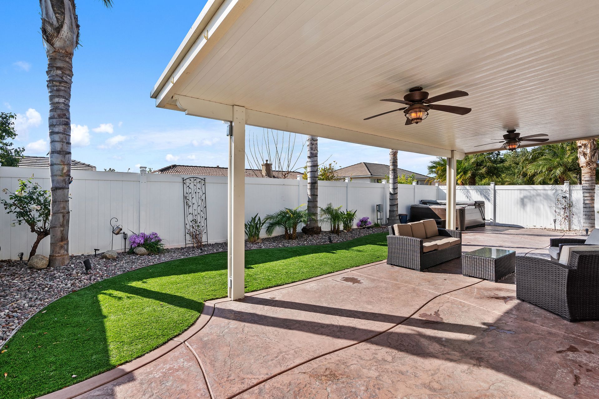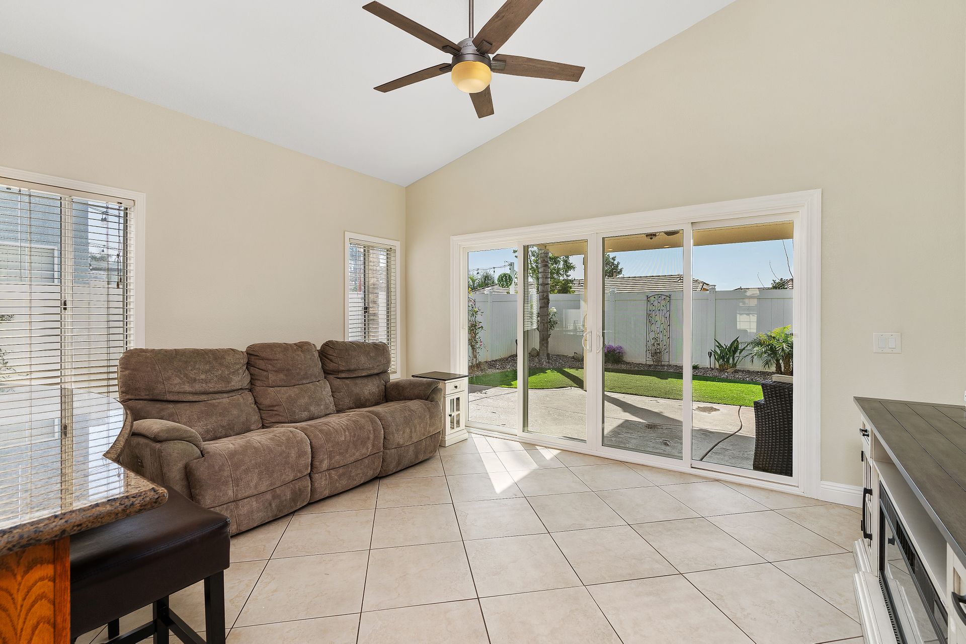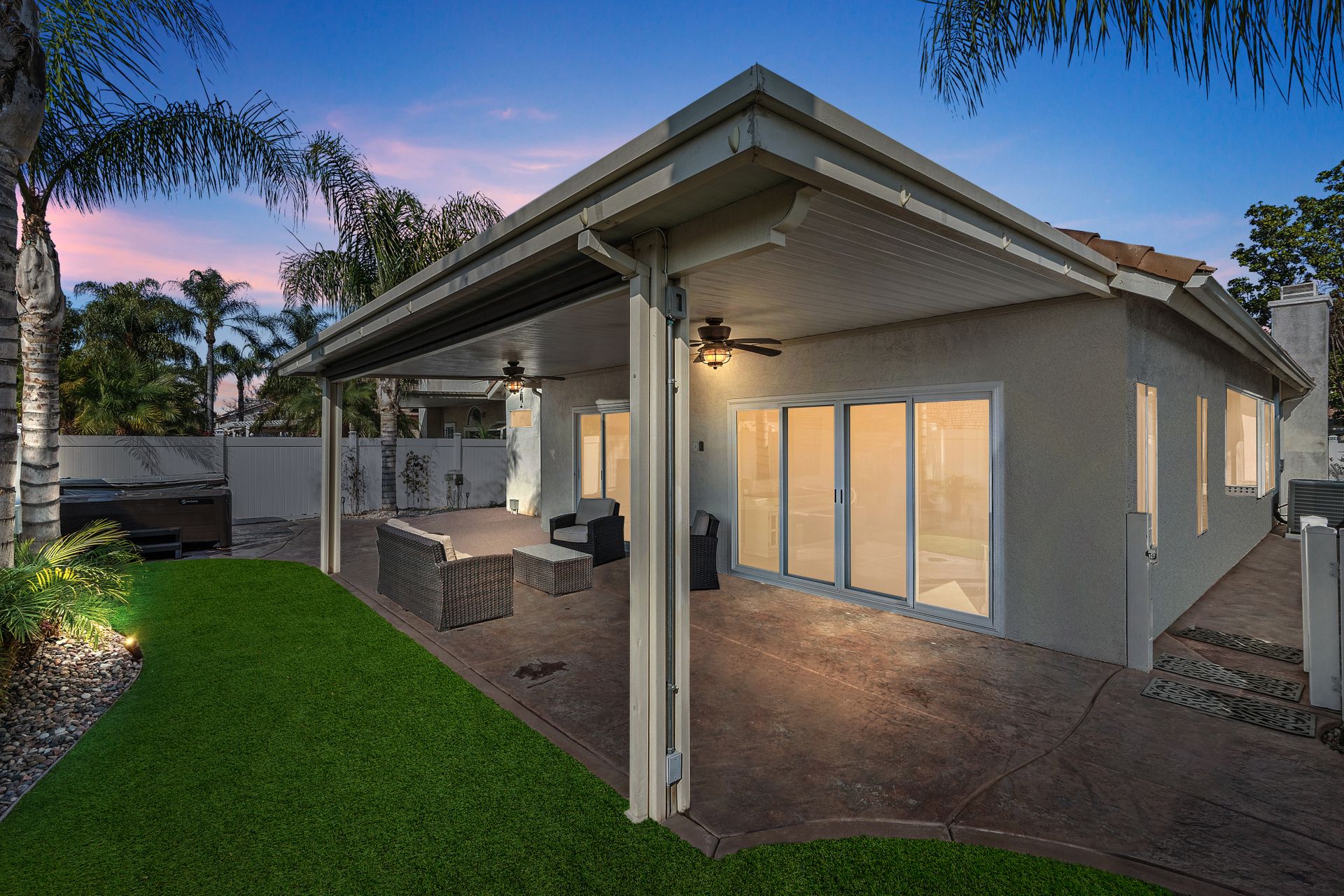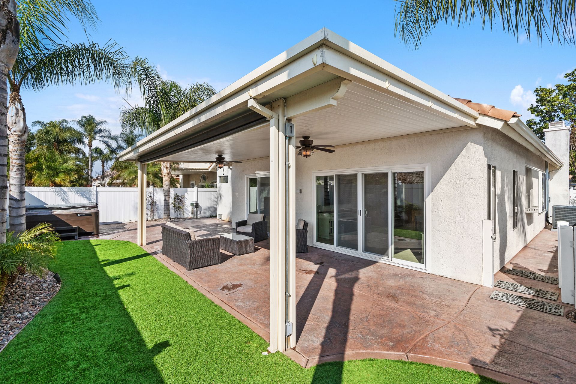 Turnkey Single-Story Home in Orangecrest. This beautifully updated home in the desirable Orangecrest neighborhood offers comfort and style with modern features throughout. Step into a spacious formal living room with abundant natural light and a cozy fireplace, complemented by vaulted ceilings. The adjoining dining area creates an inviting space for family meals or entertaining guests. The recently remodeled hall bathroom adds a touch of luxury, and the convenient indoor laundry room ensures easy living. The primary suite is a true retreat, with a newly remodeled bathroom featuring a dual sink vanity with quartz counters, ample storage, and a spa-like walk-in shower. A sliding door off the primary bedroom opens to the serene backyard. Plus, the spacious walk-in closet is perfect for organizing all your essentials. The home has been freshly painted, and new carpet has been installed in all bedrooms. Ceiling fans in every bedroom and the family room provide year-round comfort. Secondary bedrooms are equipped with mirrored closet doors and built-in organizers. The kitchen is designed for functionality, offering plenty of counter space and storage while opening to the family room with vaulted ceilings and oversized sliders that lead to the beautifully landscaped backyard. Enjoy outdoor living with a low-maintenance turf lawn, perfect for entertaining, and an above-ground saltwater jacuzzi with built-in speakers for added enjoyment. The stamped concrete patio is enhanced by a solid Alumawood cover featuring ceiling fans, lights, and rain gutters, along with a remote-controlled sunshade for added comfort. Vinyl fencing with solar lights adds privacy and charm. Located near Orange Terrace Community Park, with easy access to shopping, dining, entertainment and major freeways. This home combines convenience with a tranquil lifestyle.