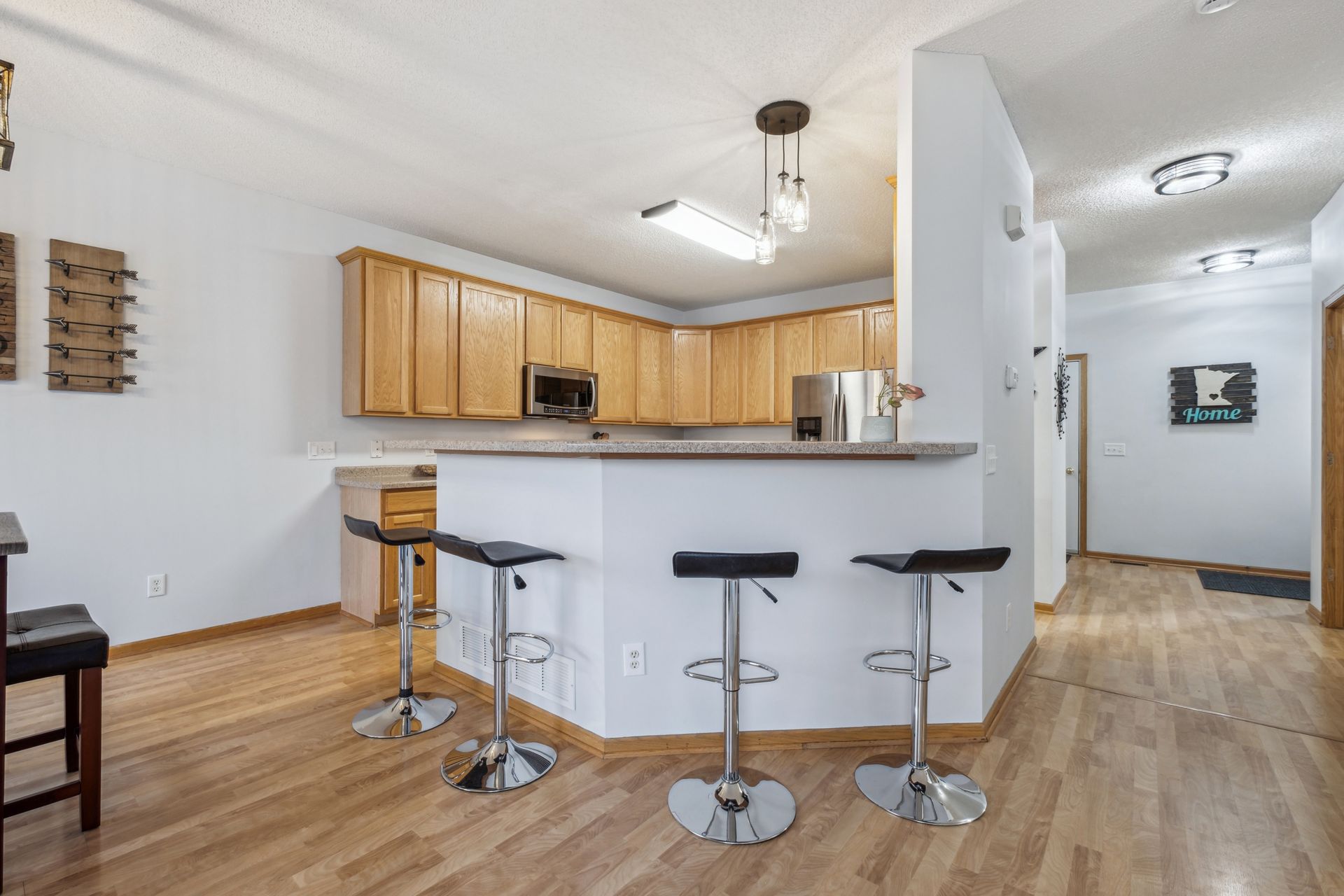 Step inside to a large foyer that welcomes you into an open-concept layout, perfect for entertaining. The living room features a cozy three-sided gas fireplace, seamlessly connecting to the dining and kitchen areas. The kitchen shines with stainless steel appliances, a breakfast bar, and a generous dining space, ideal for gatherings.