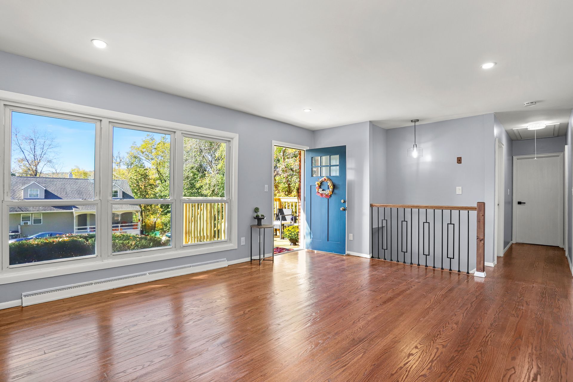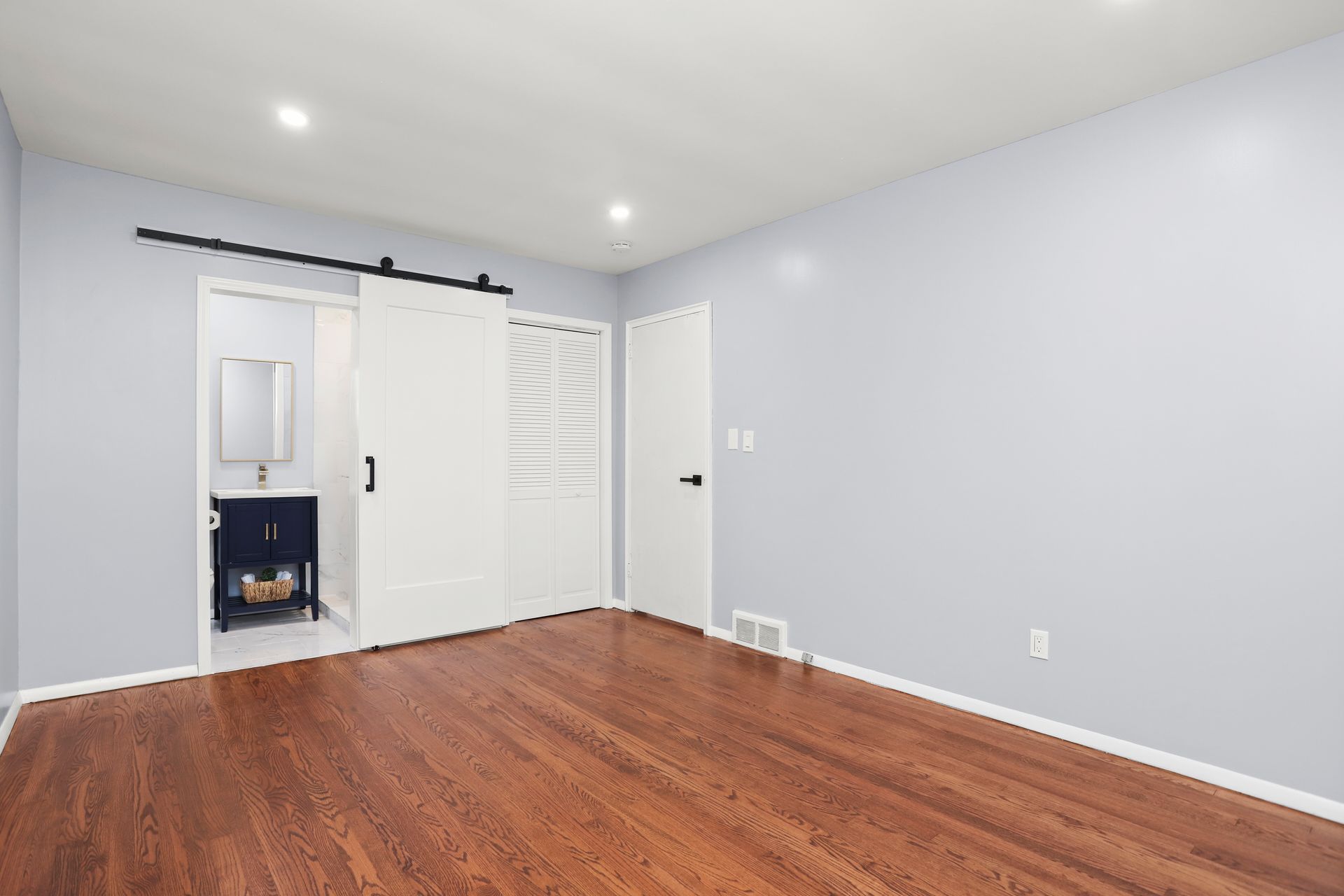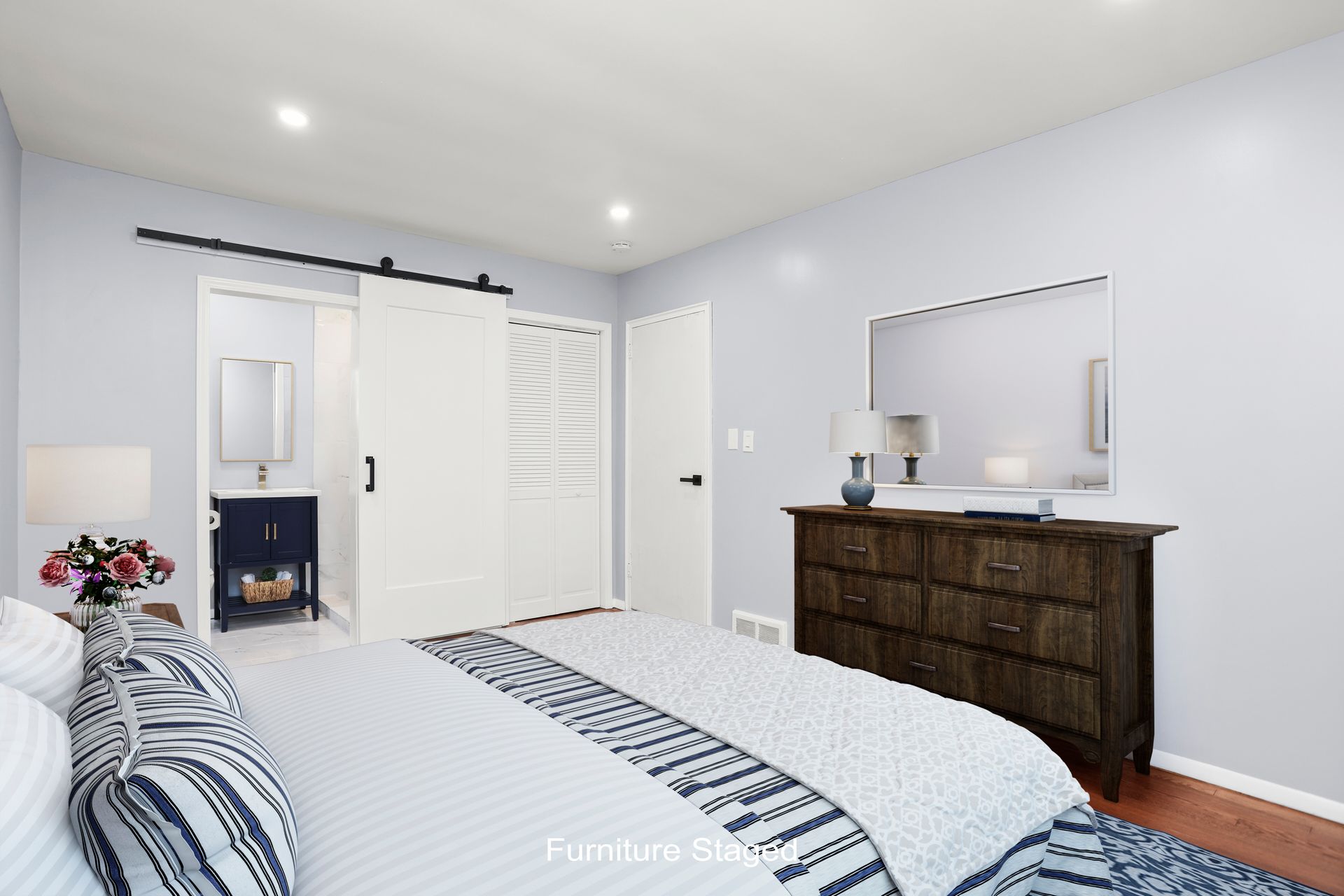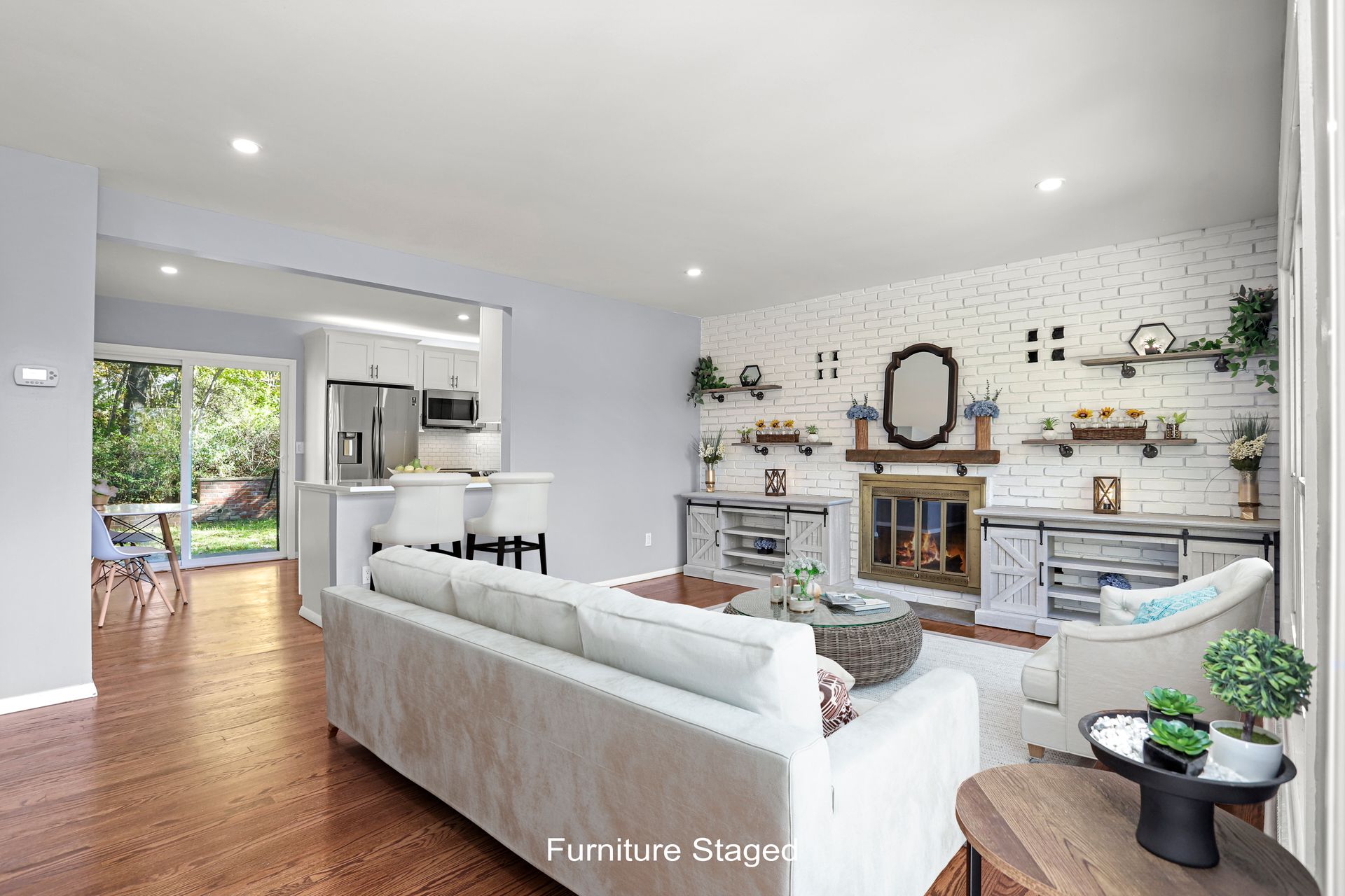 Living room with genuine brick wall, picture window and a fireplace. Primary bedroom boasts a full bath with a barn door. GLEAMING HARDWOOD floors and (new) recessed LED lighting throughout.
