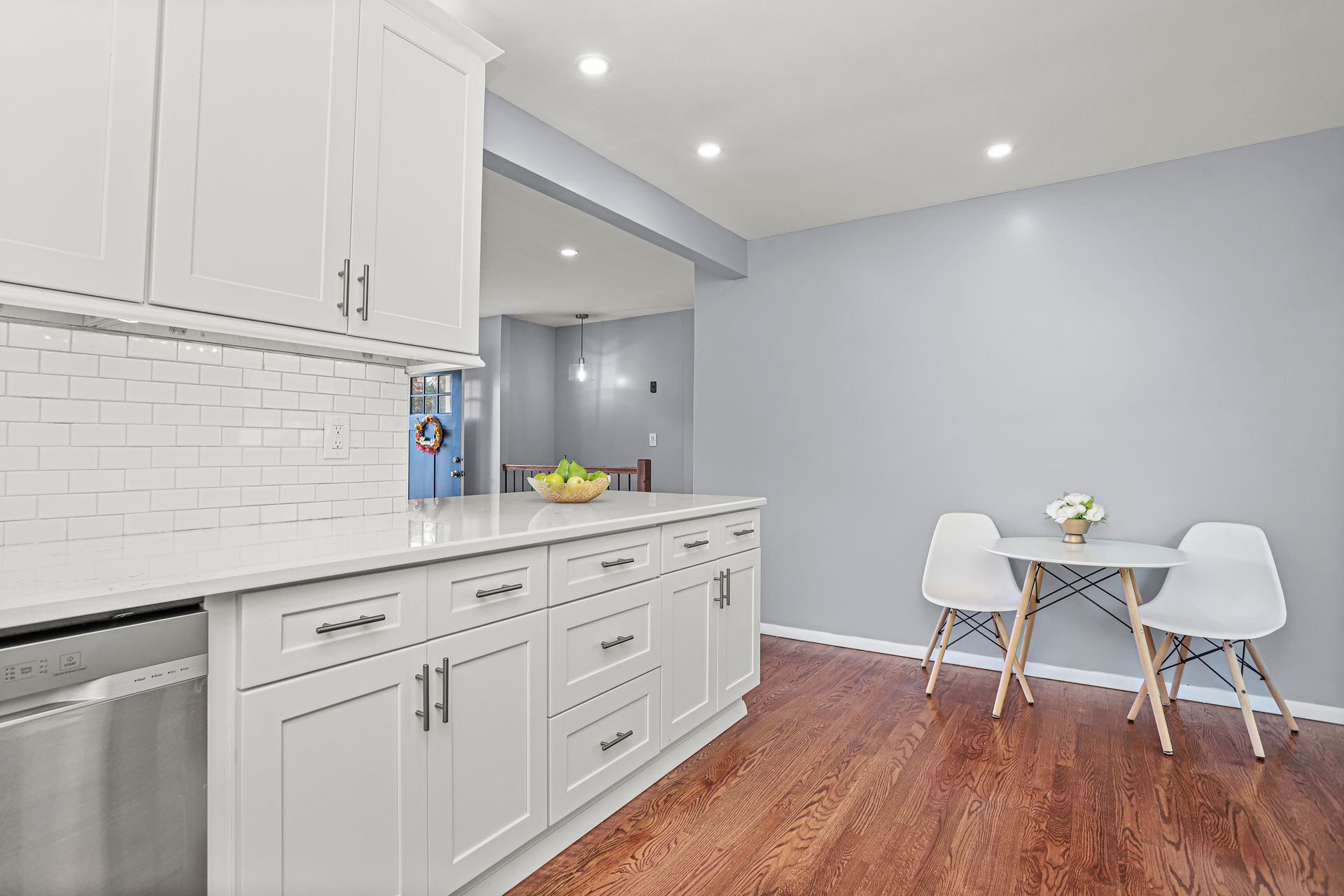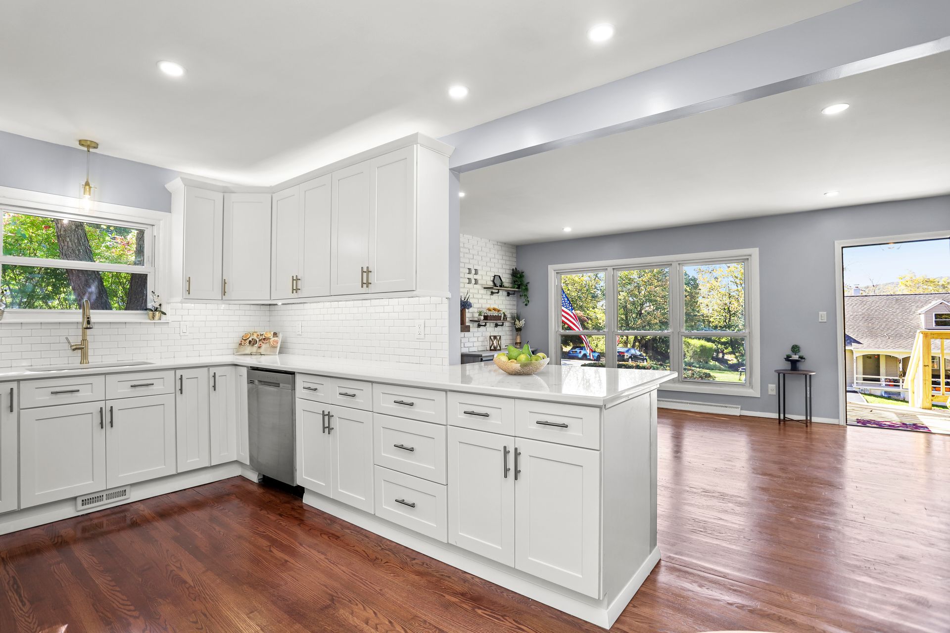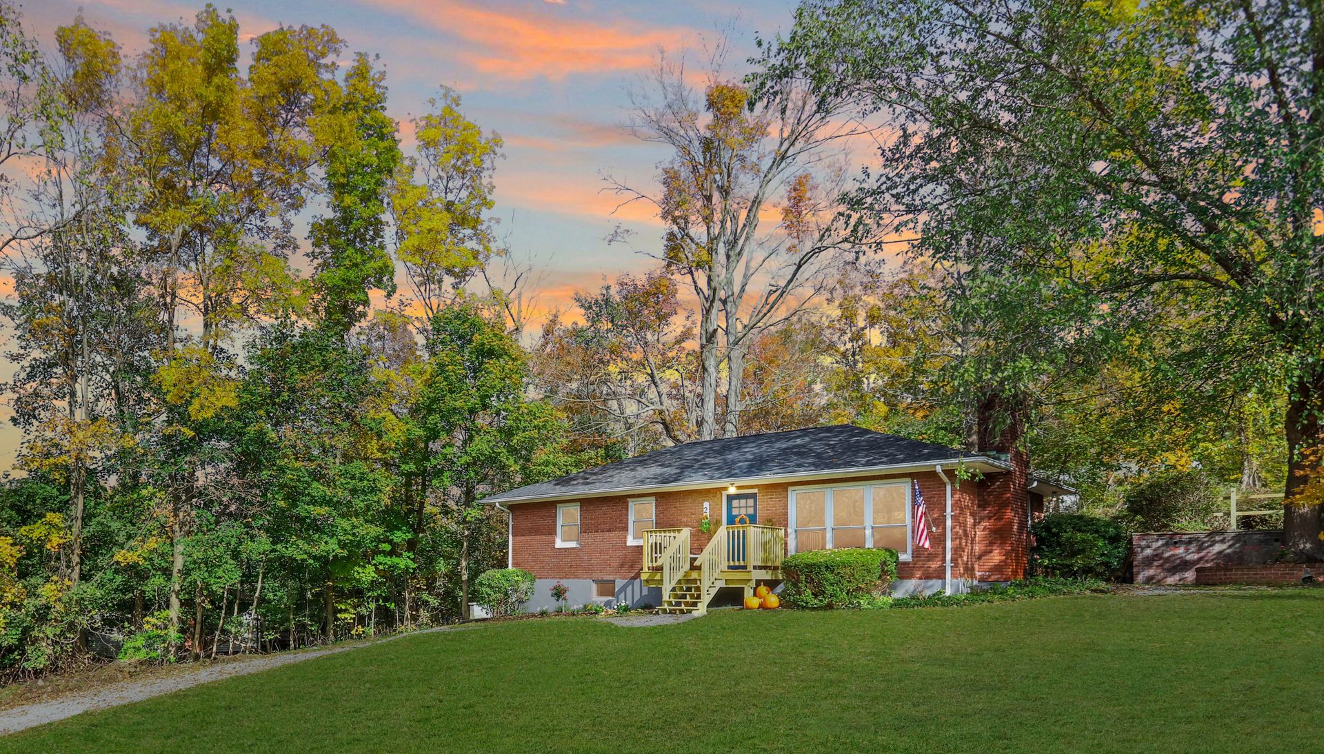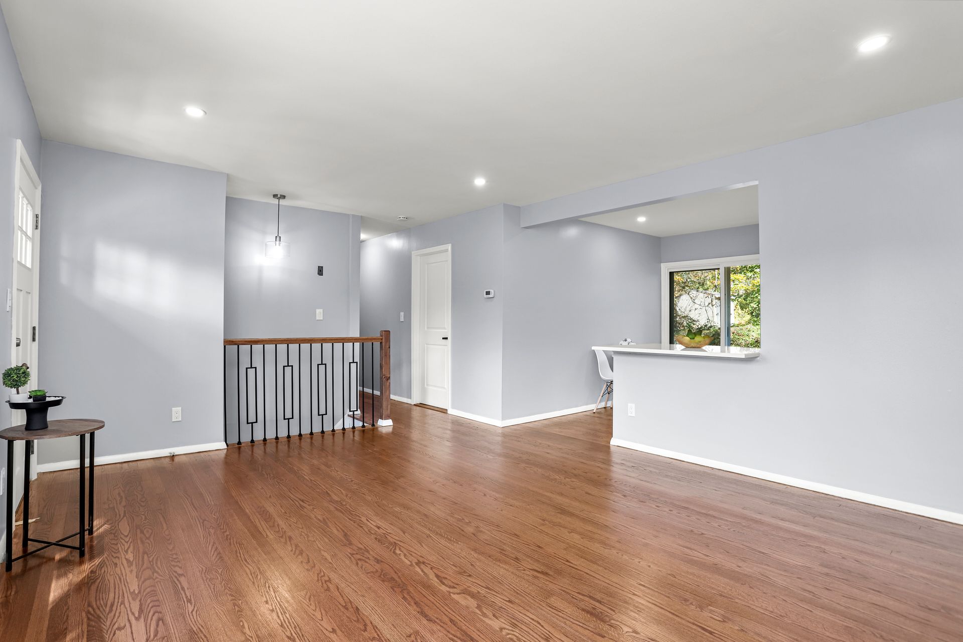 Living room with genuine brick wall, picture window and a fireplace. Primary bedroom boasts a full bath with a barn door. GLEAMING HARDWOOD floors and (new) recessed LED lighting throughout.