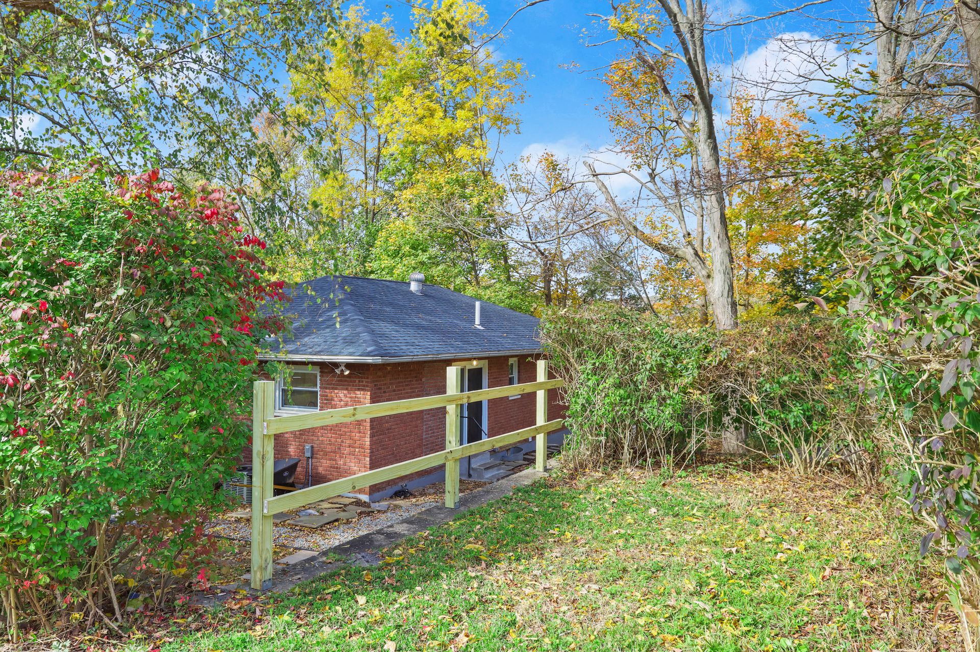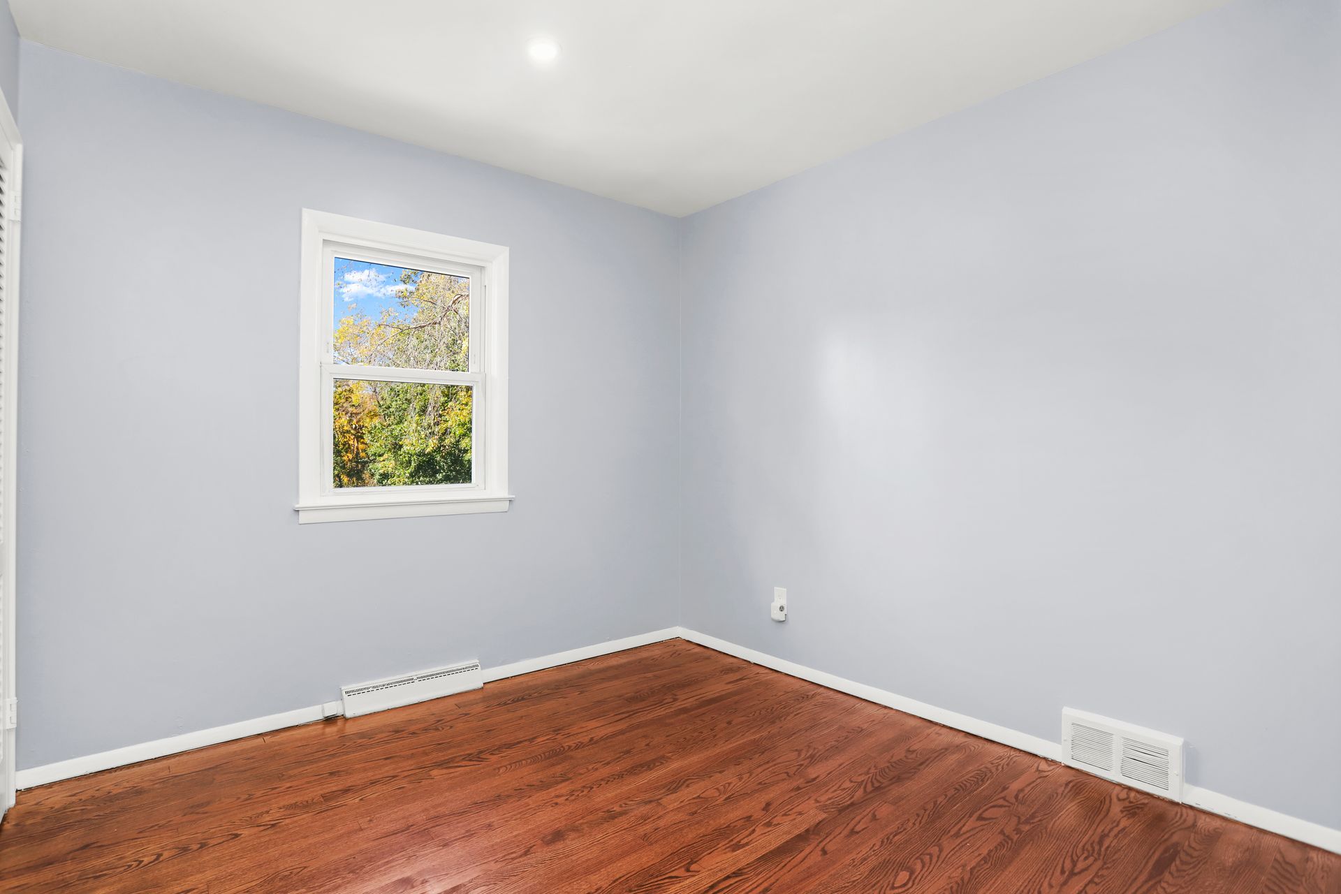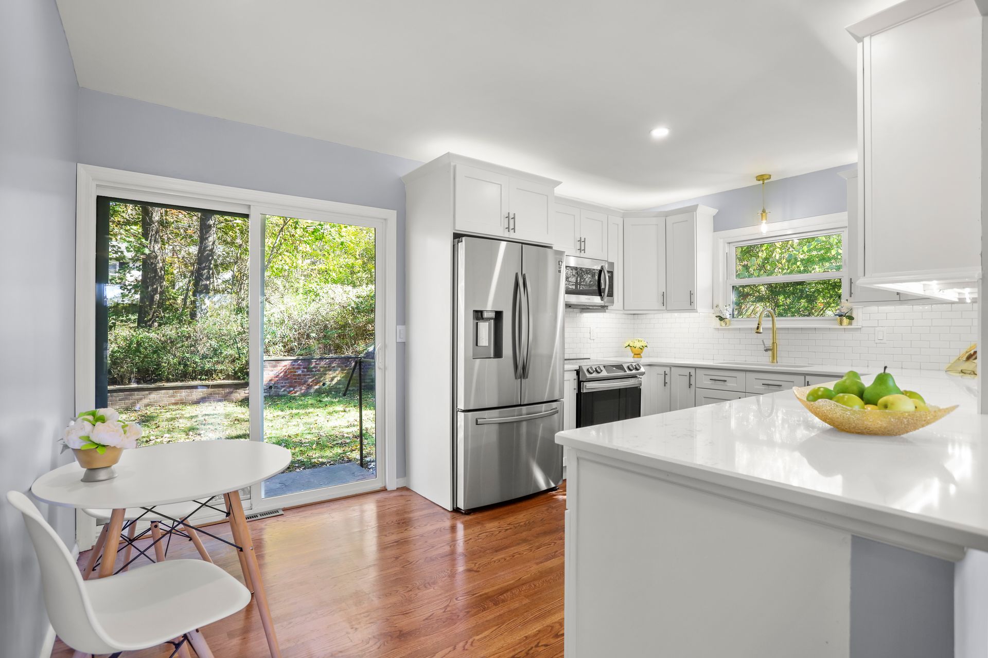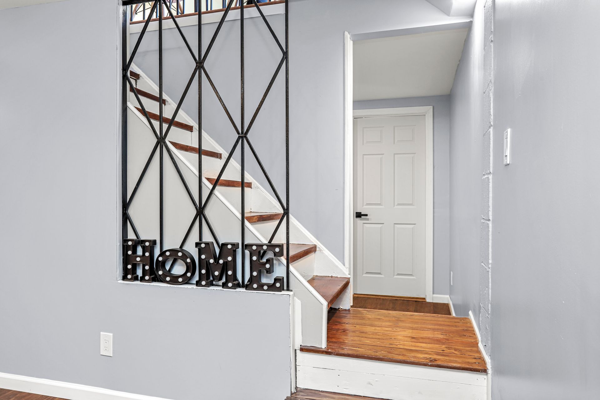 Living room with genuine brick wall, picture window and a fireplace. Primary bedroom boasts a full bath with a barn door. GLEAMING HARDWOOD floors and (new) recessed LED lighting throughout.