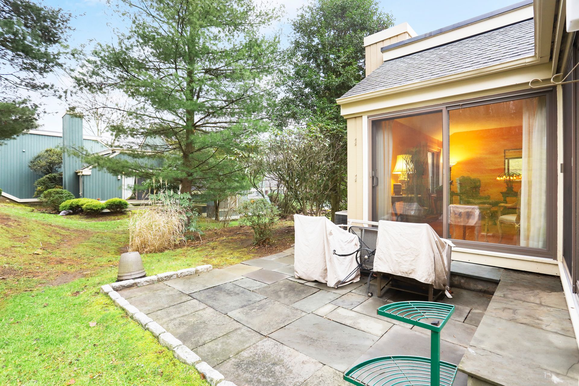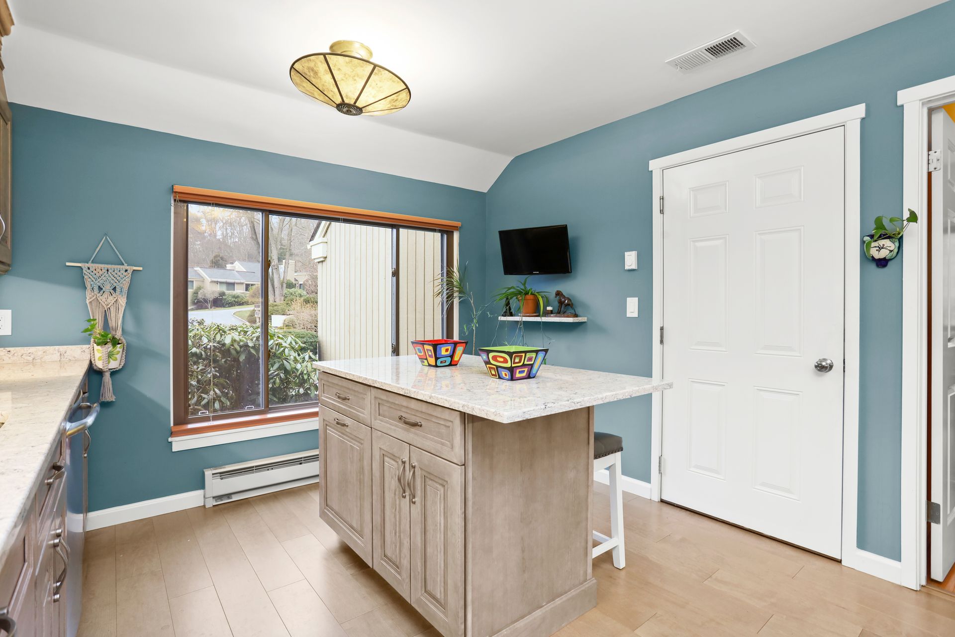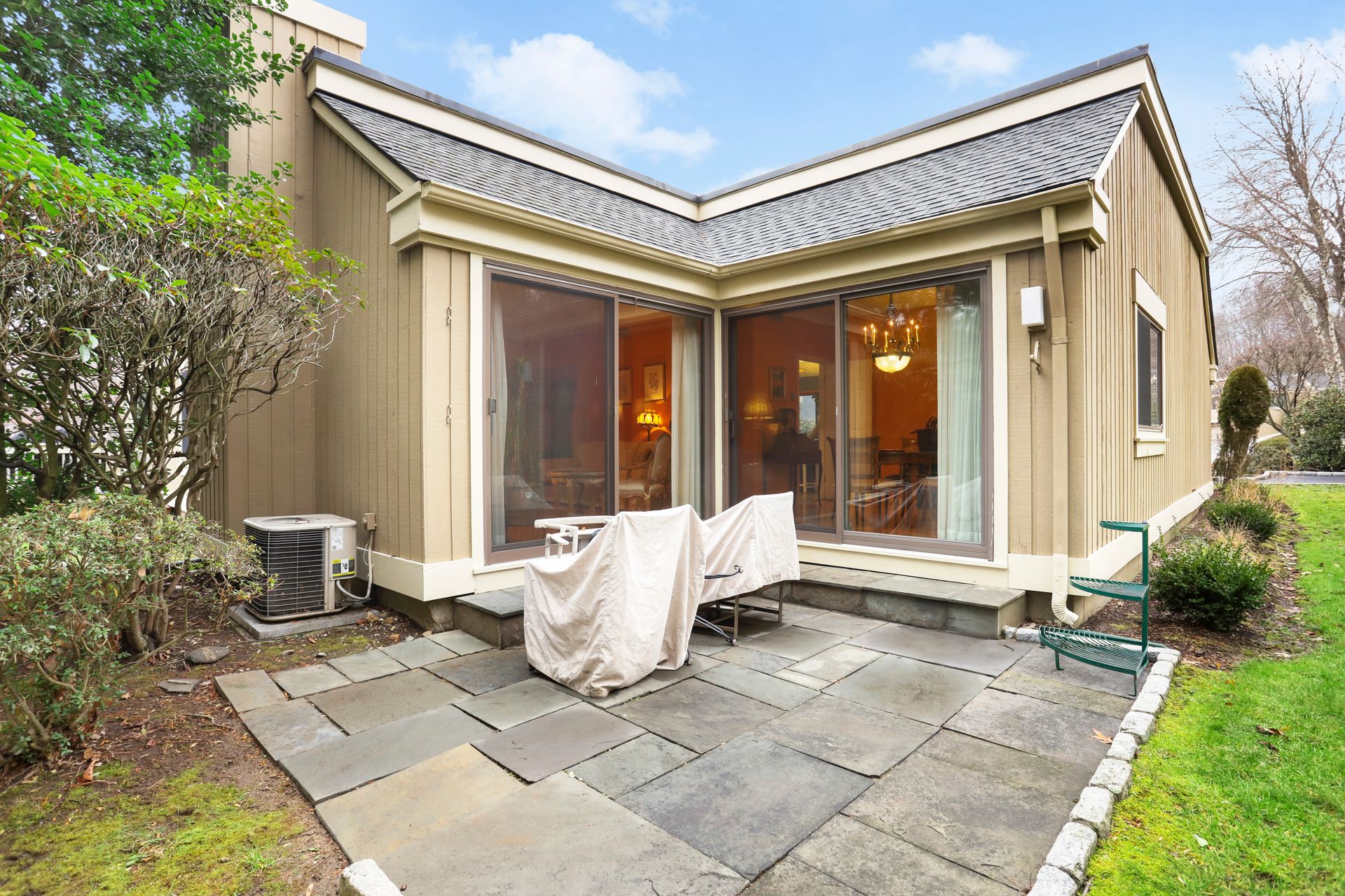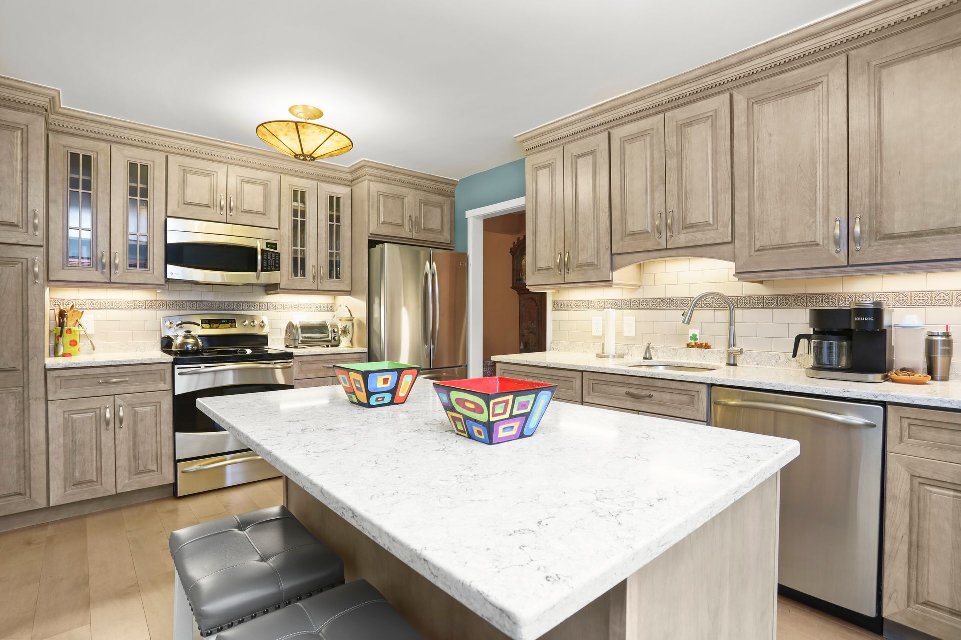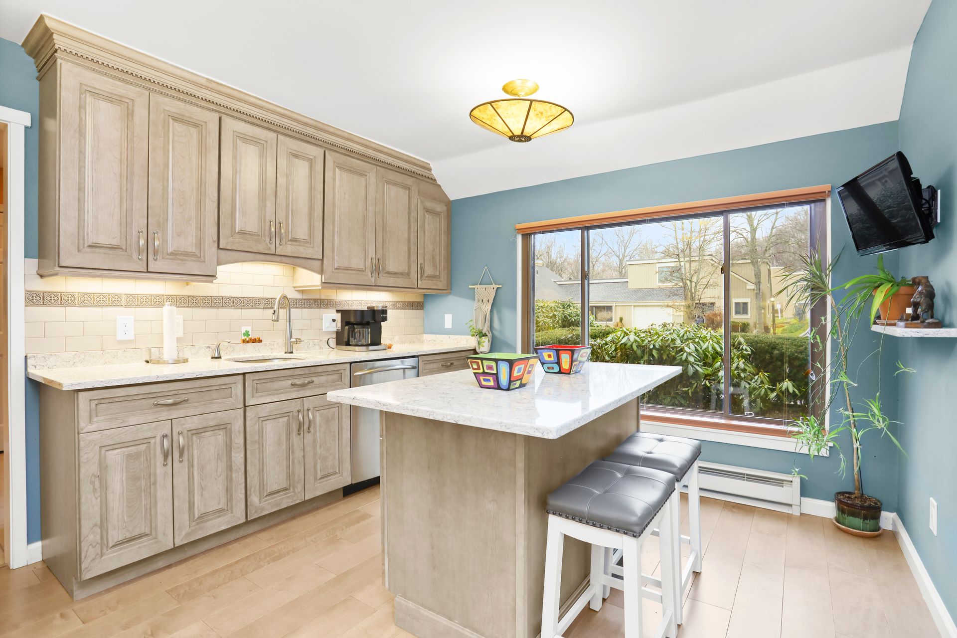 Kitchen Recently renovated with bells and whistles including center island, quartz countertops, backsplash, GE Profile stainless steel appliances, cabinets with glass fronts, pull out shelves and under cabinet lighting. Wood floors throughout. No popcorn ceiling in the primary suite with a full bath. Two sets of Sliding glass doors (from living room and dining room) to flagstone patio with lush greenery. The hall bathroom has oversized shower with frameless glass shower doors, bowl sink, granite vanity top and brushed nickel hardware.