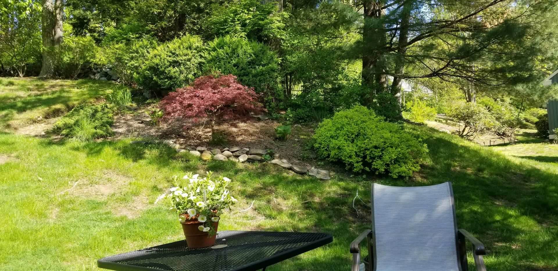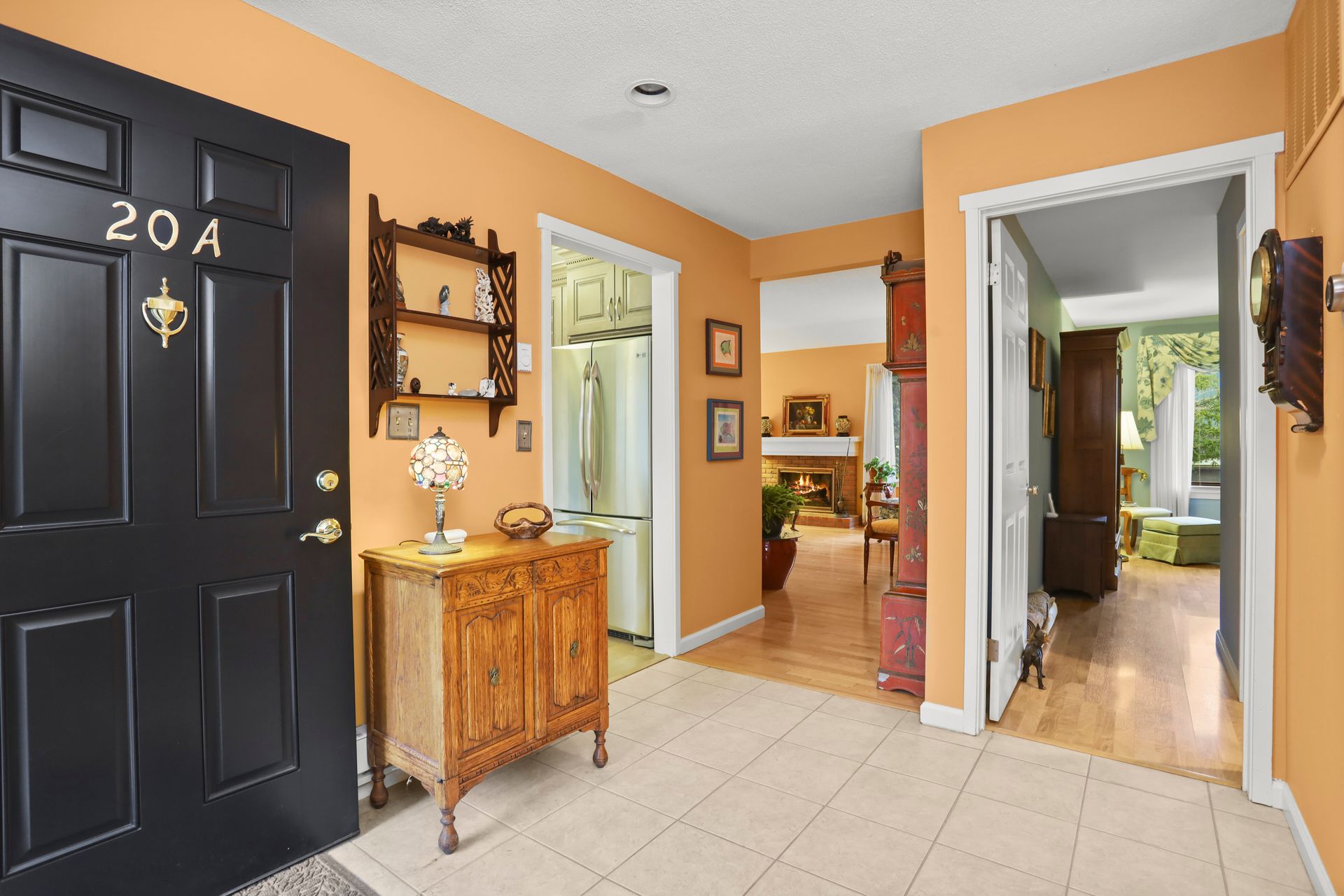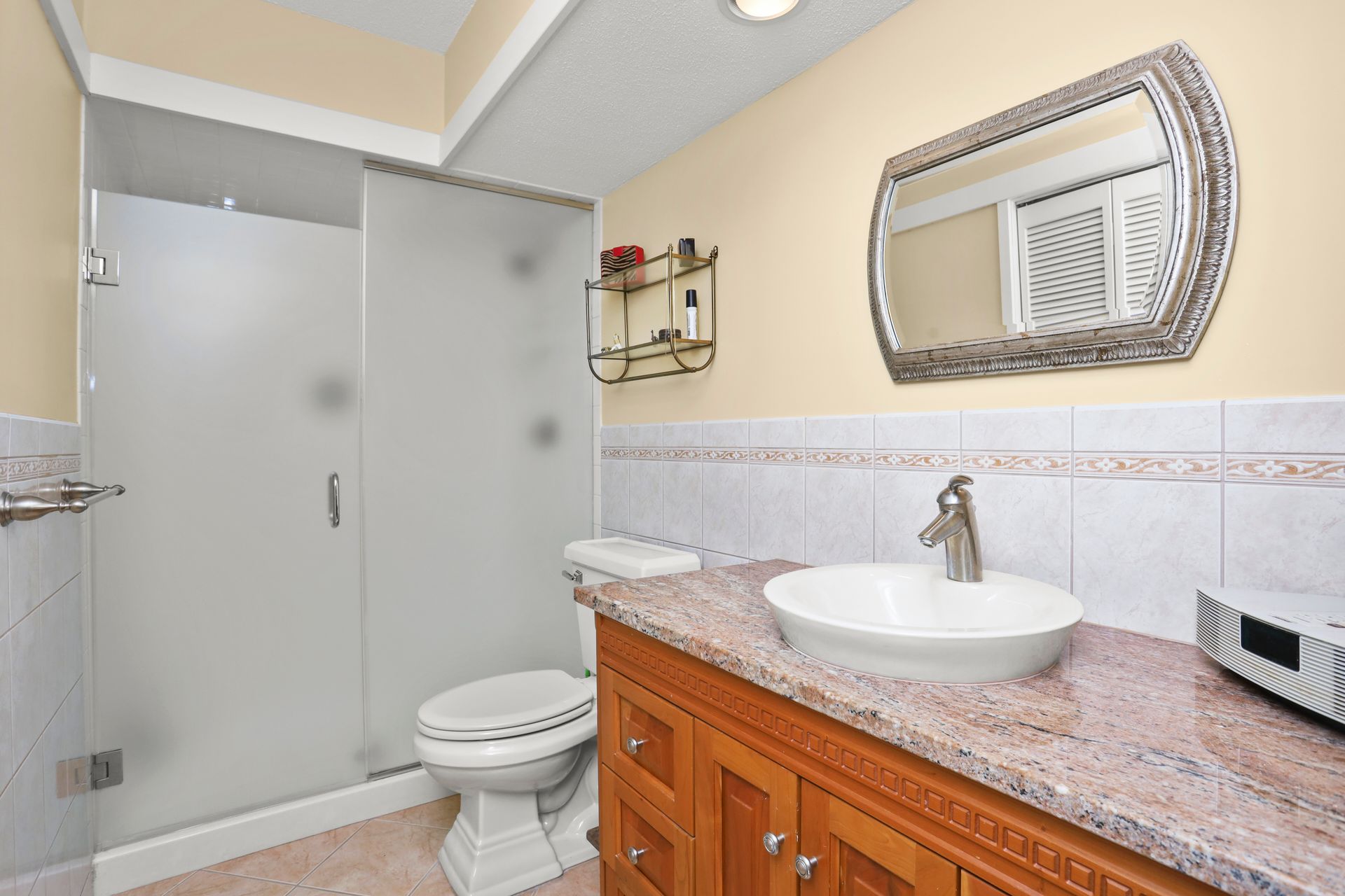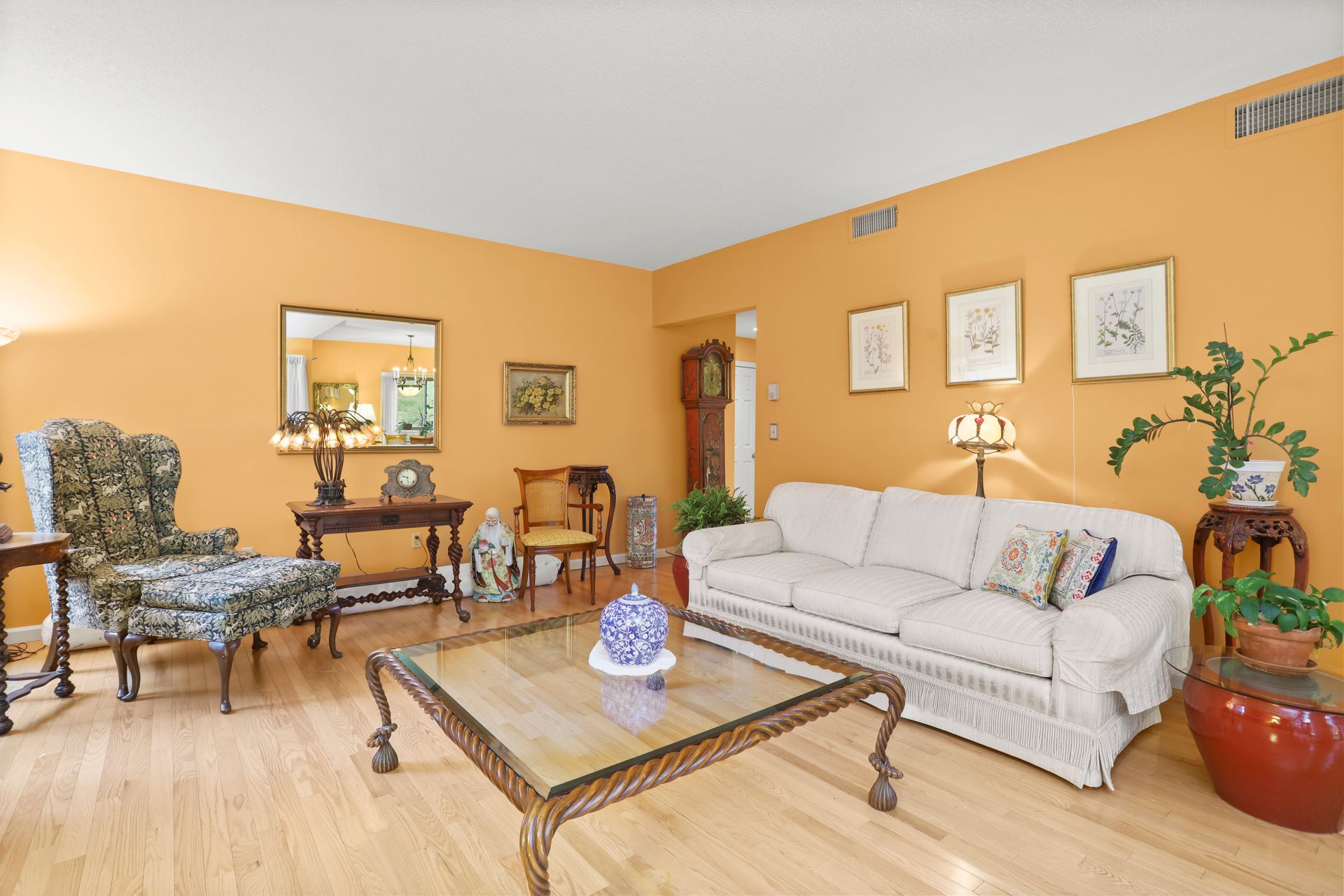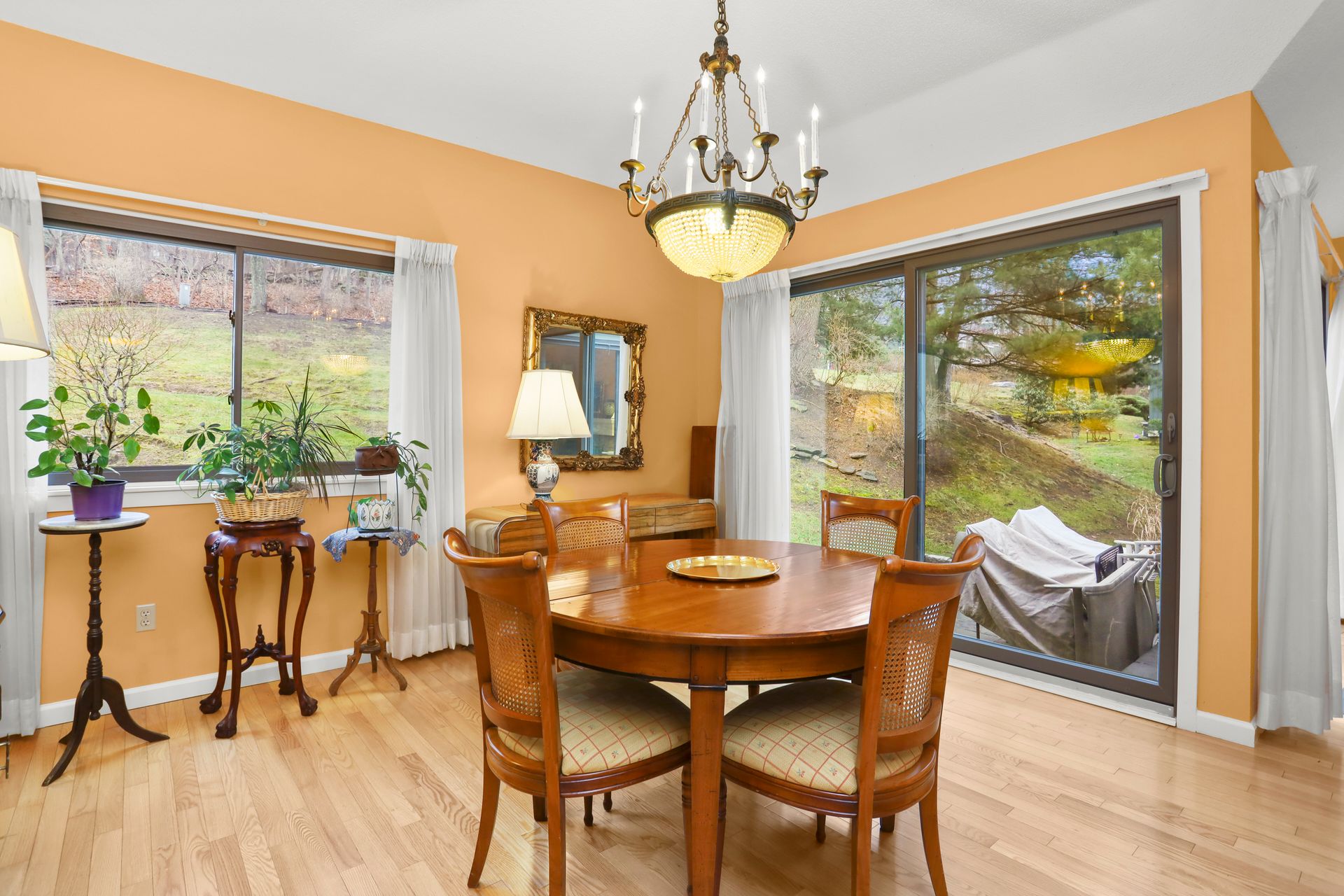 Kitchen Recently renovated with bells and whistles including center island, quartz countertops, backsplash, GE Profile stainless steel appliances, cabinets with glass fronts, pull out shelves and under cabinet lighting. Wood floors throughout. No popcorn ceiling in the primary suite with a full bath. Two sets of Sliding glass doors (from living room and dining room) to flagstone patio with lush greenery. The hall bathroom has oversized shower with frameless glass shower doors, bowl sink, granite vanity top and brushed nickel hardware.