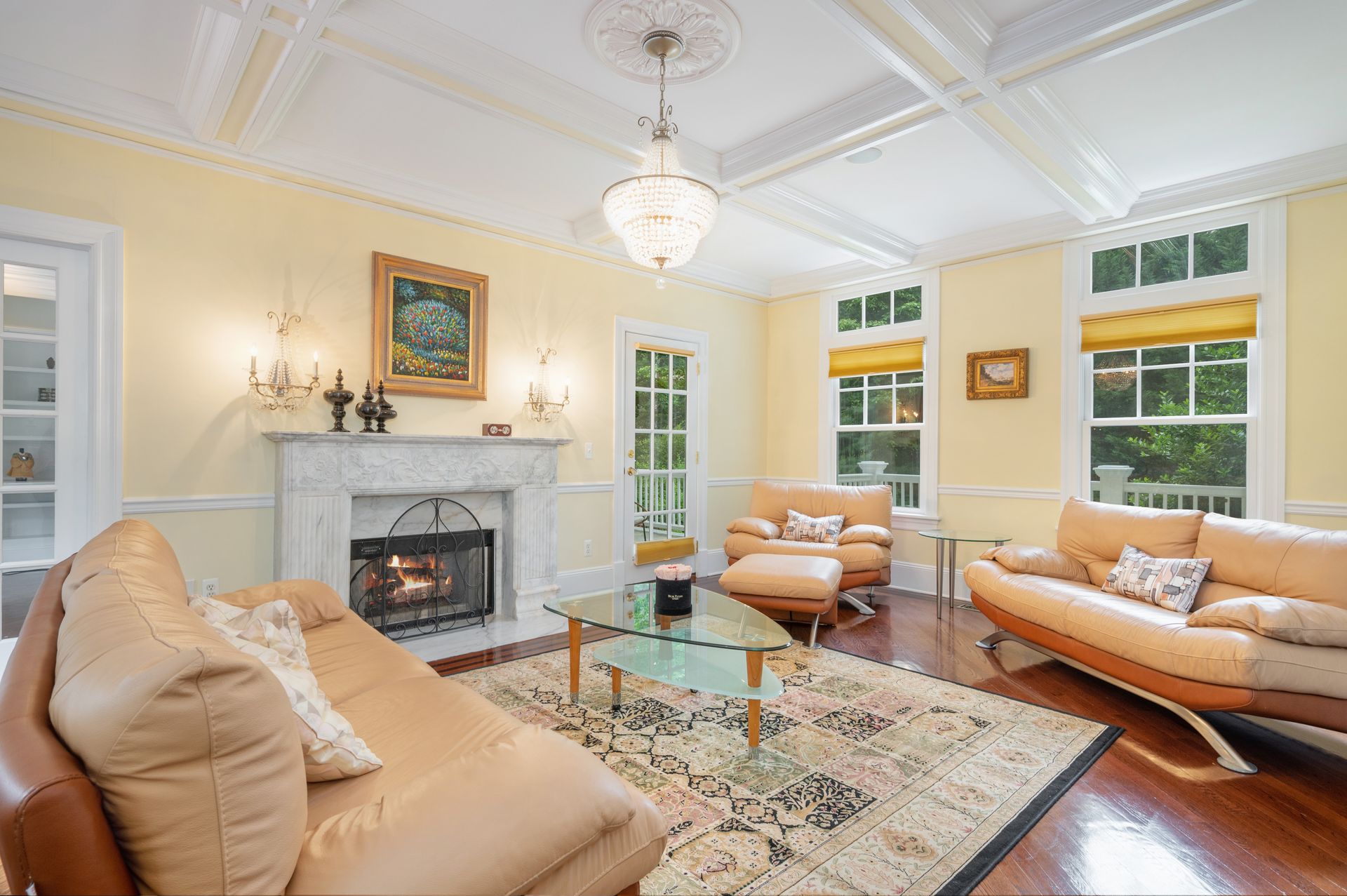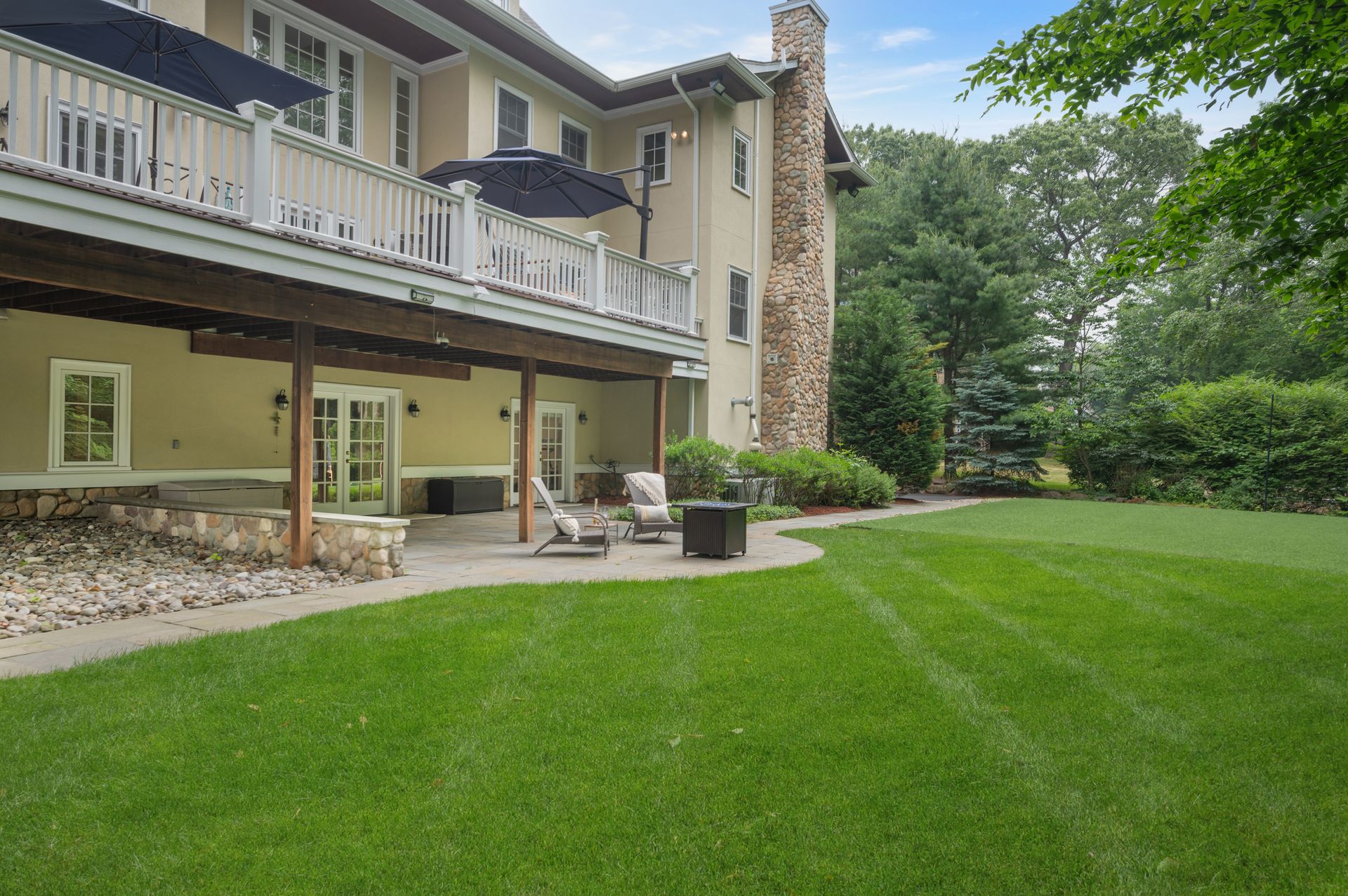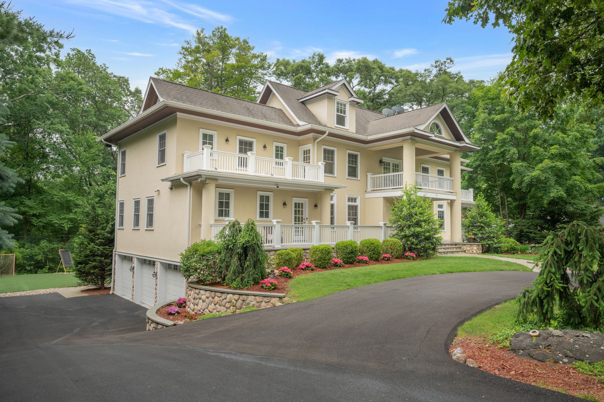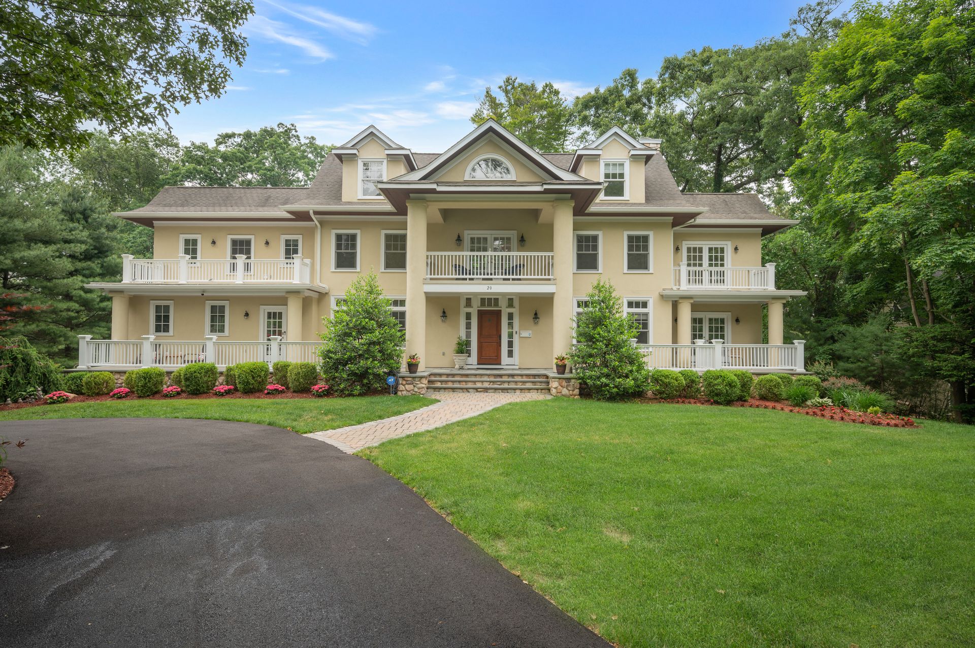 Welcome to this newer construction replicating the Grand Manor style of Herbert Hapgood. Set on a beautifully landscaped, .55 acre property, complete with a turf yard for your sports enthusiast. The stunning, sun-filled, two-story foyer welcomes you to this gem built in 2003. There are windows galore and French doors leading to the many balconies and patios. Custom designed kitchen with center island, beverage drawers and window seat. Warm family room with gas fireplace overlooking private yard. Dining room with custom ceiling is perfect for any occasion. Gather in the spacious living room with fireplace. First-floor office with built-in shelving, fireplace and access to quiet patio and deck. Second floor covered balcony is a perfect space for morning tea and yoga. Private primary suite is sure to please with gas fireplace and gorgeous ensuite with honey onyx tile. Three additional generous bedrooms, full bath and laundry room on this level. Additional two bedrooms and full bath on the third floor. Lower-level walkout offers flexible space with an ideal guest space with bedroom, full bath and kitchenette. Bright, sunlit recreation room and additional exercise room offer many options for today's living. Step out to large patio and yard backing to town property.
