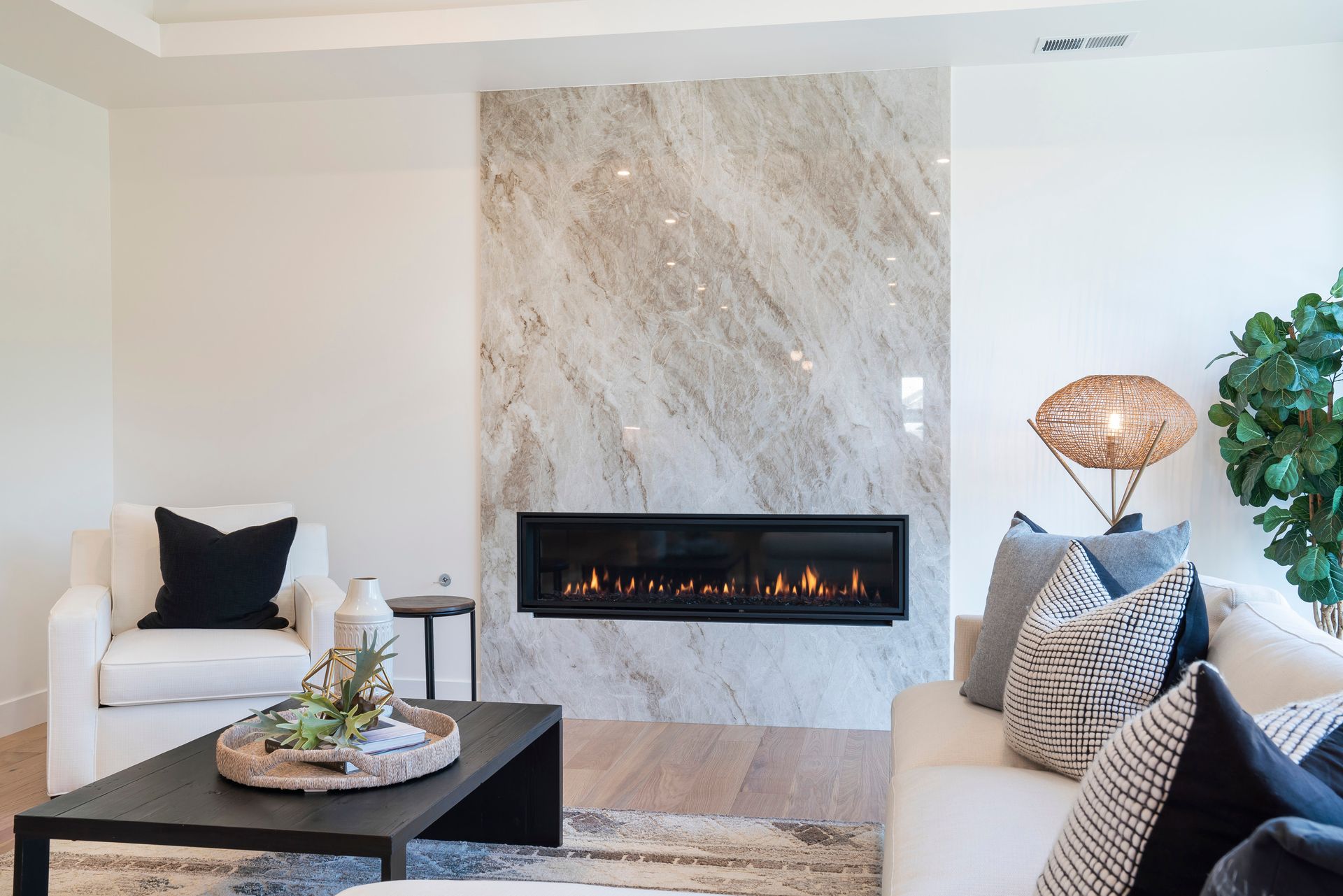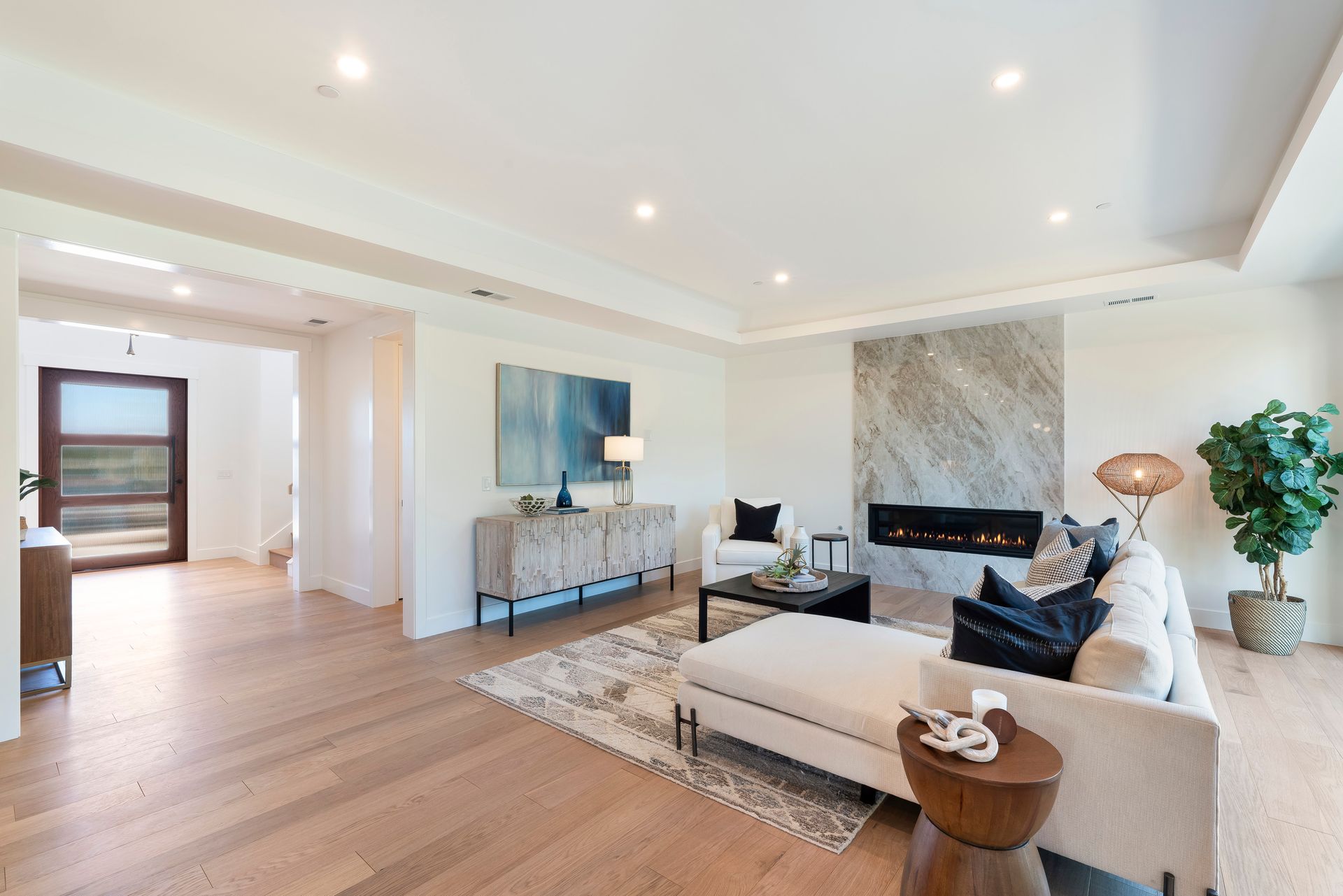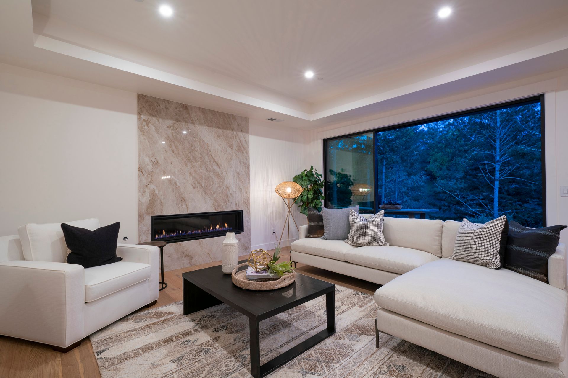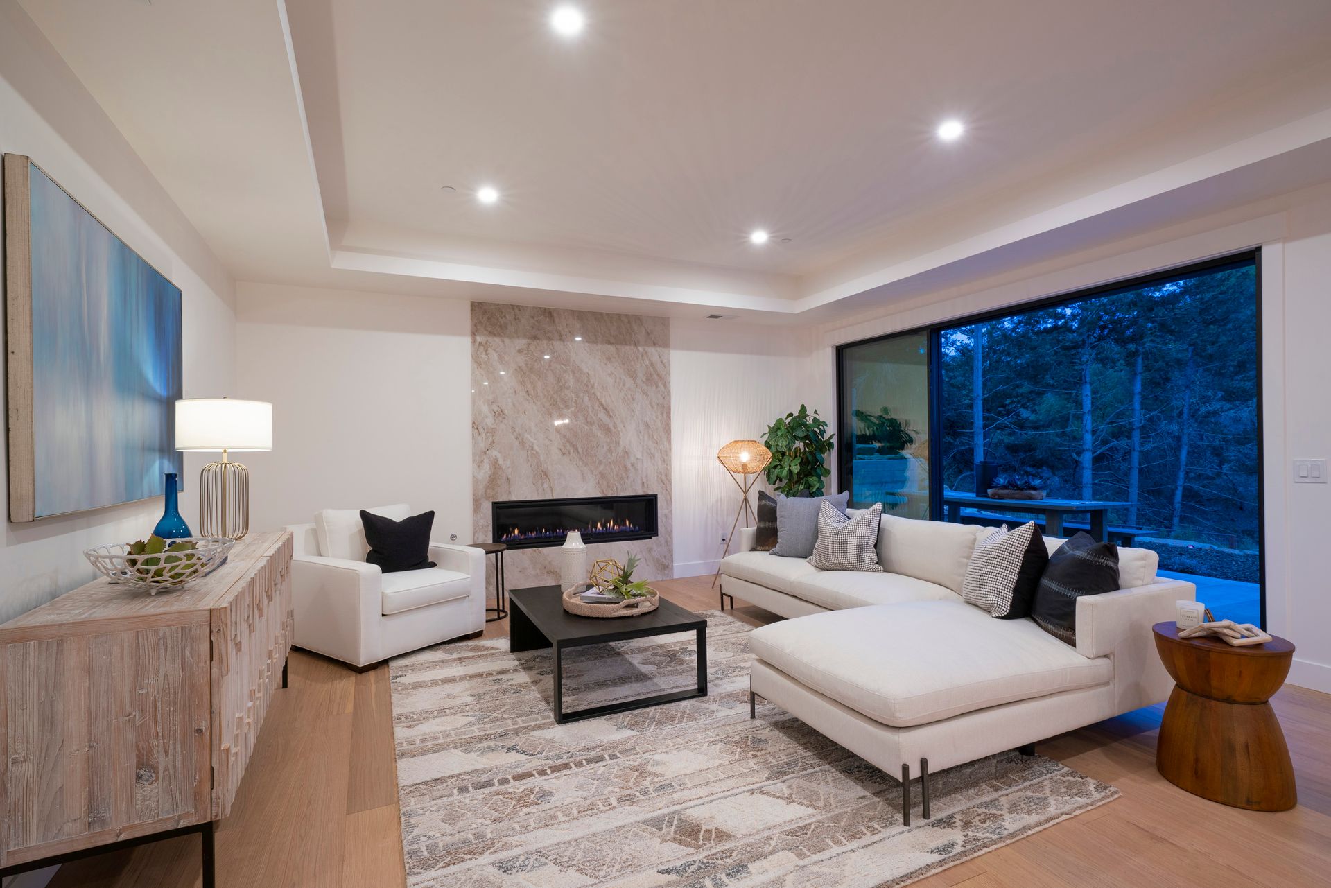 Great room features linear fireplace with floor to ceiling quartzite slab surround and stacking sliders to patio