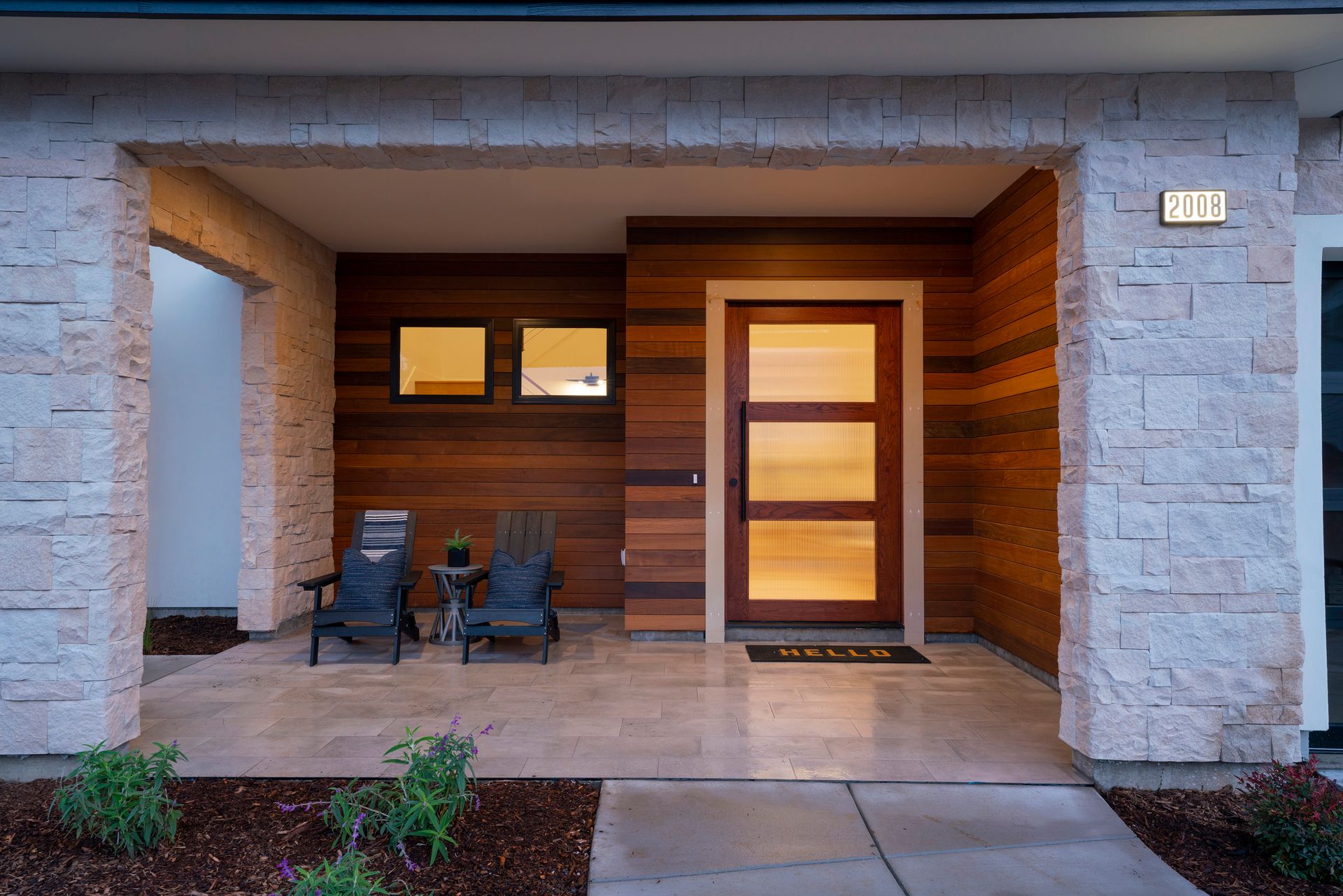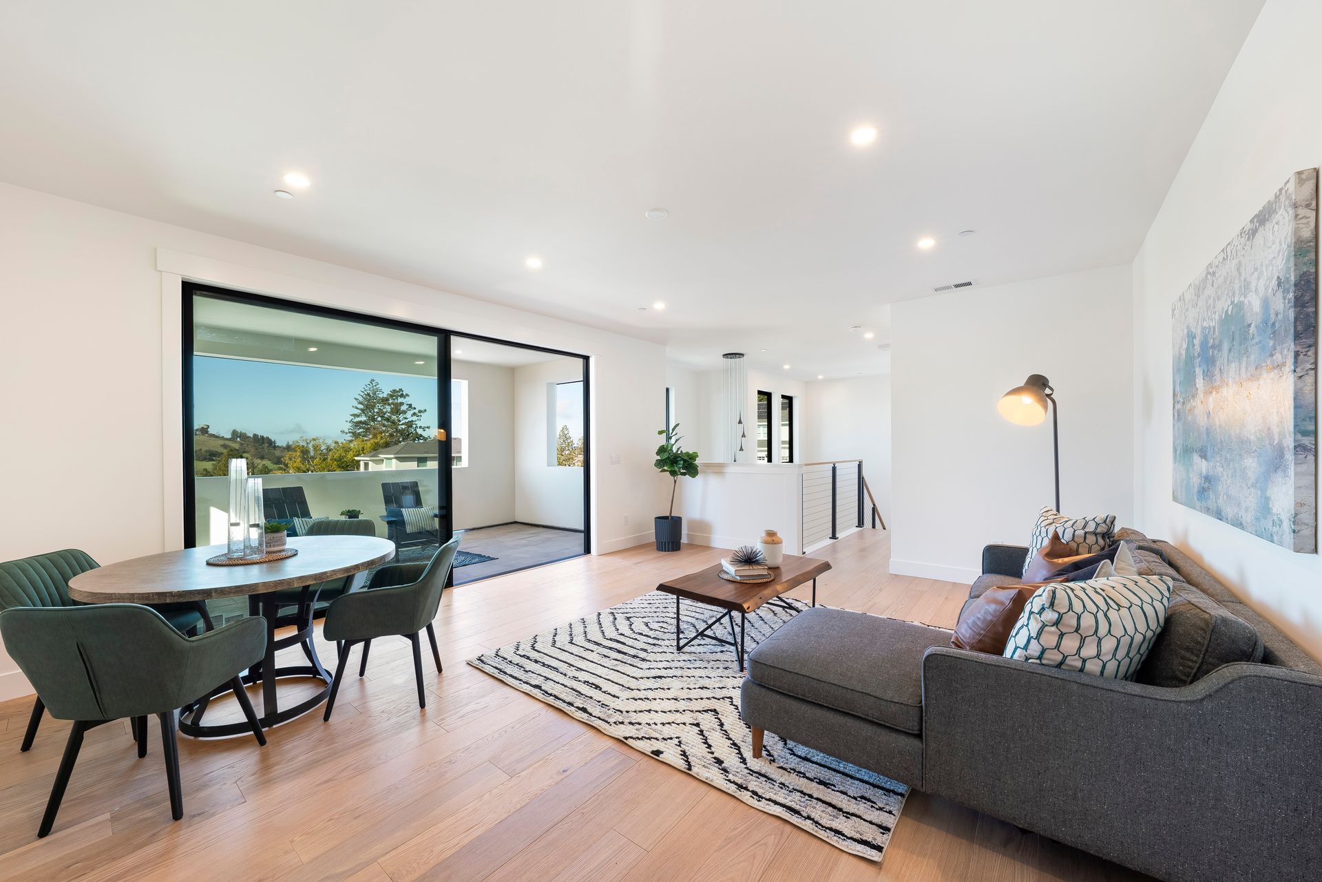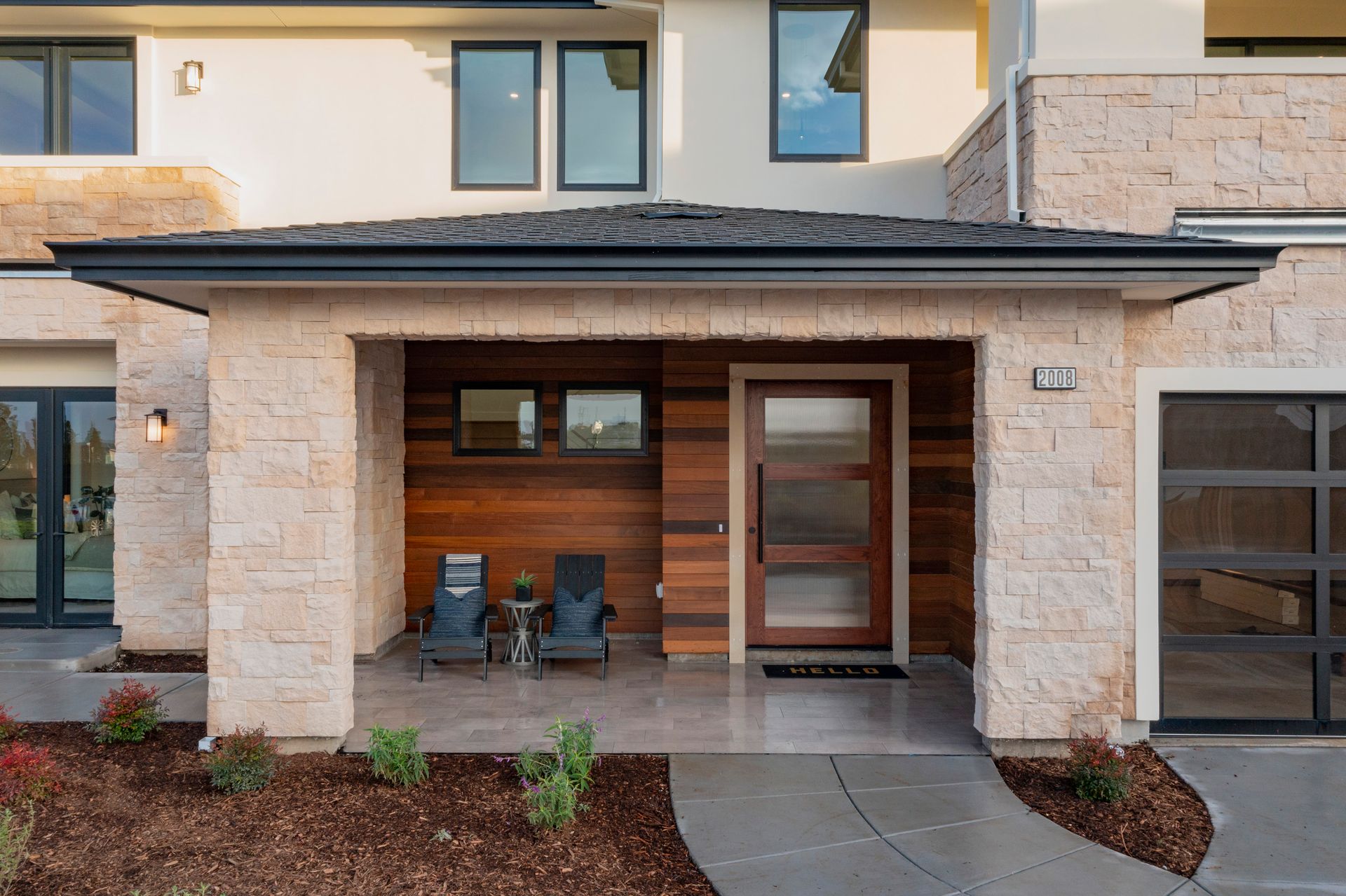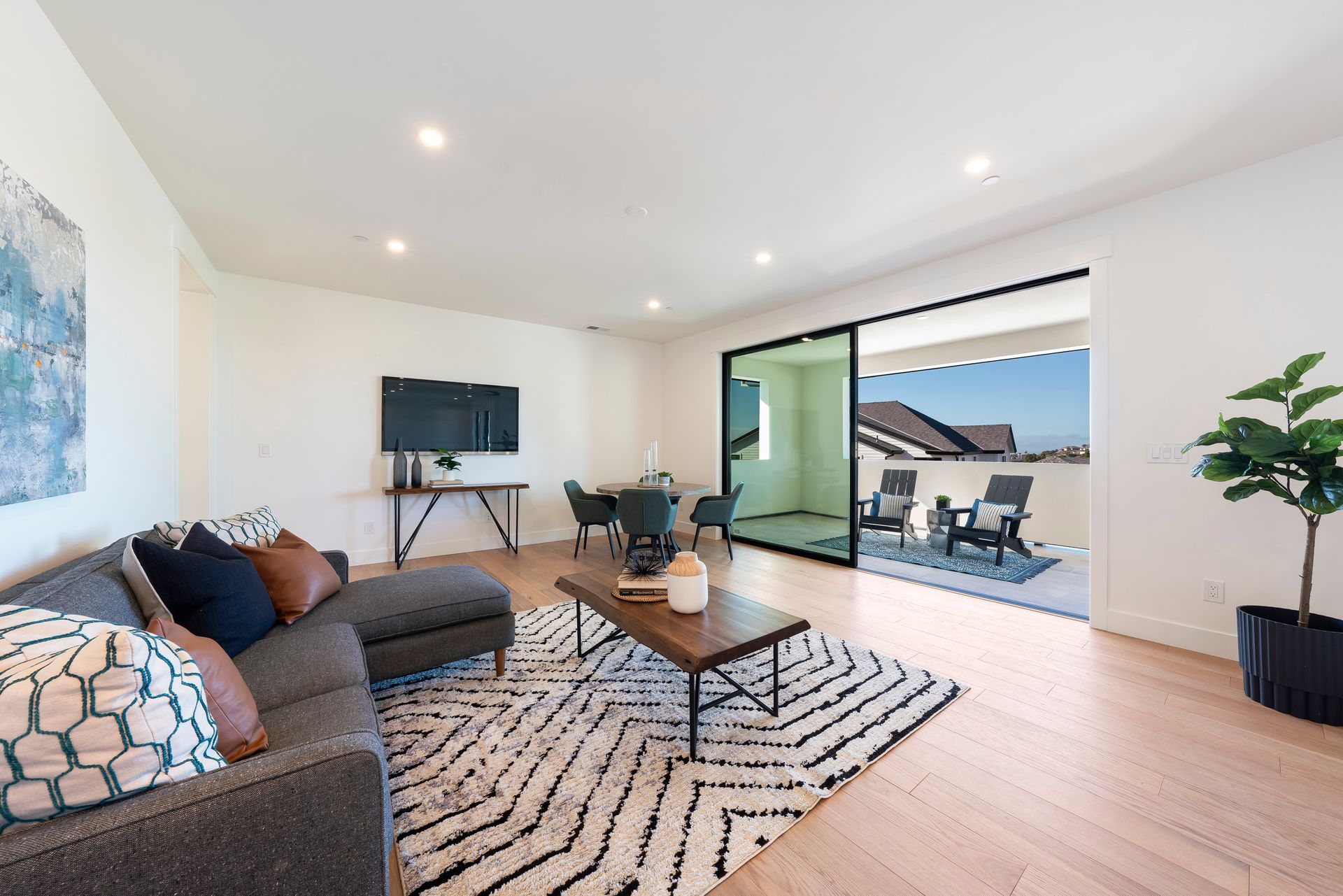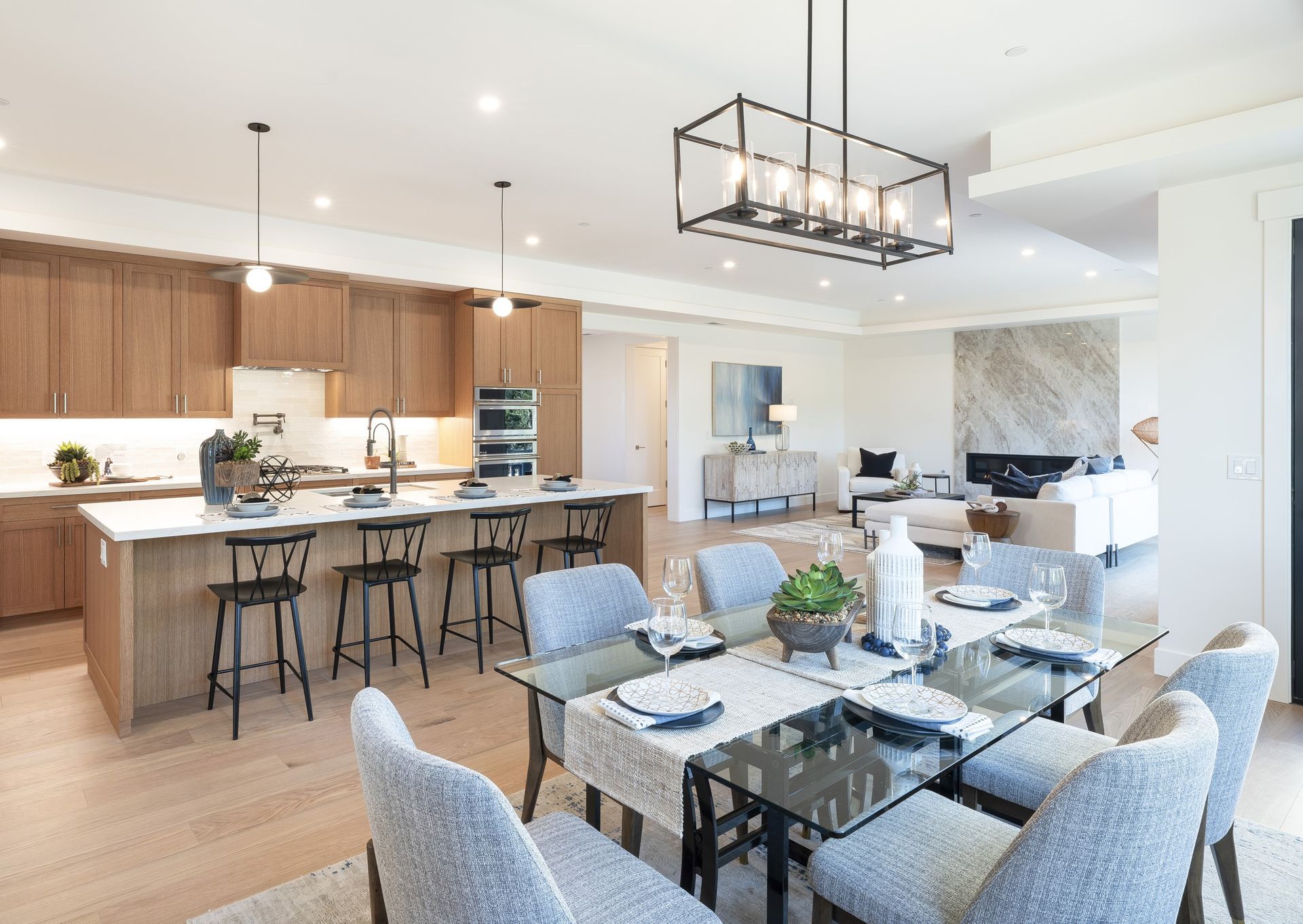 Great room features linear fireplace with floor to ceiling quartzite slab surround and stacking sliders to patio