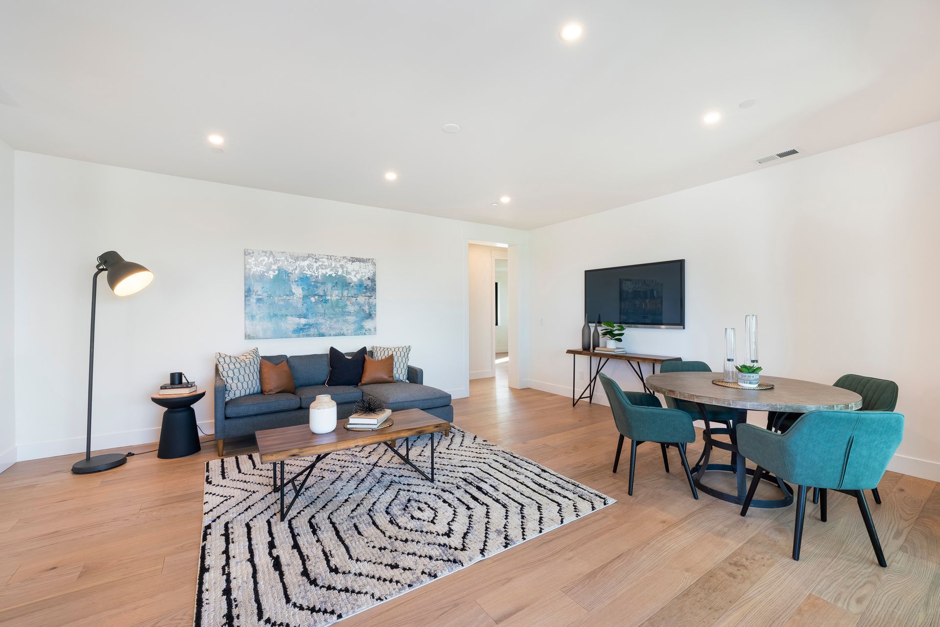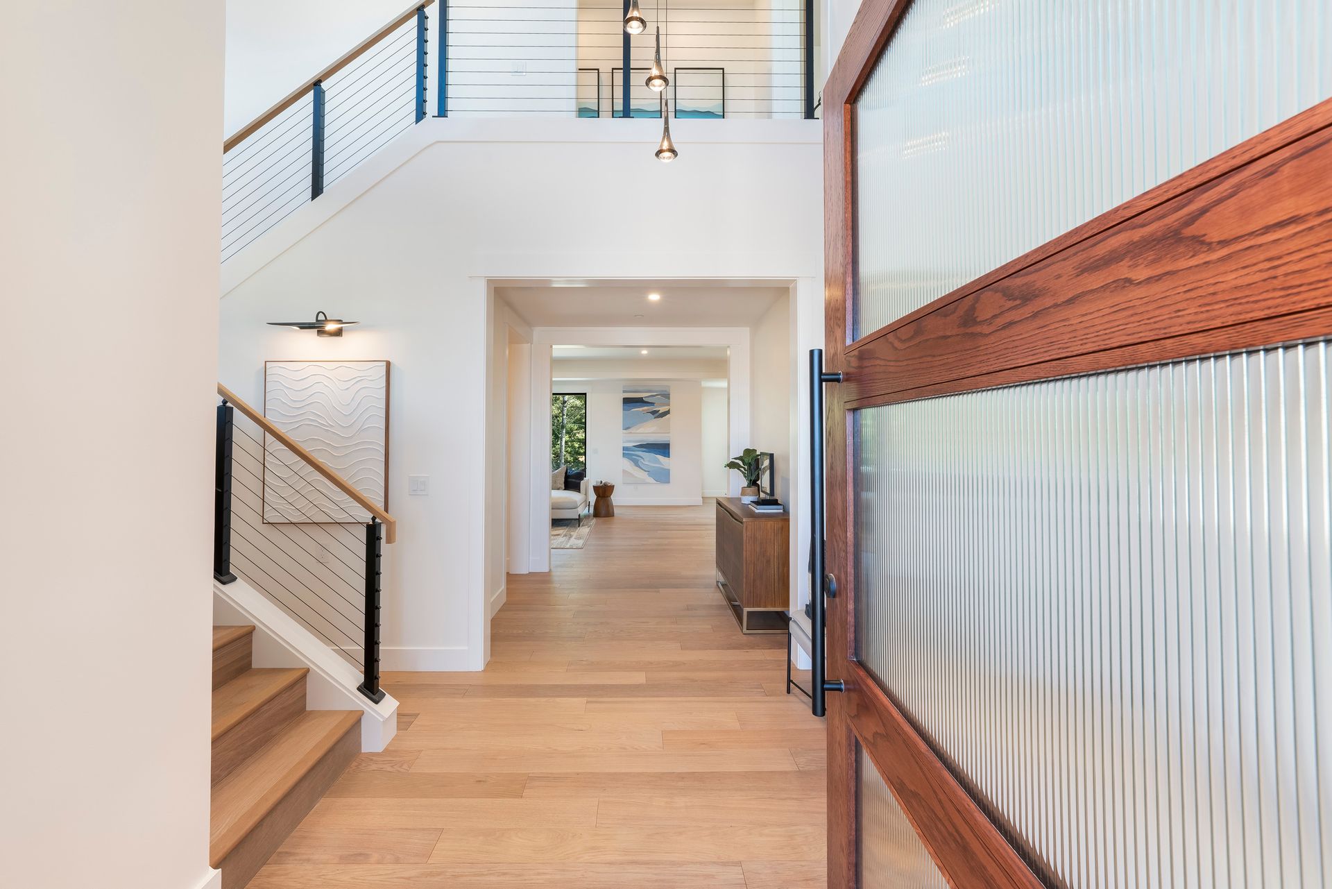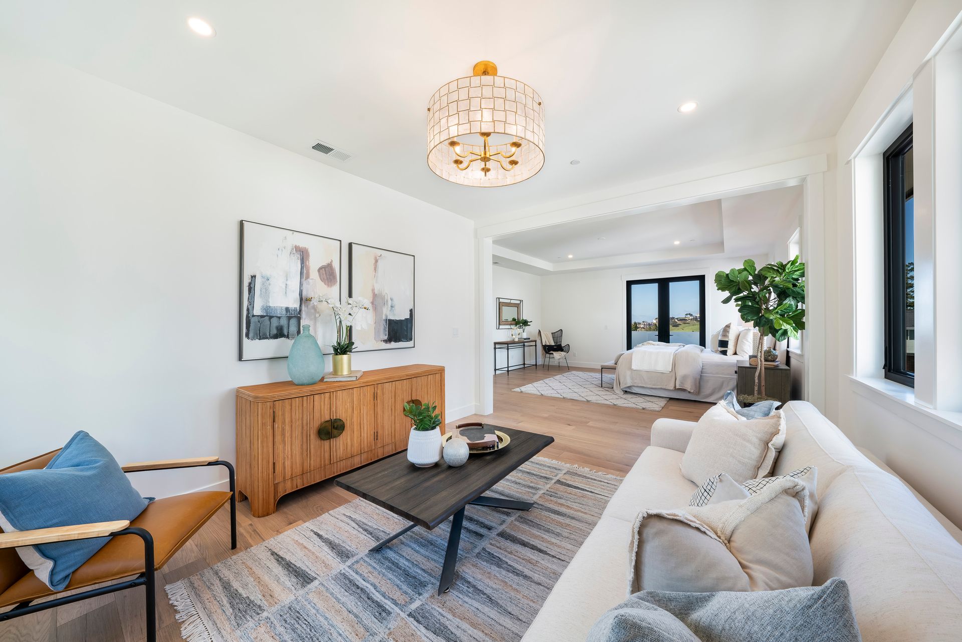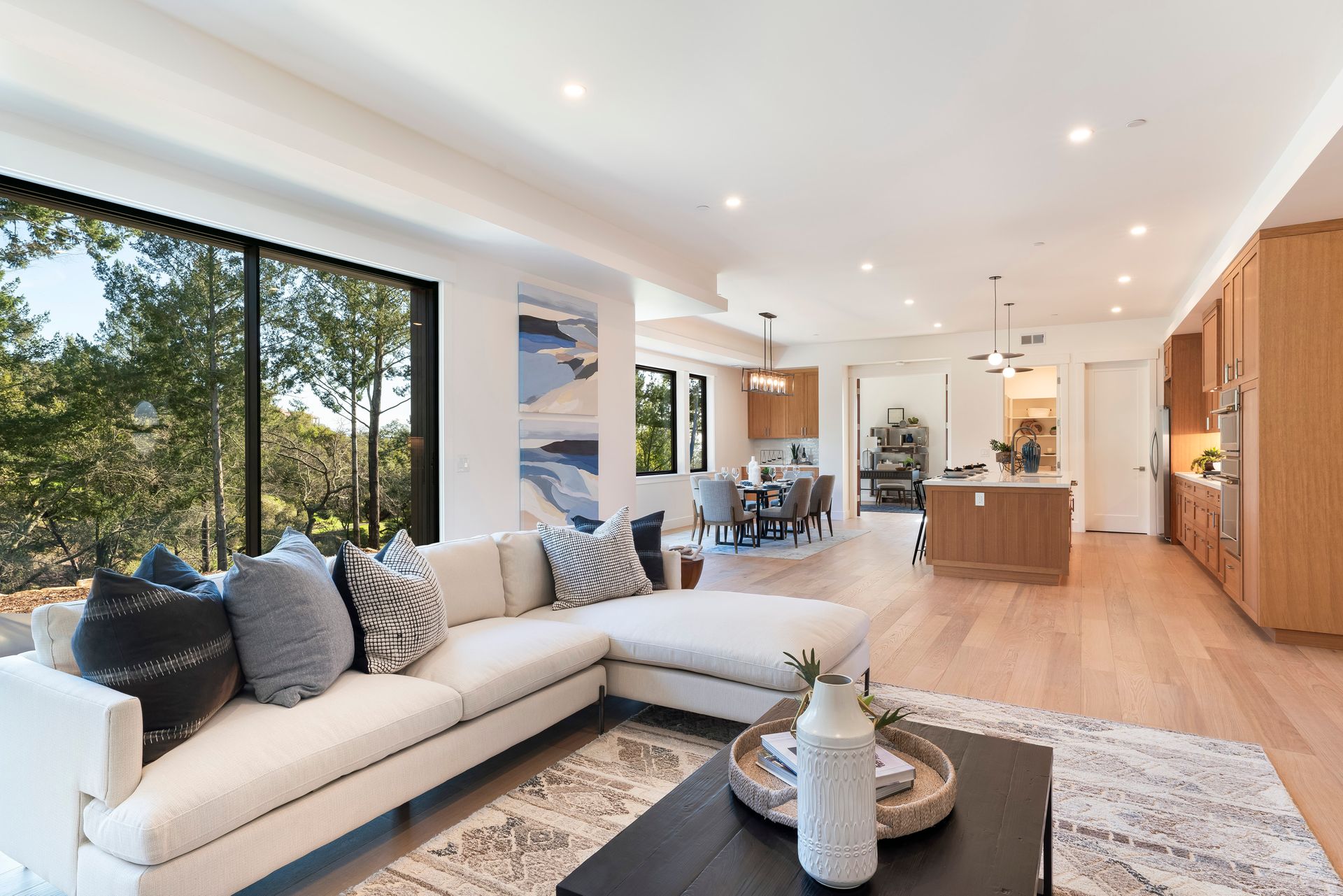 Great room features linear fireplace with floor to ceiling quartzite slab surround and stacking sliders to patio