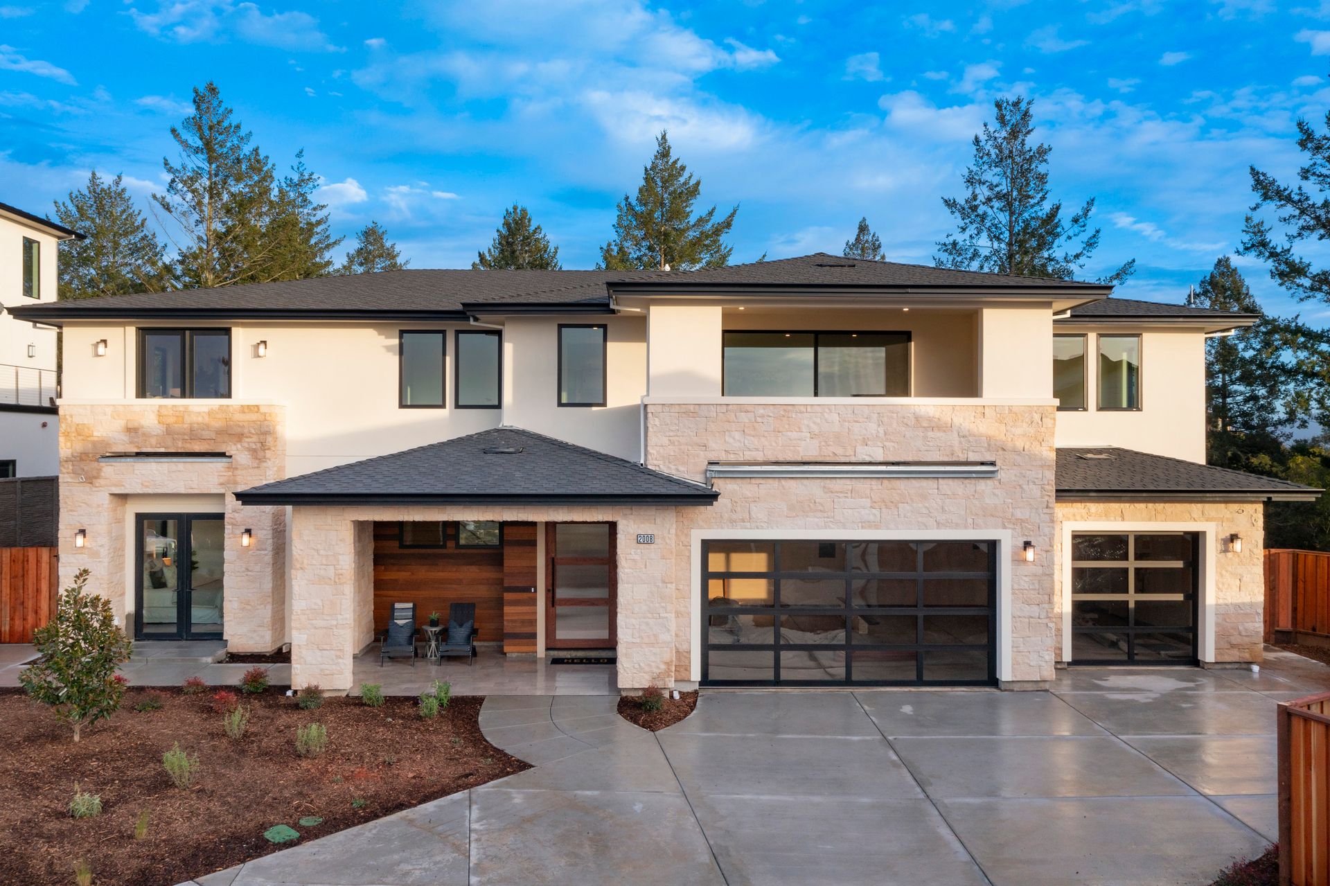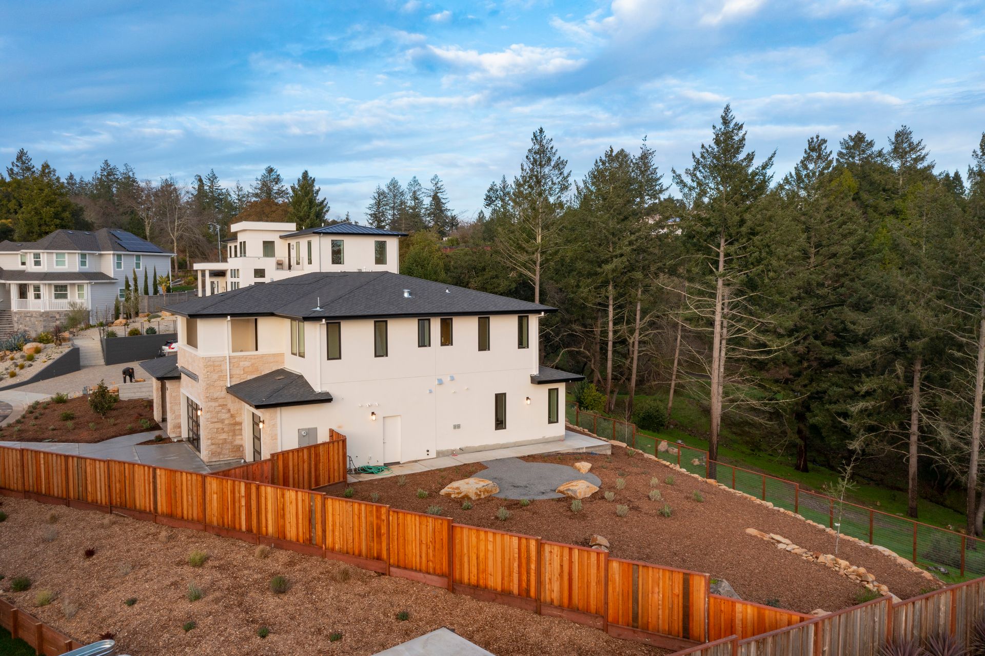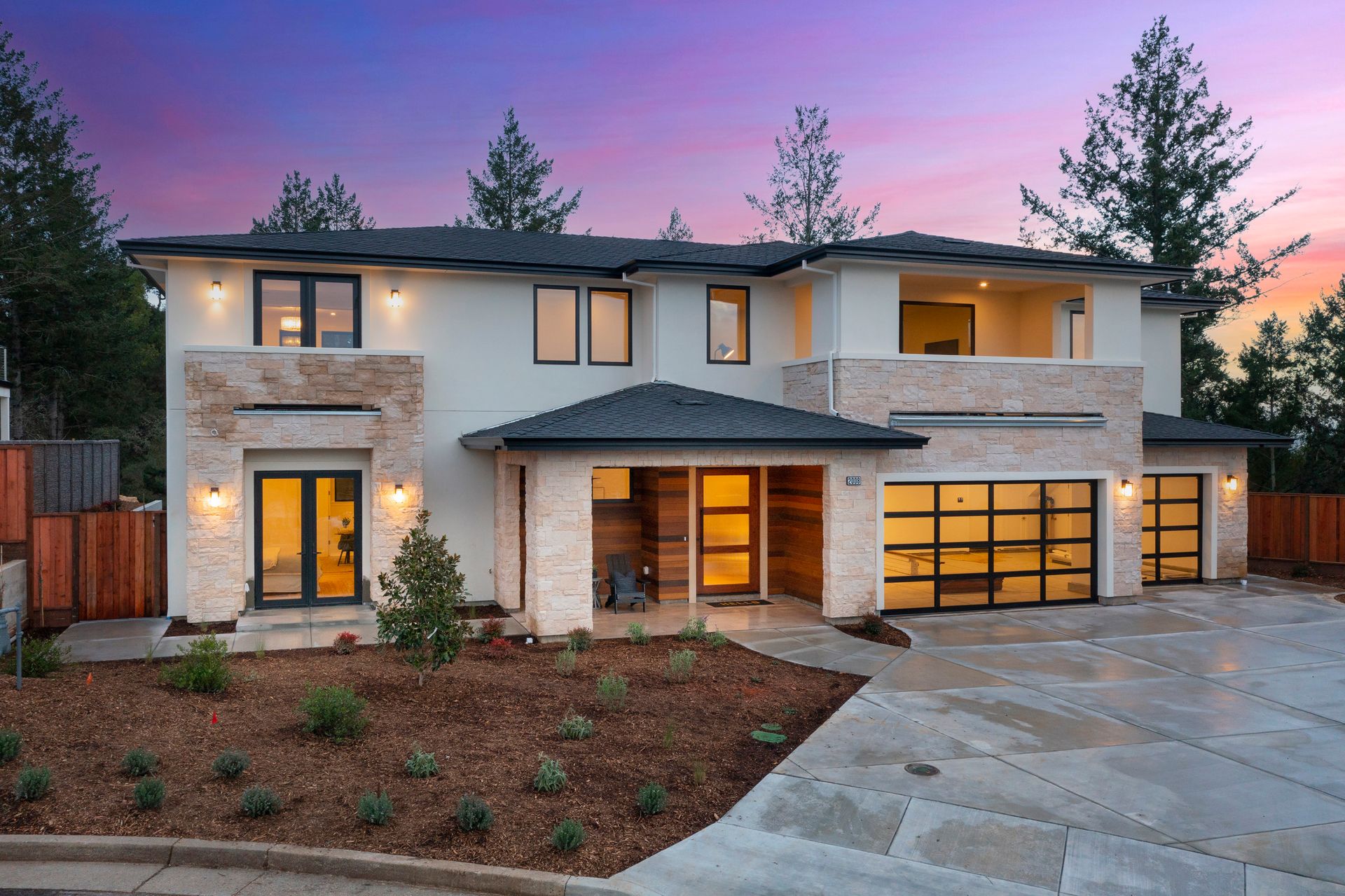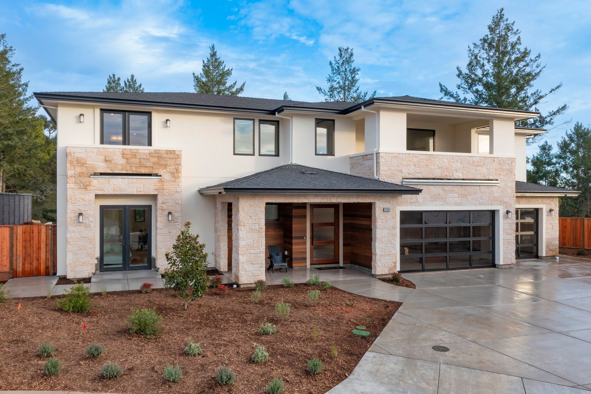 This newly constructed home in Fountaingrove sits on a generous 1/3 acre lot. Set on a peaceful cul-de-sac and backing to open space, this offers much desired privacy. The home features 5 bedrooms plus an office and 4 full bath, 1 half bath. The covered entry leads to a modern fluted glass entry door taking you to the foyer with vaulted ceiling. The open concept great room features a linear fireplace set in a feature wall of floor to ceiling quartzite slab surround and stacking sliders to the rear patio and is open to the dining and kitchen. The chef’s kitchen is accented by a large center island, Monogram appliances, and walk-in pantry. The main level includes a home office and a guest suite with sitting area and en-suite bath offering a separate entrance. The upper level consists of the primary suite with sitting area and direct access to a Juliet balcony, and the primary bath is highlighted by heated floors and an oversized shower. There are 3 additional bedrooms (1 en-suite) and a full bath on the upper level as well as a large bonus room with slider to a covered terrace. There are 2 laundry rooms, one on the main level and one on the upper level. The freshly landscaped grounds offer low maintenance and curb appeal with room for a pool. The distinctive custom home is in the heart of wine country with close proximity to wineries, fine dining and the Sonoma County Airport.