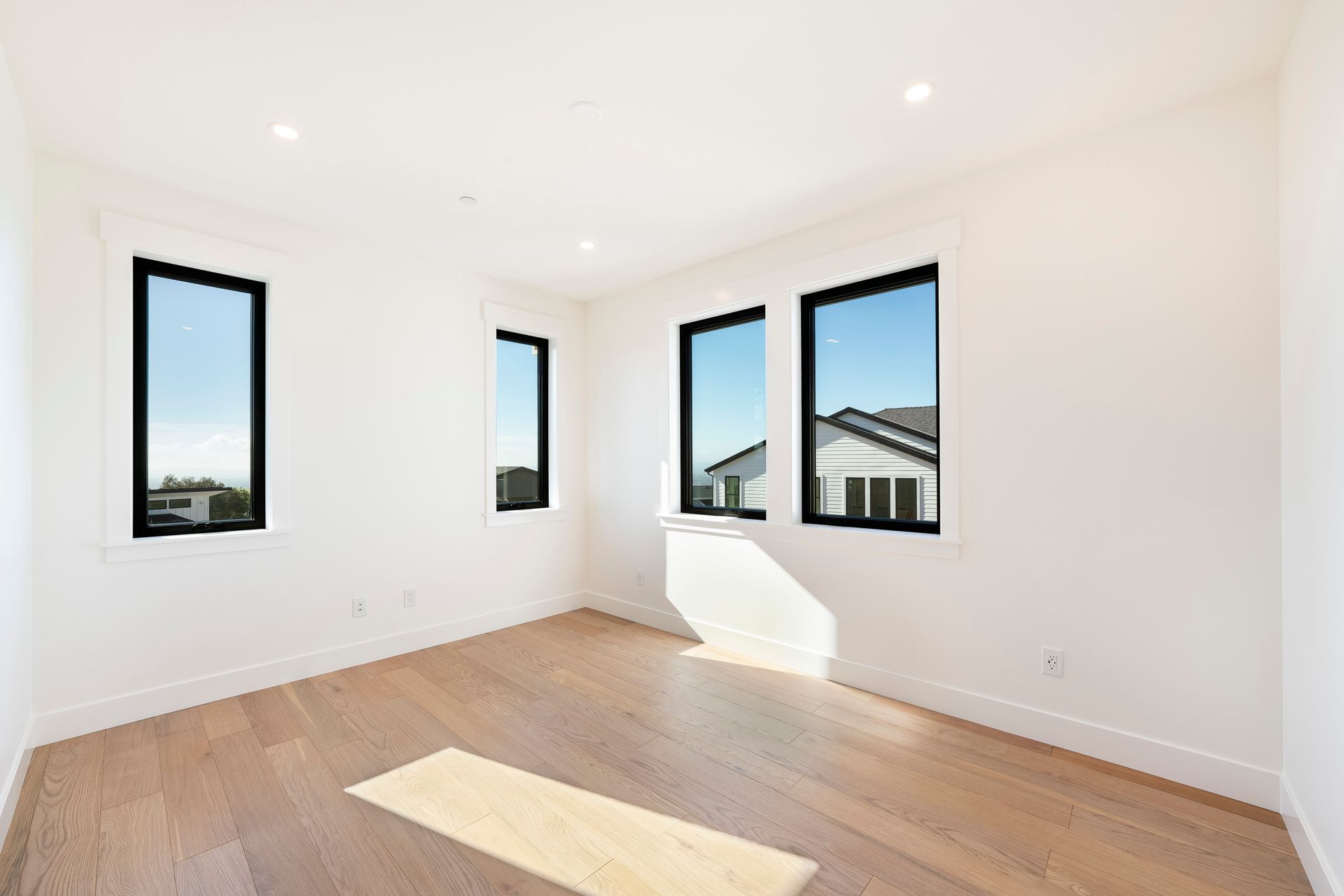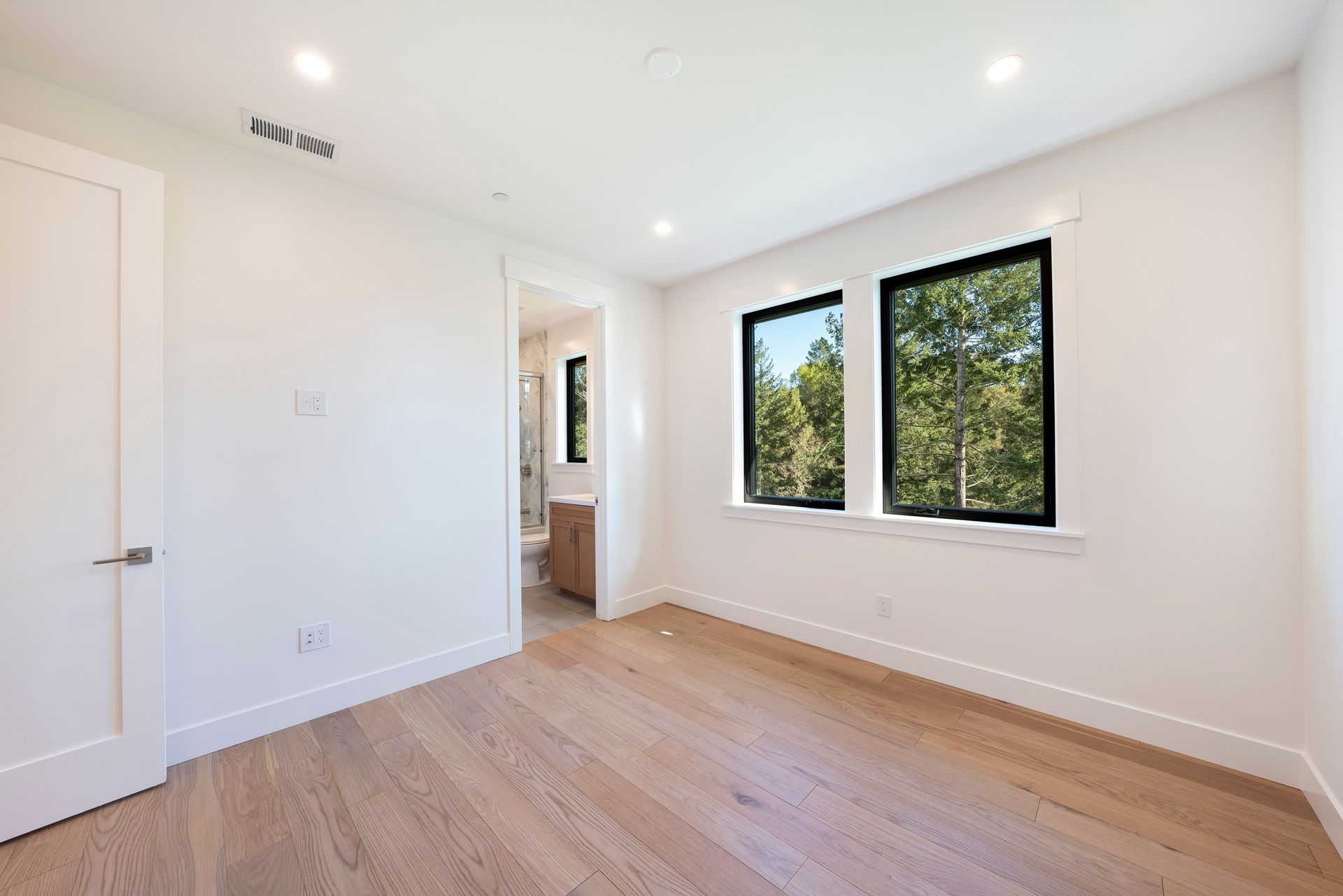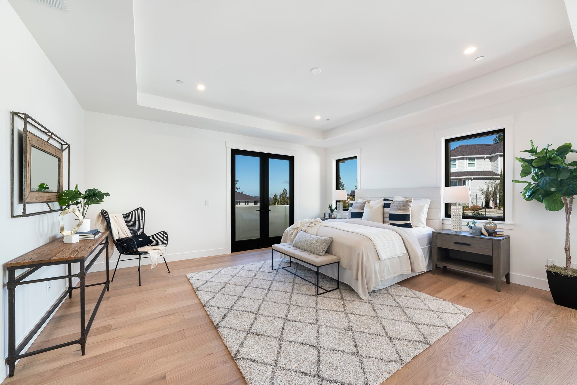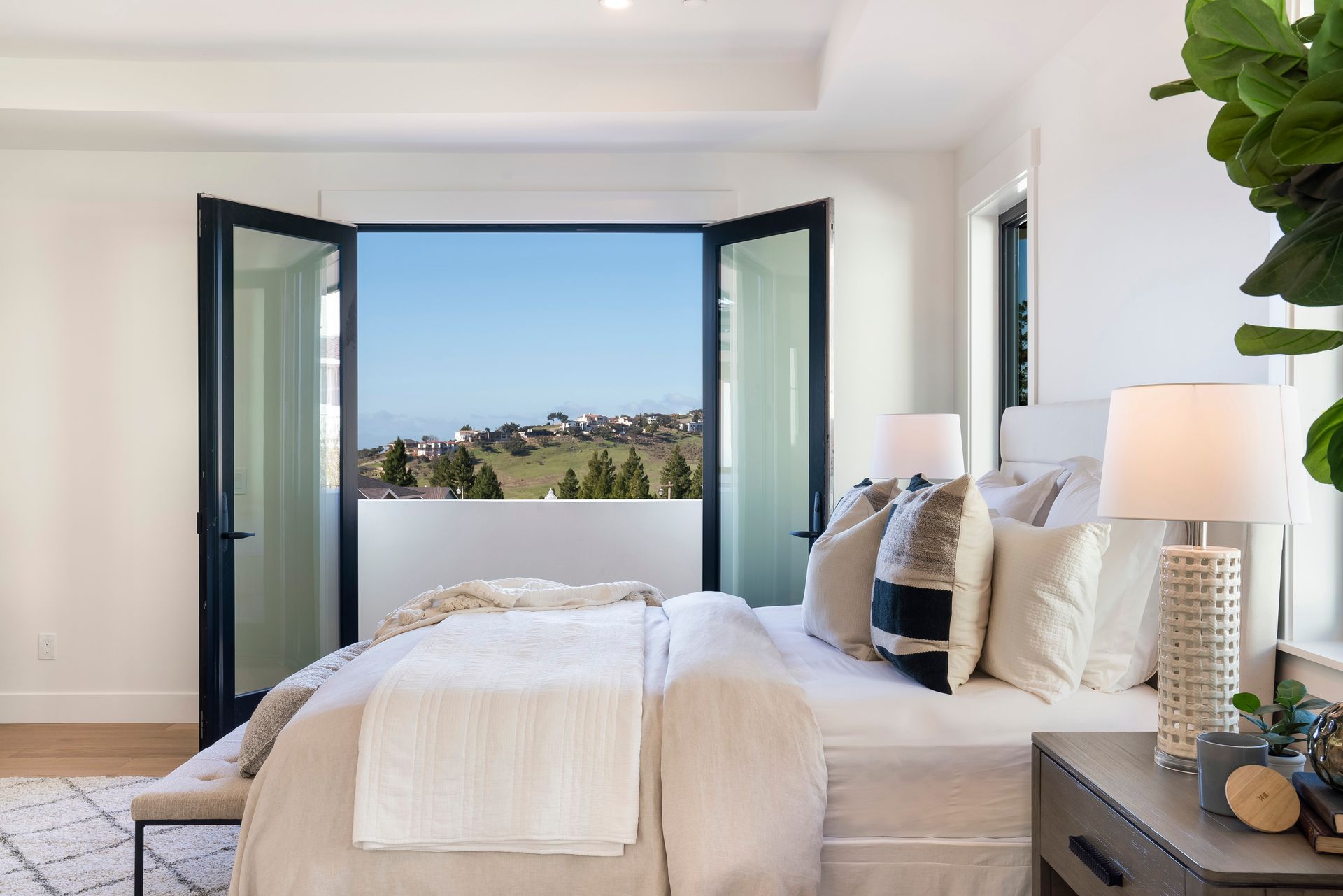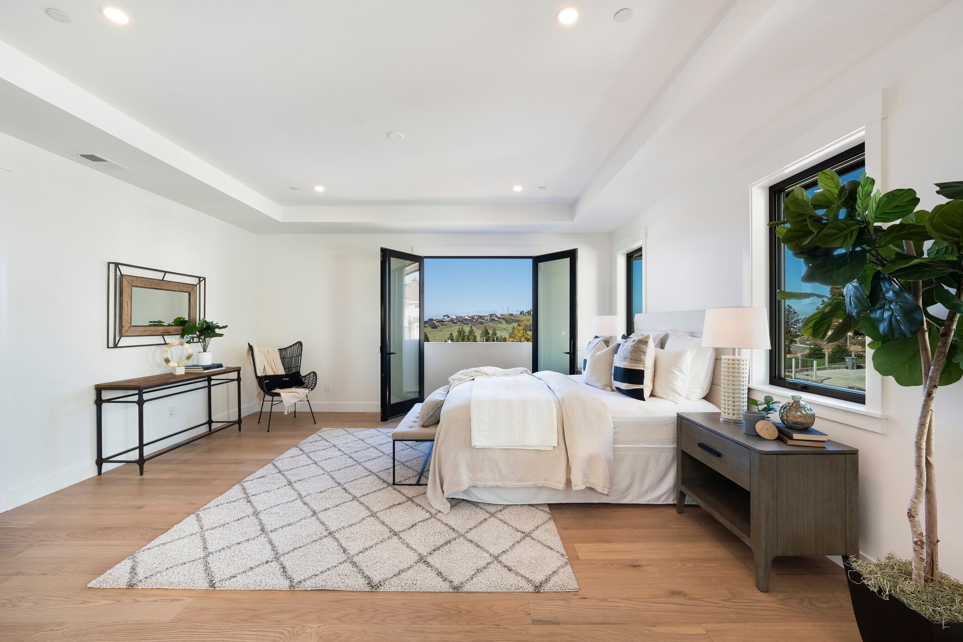 Primary suite features wood flooring, direct access to the balcony