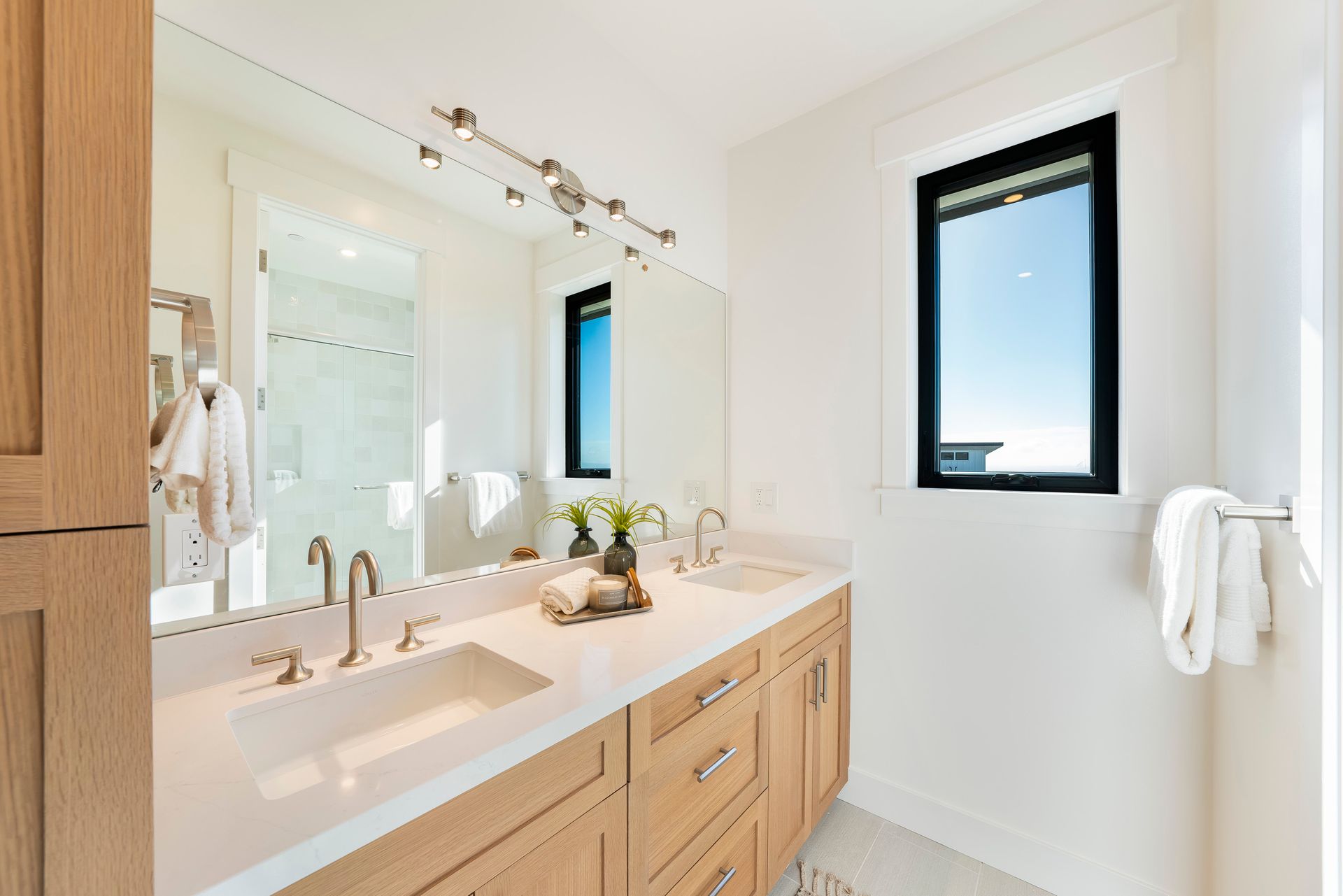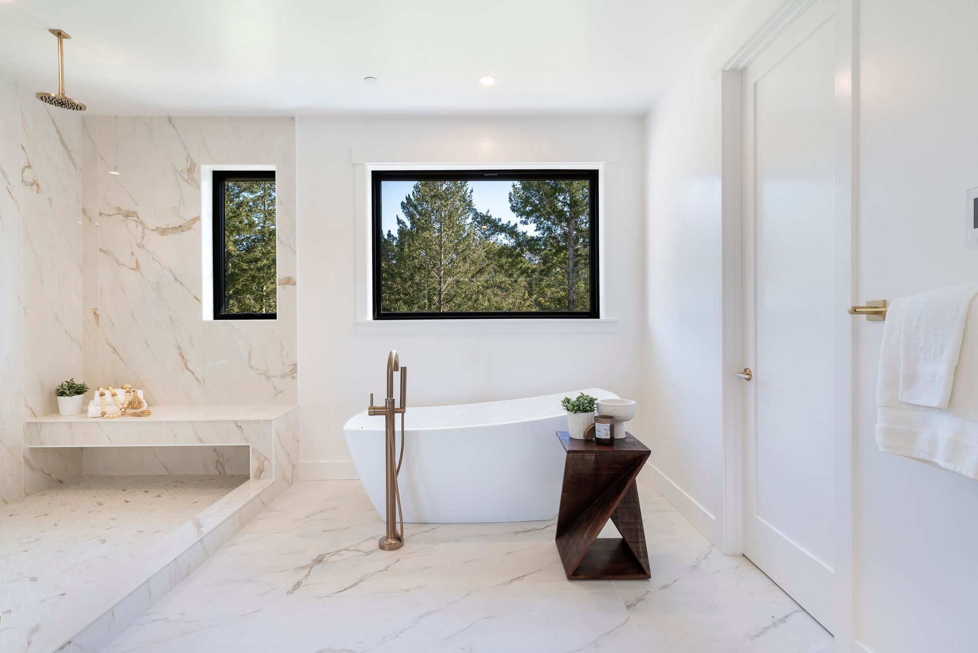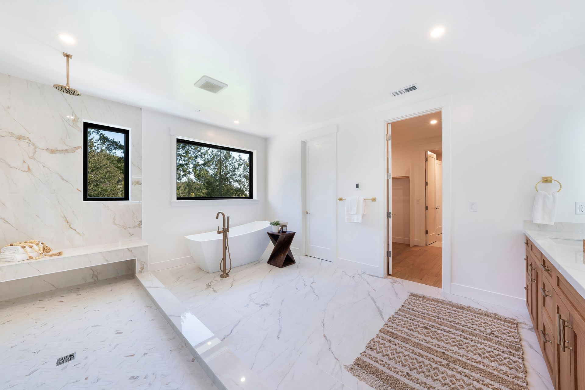 Primary bath with dual sinks, quartz counter, soaking tub, large shower stall with bench seating, dual rain heads and 2 handheld wands, heated tile floor through bathroom, walk-in closet, direct access to laundry room